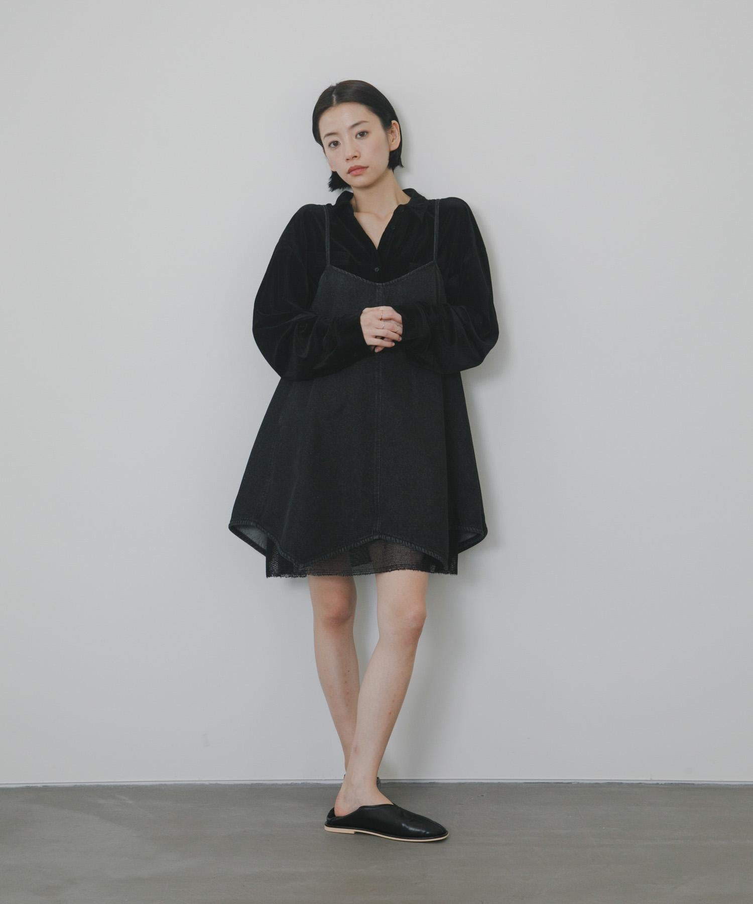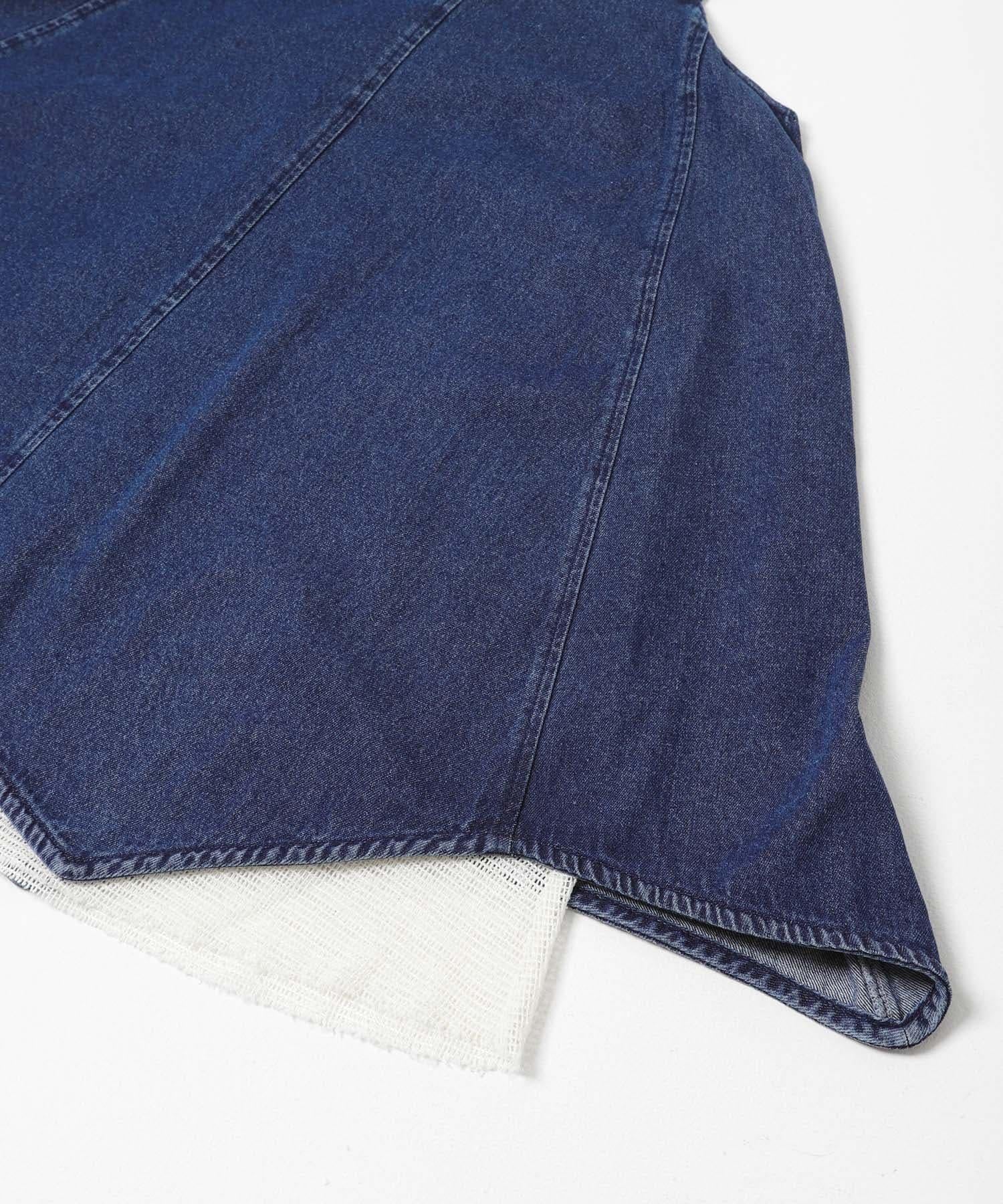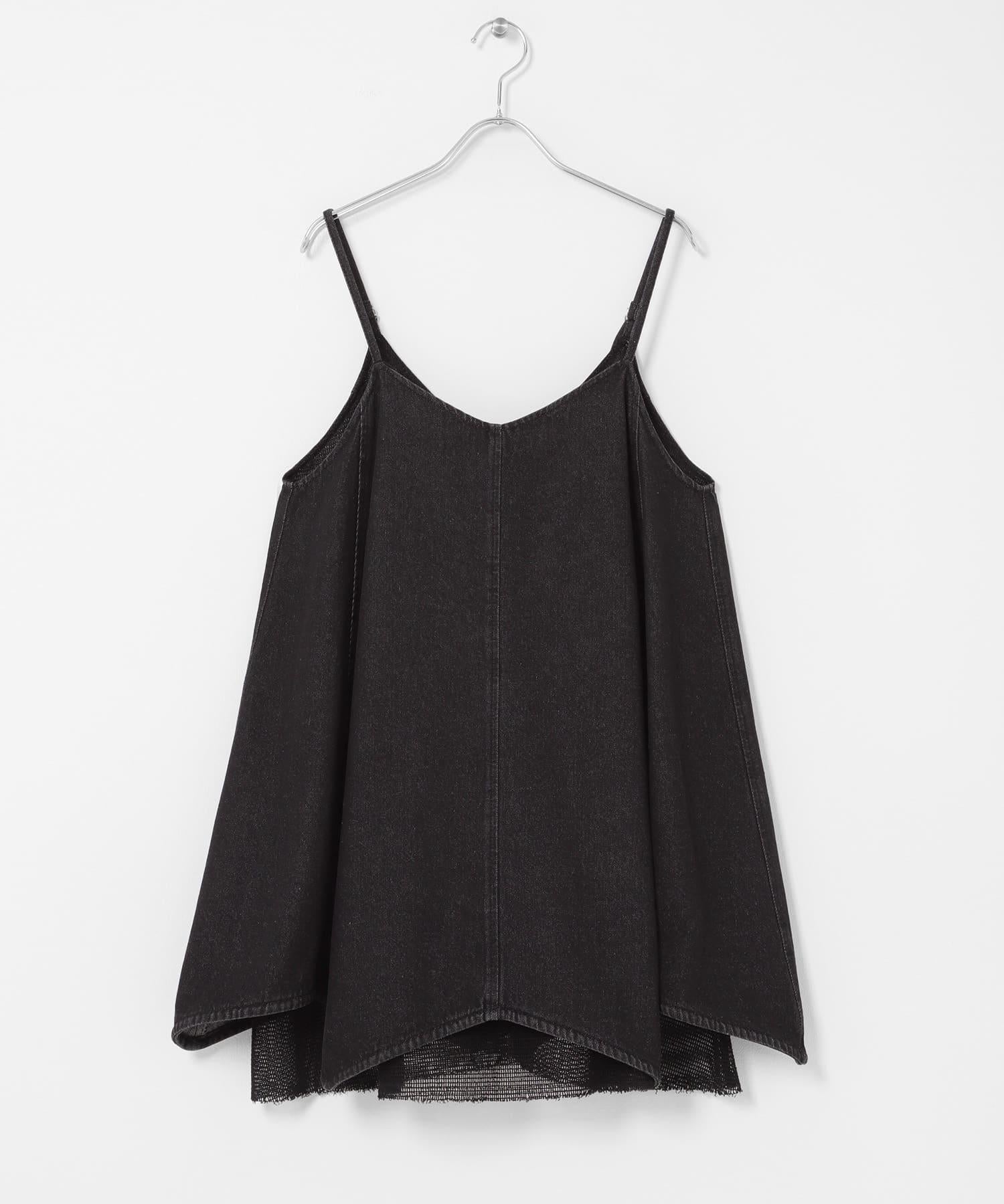 牛仔吊帶連衣裙,下襬採用多層網紗設計。每當你移動時,設計都會改變表情。後背的款式還採用了深 V 領設計,讓人感覺輕鬆愜意。可調節的調節器讓它可以根據身高進行調節,根據疊穿單品的不同,你可以享受不同的裝扮,這也是一大亮點。