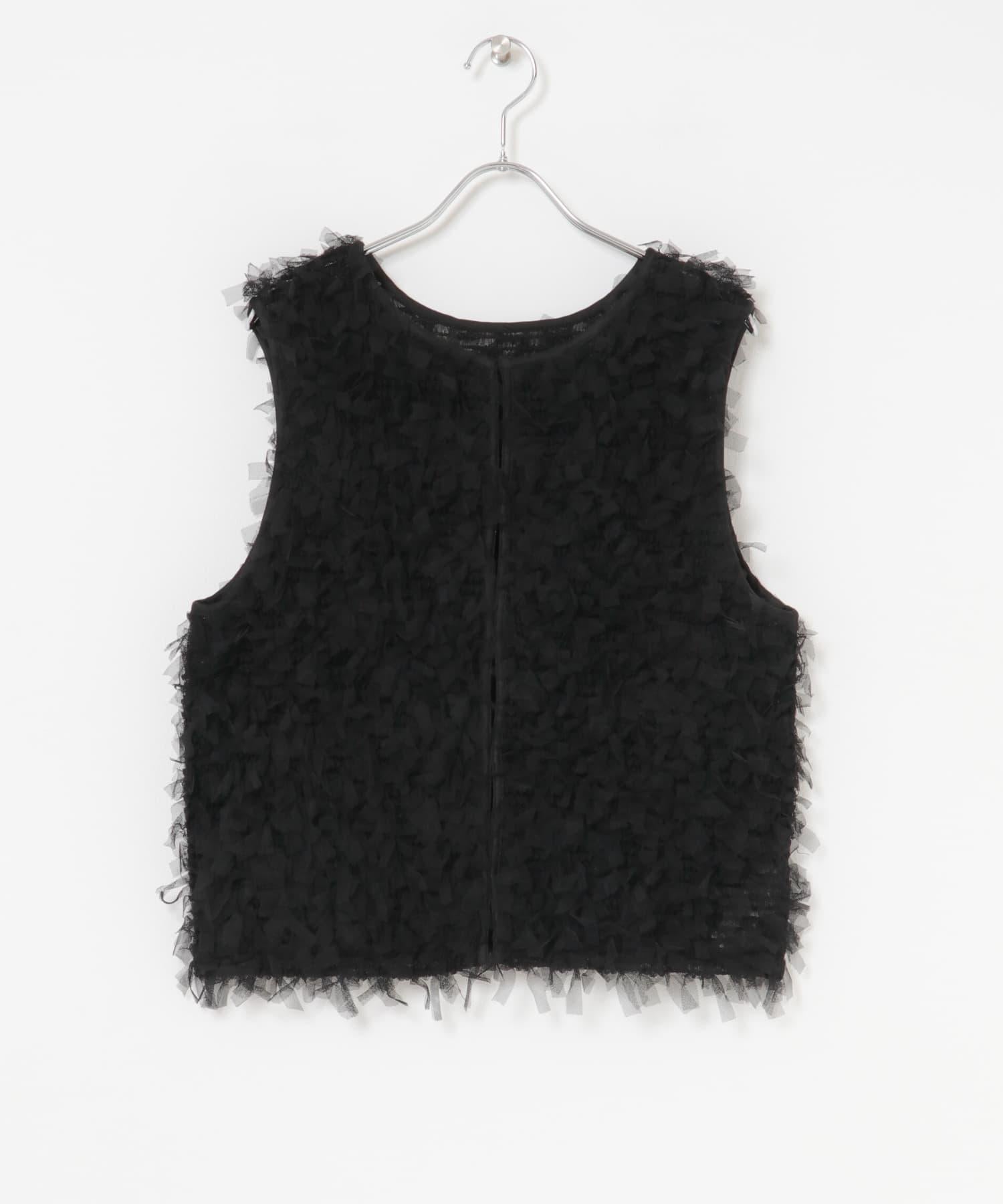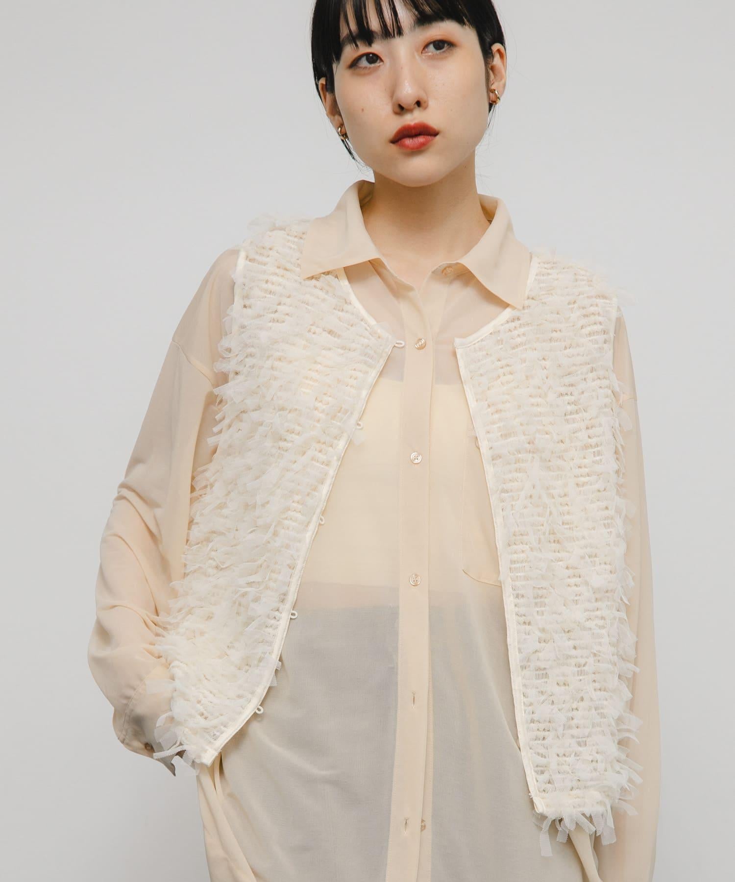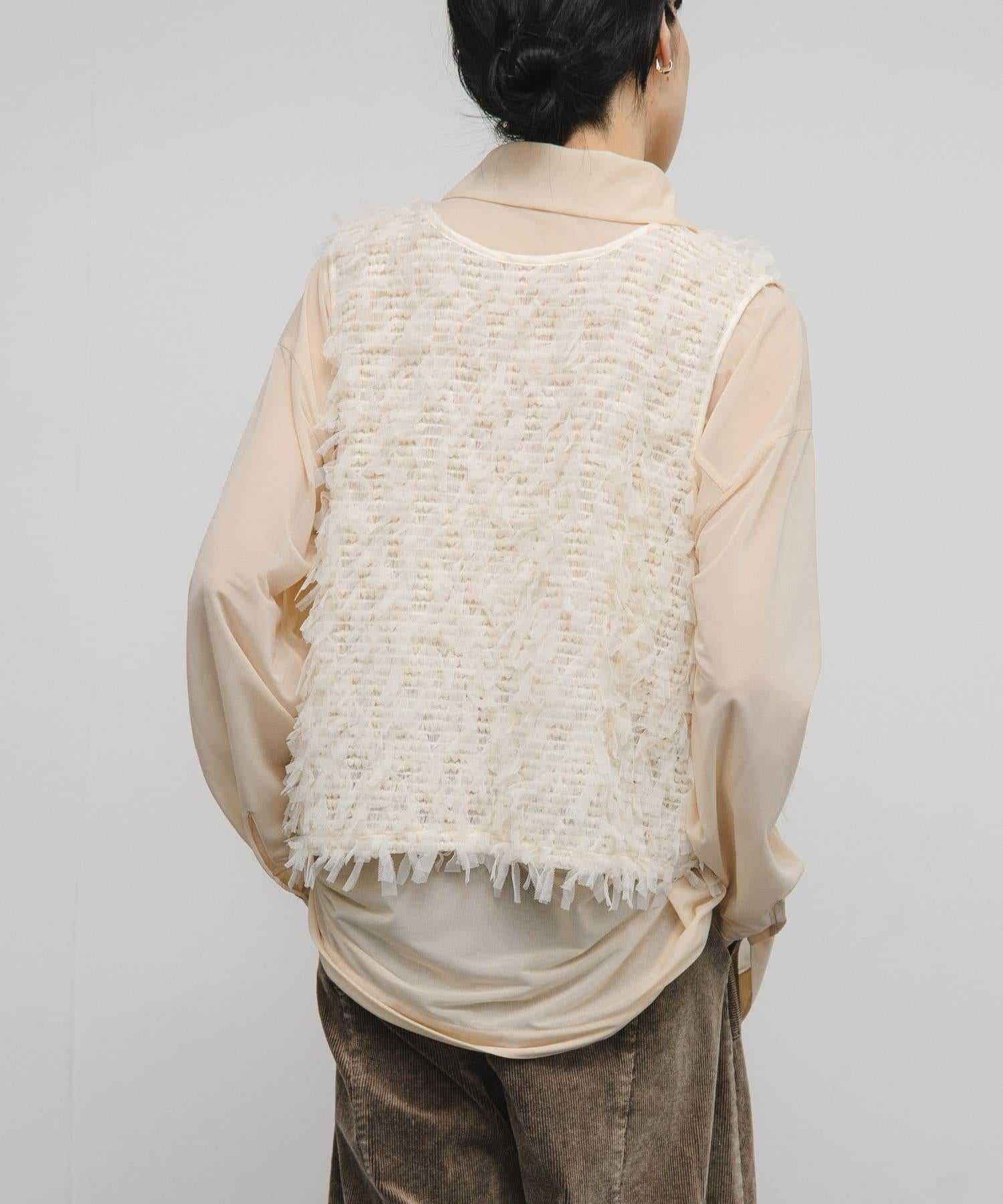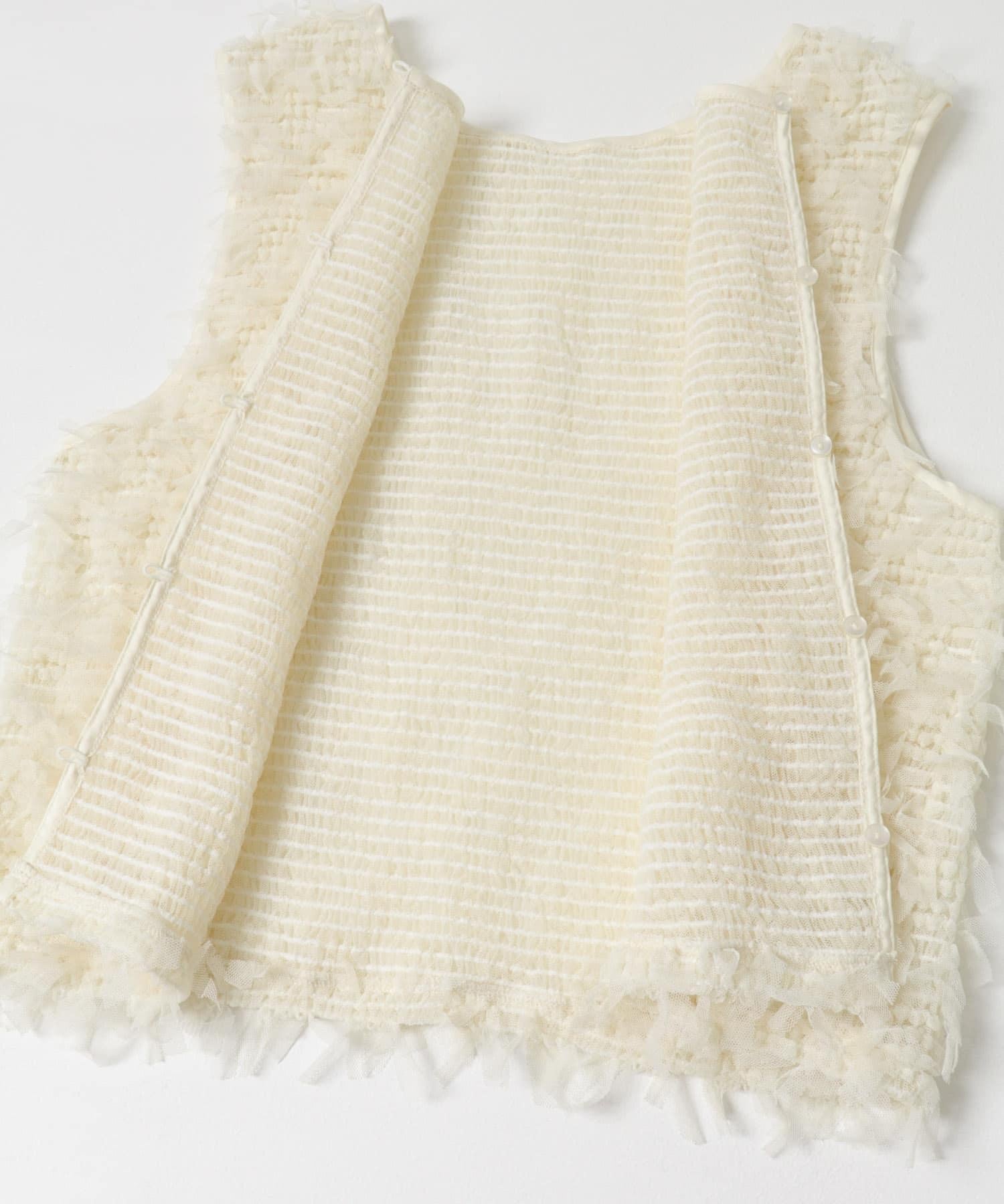 馬甲通身飾有緞帶薄紗,極具存在感。它的尺寸小巧,可以疊穿在剪裁縫製的上衣或背心上,打造清新的造型。前面的紐扣有接縫規格,因此也可以像襯衫一樣穿著。
