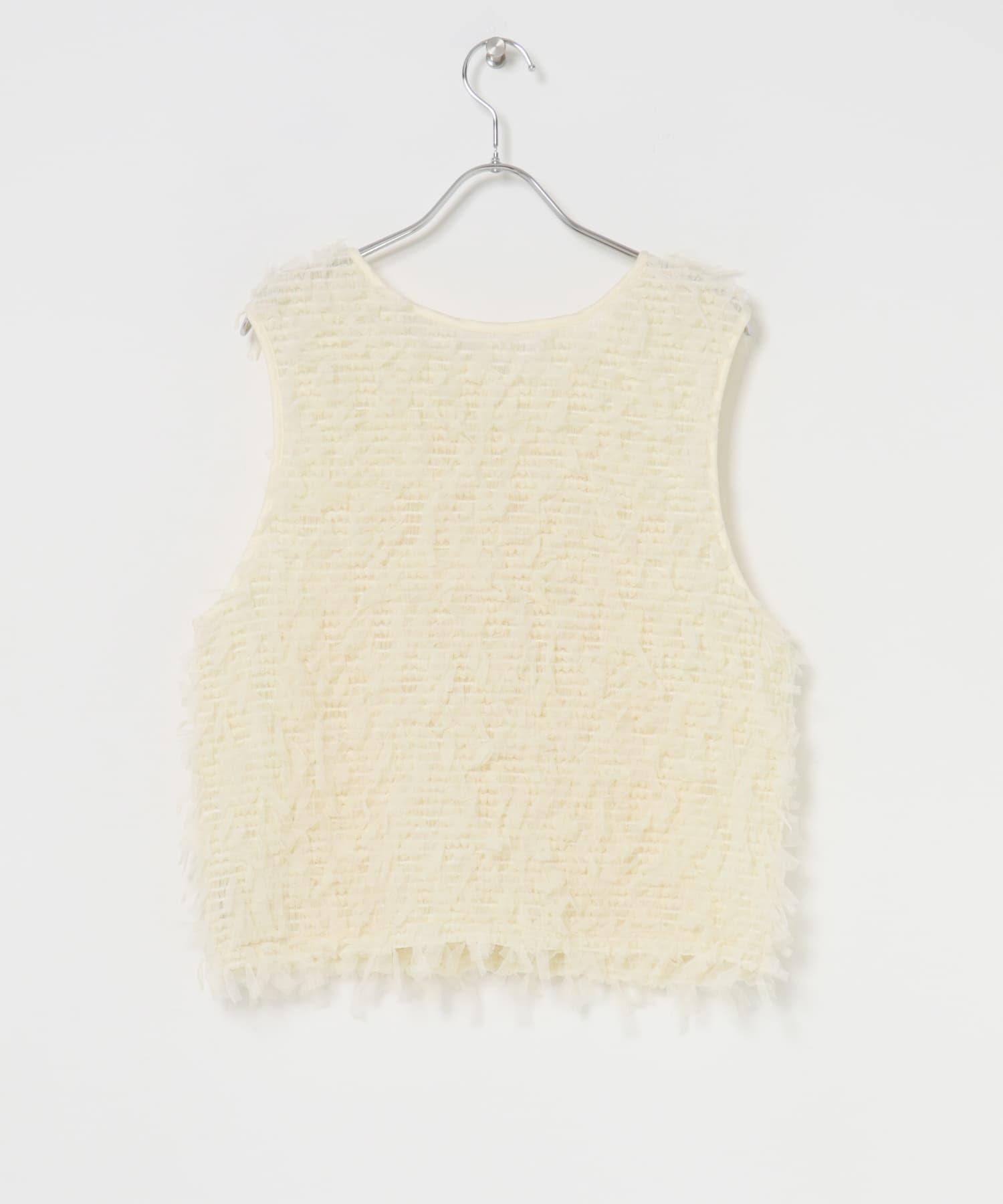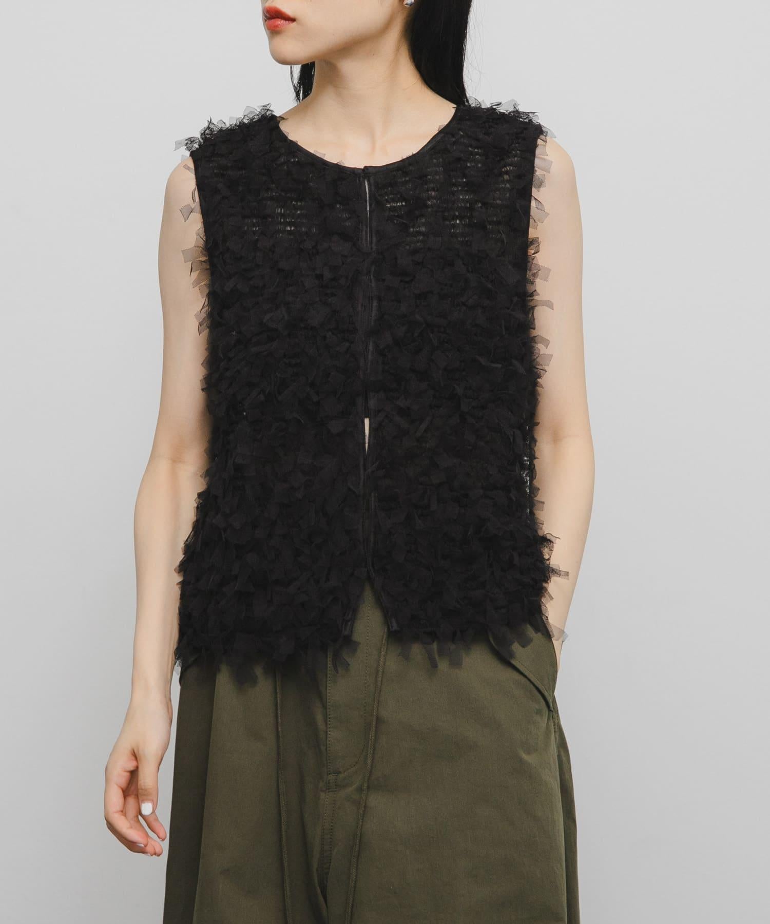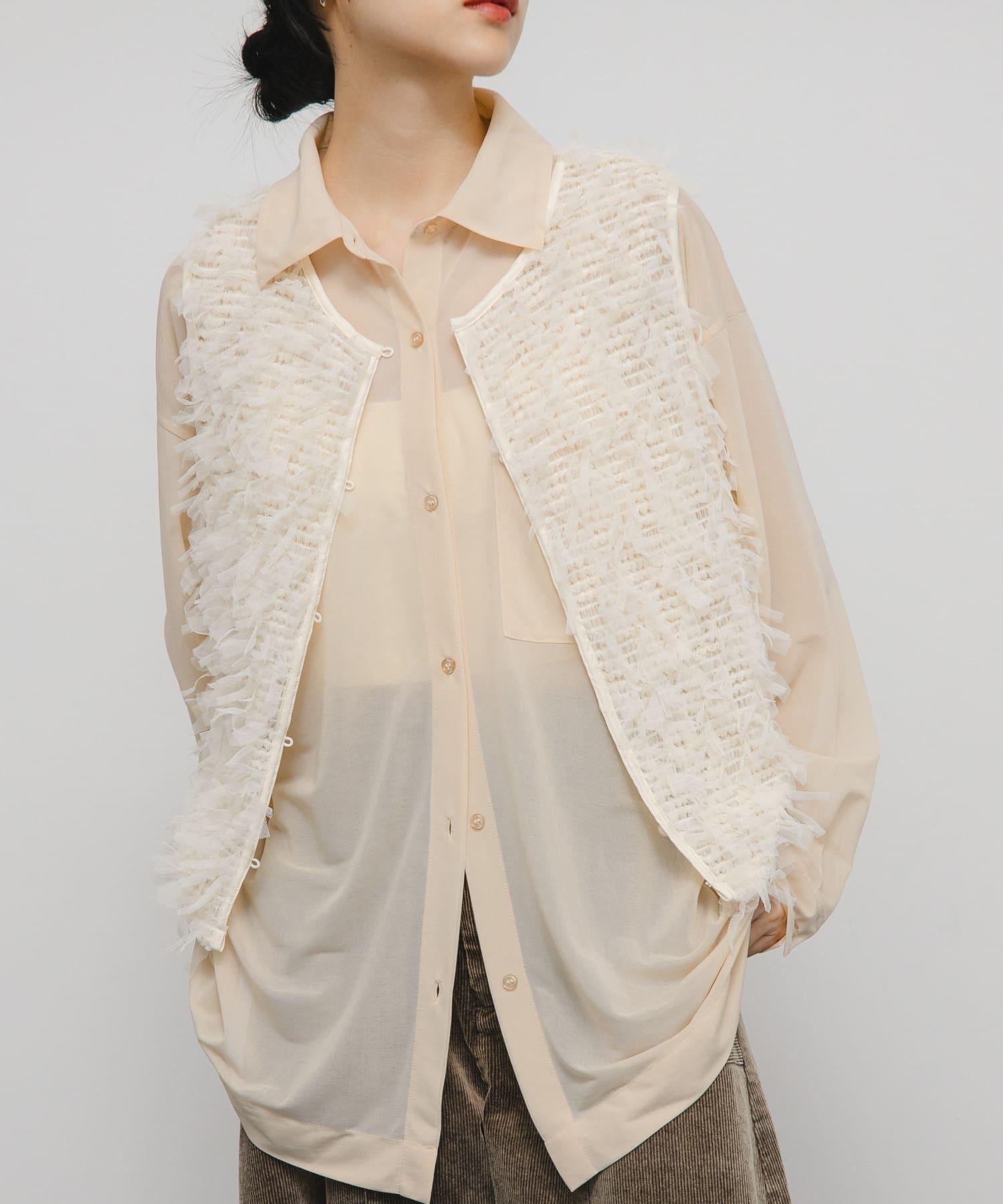 馬甲通身飾有緞帶薄紗,極具存在感。它的尺寸小巧,可以疊穿在剪裁縫製的上衣或背心上,打造清新的造型。前面的紐扣有接縫規格,因此也可以像襯衫一樣穿著。