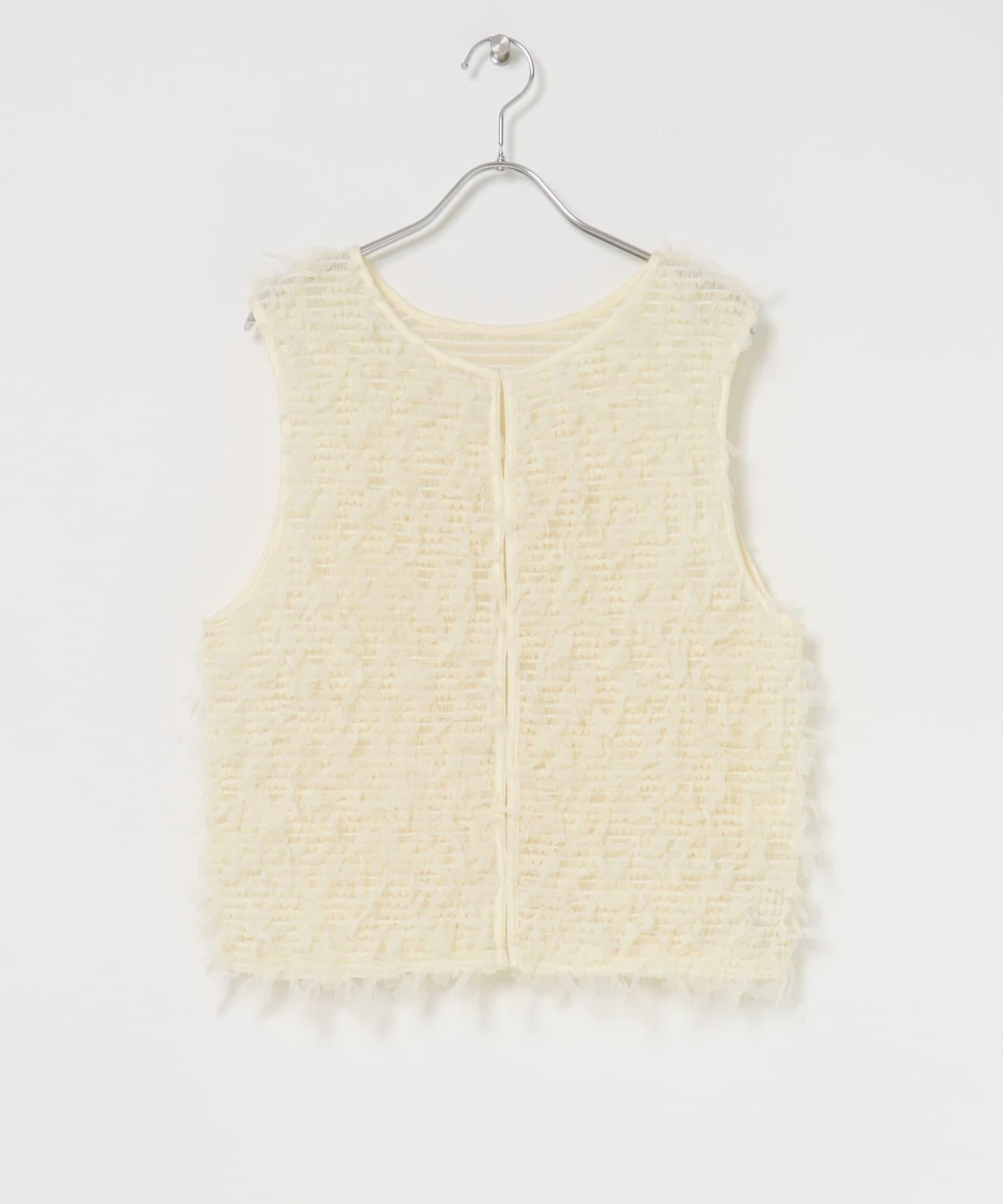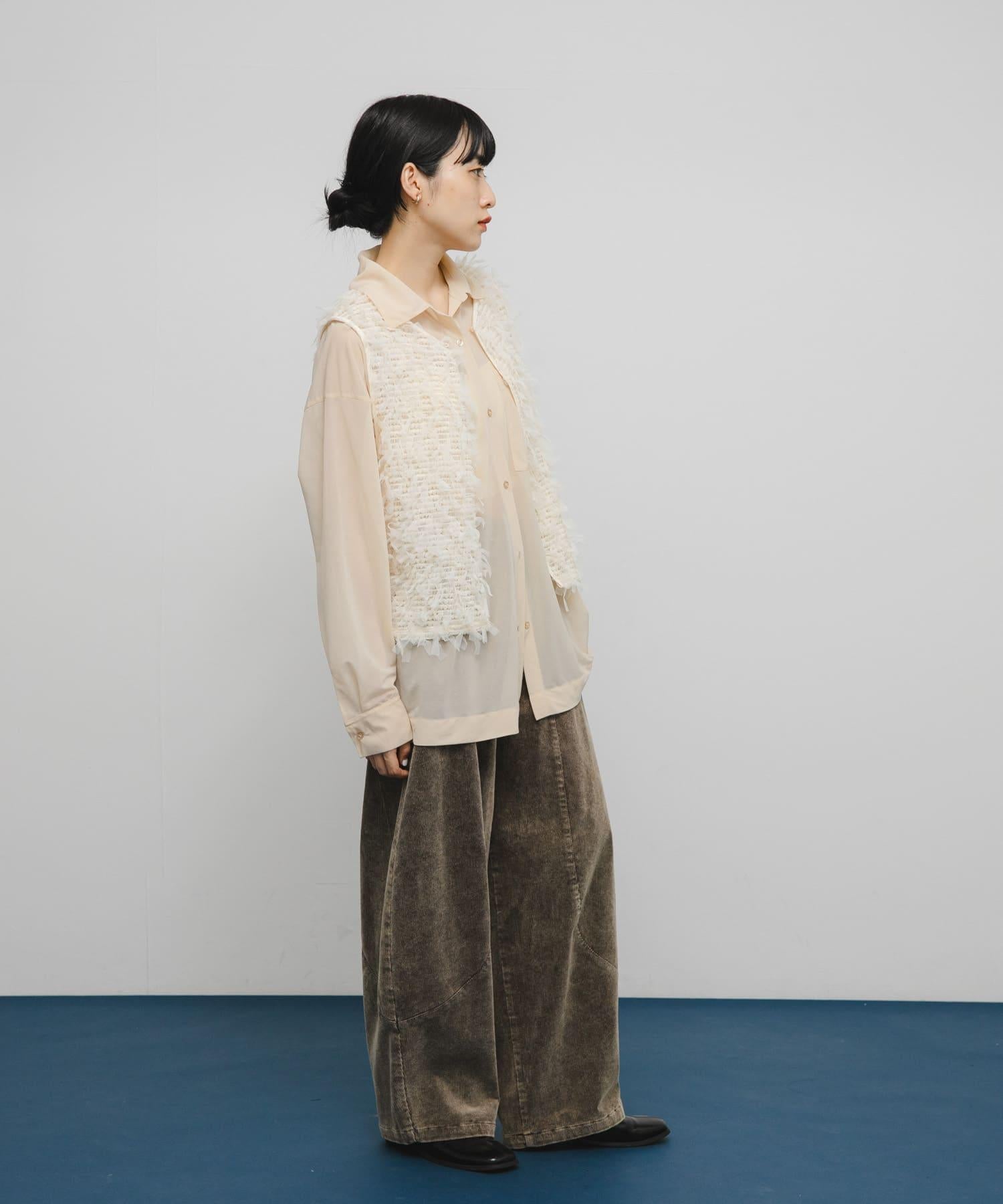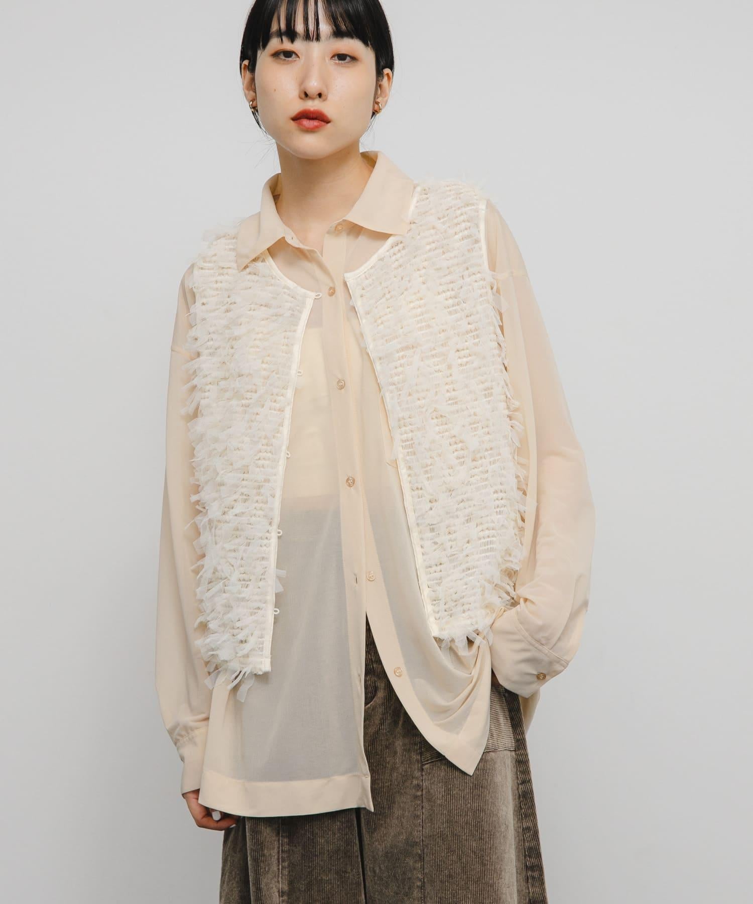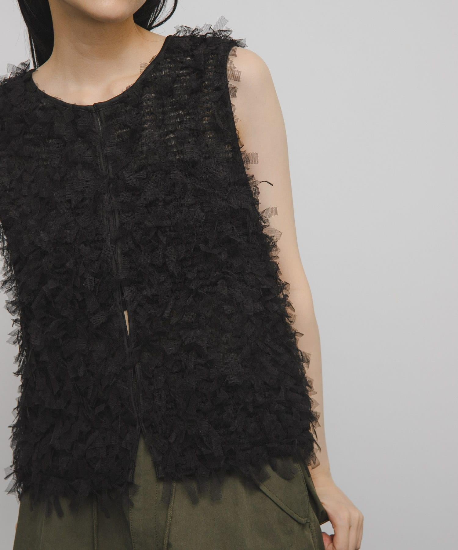 馬甲通身飾有緞帶薄紗,極具存在感。它的尺寸小巧,可以疊穿在剪裁縫製的上衣或背心上,打造清新的造型。前面的紐扣有接縫規格,因此也可以像襯衫一樣穿著。