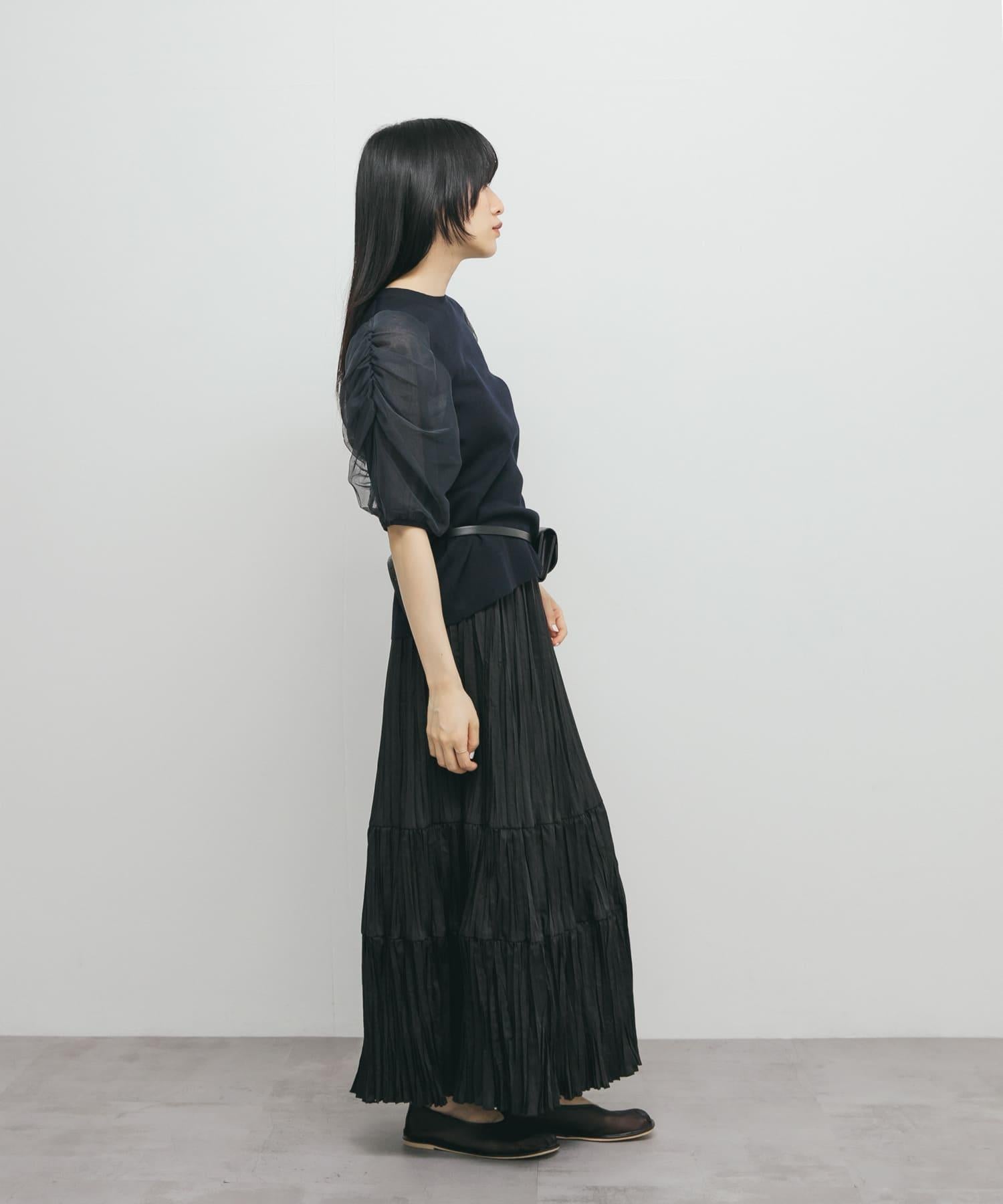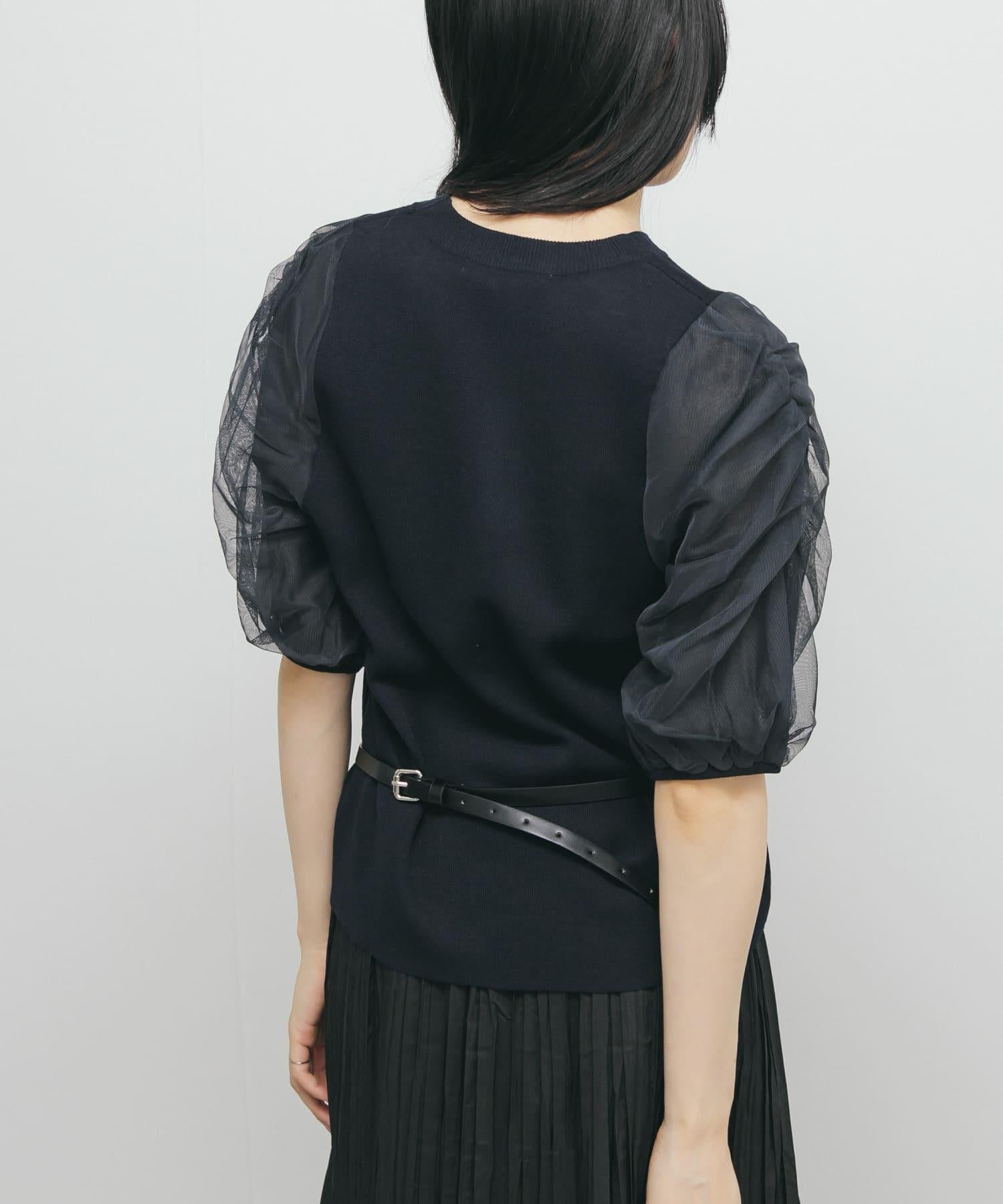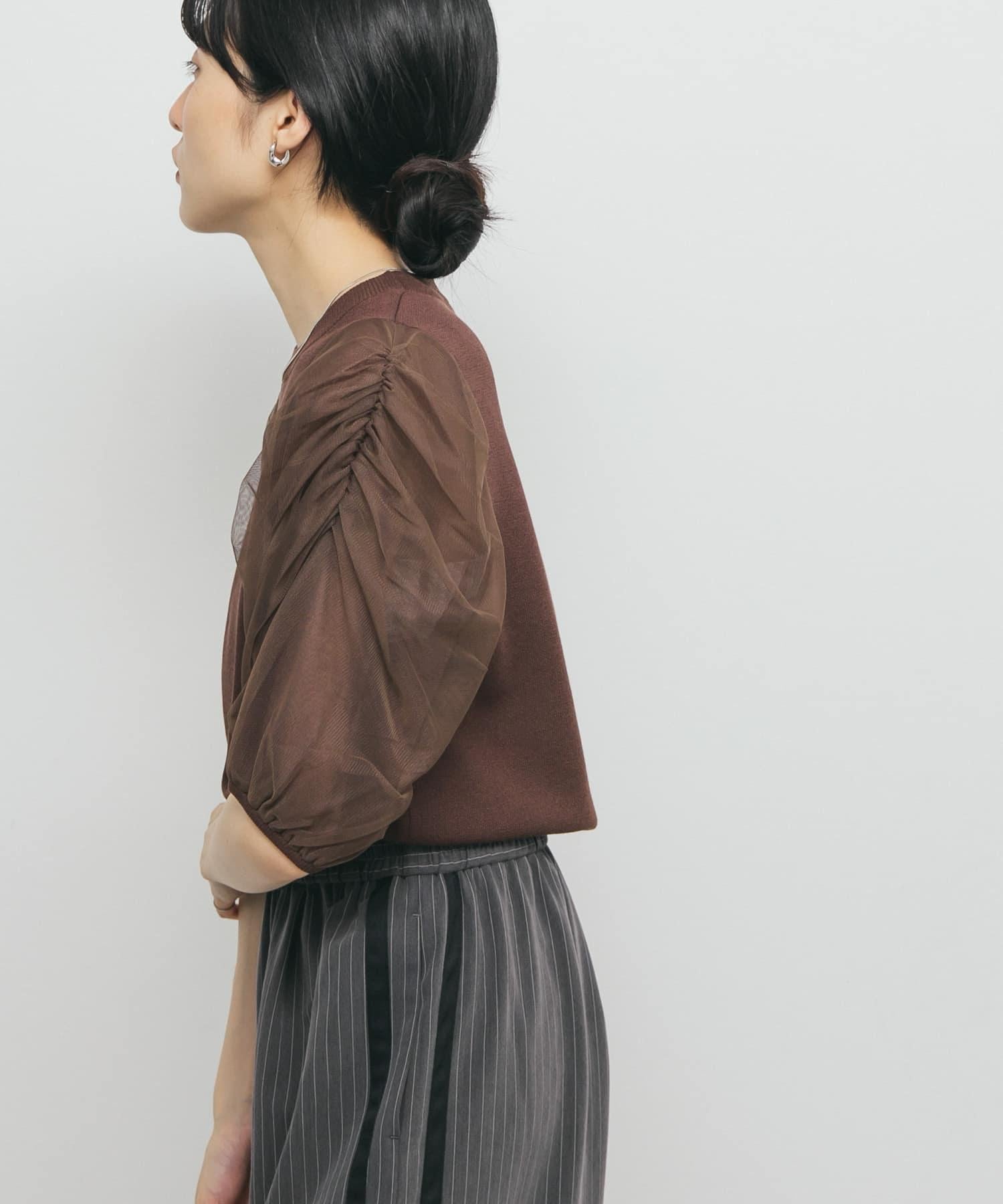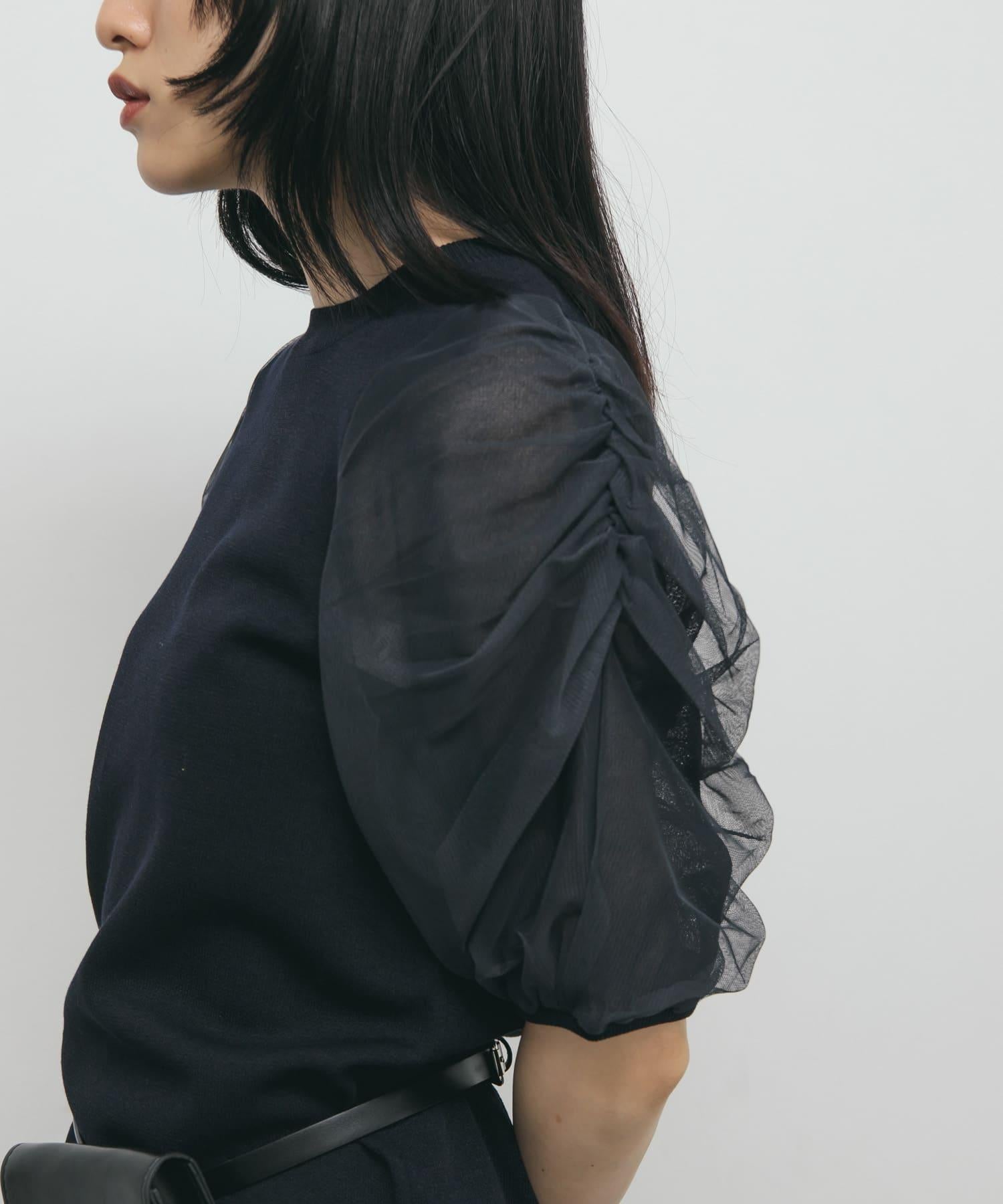 這款上衣採用乾爽觸感紗線,質地輕盈,適合夏季穿著,袖子上的薄紗層層疊疊,收攏後更顯豐滿。衣身適度緊湊,突出了袖子的體積感。它不會過於甜膩,因此很適合搭配牛仔褲和休閒褲。
