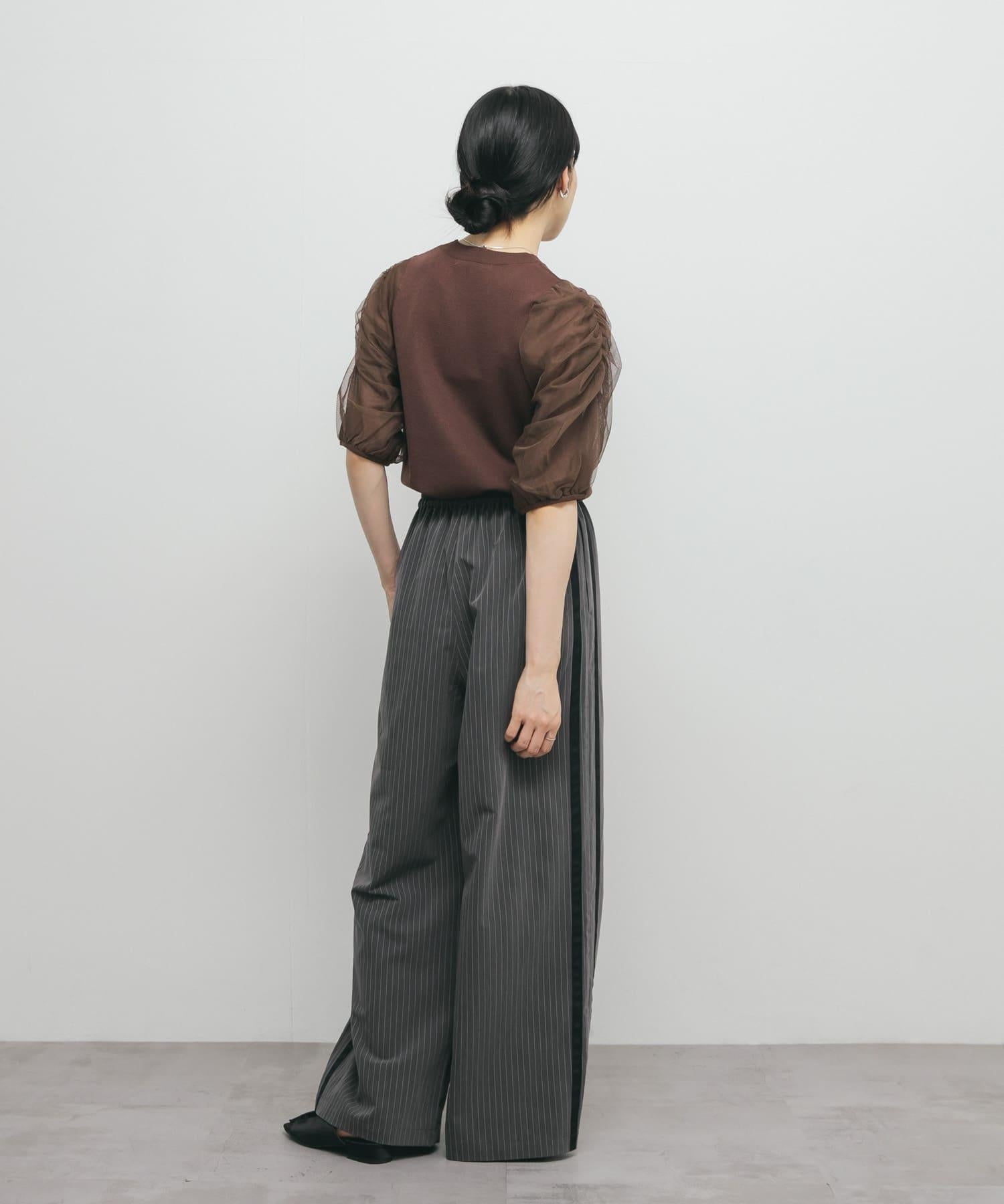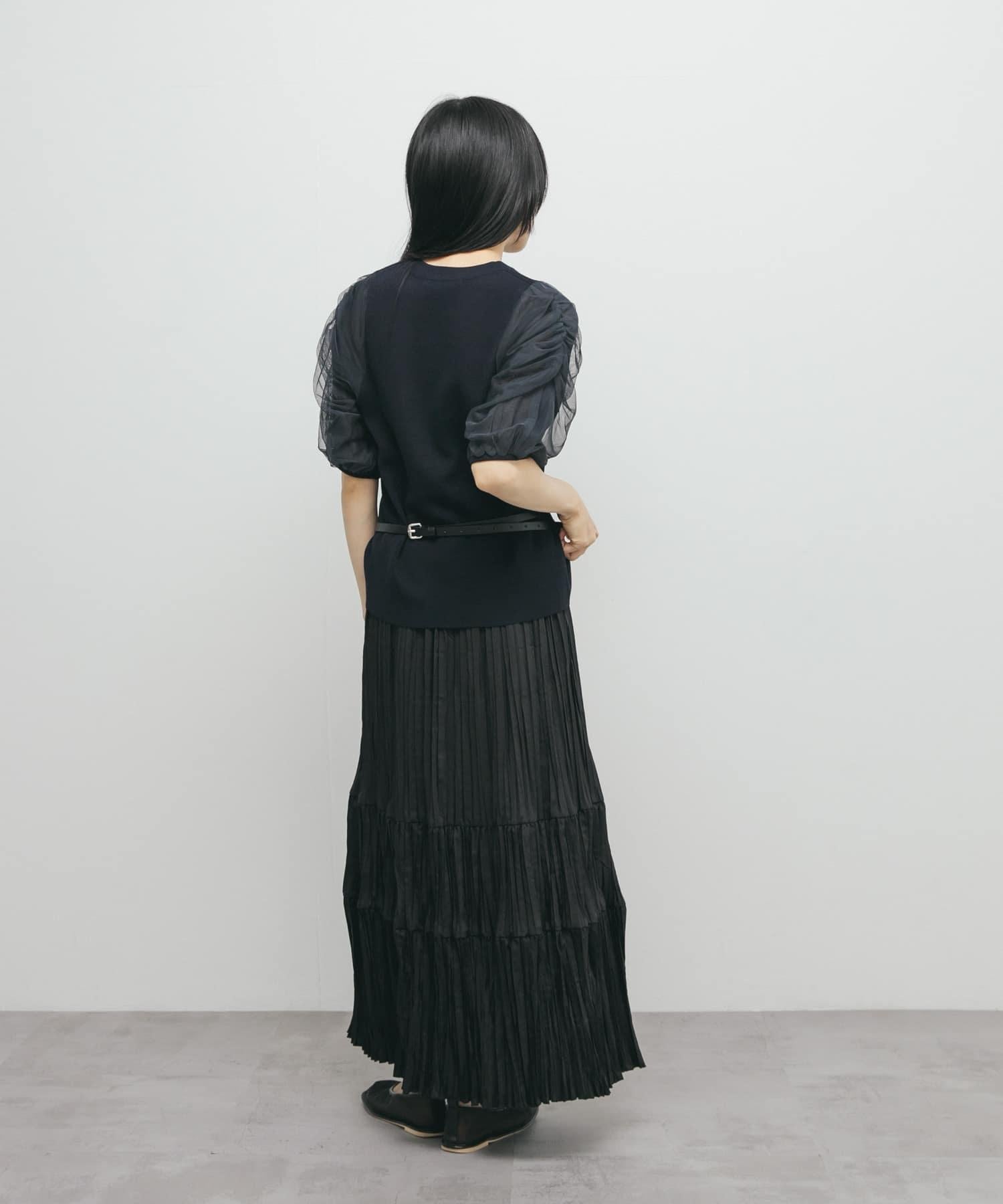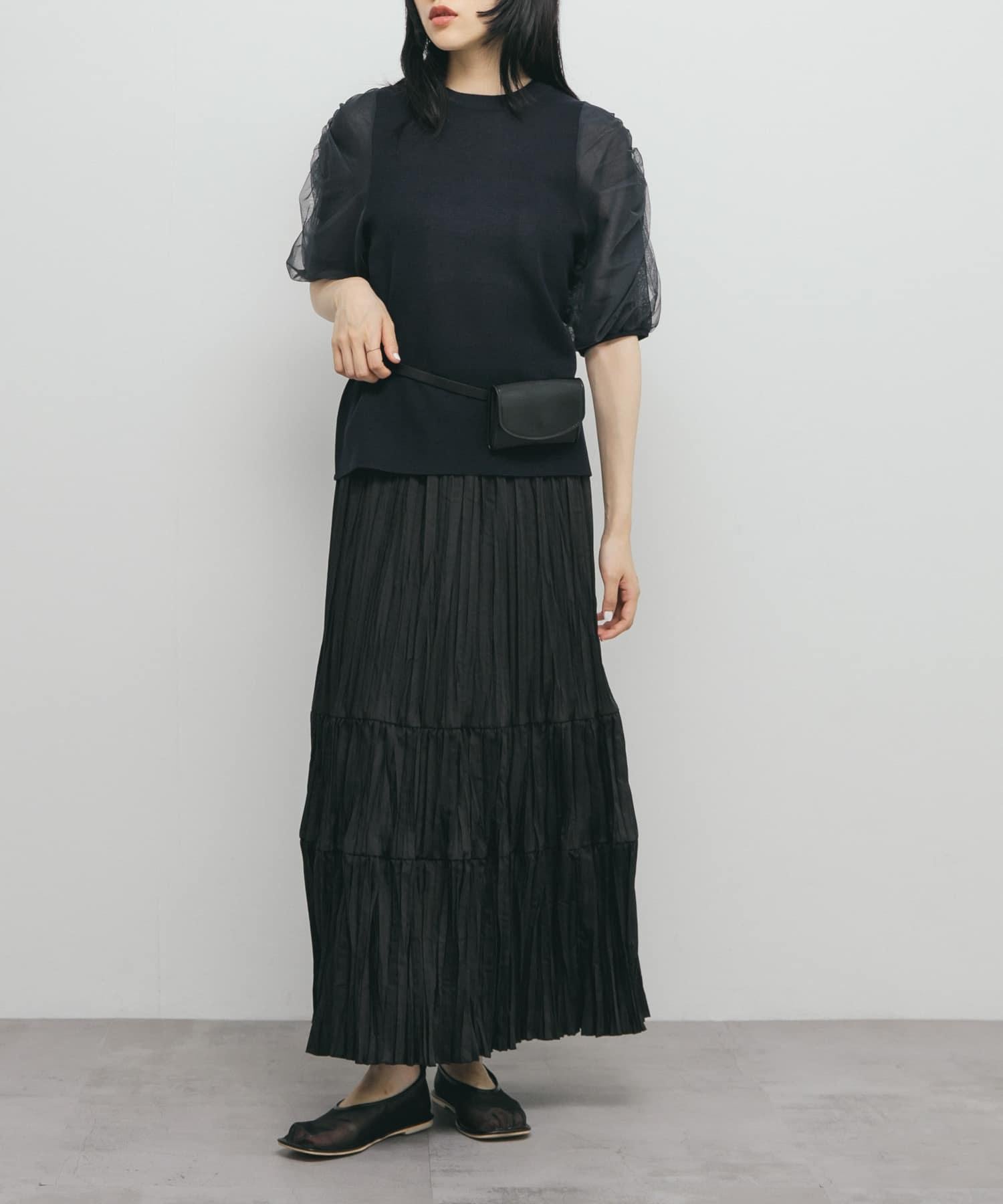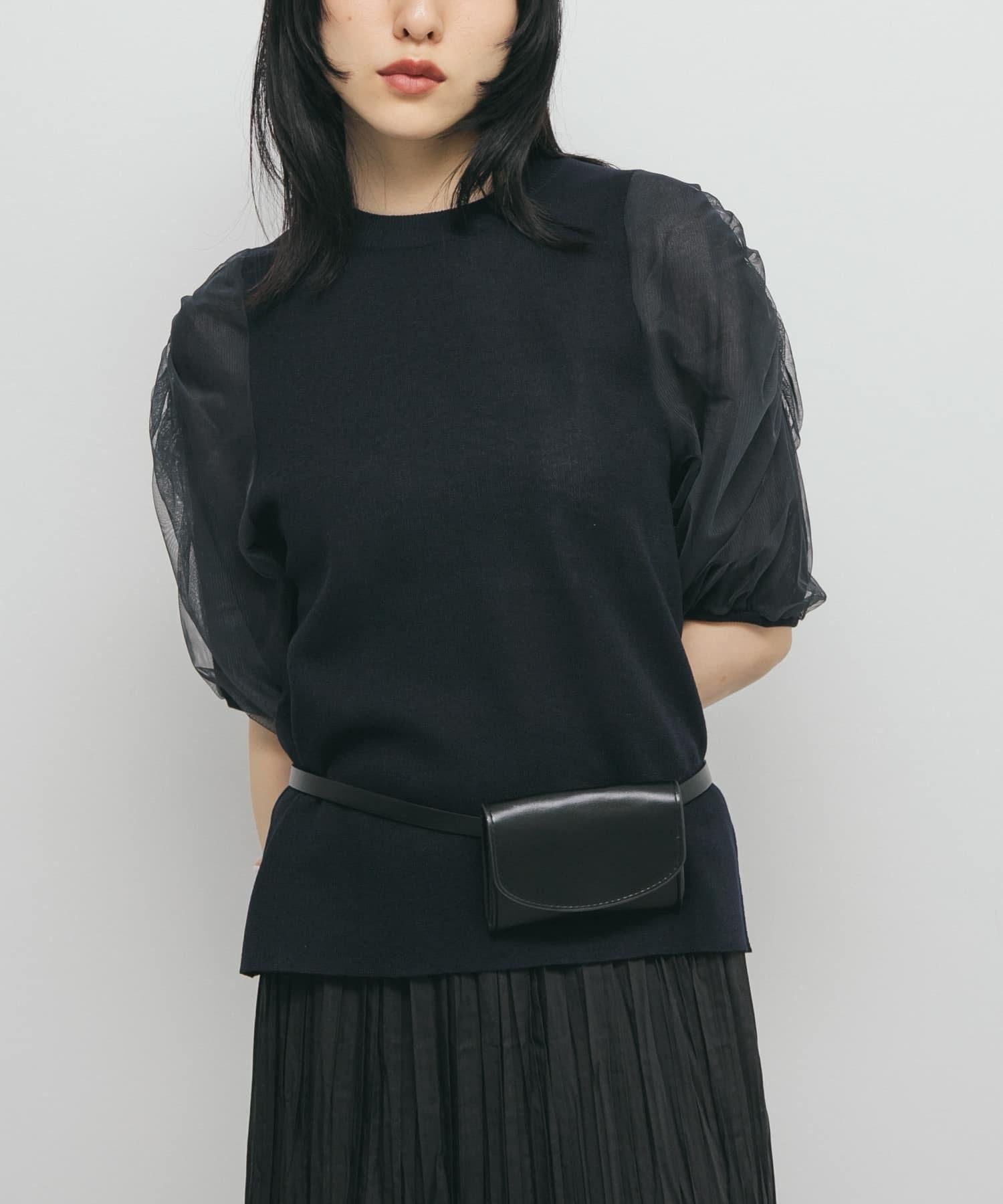 這款上衣採用乾爽觸感紗線,質地輕盈,適合夏季穿著,袖子上的薄紗層層疊疊,收攏後更顯豐滿。衣身適度緊湊,突出了袖子的體積感。它不會過於甜膩,因此很適合搭配牛仔褲和休閒褲。