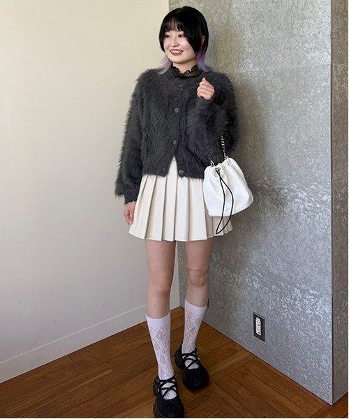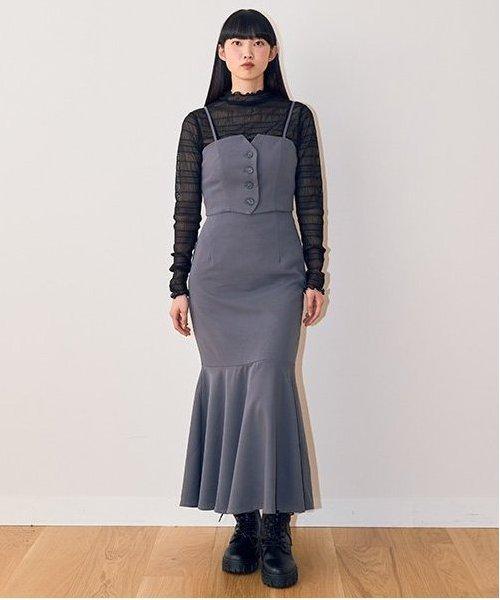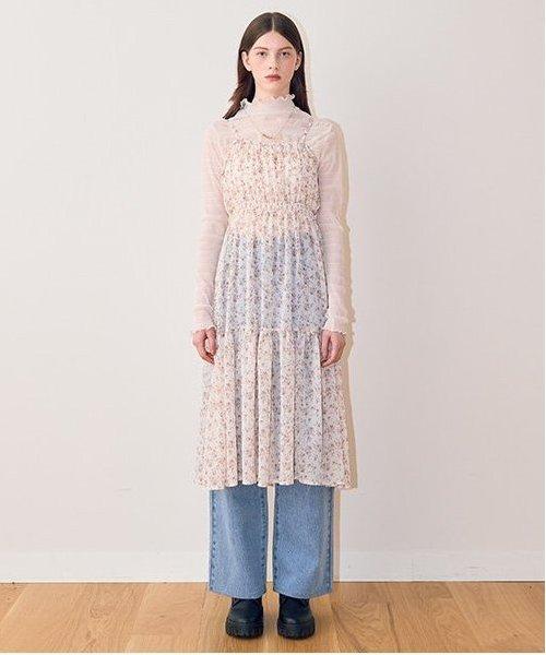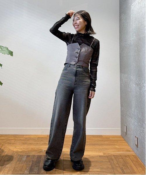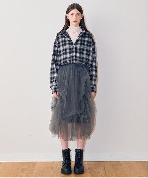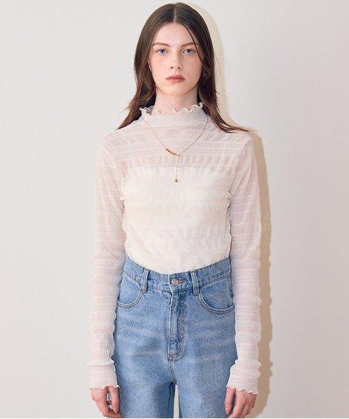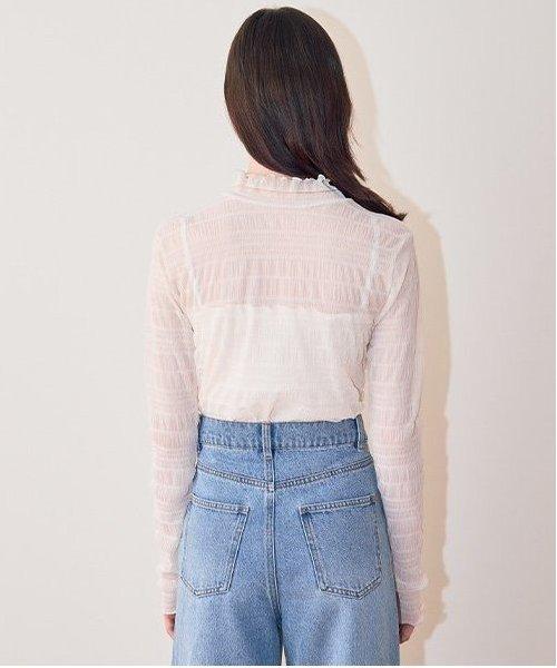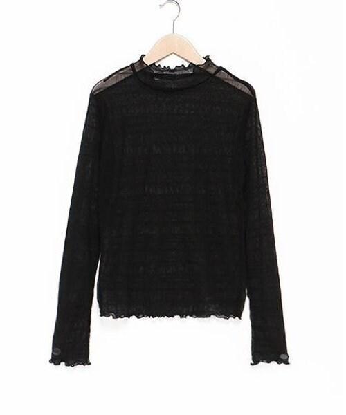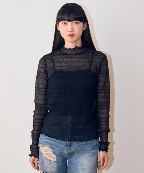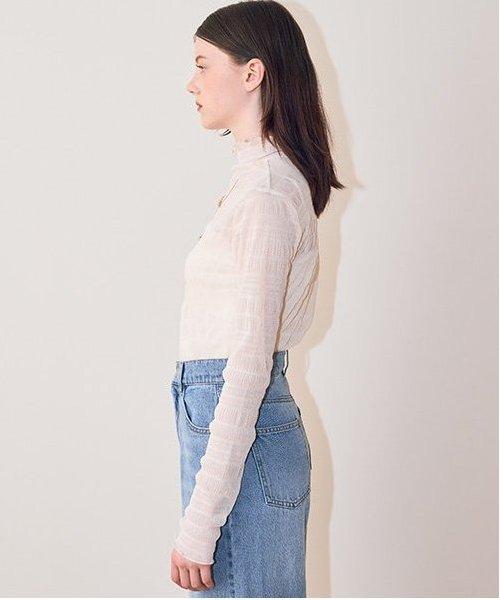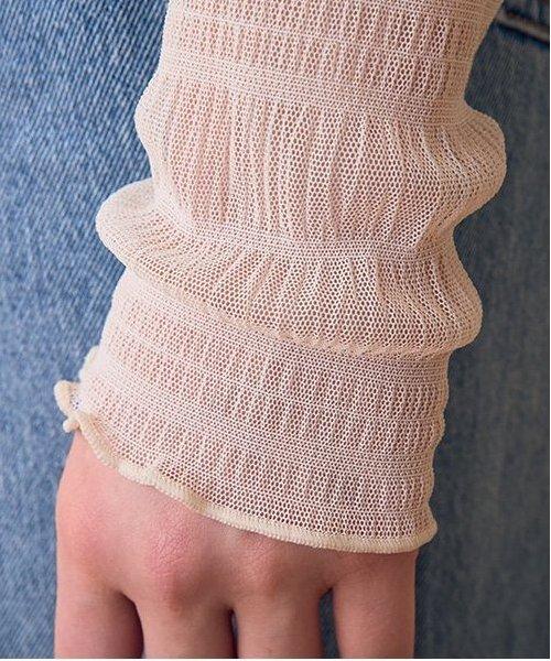 透視上衣,透明度適中。表面凹凸不平的紋理為您的搭配增添了華麗的亮點!長袖的長度是一大亮點,從袖口可以略微看出。