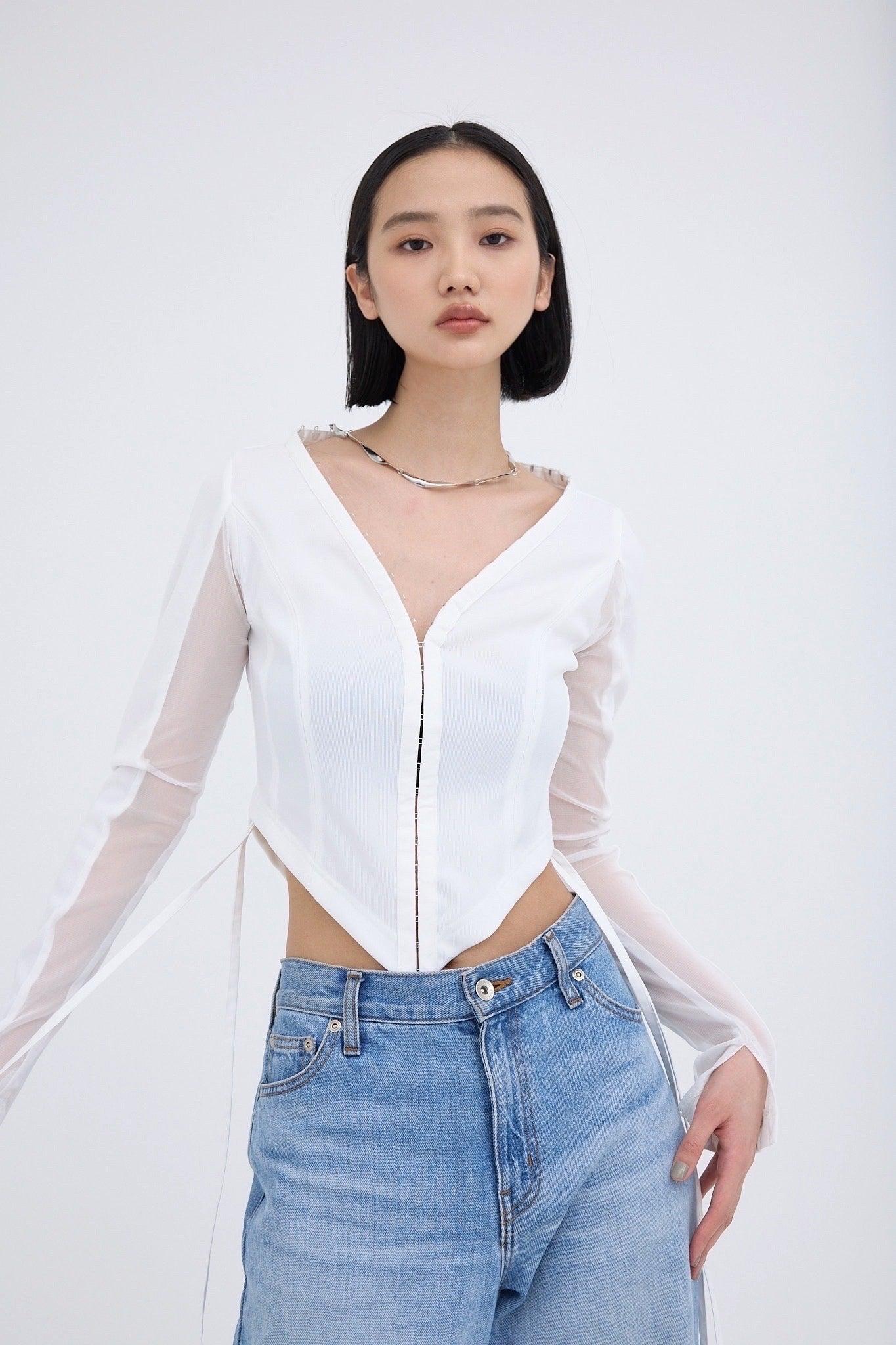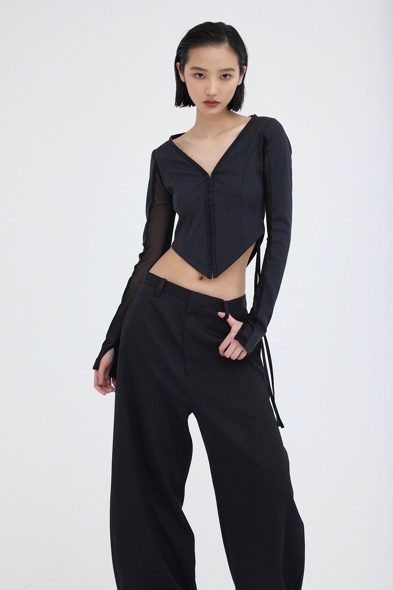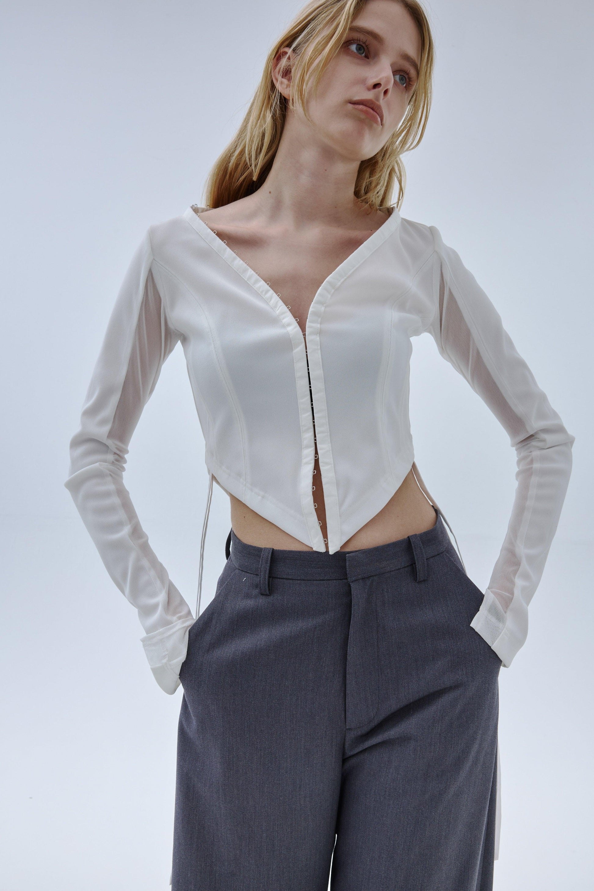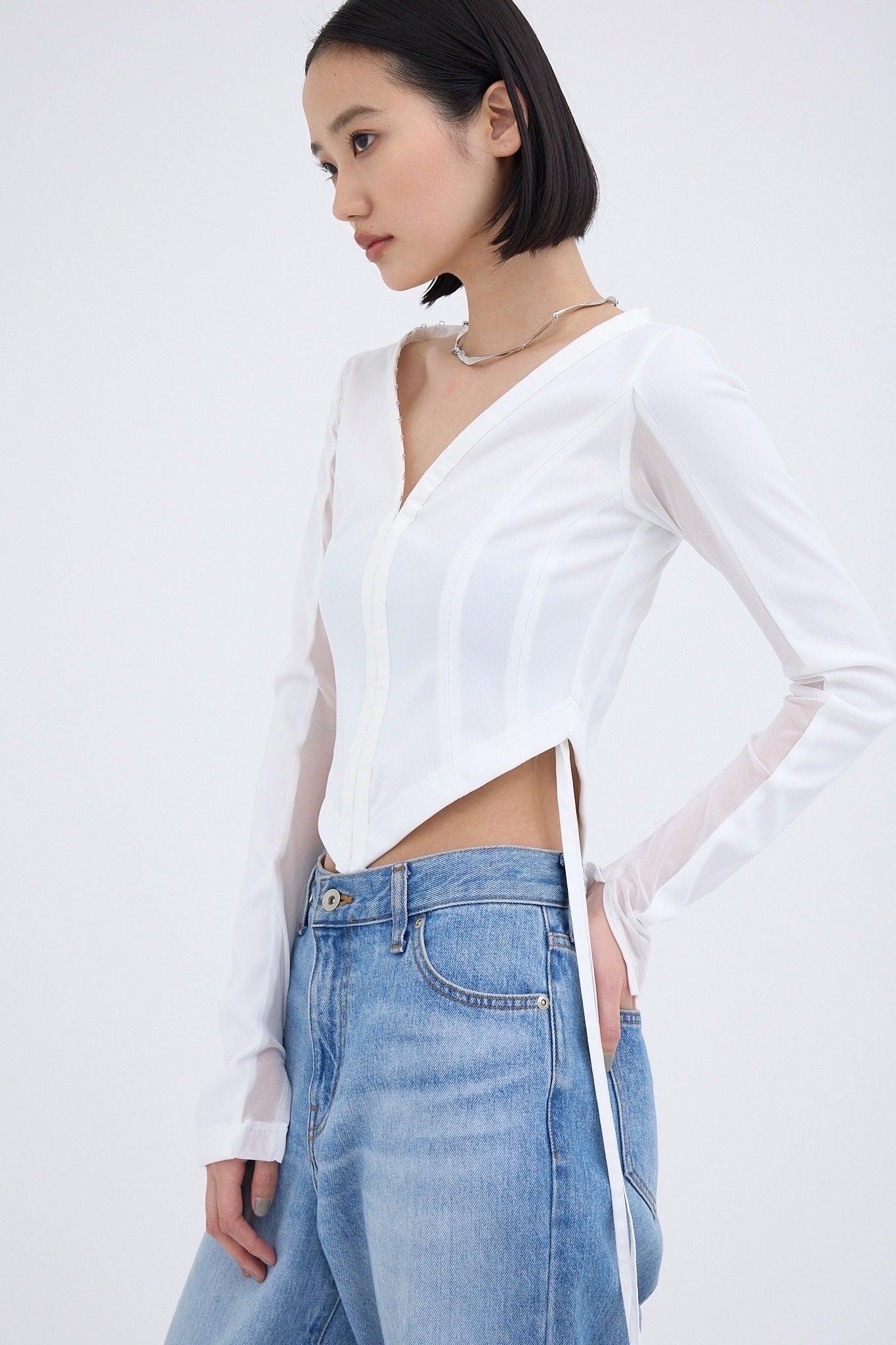 精心設計的弧形下襬能很好地突出腰線,而透視袖則給人一種輕鬆的感覺,恰到好處地展現了性感。