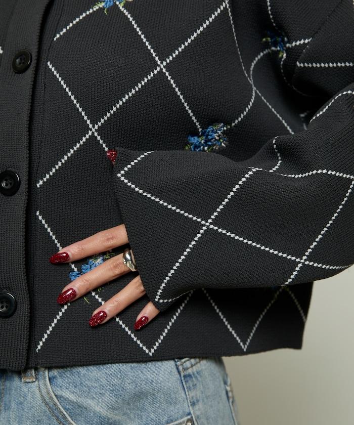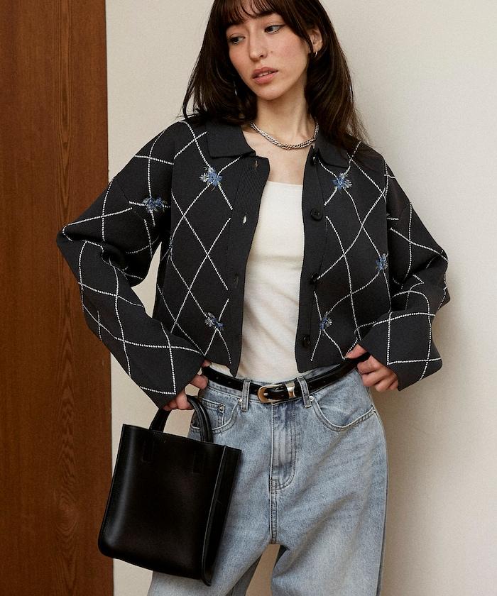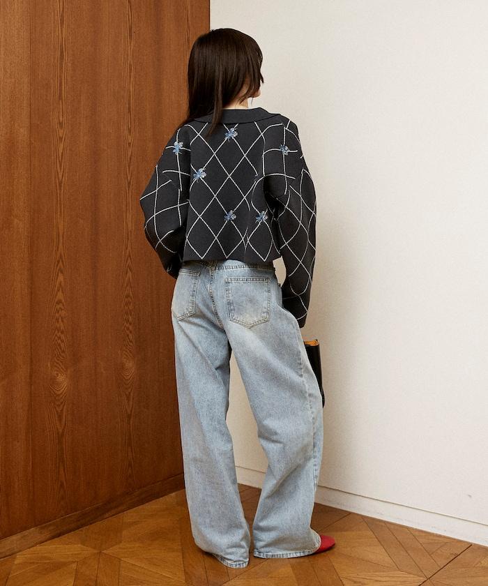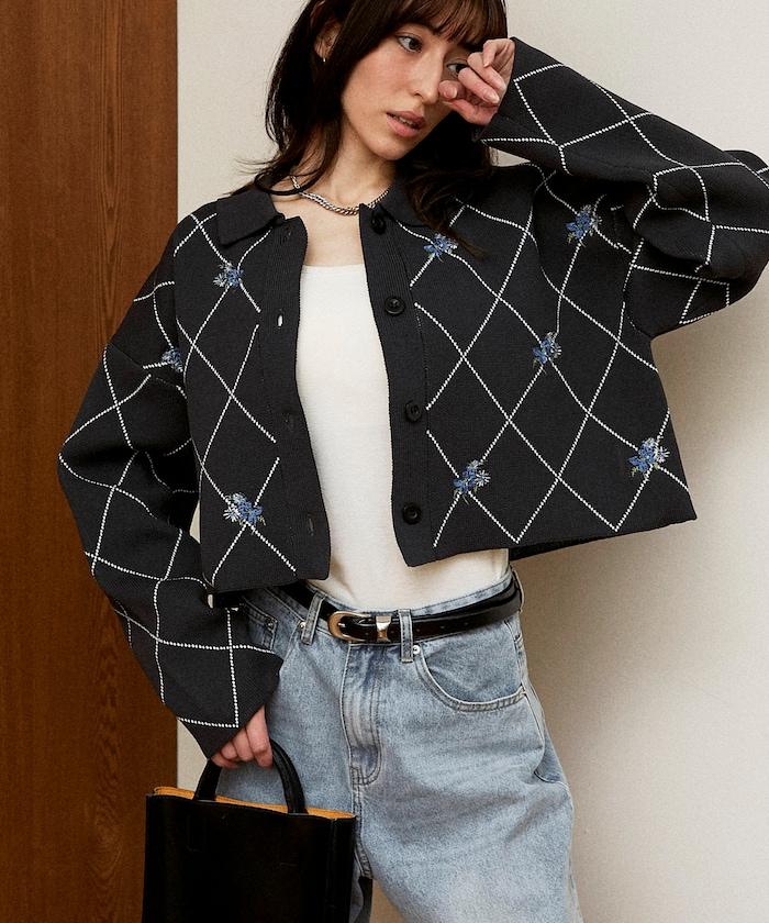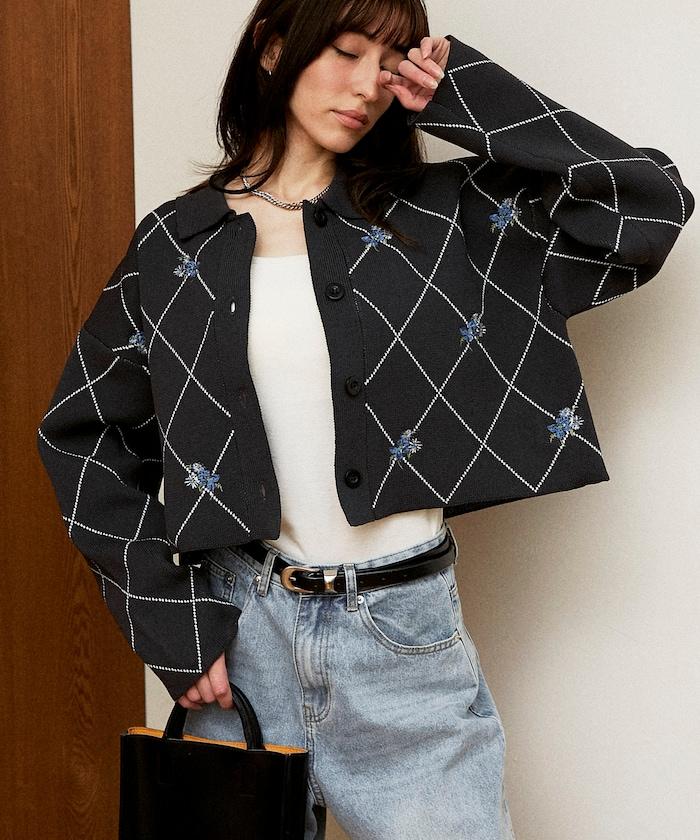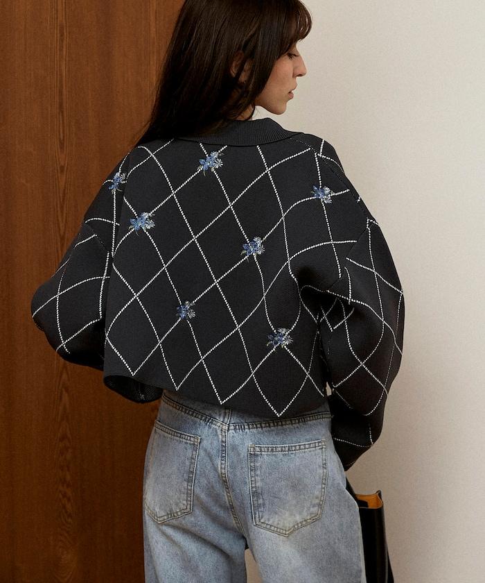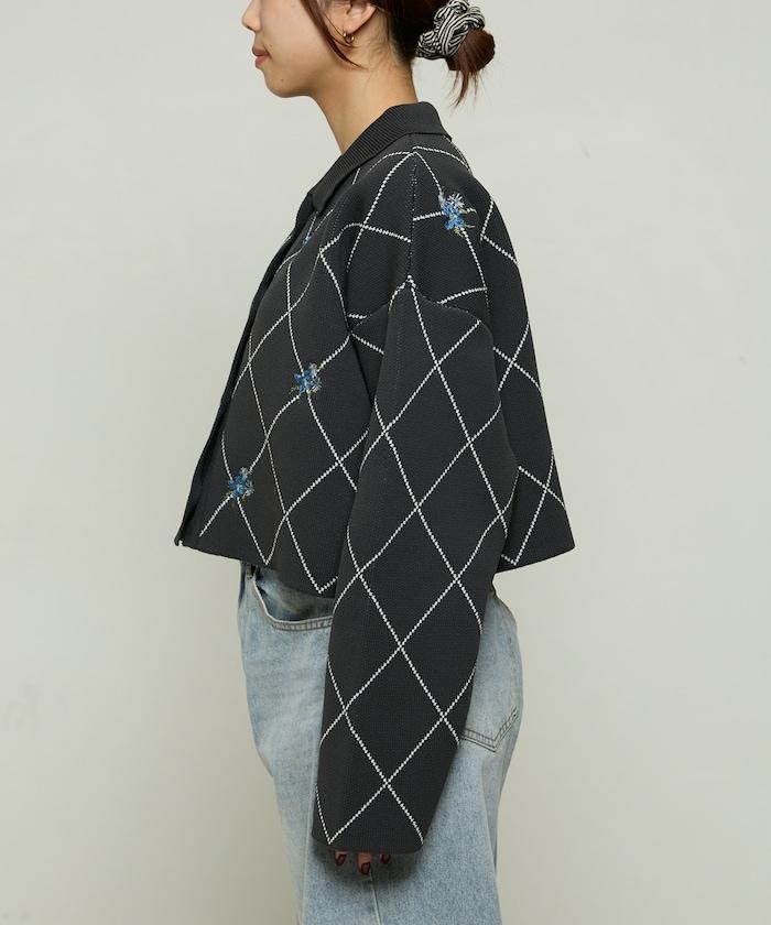 線條鑽石&花卉刺繡短款開衫