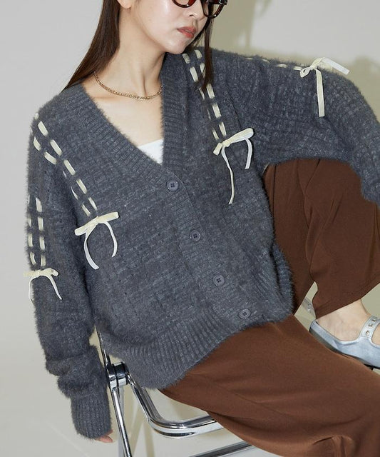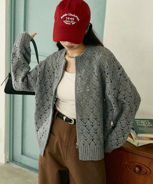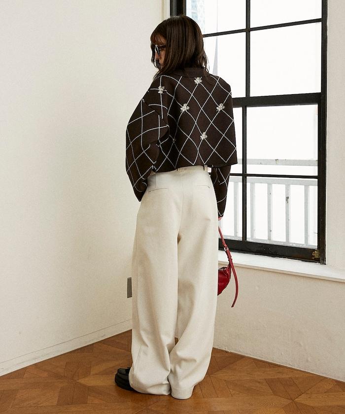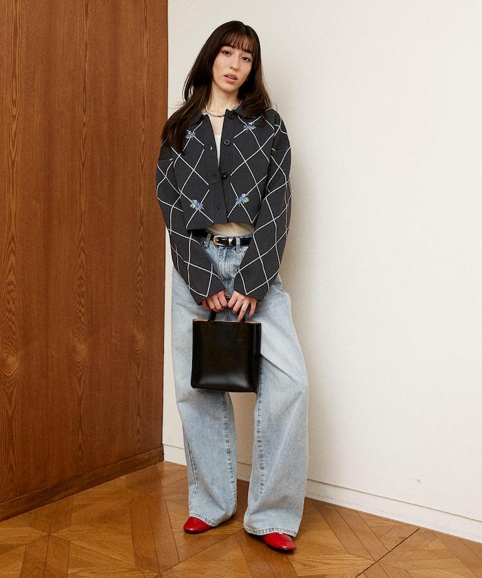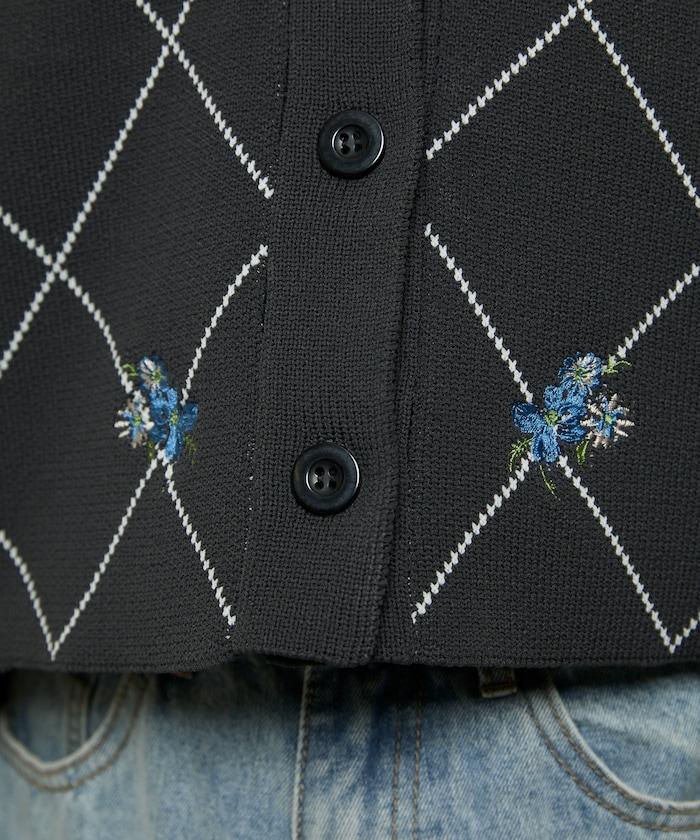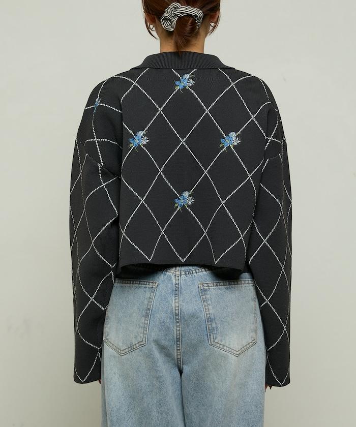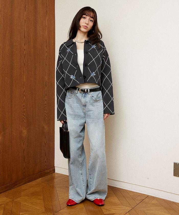 線條鑽石&花卉刺繡短款開衫