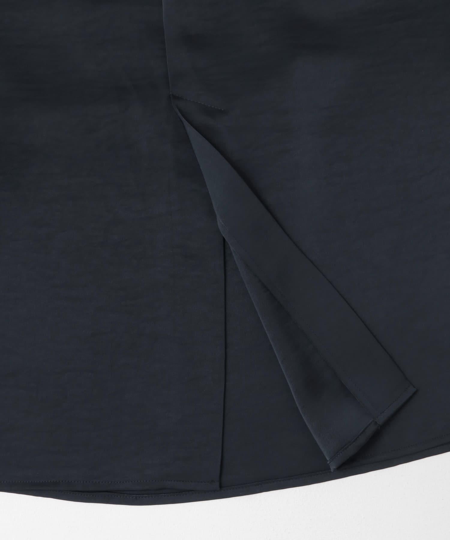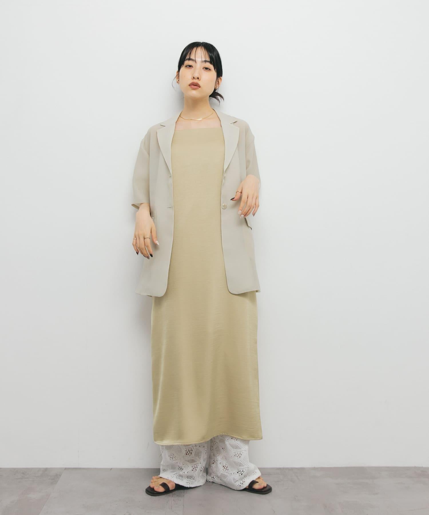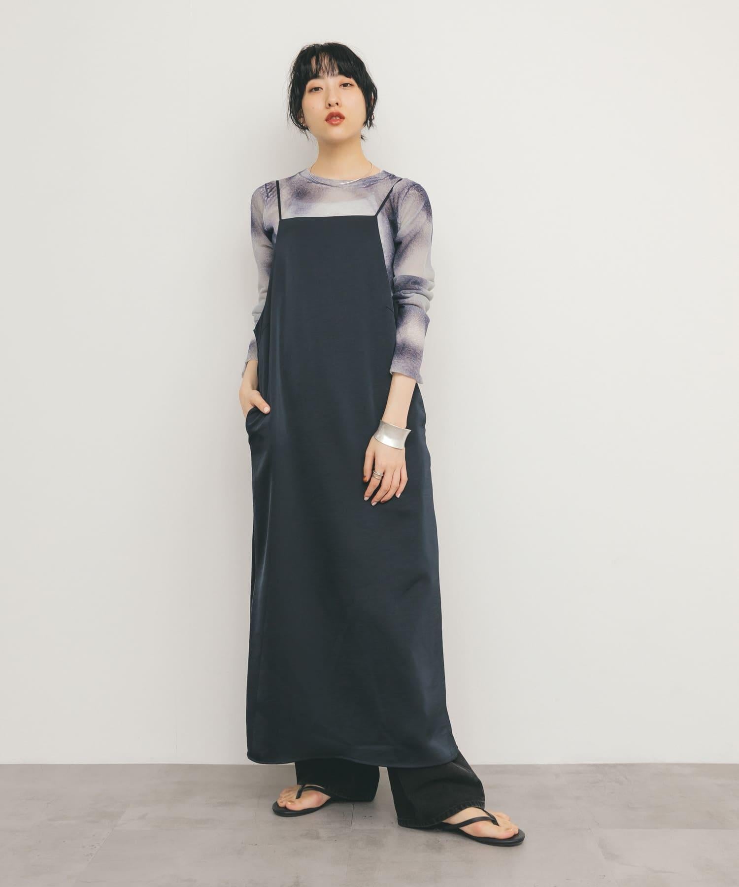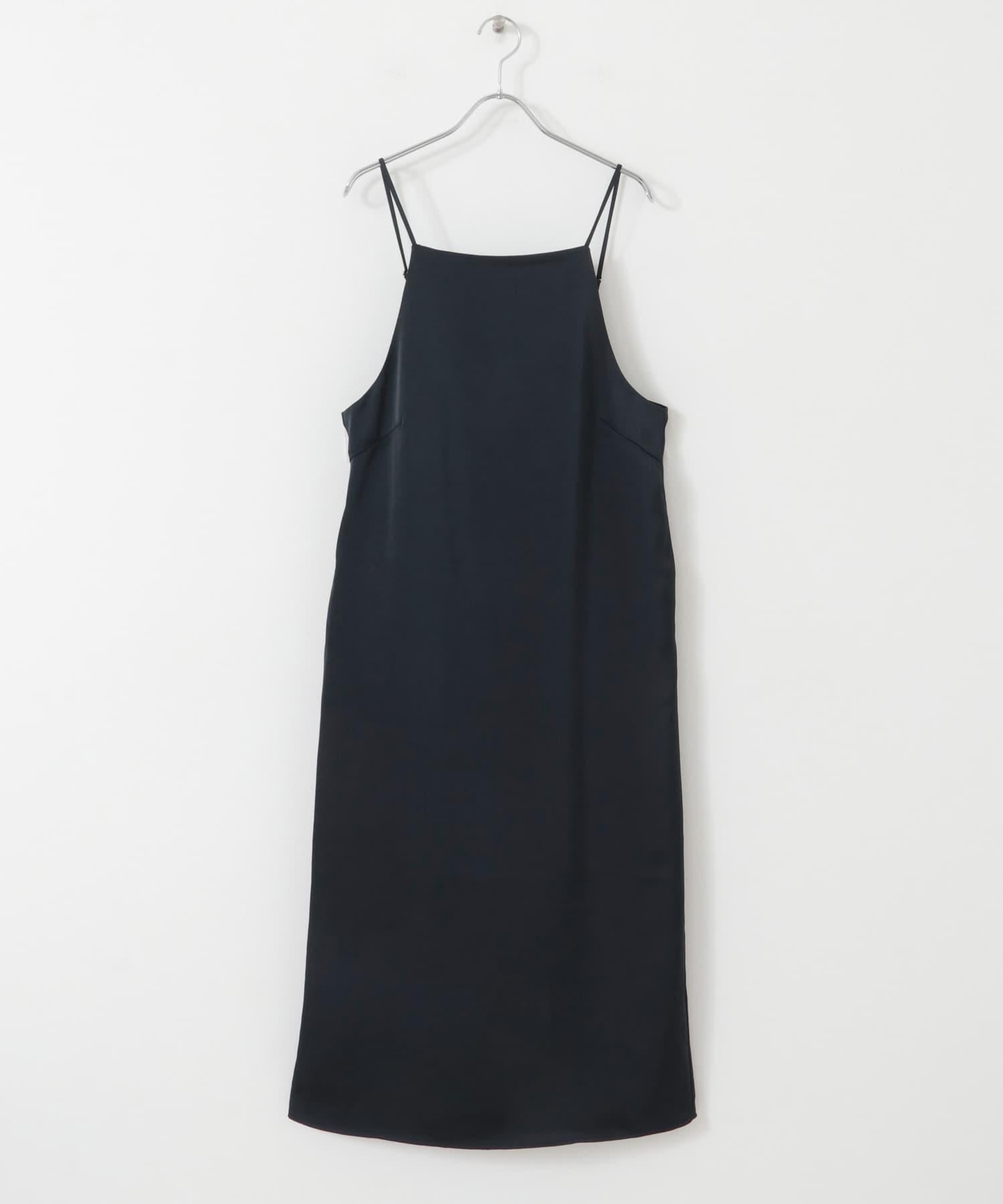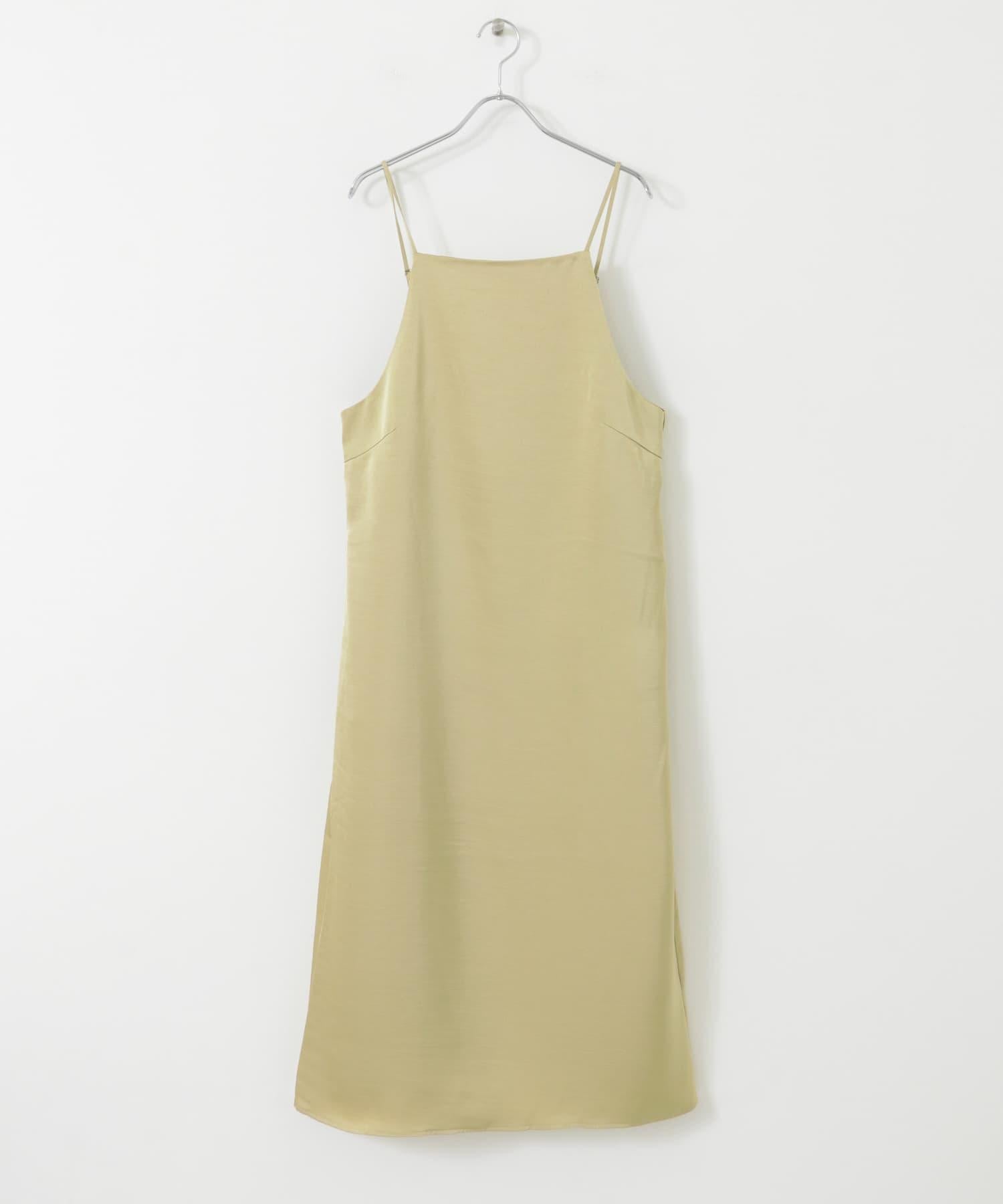 吊帶連衣裙採用光澤適中的緞面面料製成。方形領口使其顯得端莊大方。同時,它的厚度也很結實,自然顯得貴氣十足。根據內搭的不同,您可以享受到從美觀到休閒的多種風格搭配。