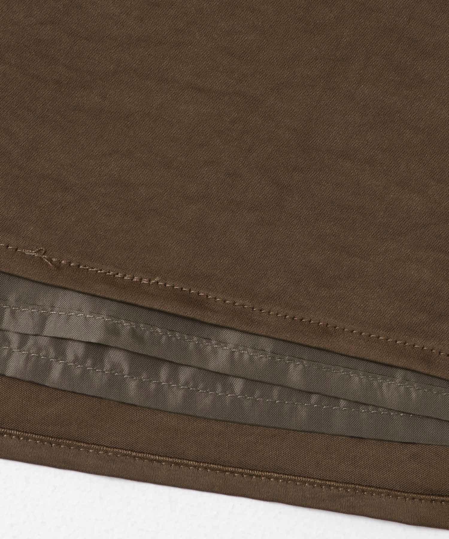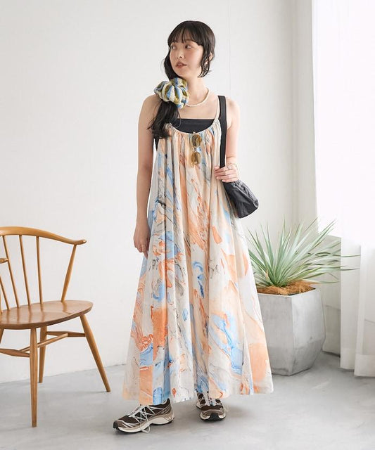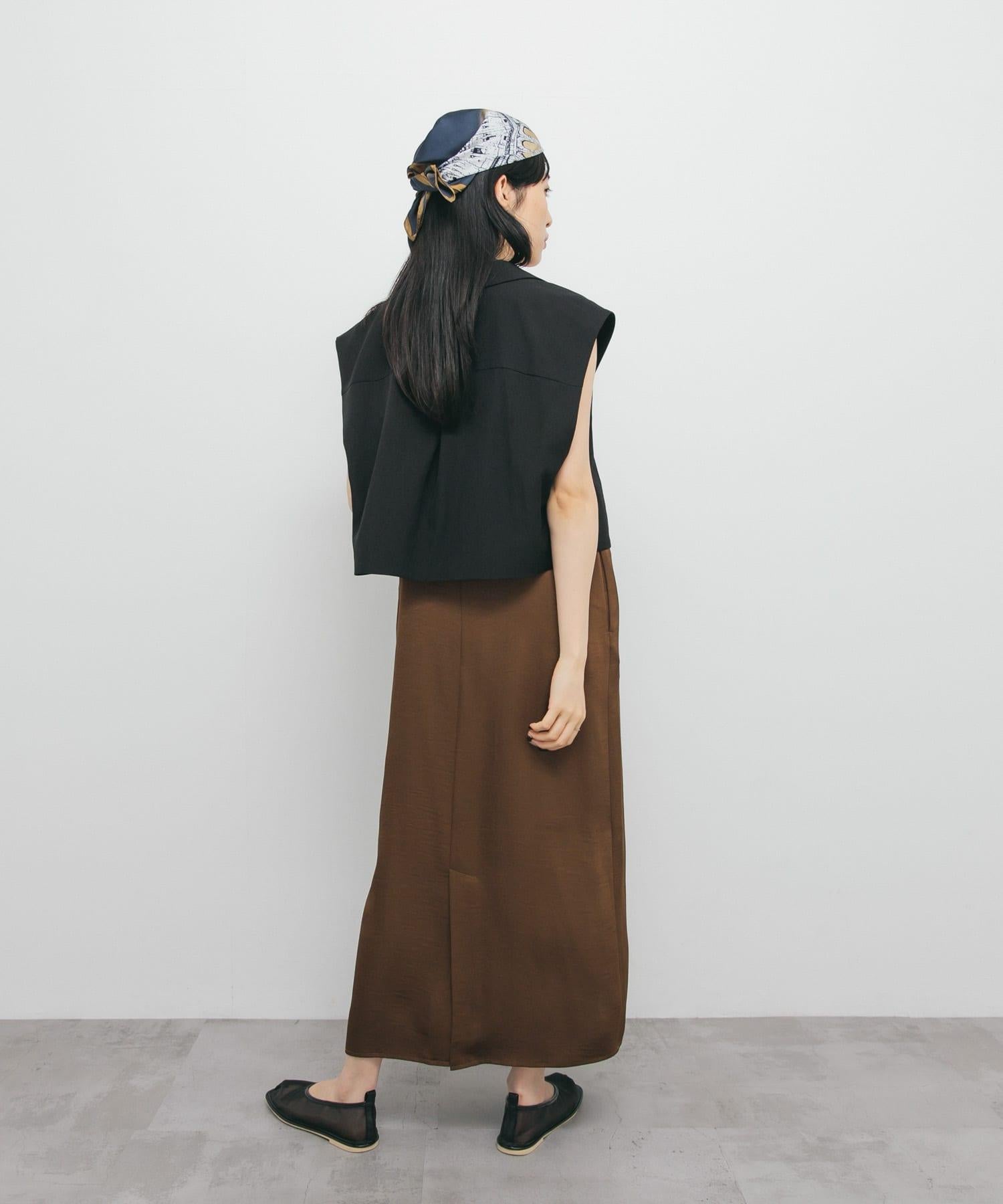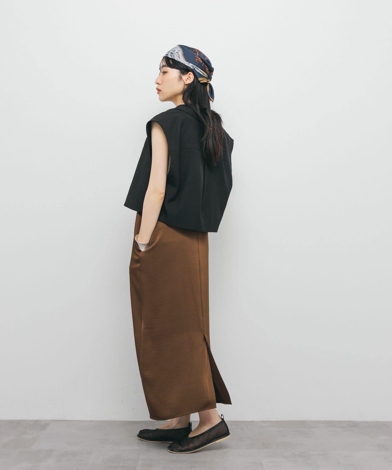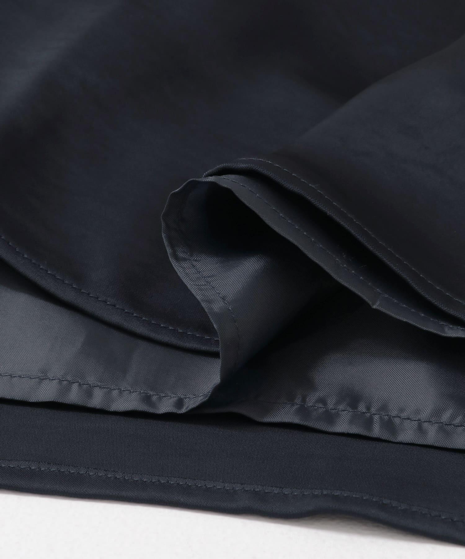 吊帶連衣裙採用光澤適中的緞面面料製成。方形領口使其顯得端莊大方。同時,它的厚度也很結實,自然顯得貴氣十足。根據內搭的不同,您可以享受到從美觀到休閒的多種風格搭配。