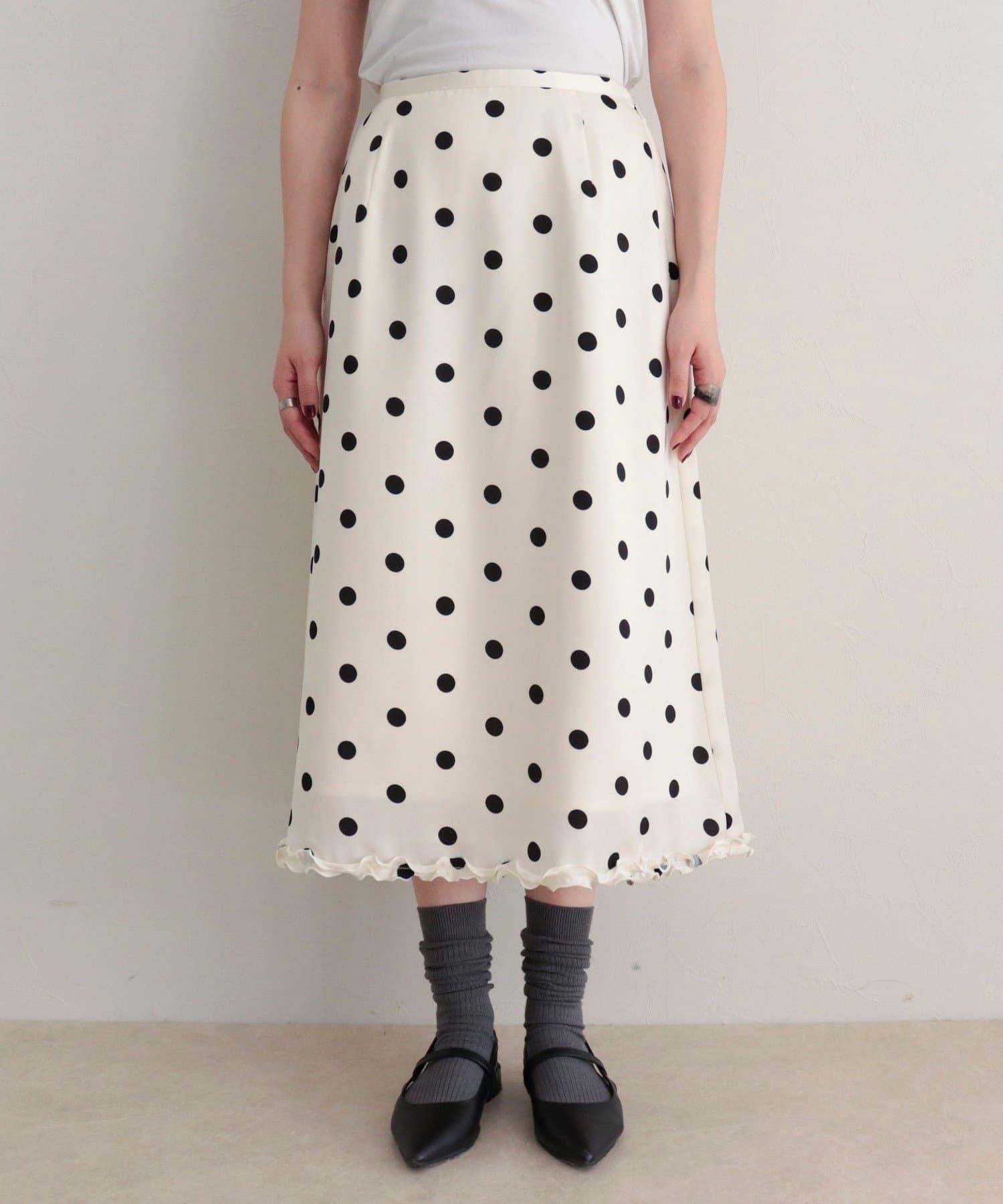 這款中長半身裙由綢緞製成,飾有圓點圖案。