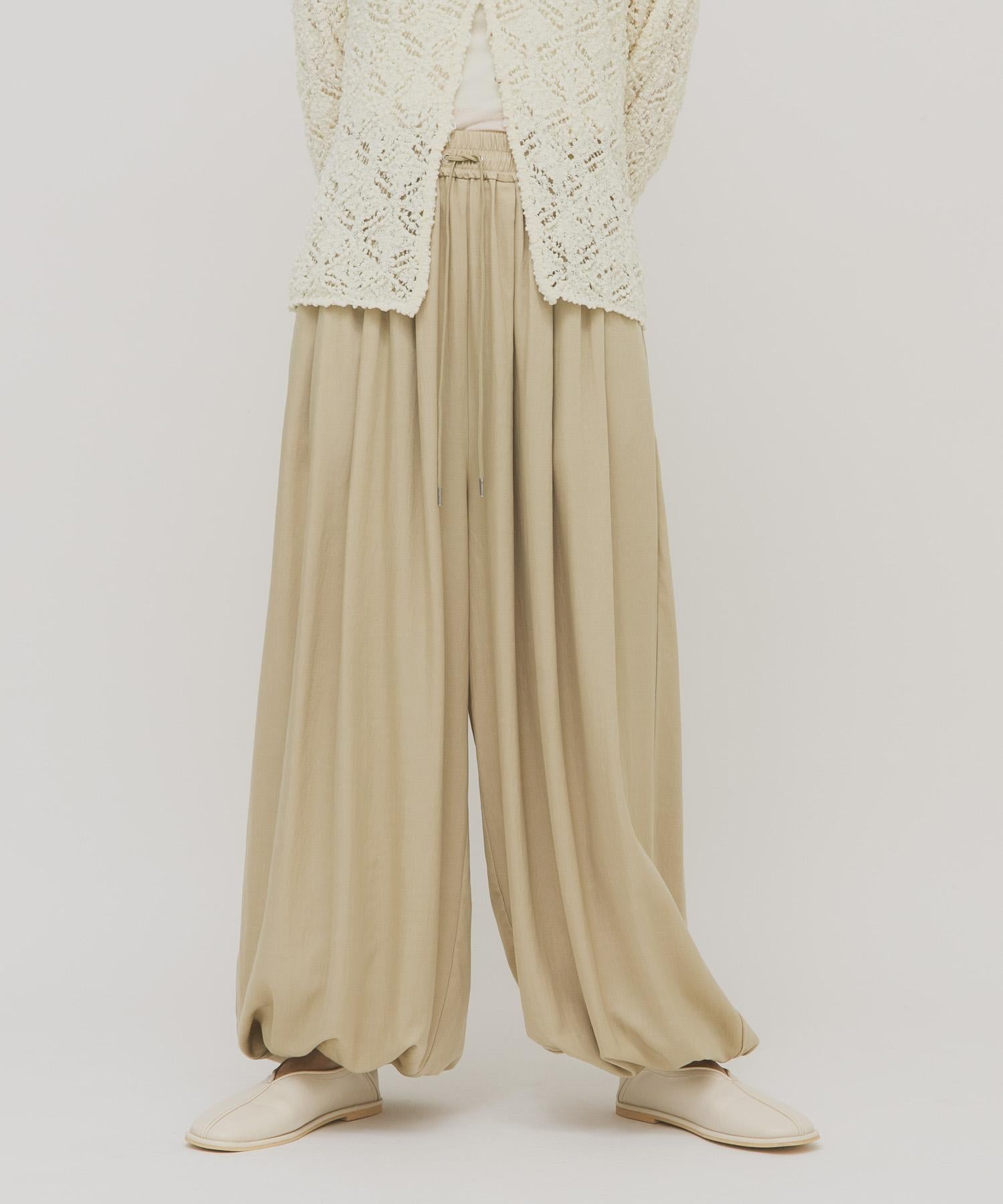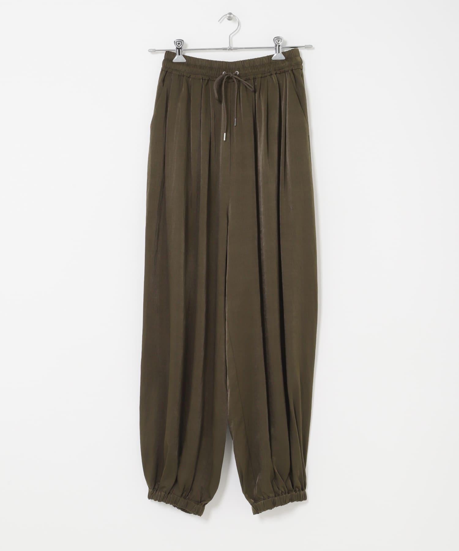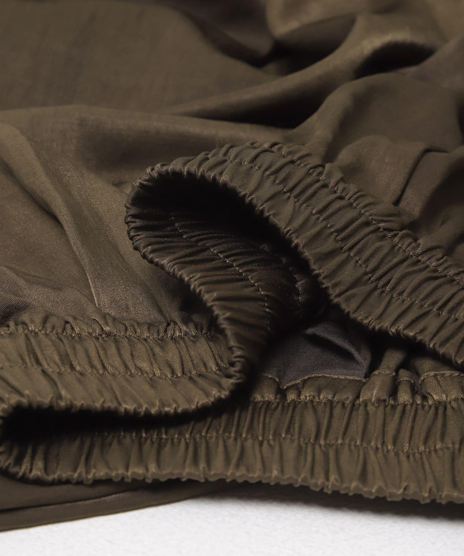 啞光緞面的復古長褲。長褲採用寬鬆的氣球廓形設計。下襬緊扣在腳踝處,適合不同身高的人穿著。全鬆緊腰身也是一大特色。同樣材質的寬鬆緞面襯衫(KB26130-2035050)也可供選擇。