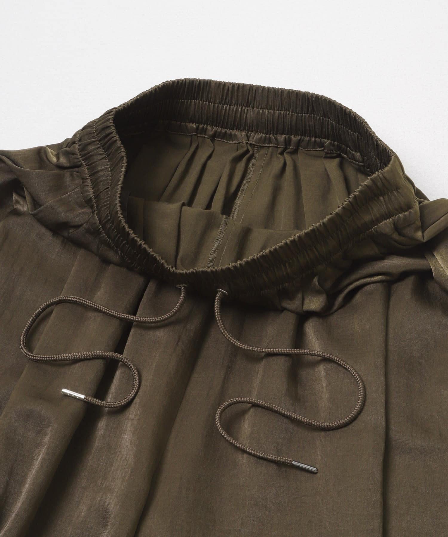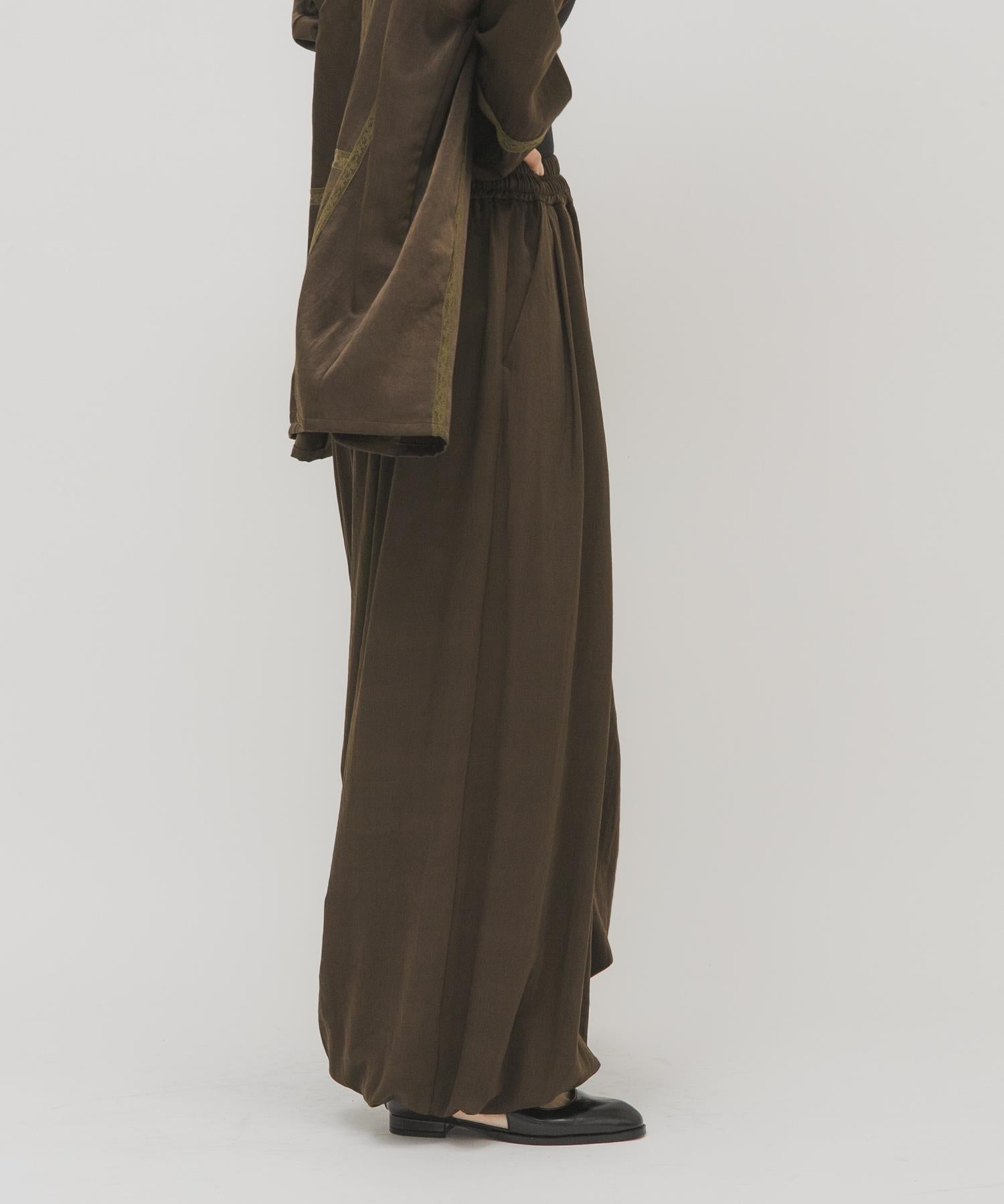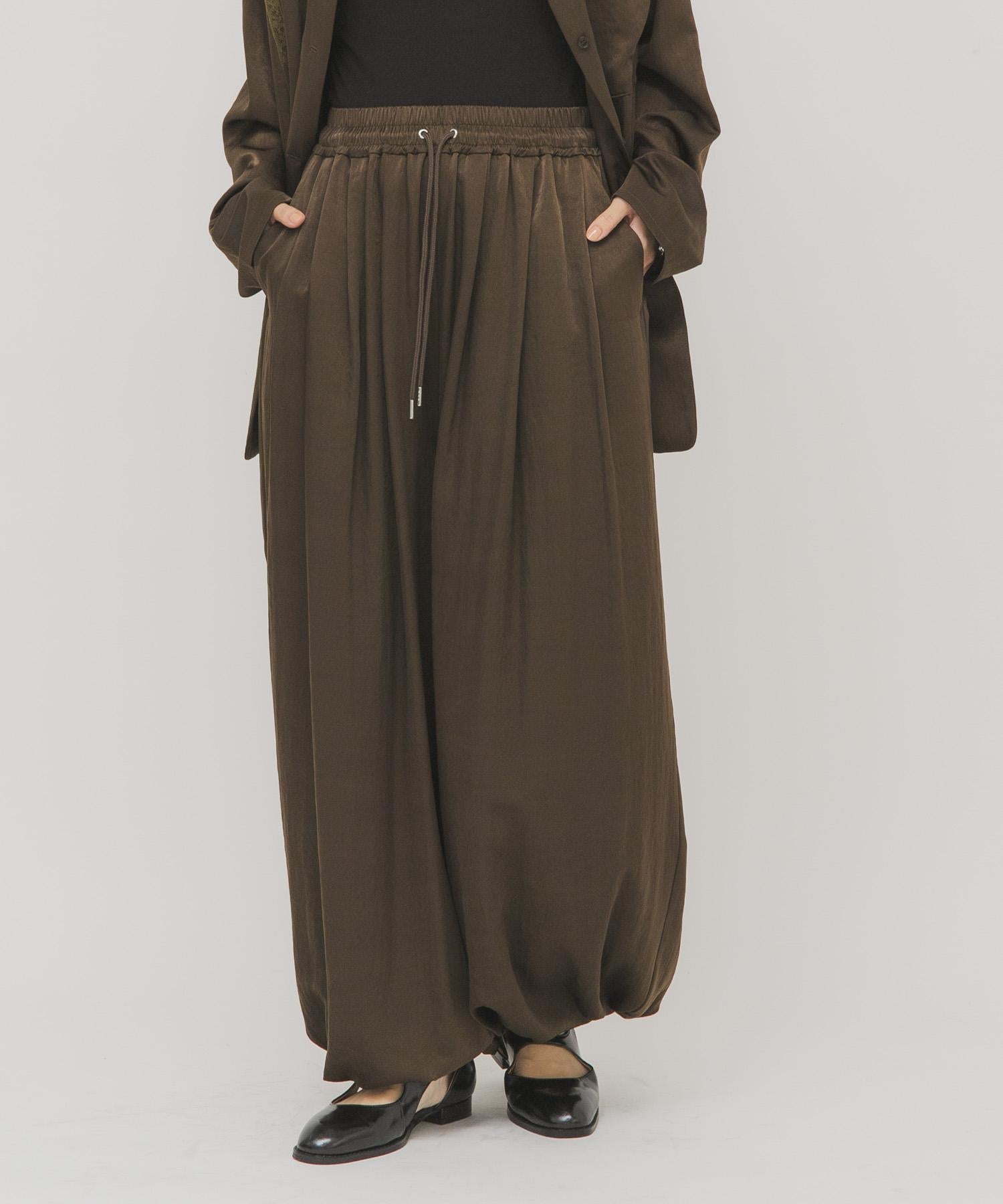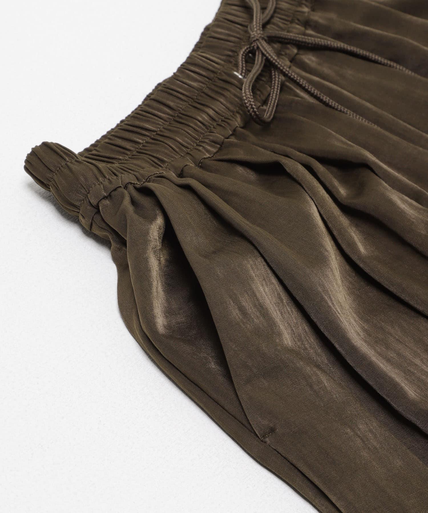 啞光緞面的復古長褲。長褲採用寬鬆的氣球廓形設計。下襬緊扣在腳踝處,適合不同身高的人穿著。全鬆緊腰身也是一大特色。同樣材質的寬鬆緞面襯衫(KB26130-2035050)也可供選擇。