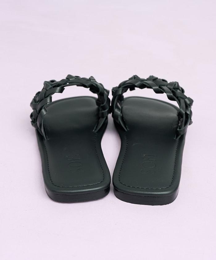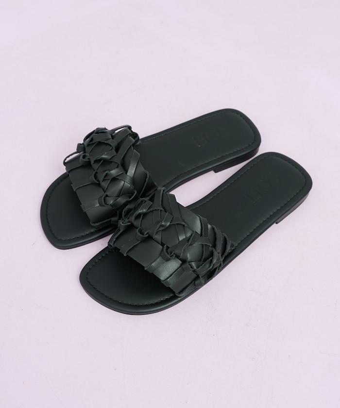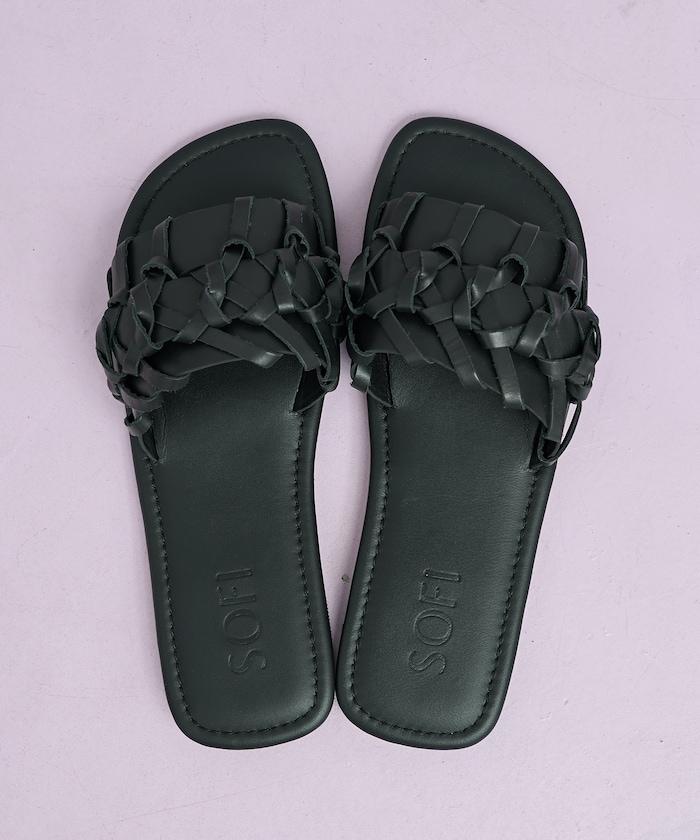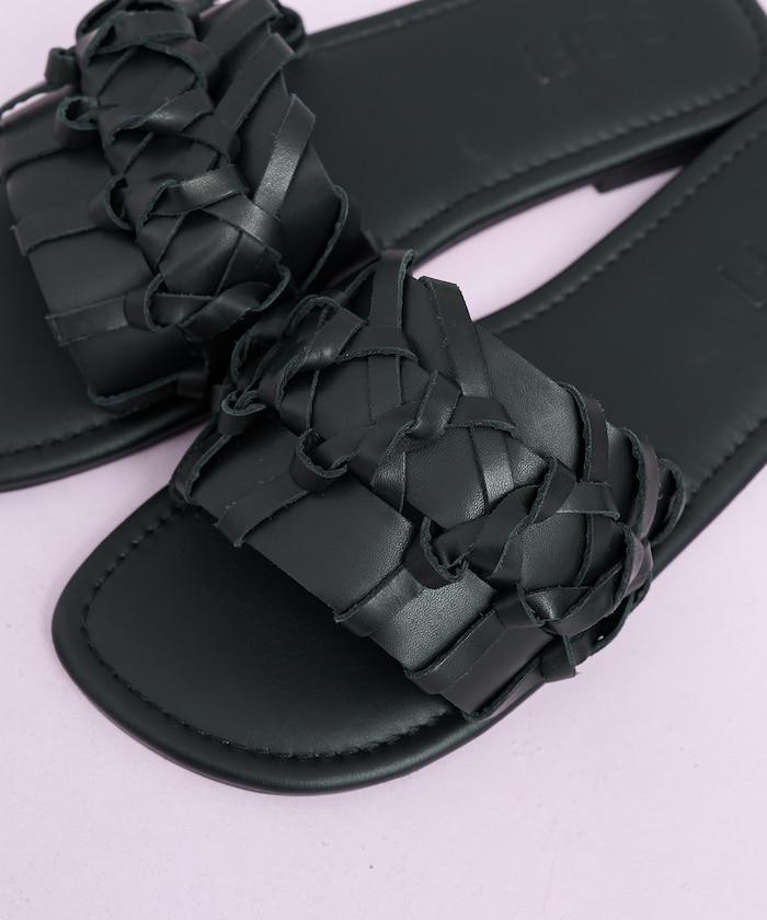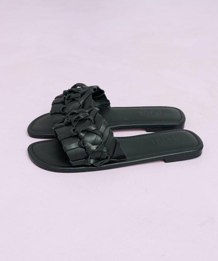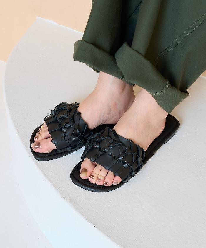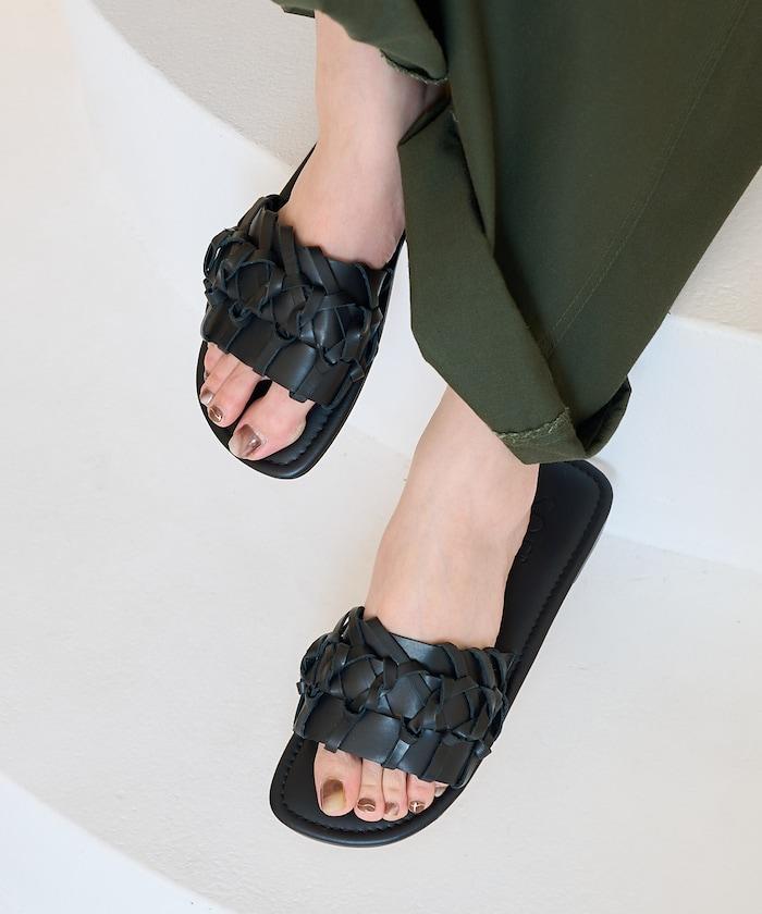這款平底涼鞋採用編織皮革鞋面,十分搶眼。