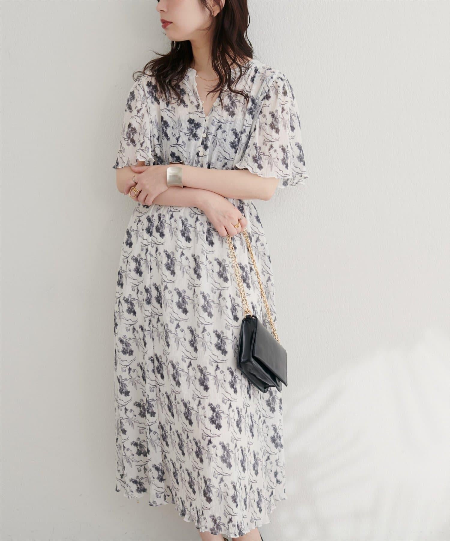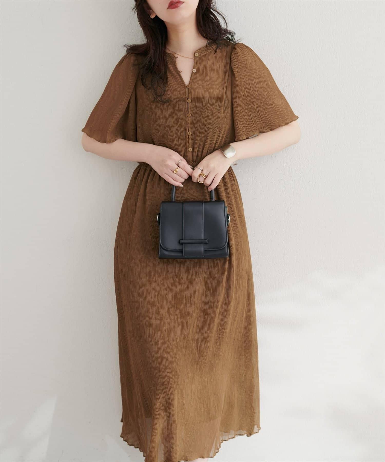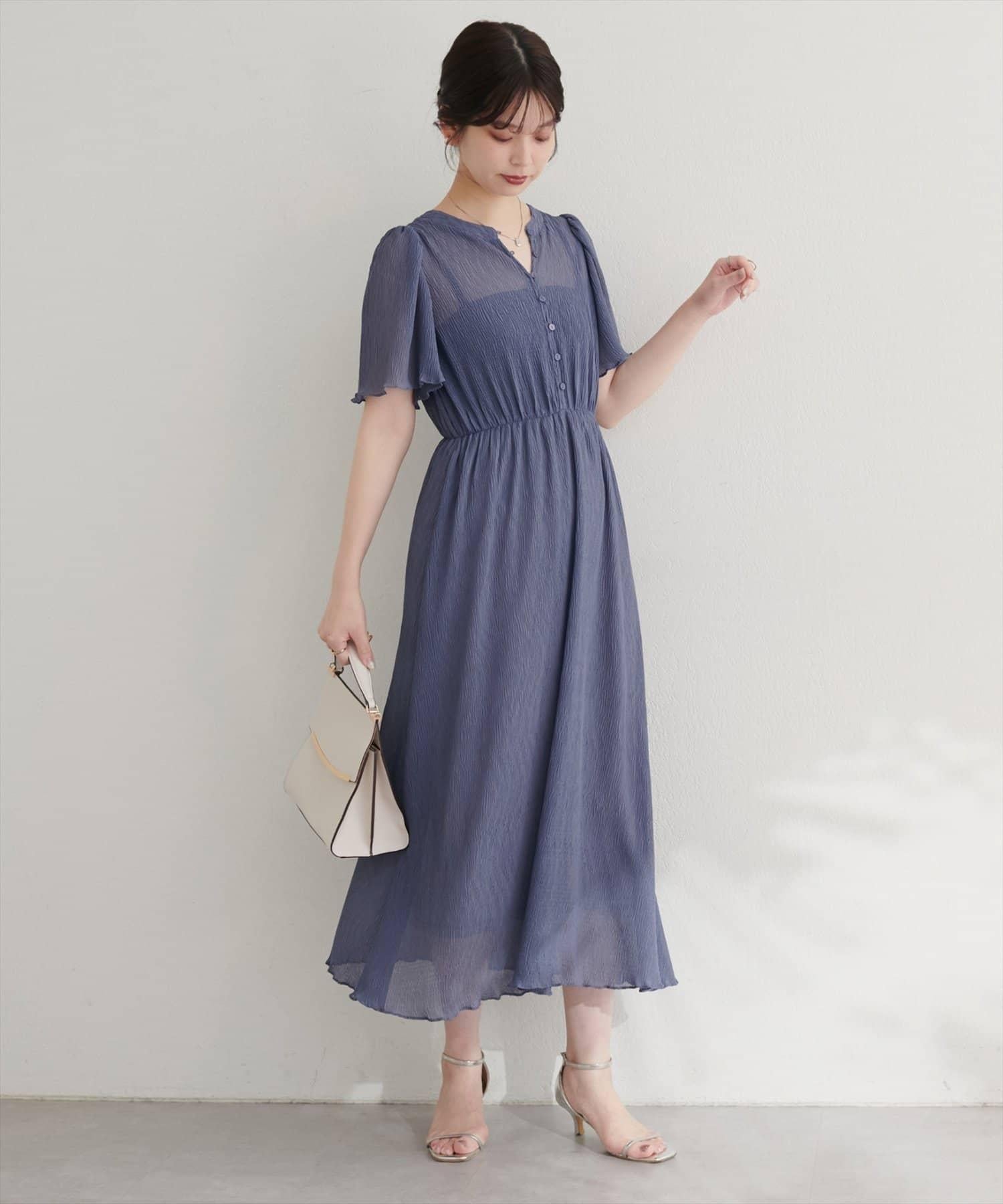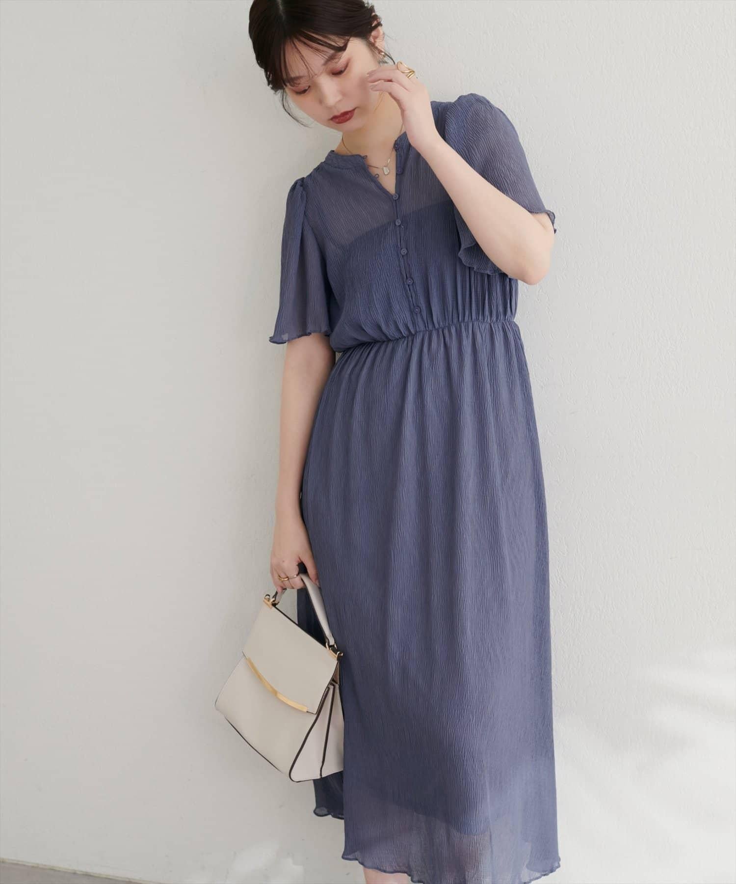 總褶皺波浪袖連衣裙