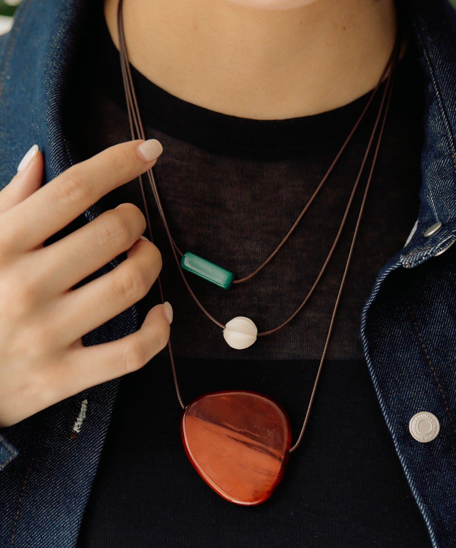 項鍊由三個不同顏色、大小和質地的部分組成,當它們排列在胸前時,顯得奇特而有趣。