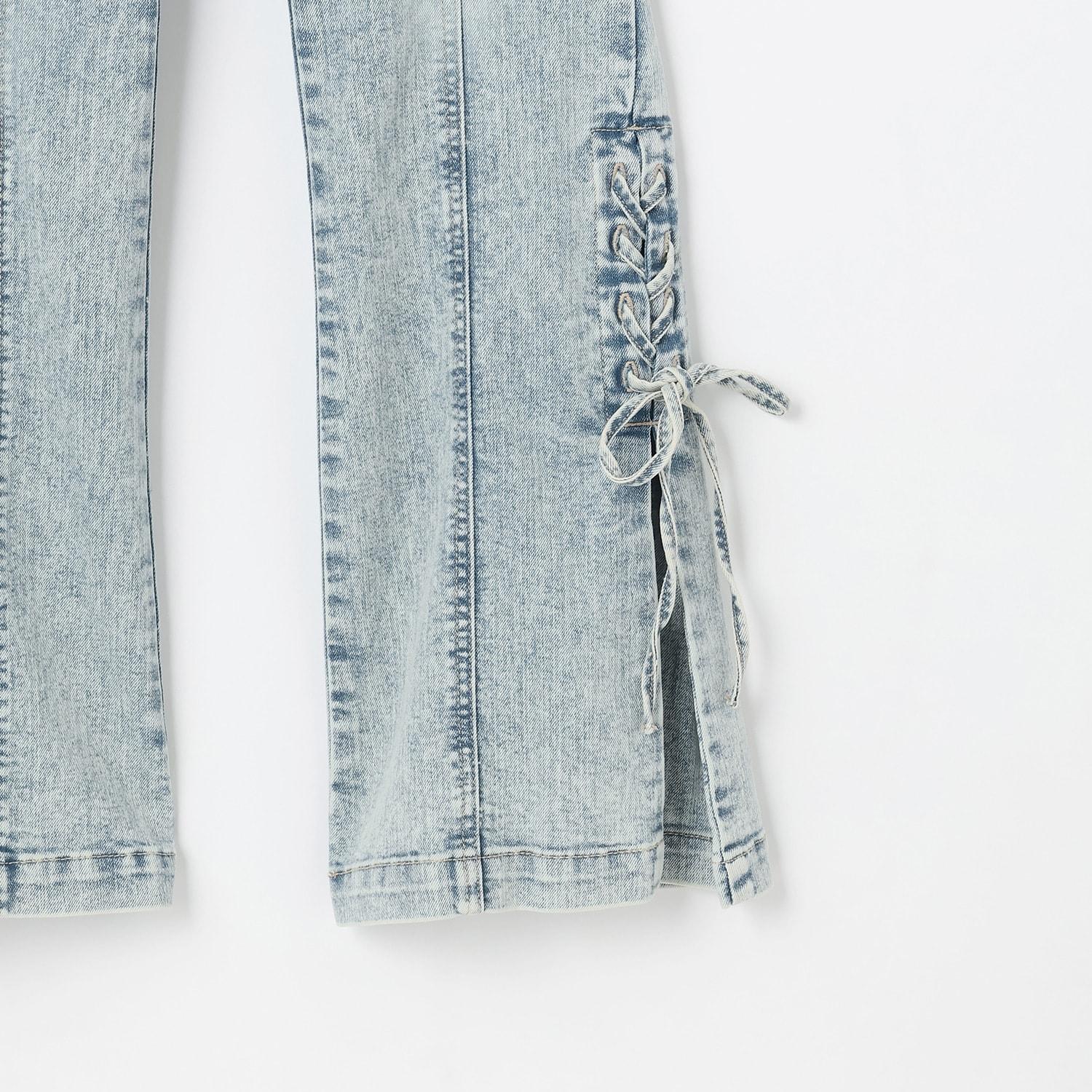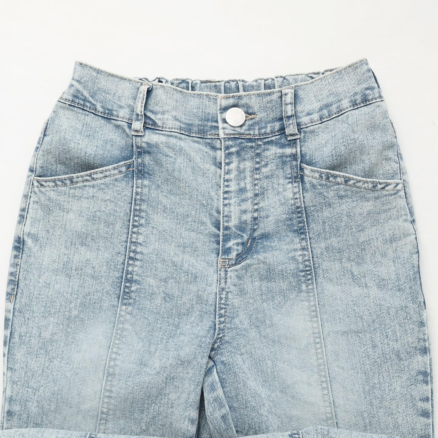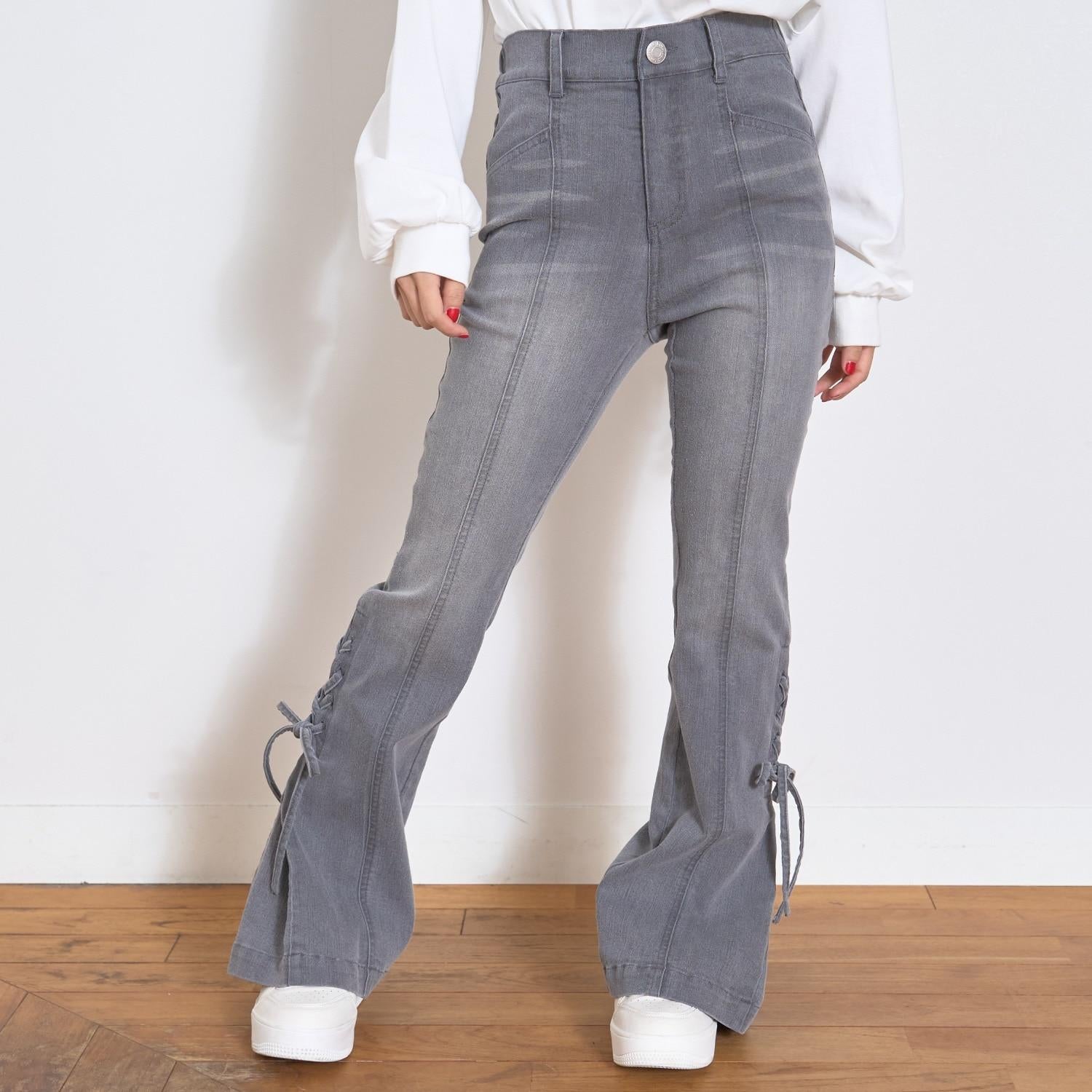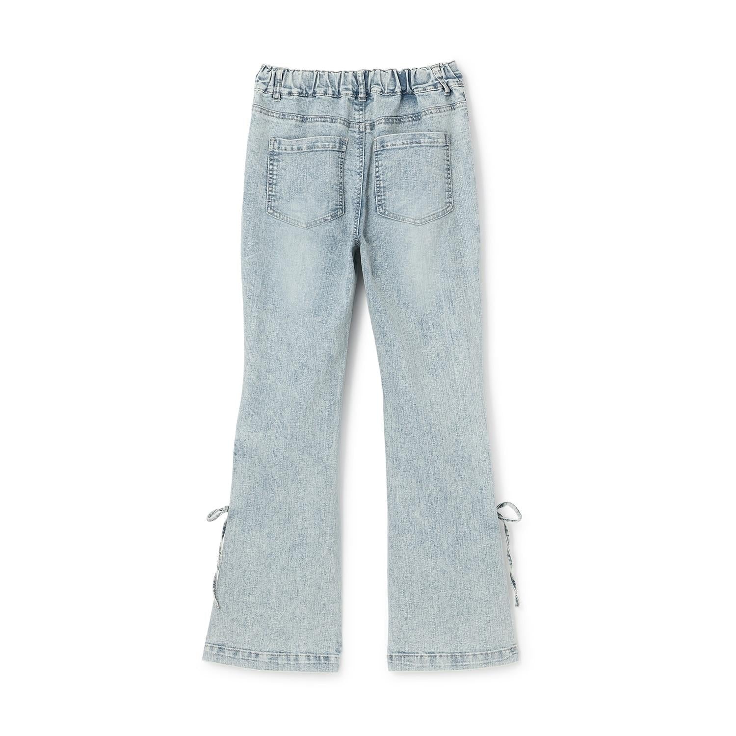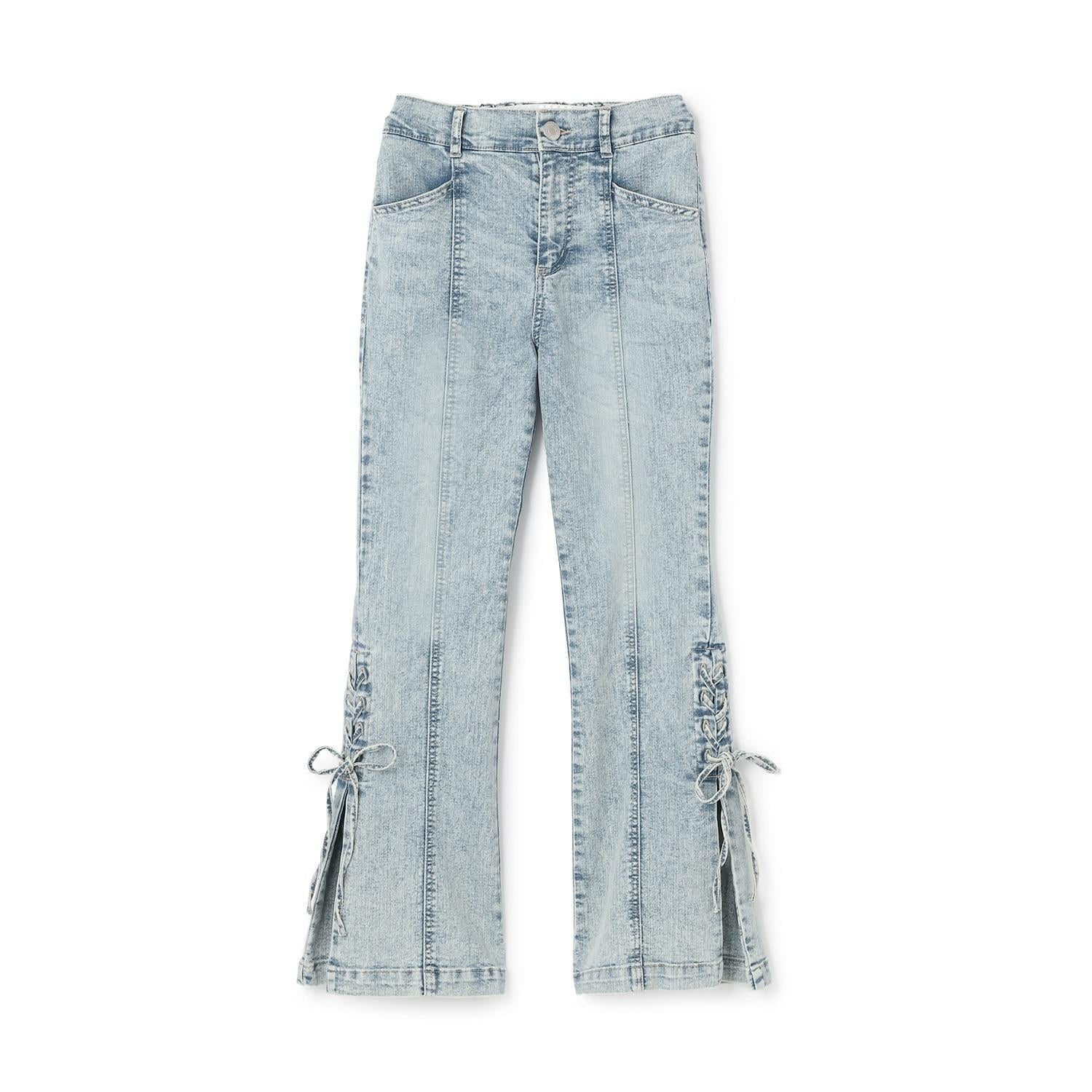 牛仔長褲採用流行、簡潔的喇叭形剪裁。