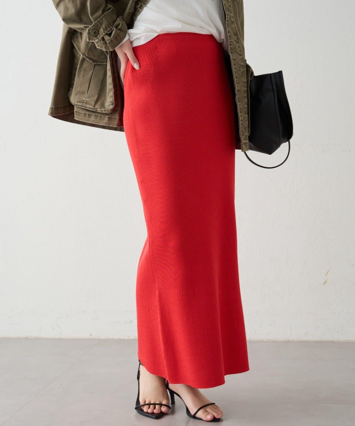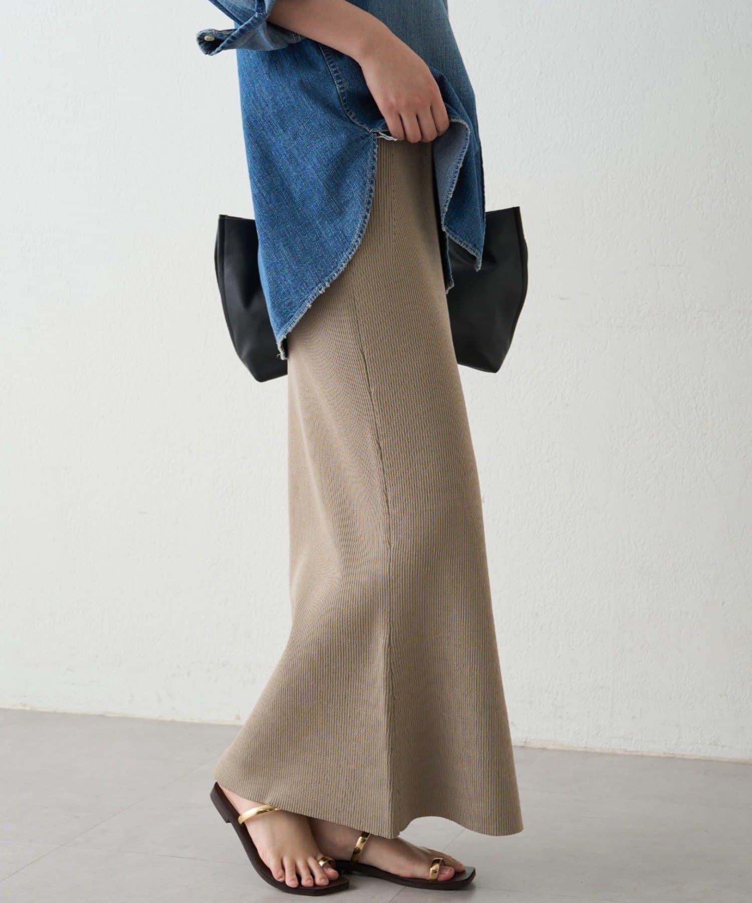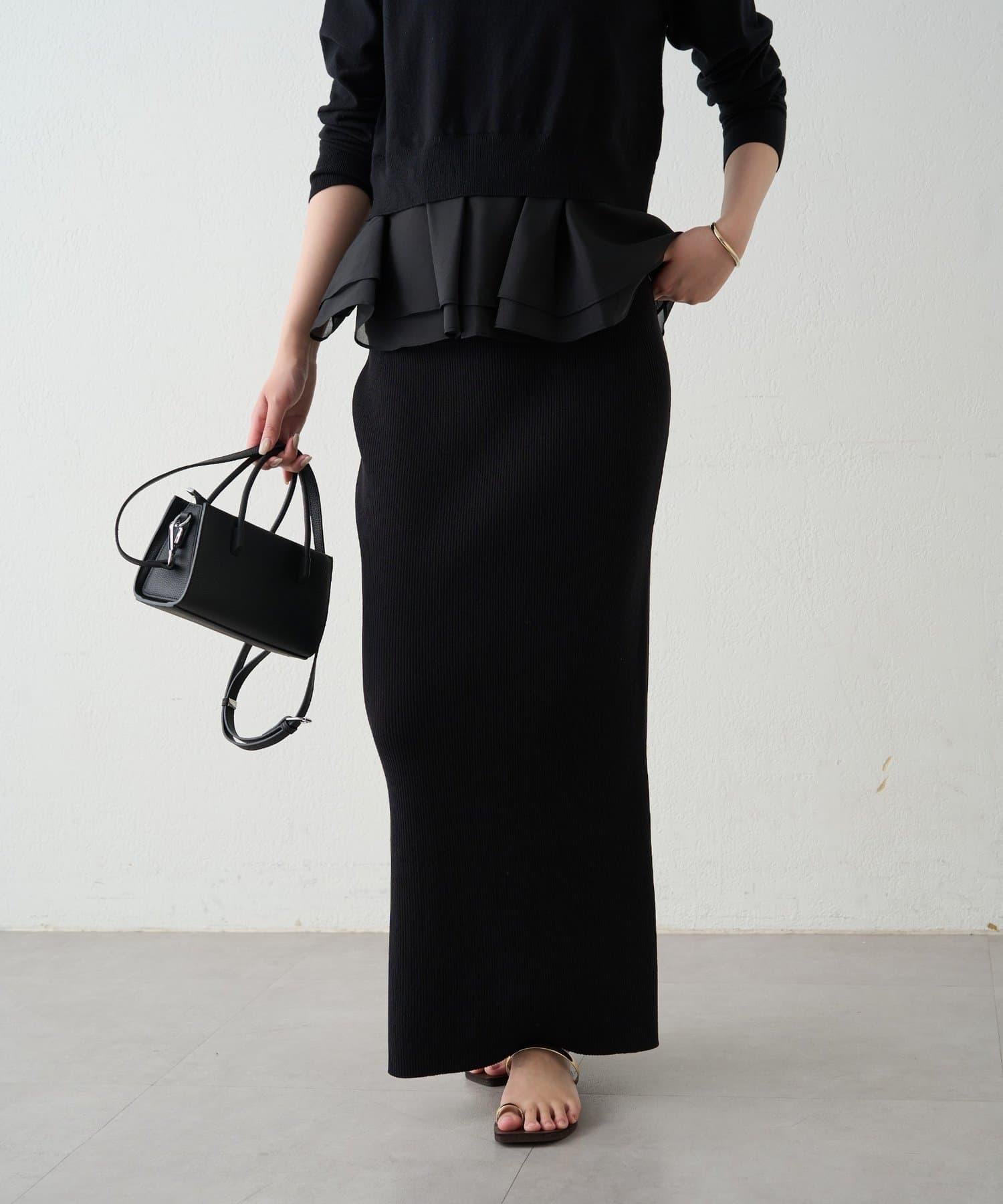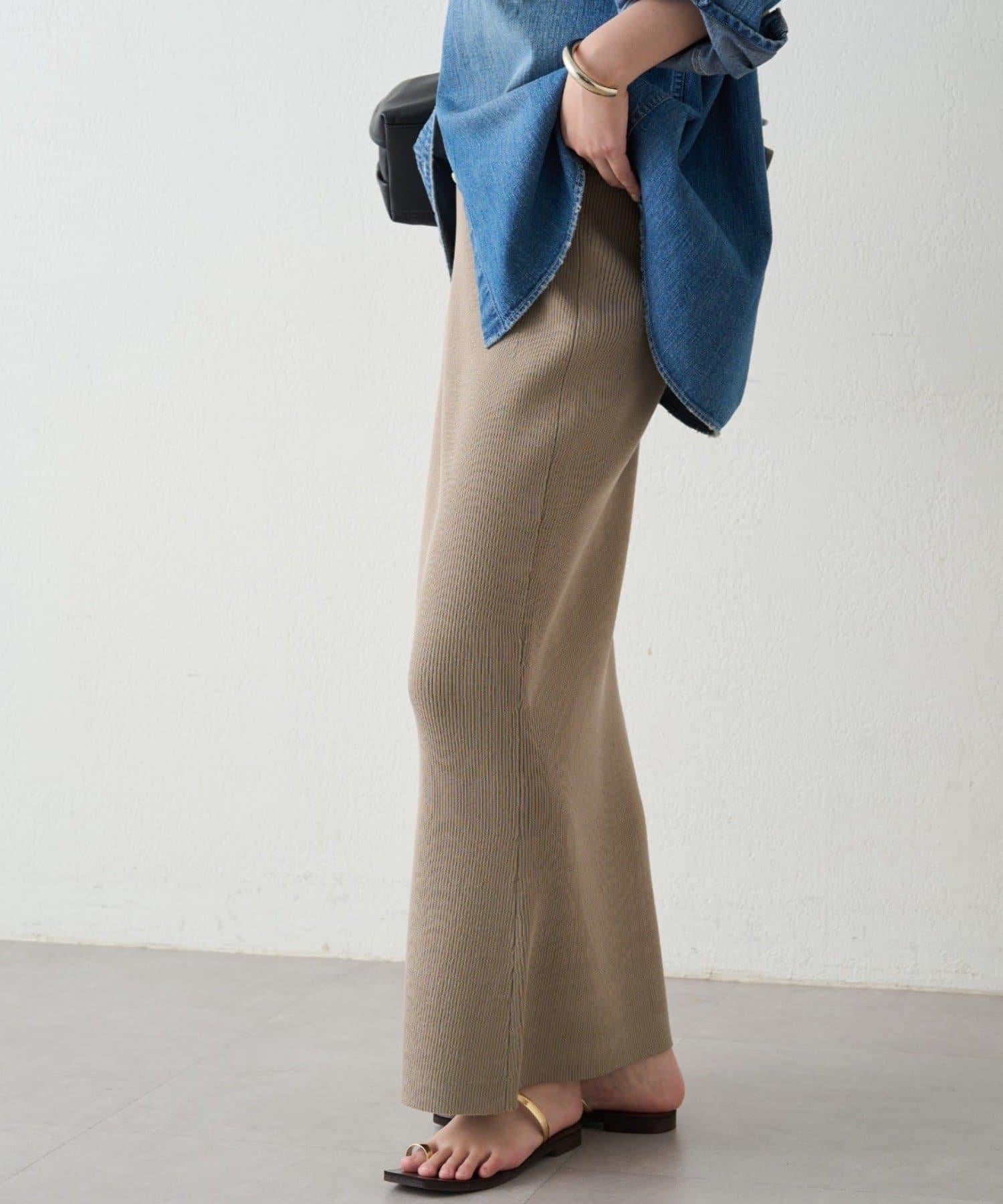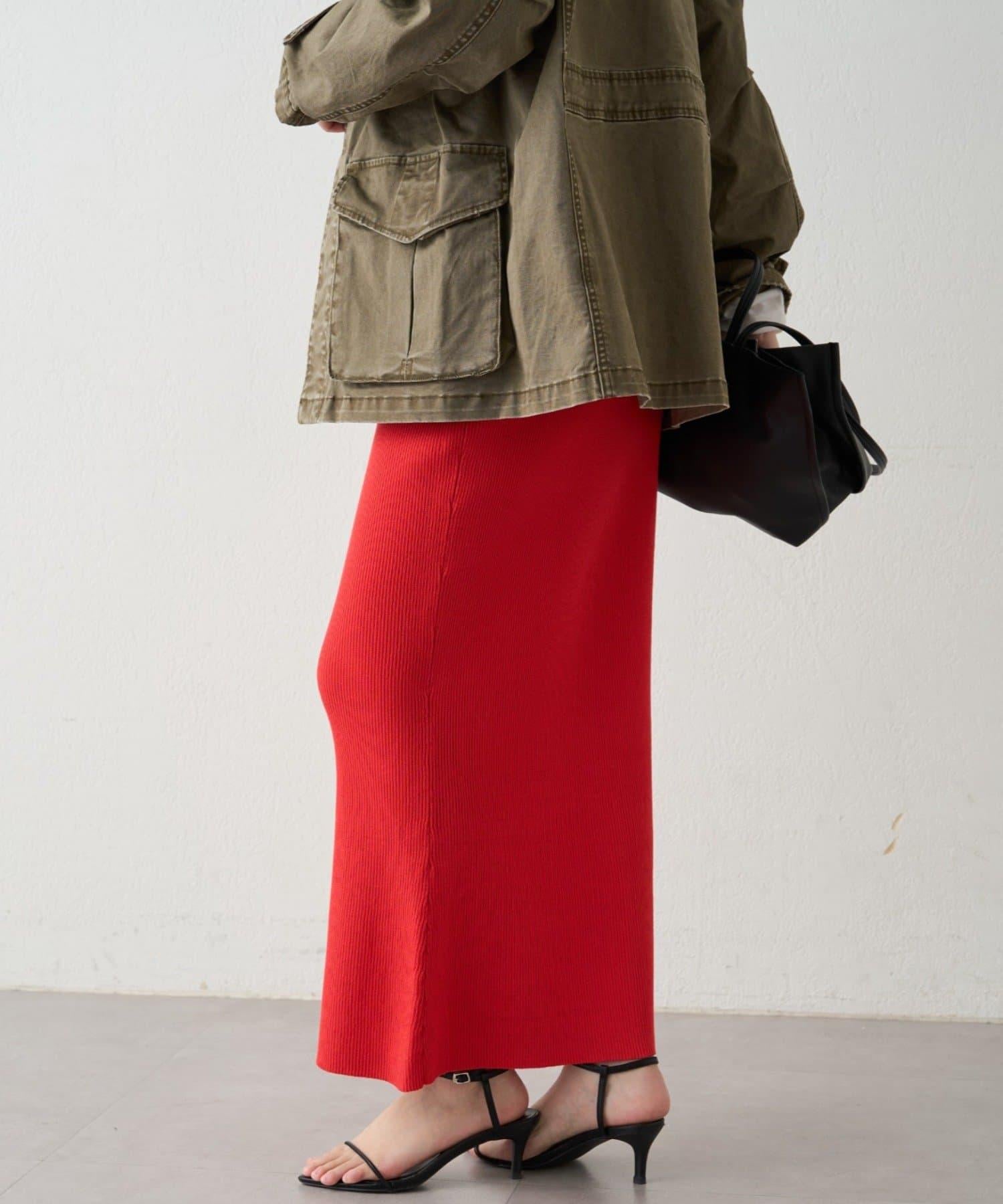 這款羅紋針織裙採用半喇叭廓形,從簡潔的 I 字形線條向下擺緩緩延伸,增強了女性魅力。