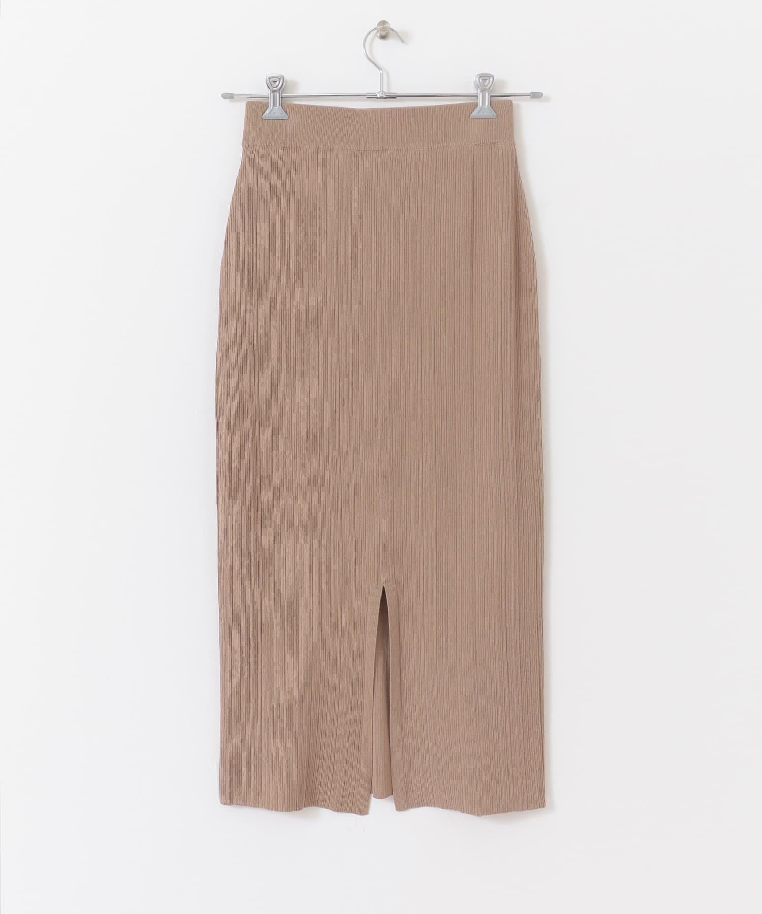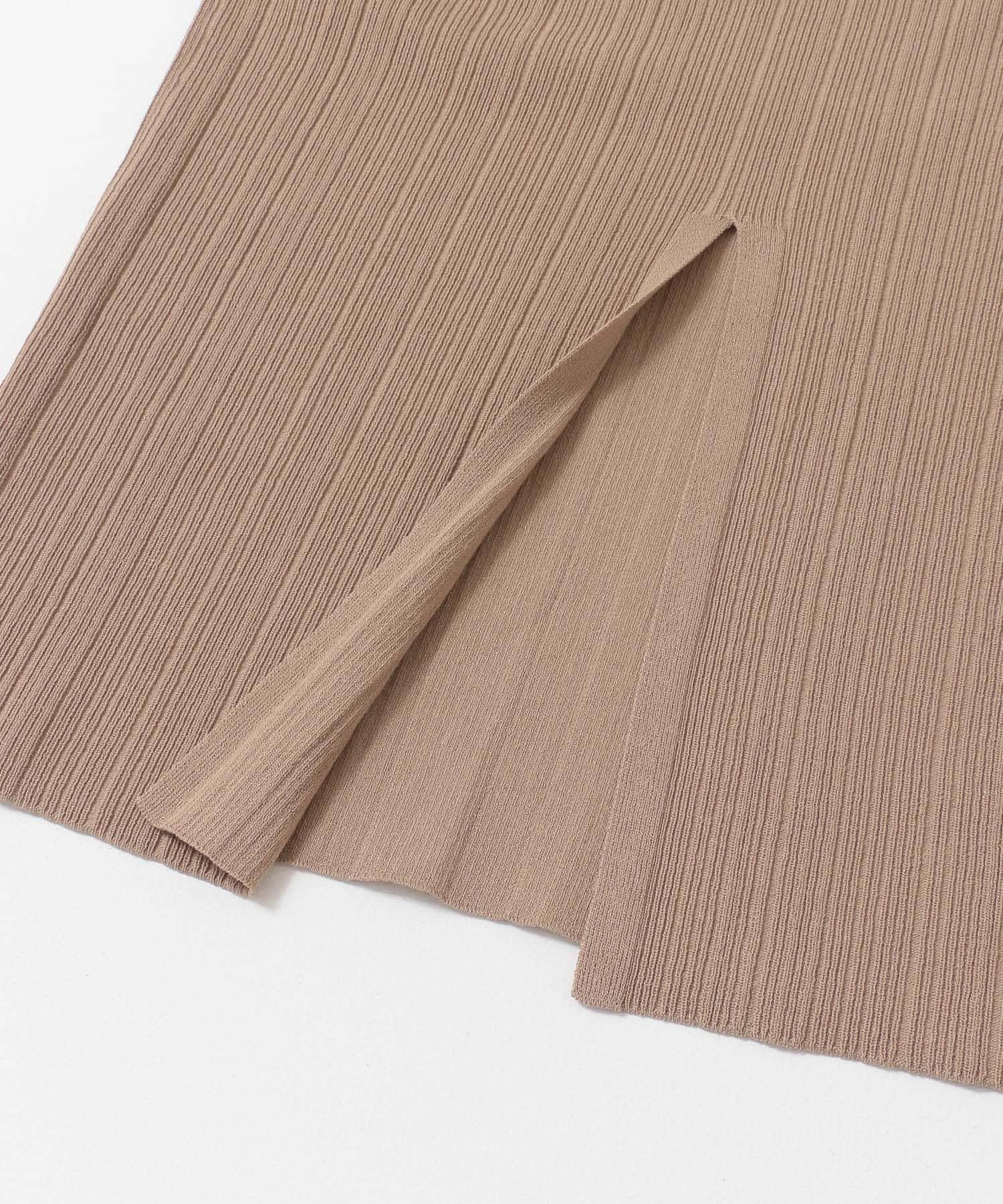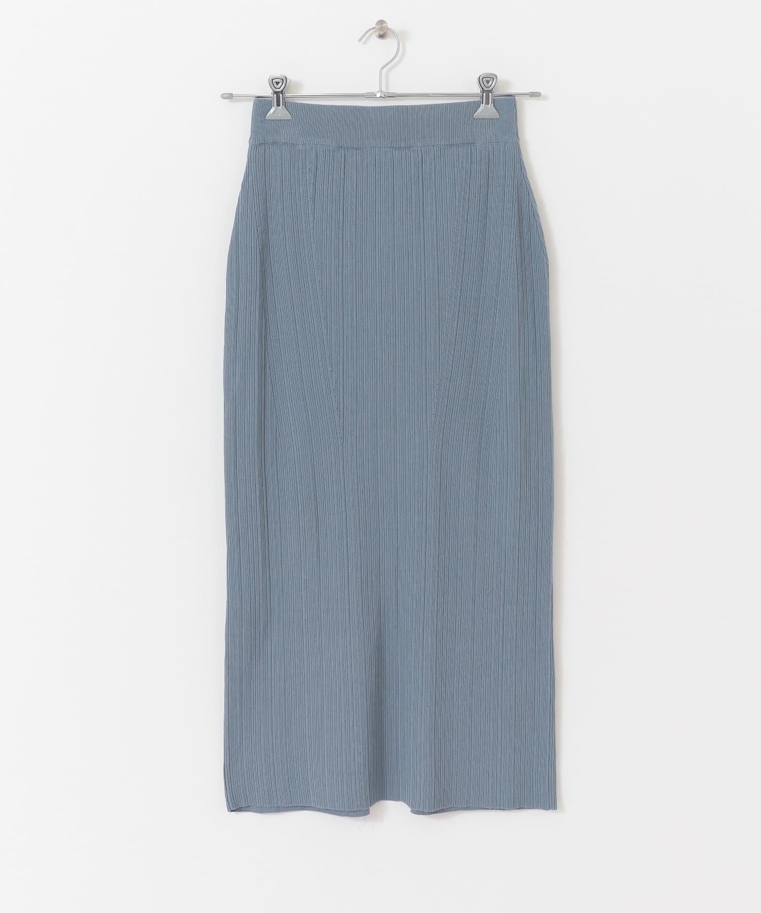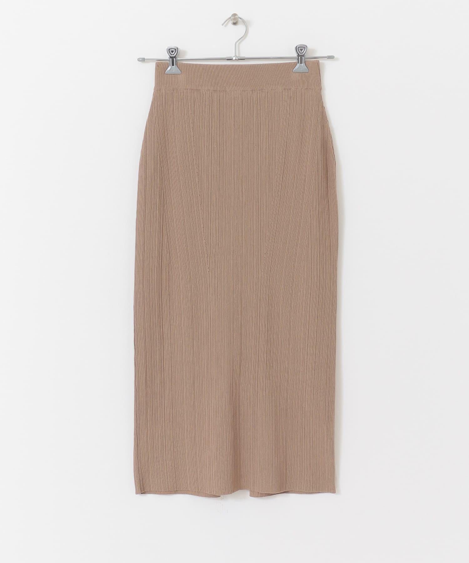 這款針織緊身裙採用隨機羅紋針織。簡潔的 I 字形輪廓適度貼合身體線條,凸顯女性魅力。背部開衩和腰部鬆緊設計使穿著更加方便。同材質的針織套頭衫也可作為套裝穿著。