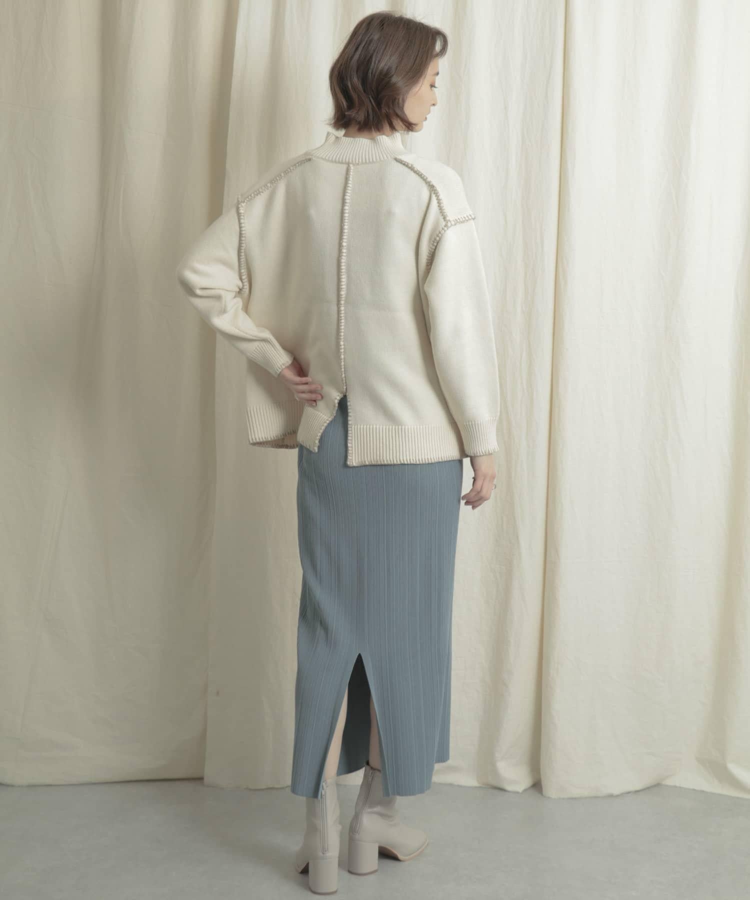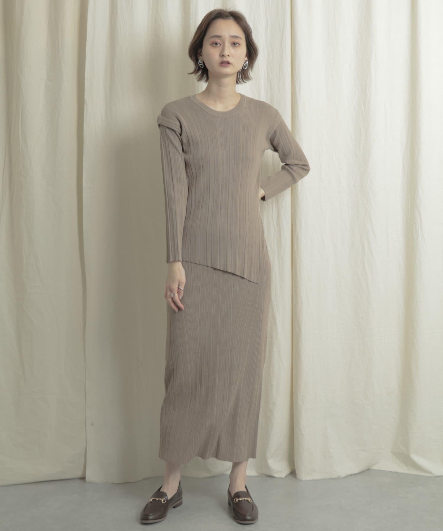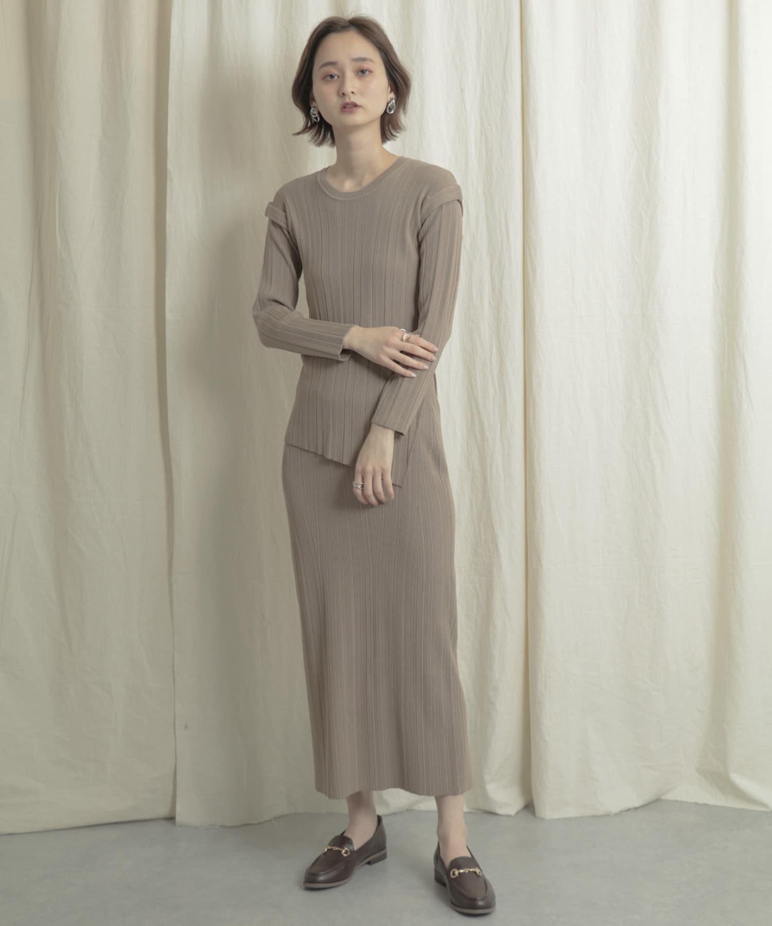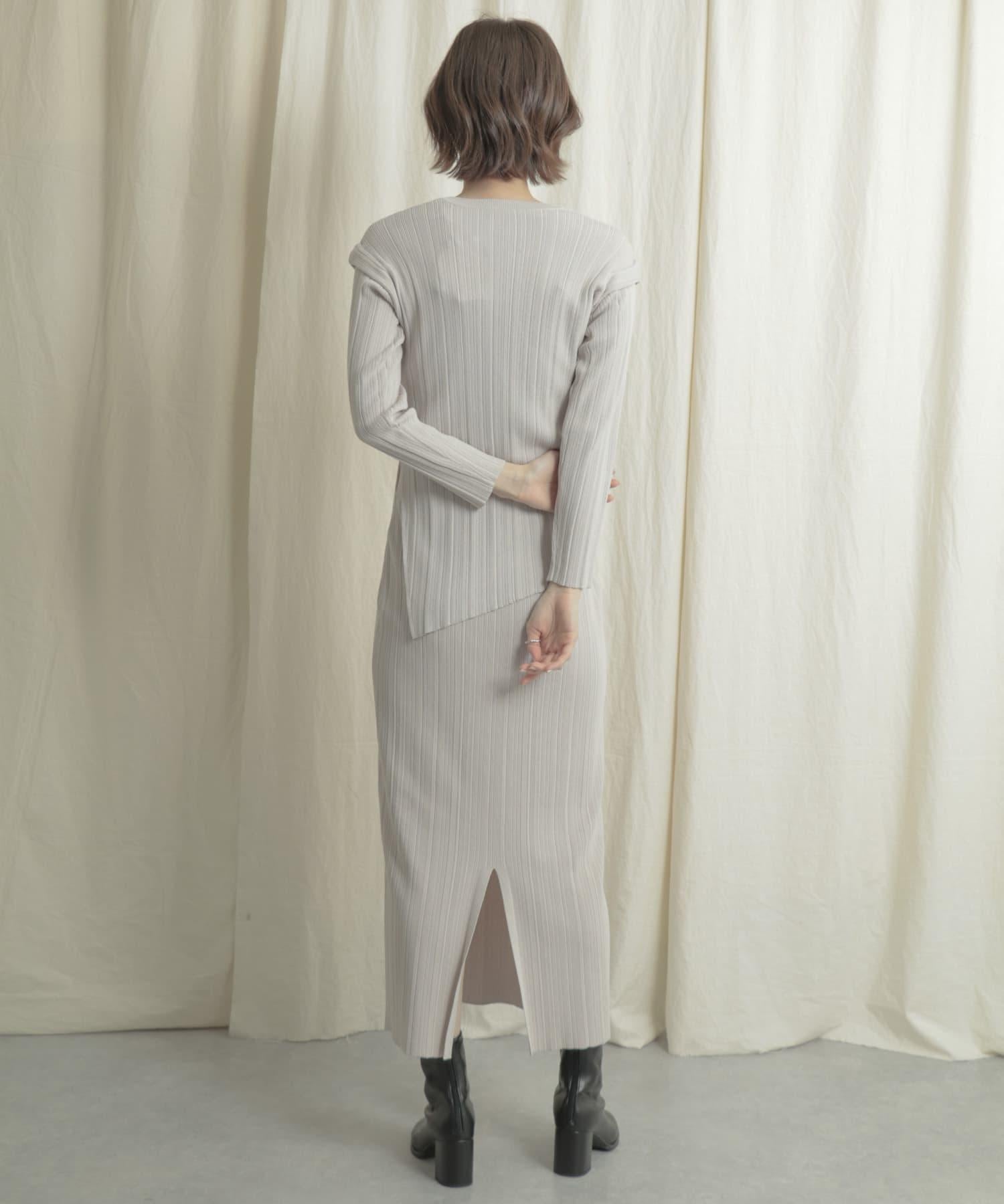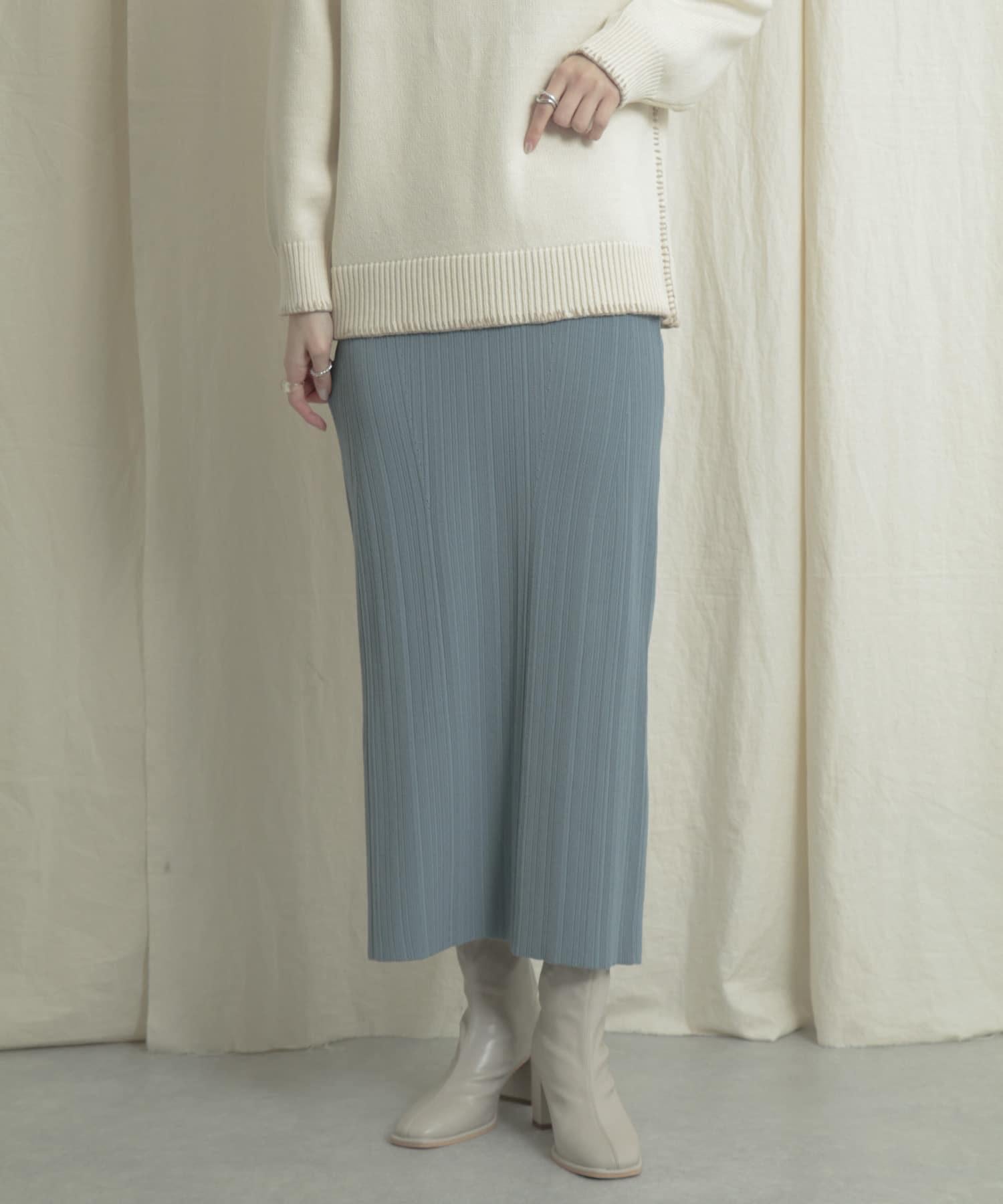 這款針織緊身裙採用隨機羅紋針織。簡潔的 I 字形輪廓適度貼合身體線條,凸顯女性魅力。背部開衩和腰部鬆緊設計使穿著更加方便。同材質的針織套頭衫也可作為套裝穿著。