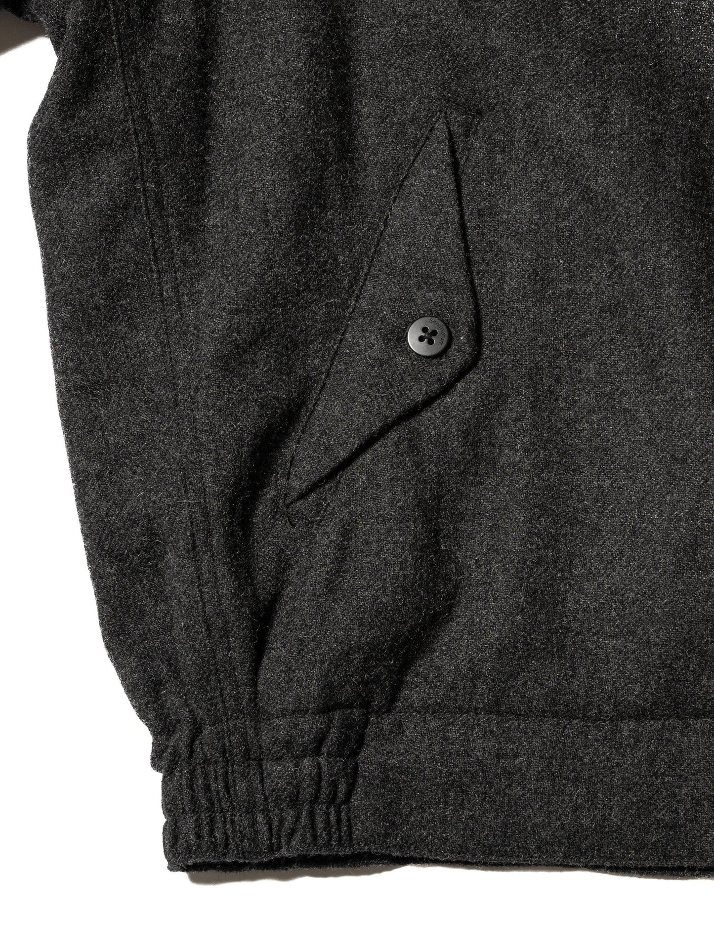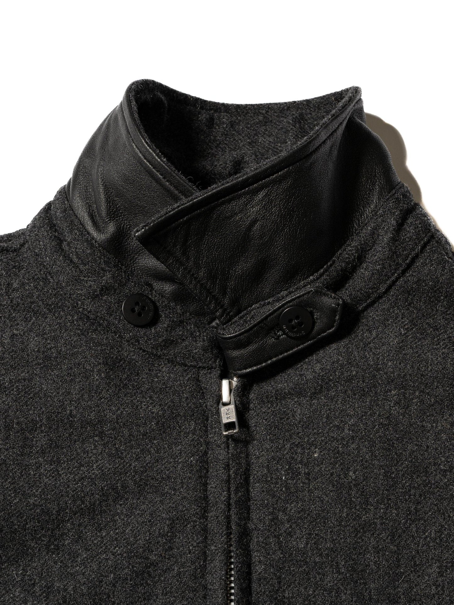 採用羊毛和合成纖維混紡的凸起斜紋織物。織物略帶毛刺,手感柔軟,厚度適中,耐用性極佳。產品經過水洗處理,褶皺恰到好處。衣領背面採用羊皮製成,提高了奢華感。羅紋下襬可用紐扣調節。