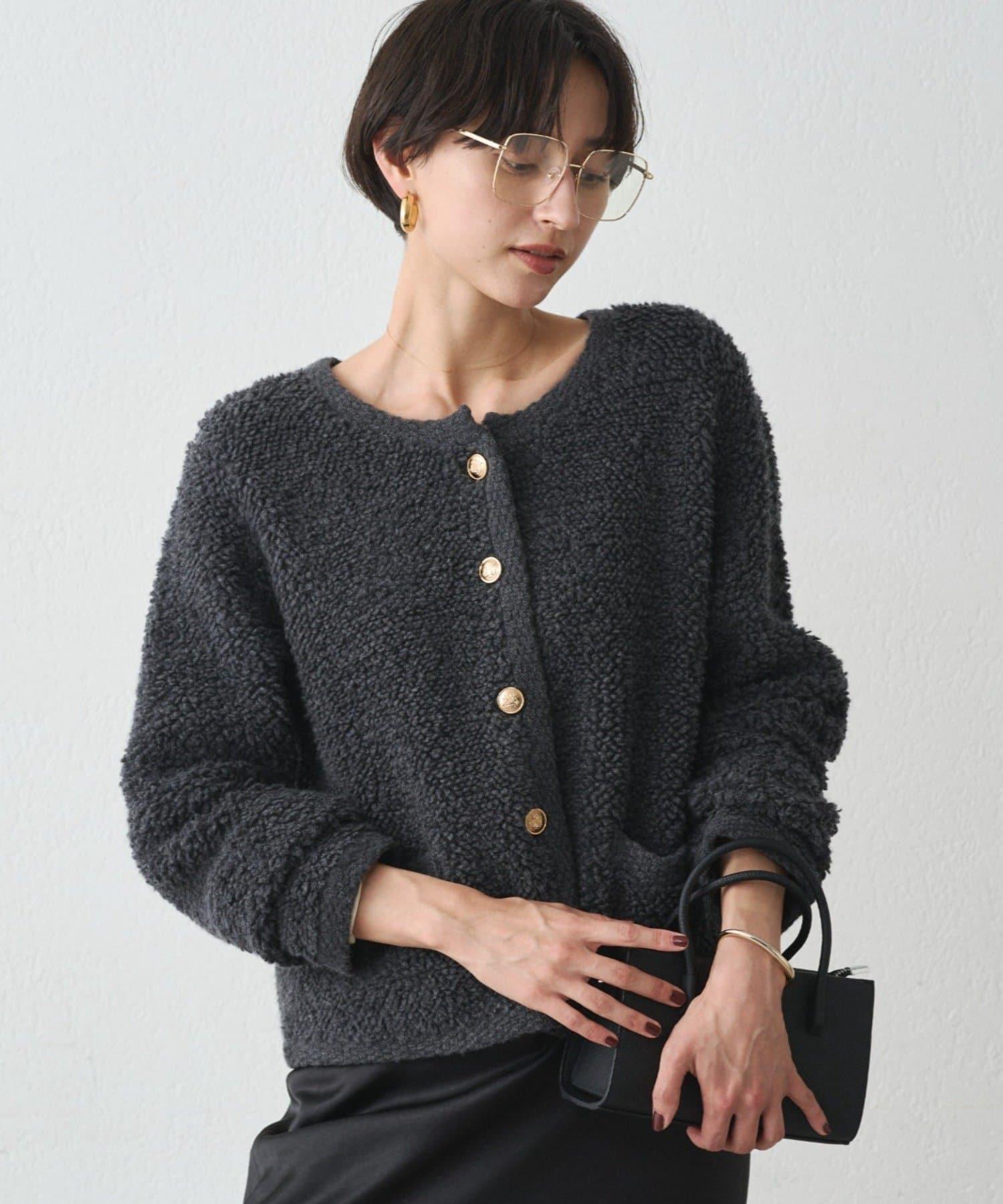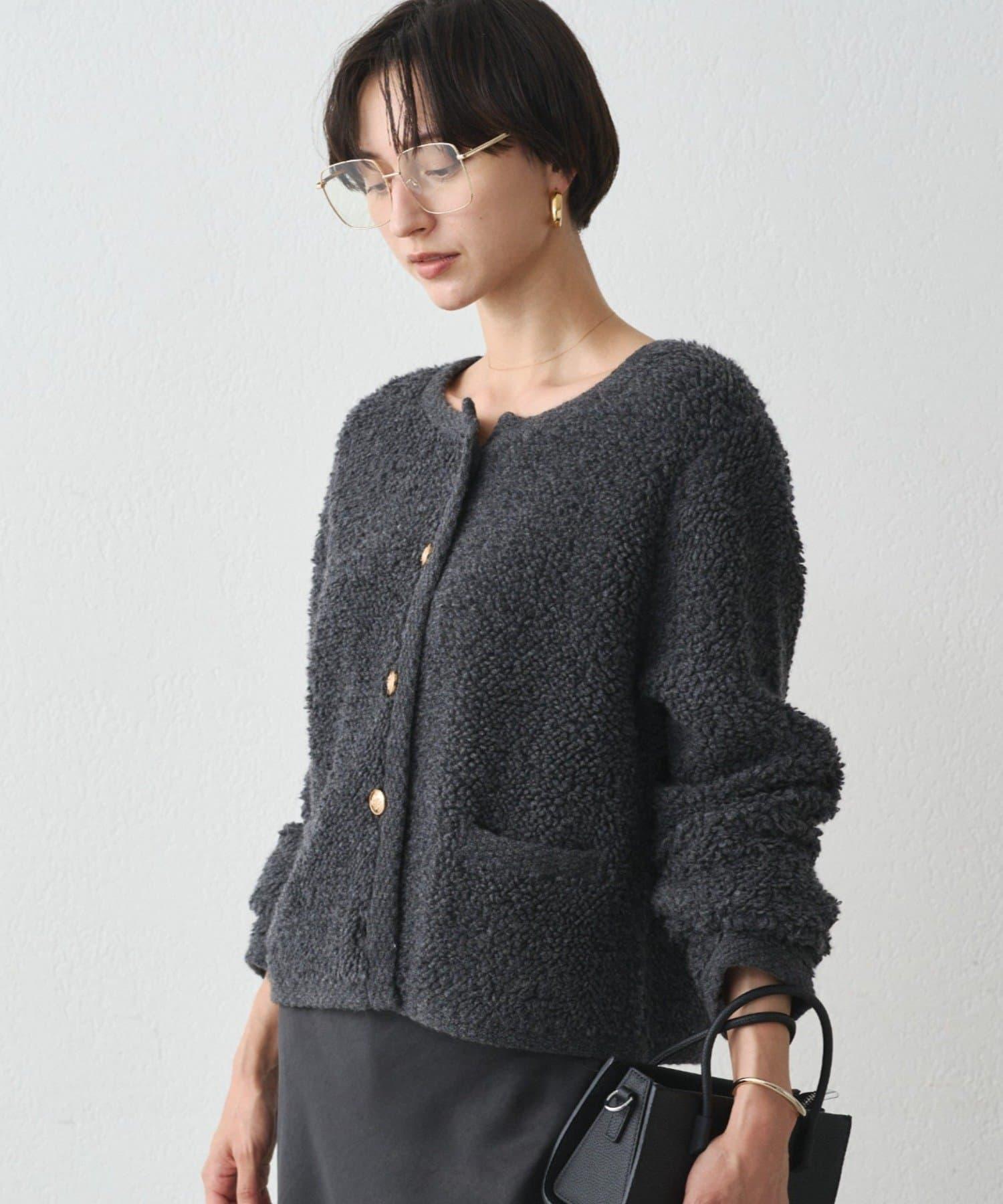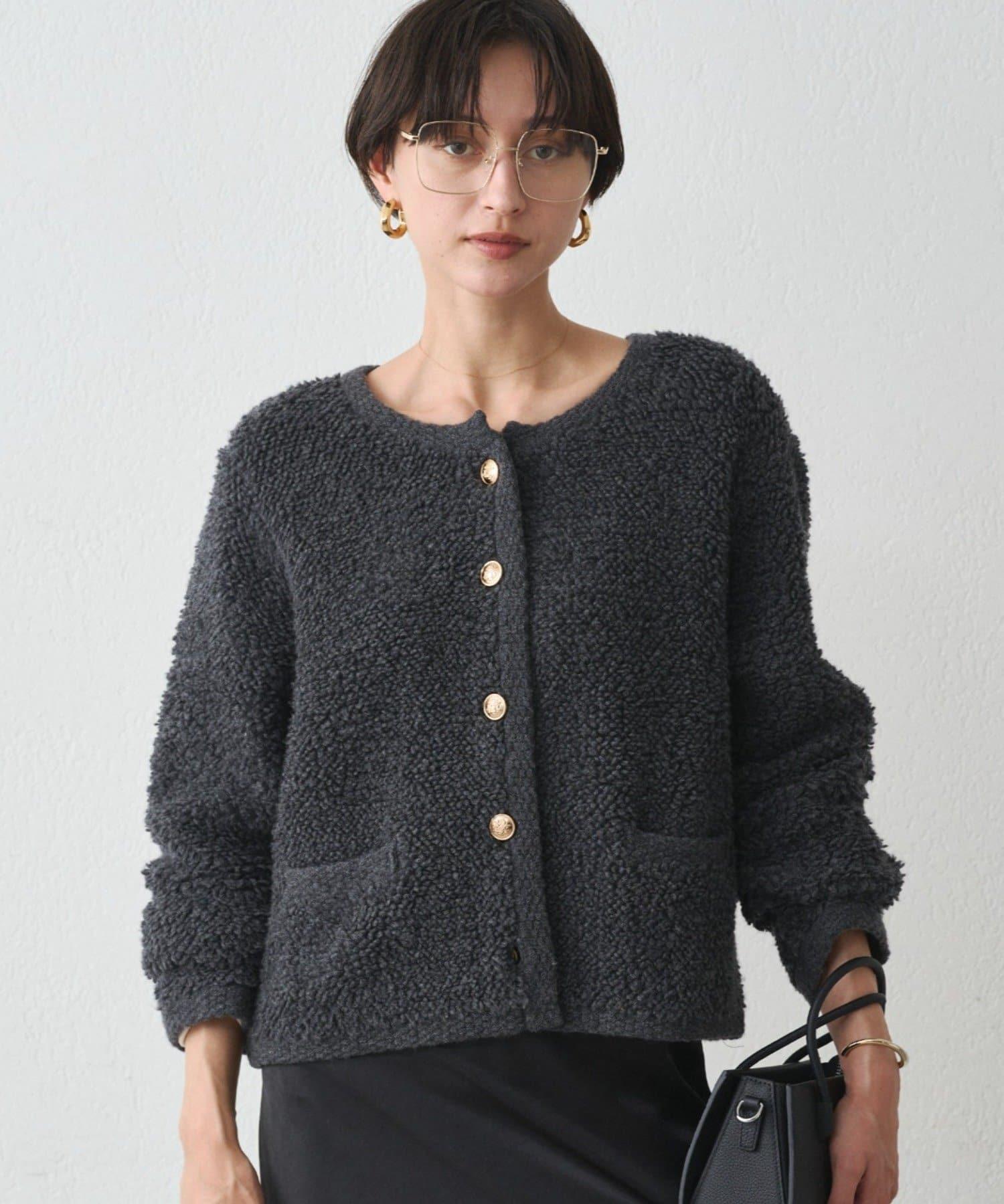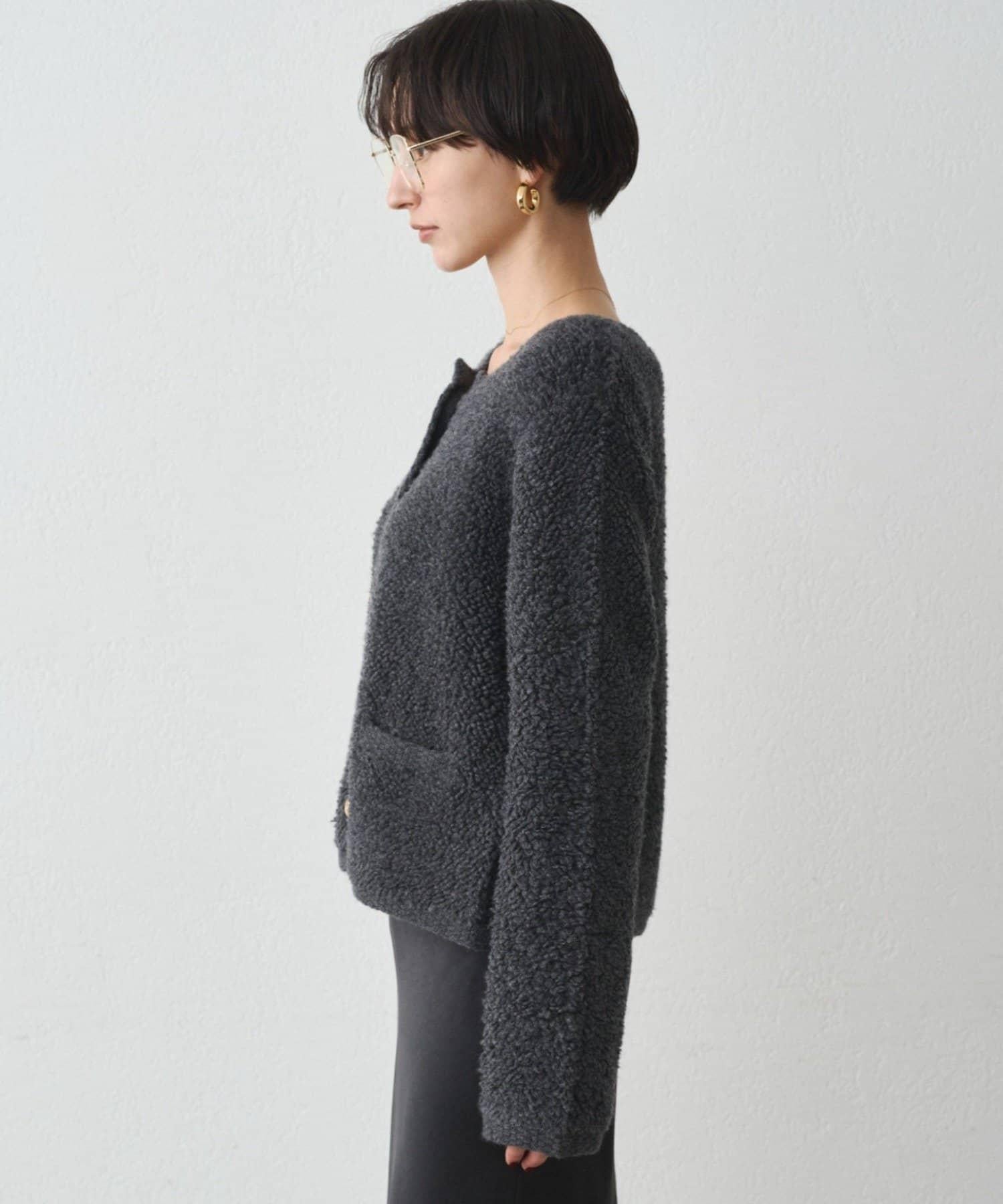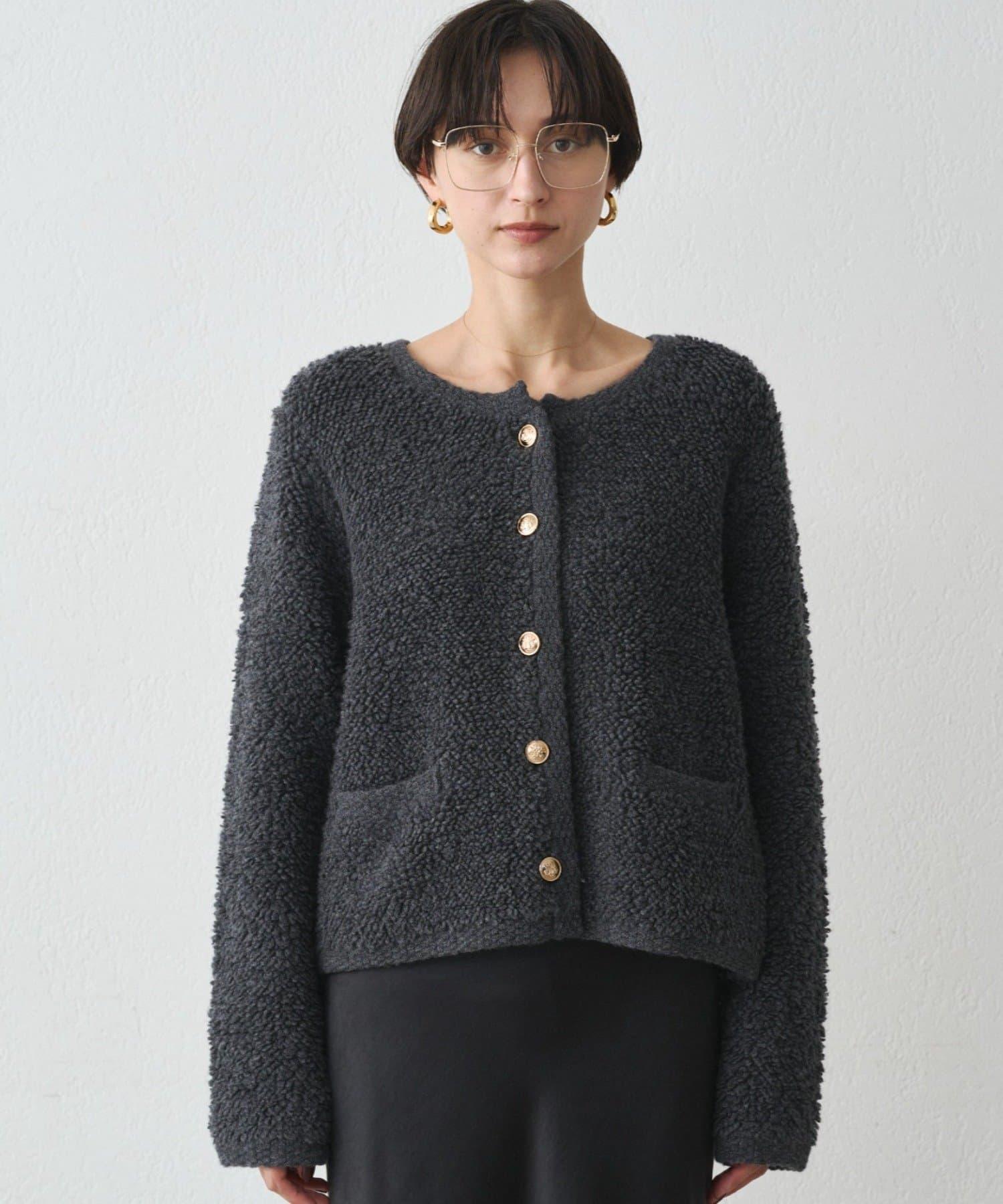 這款開襟羊毛衫的特點在於其蓬鬆的線圈針織。