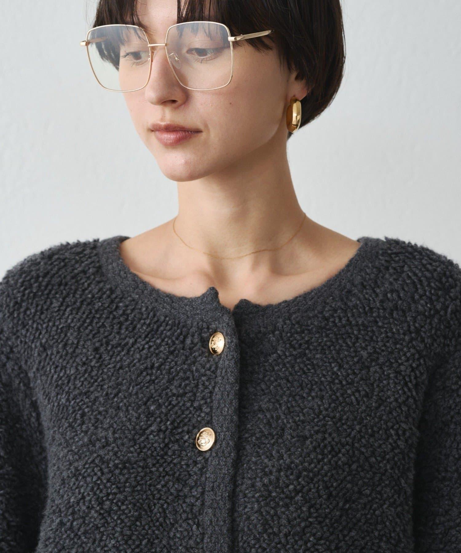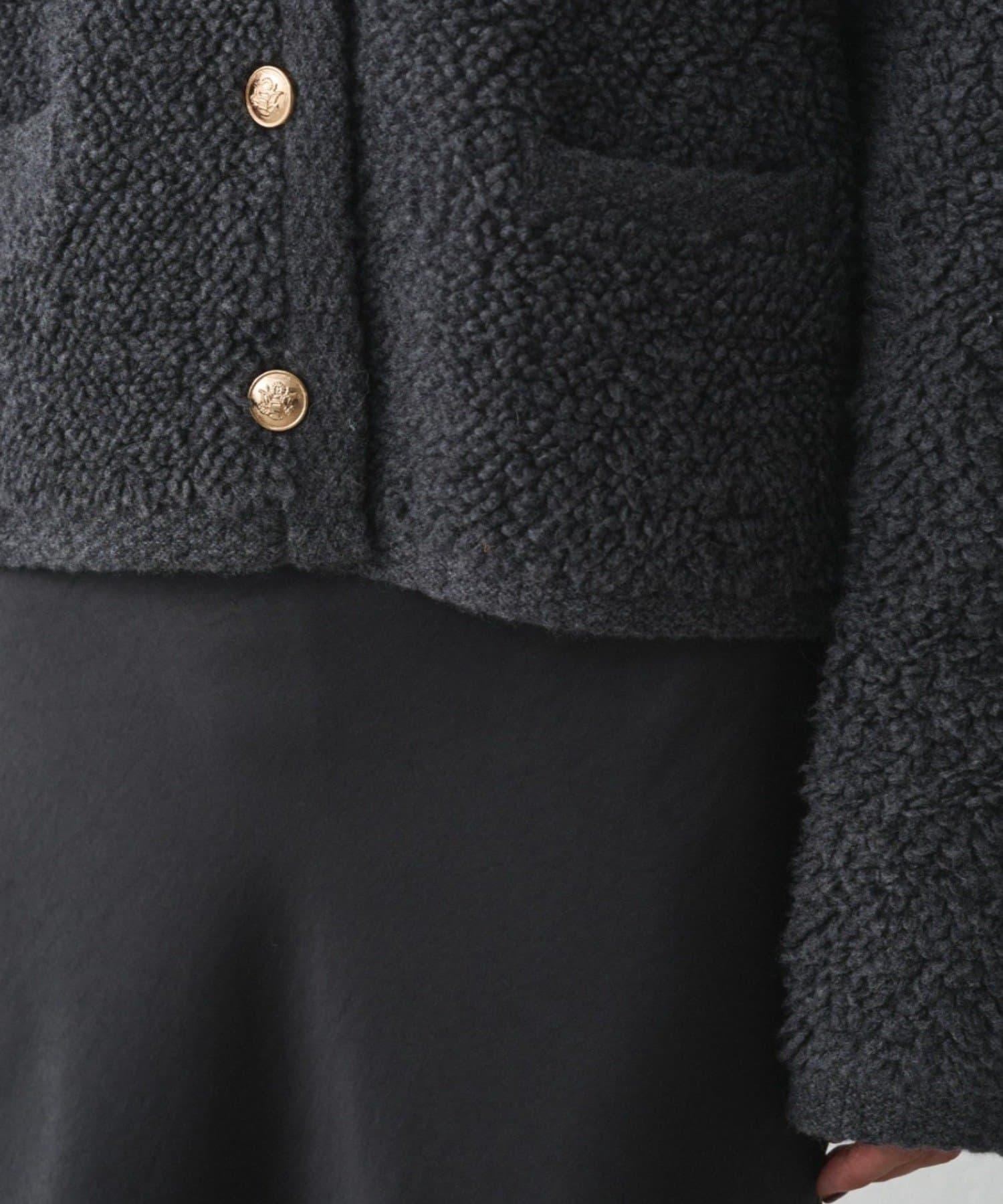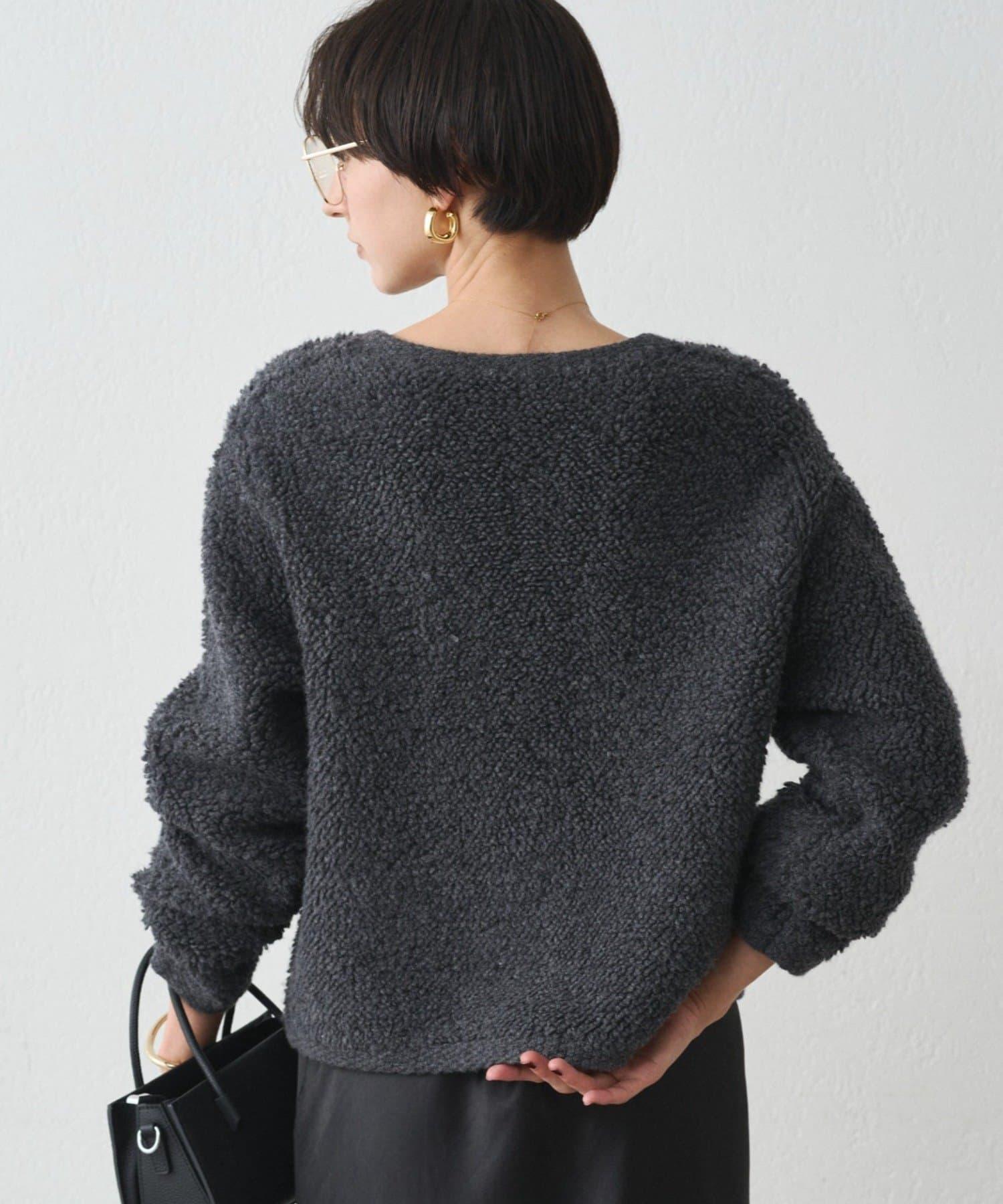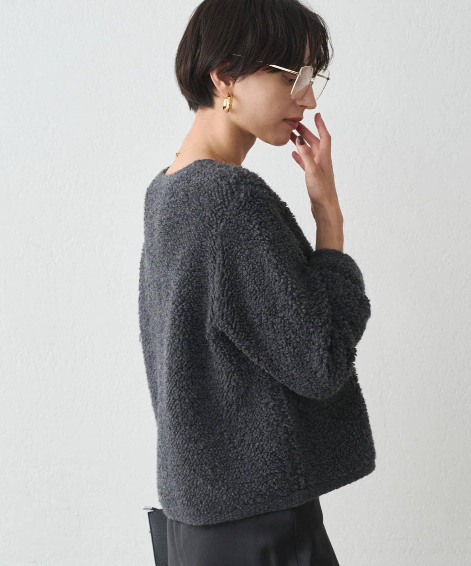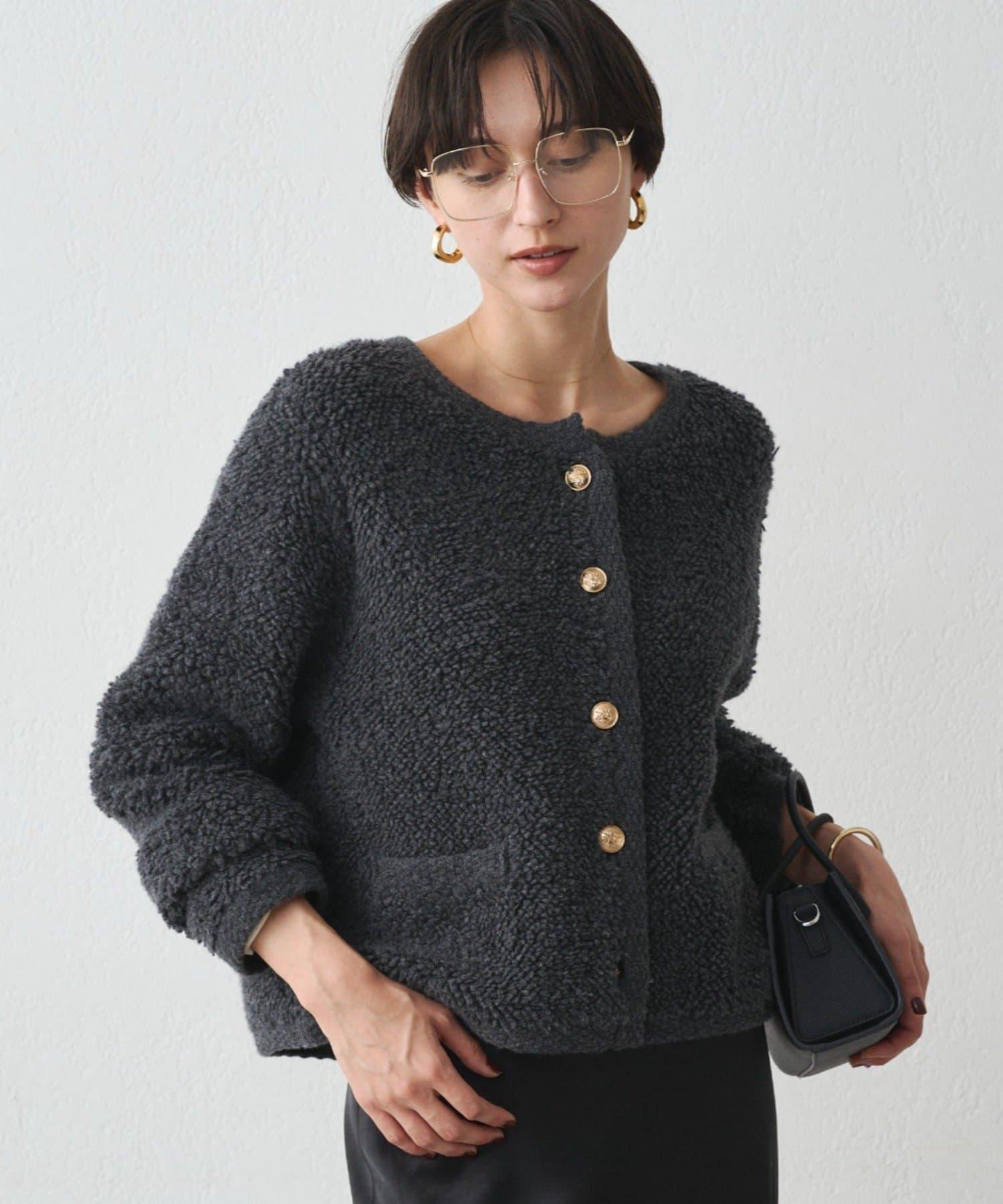 這款開襟羊毛衫的特點在於其蓬鬆的線圈針織。
