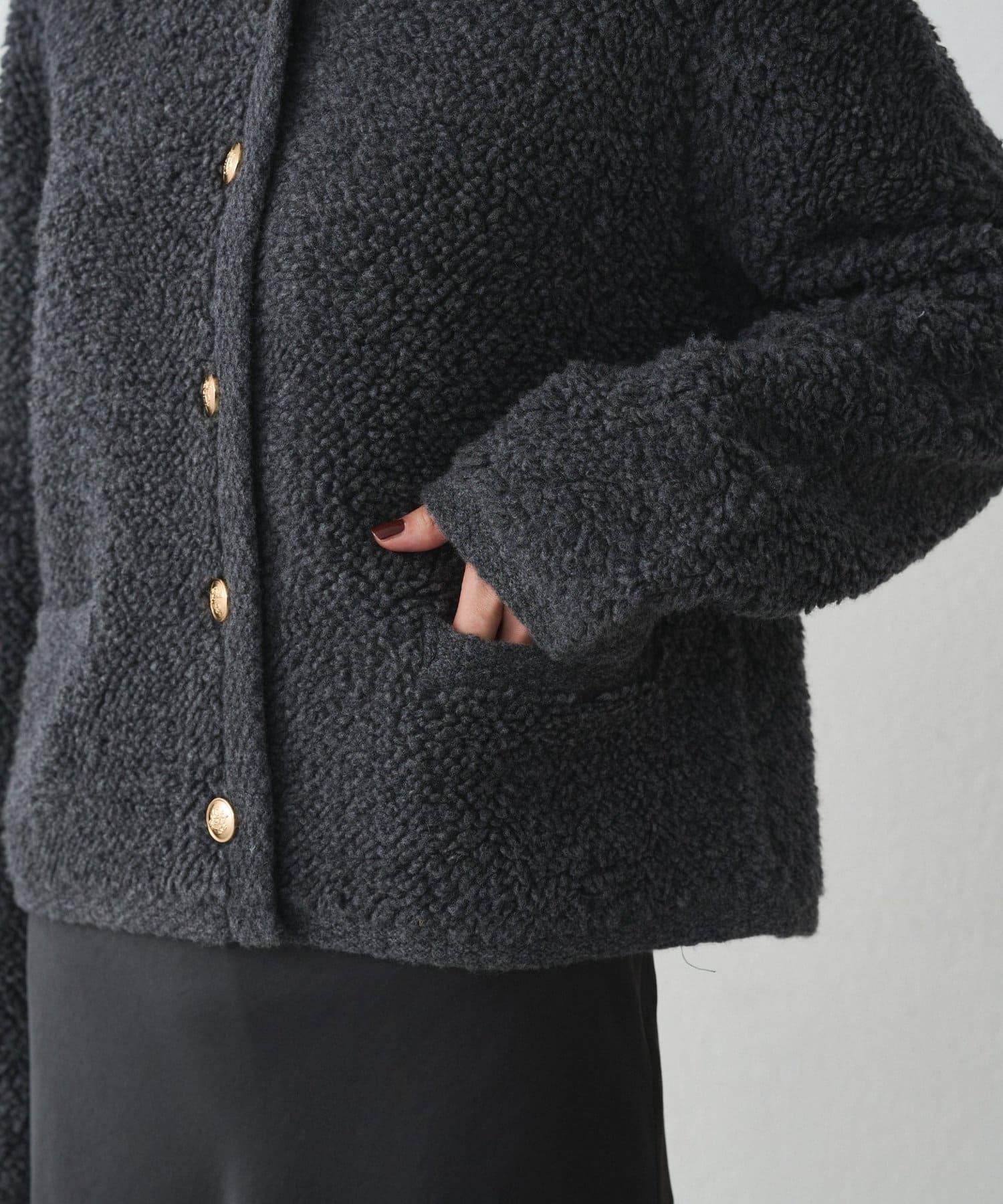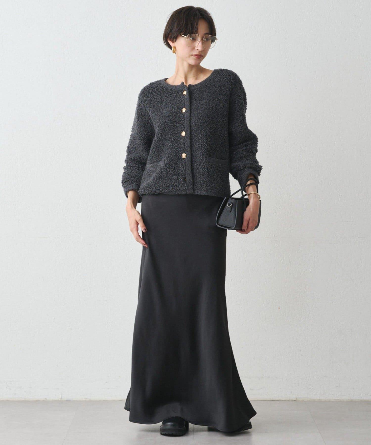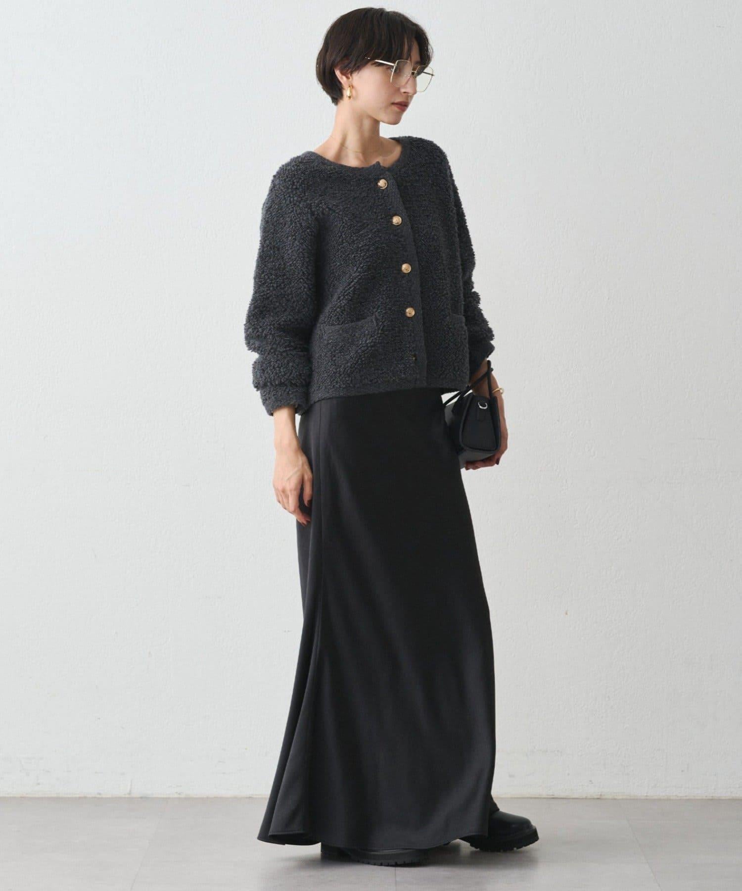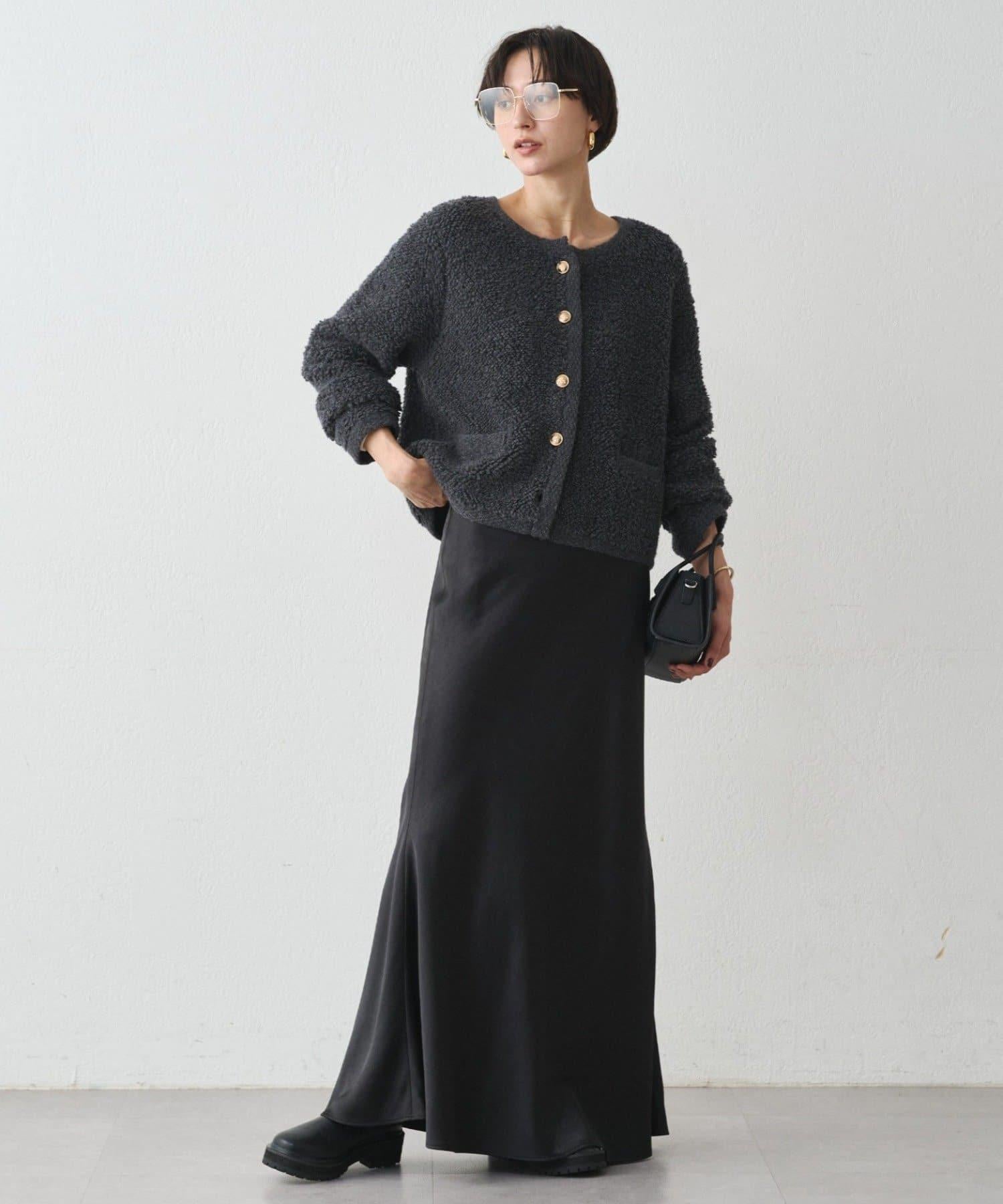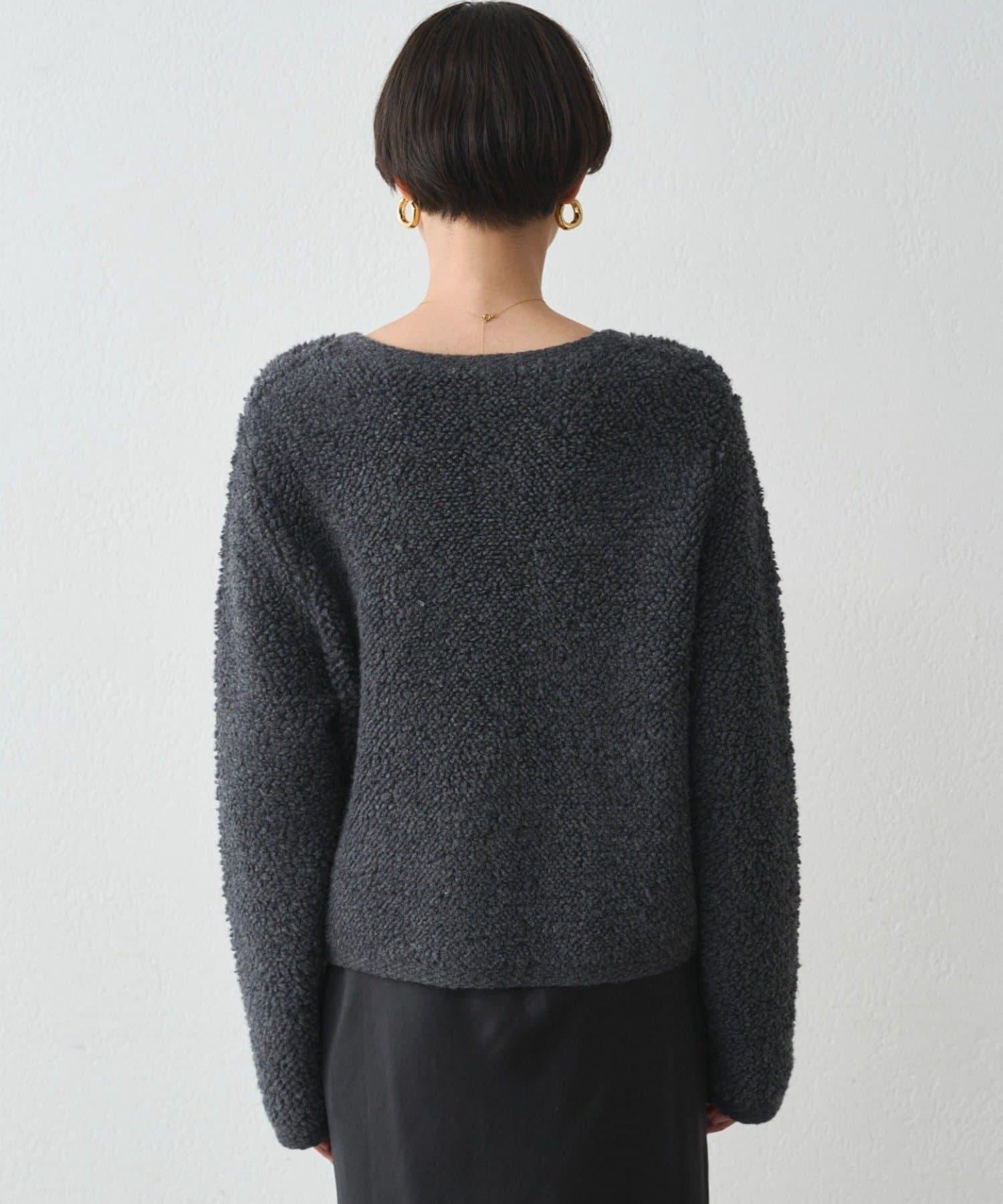 這款開襟羊毛衫的特點在於其蓬鬆的線圈針織。