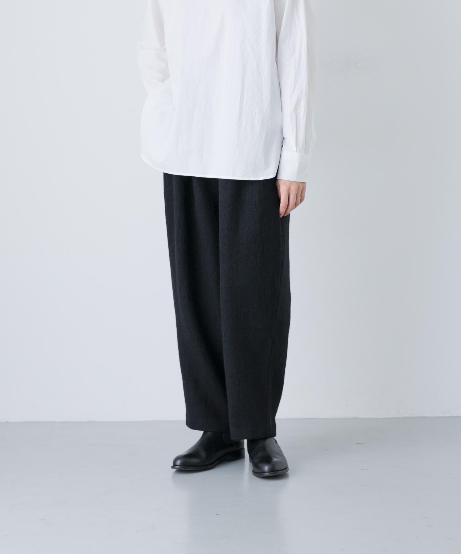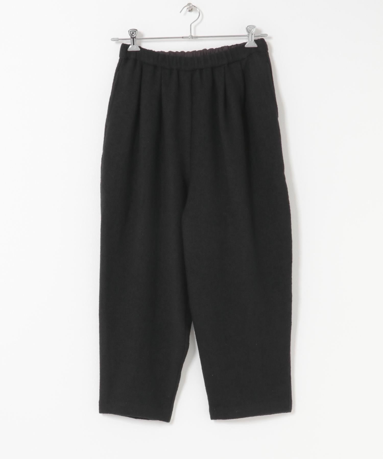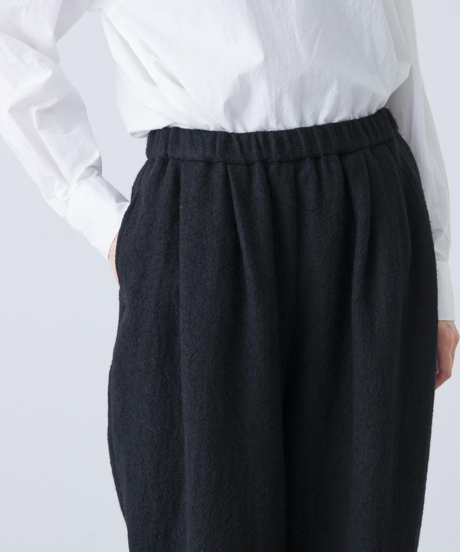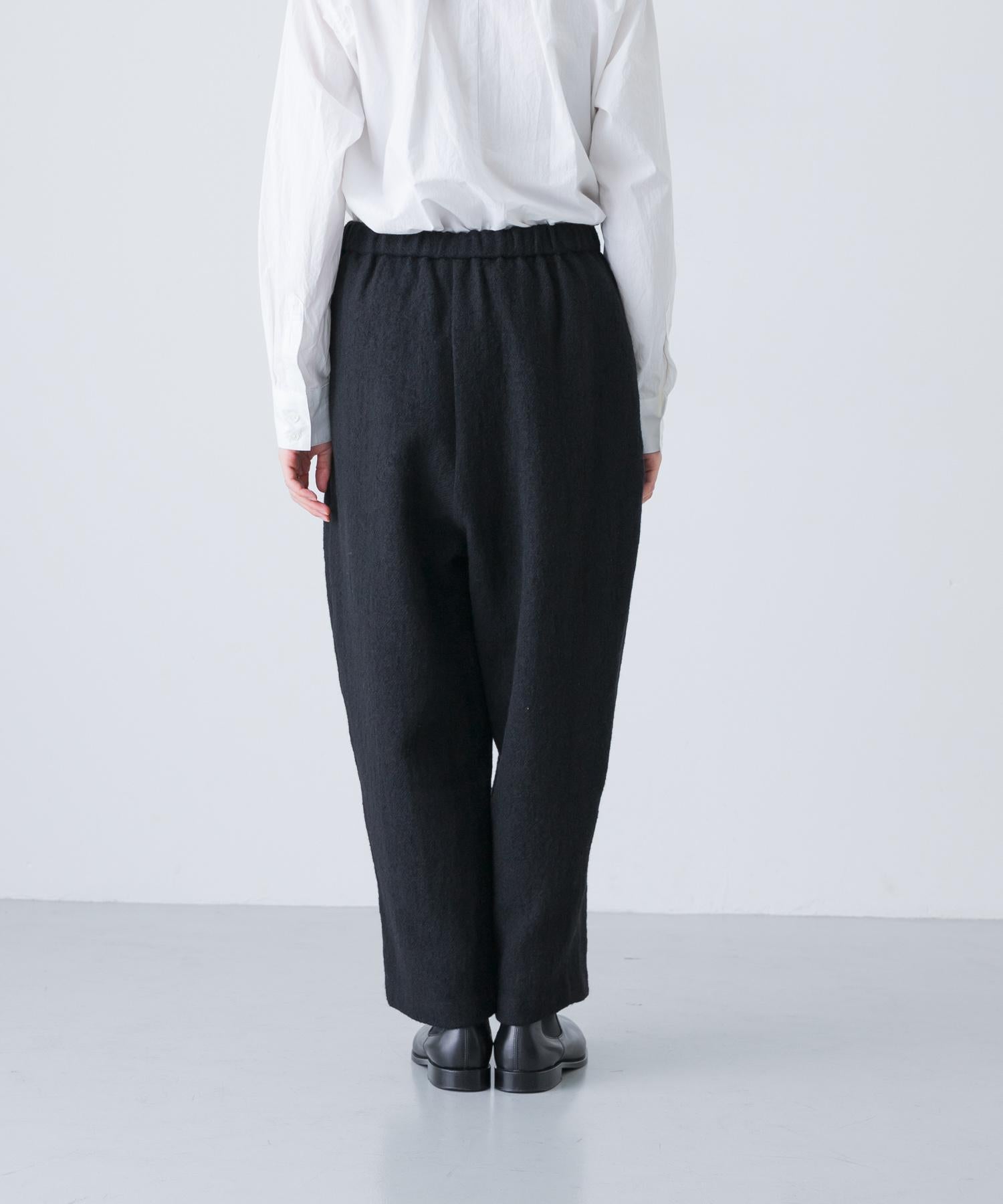 錐形長褲下襬輪廓流暢。與豐滿的上衣搭配,可以達到很好的平衡。面料採用蓬鬆的斜紋編織面料,經過壓縮處理,質地厚實而柔軟輕盈。它的外觀自然、溫暖,具有高品質的氣息。腰部採用完全鬆緊的繫帶設計,方便穿著。可與同款外套(黑色)搭配,出席正式場合。