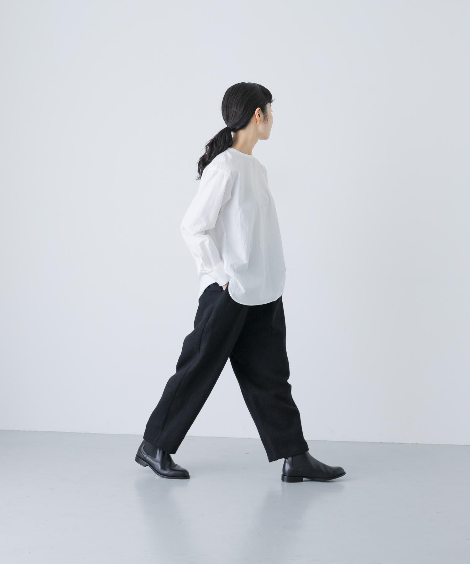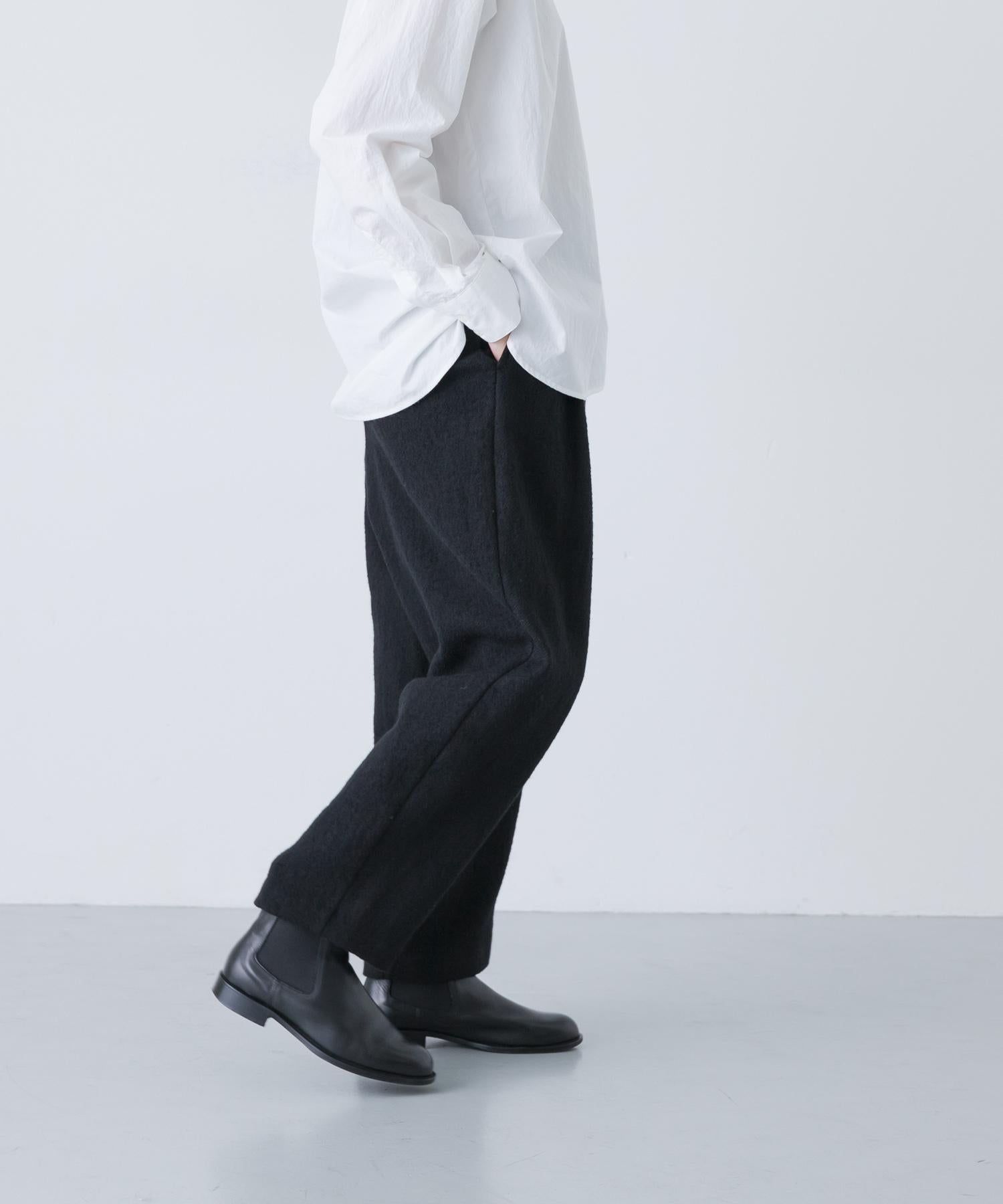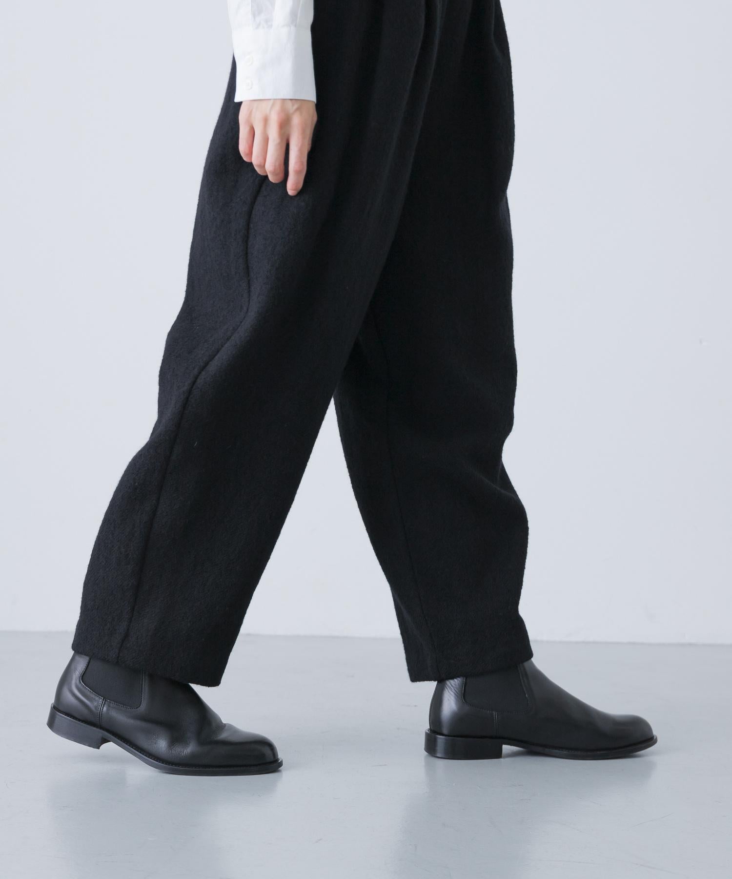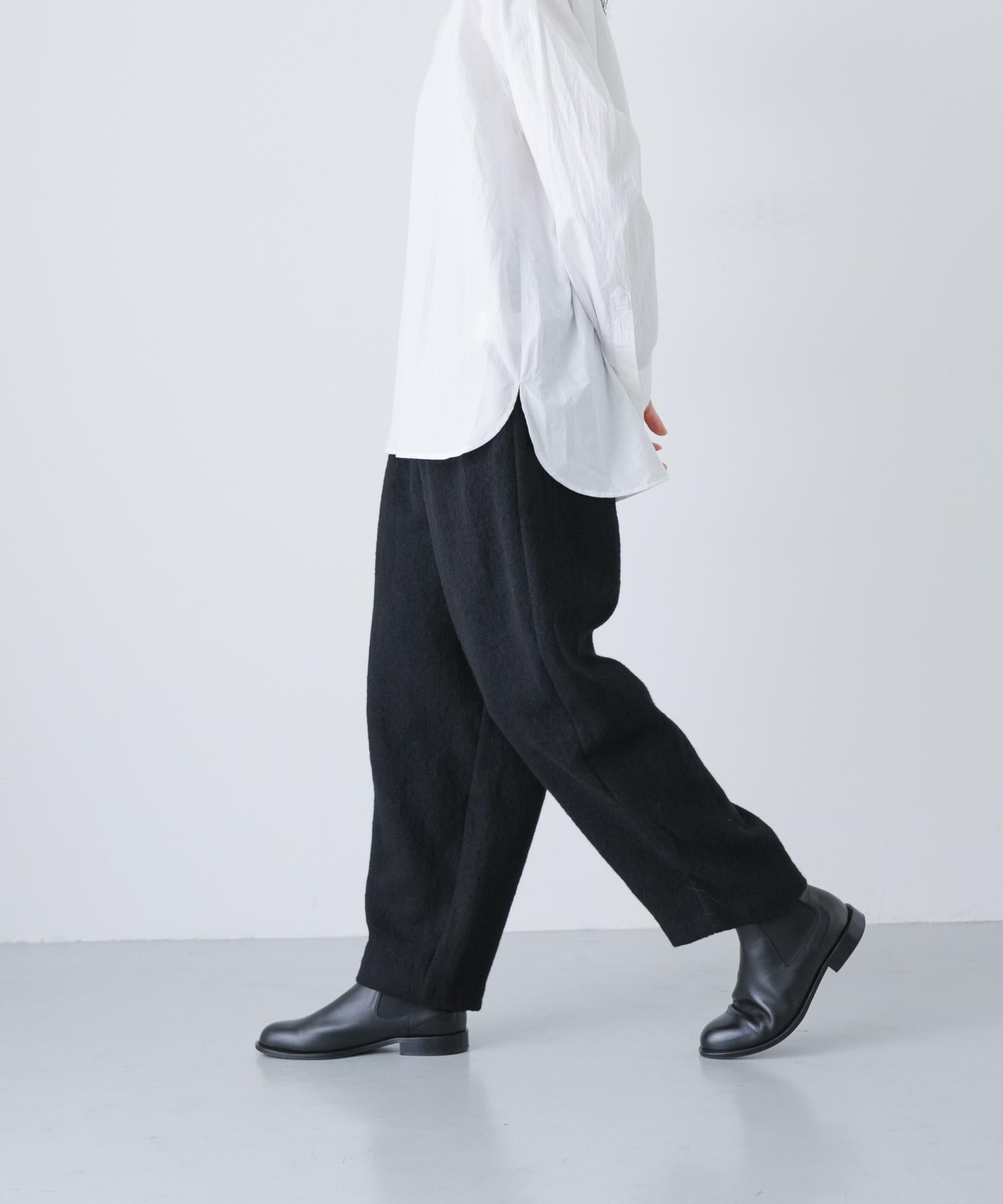 錐形長褲下襬輪廓流暢。與豐滿的上衣搭配,可以達到很好的平衡。面料採用蓬鬆的斜紋編織面料,經過壓縮處理,質地厚實而柔軟輕盈。它的外觀自然、溫暖,具有高品質的氣息。腰部採用完全鬆緊的繫帶設計,方便穿著。可與同款外套(黑色)搭配,出席正式場合。