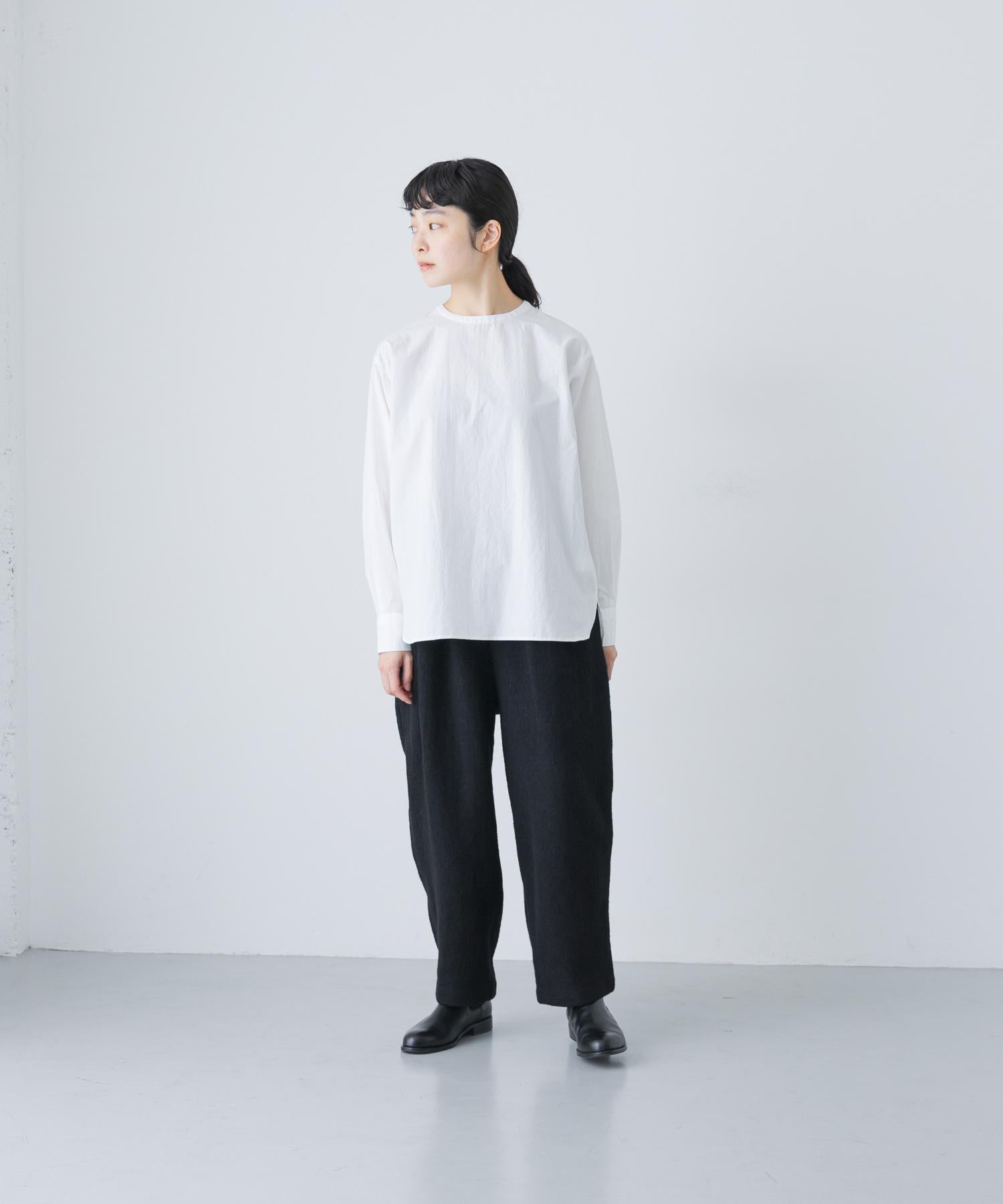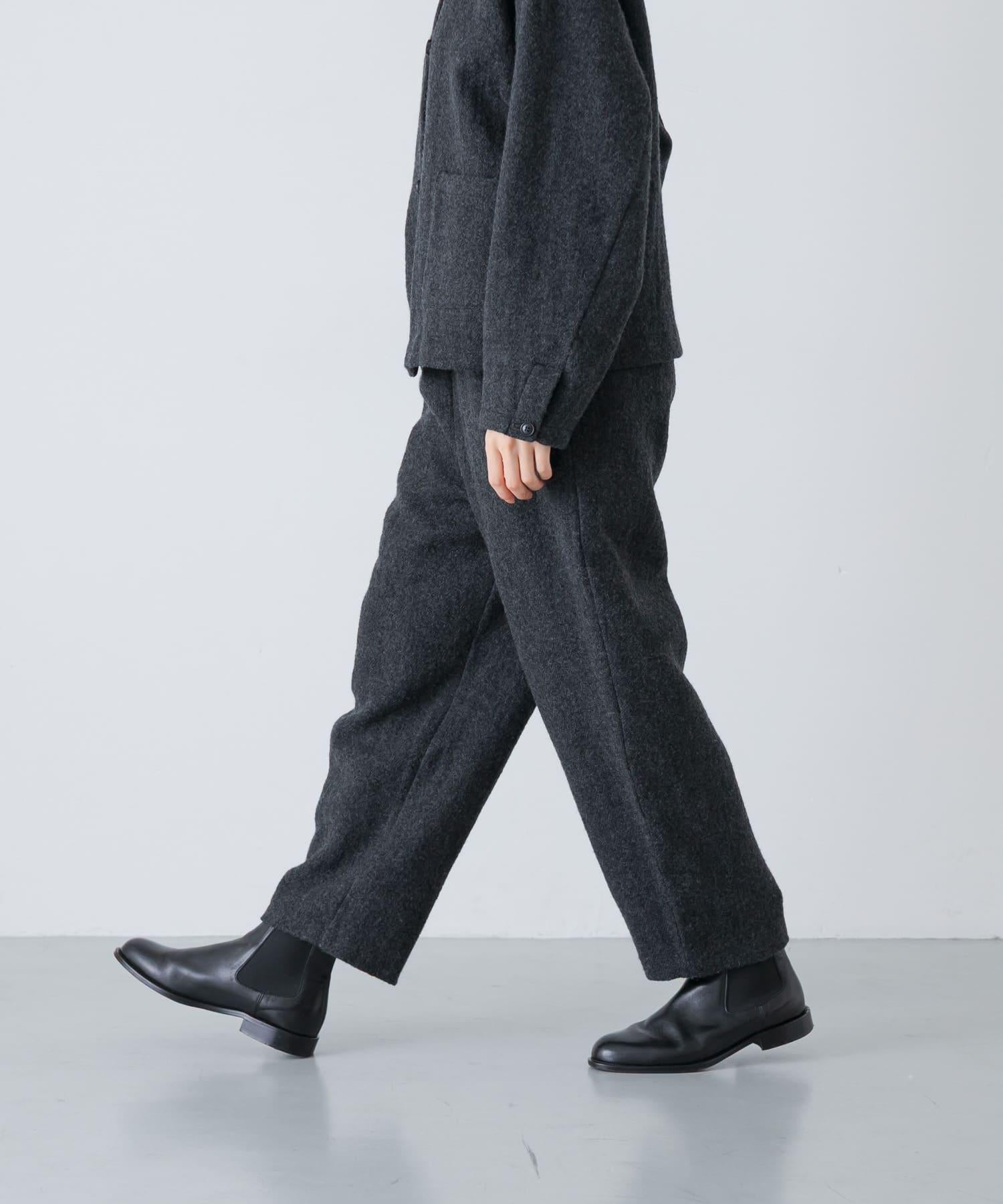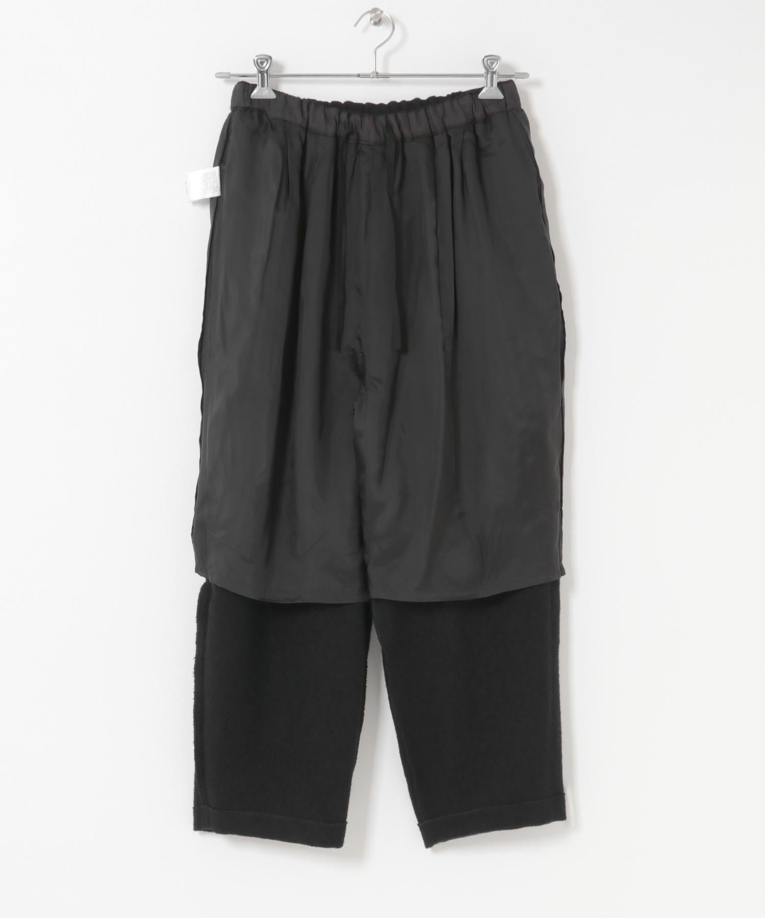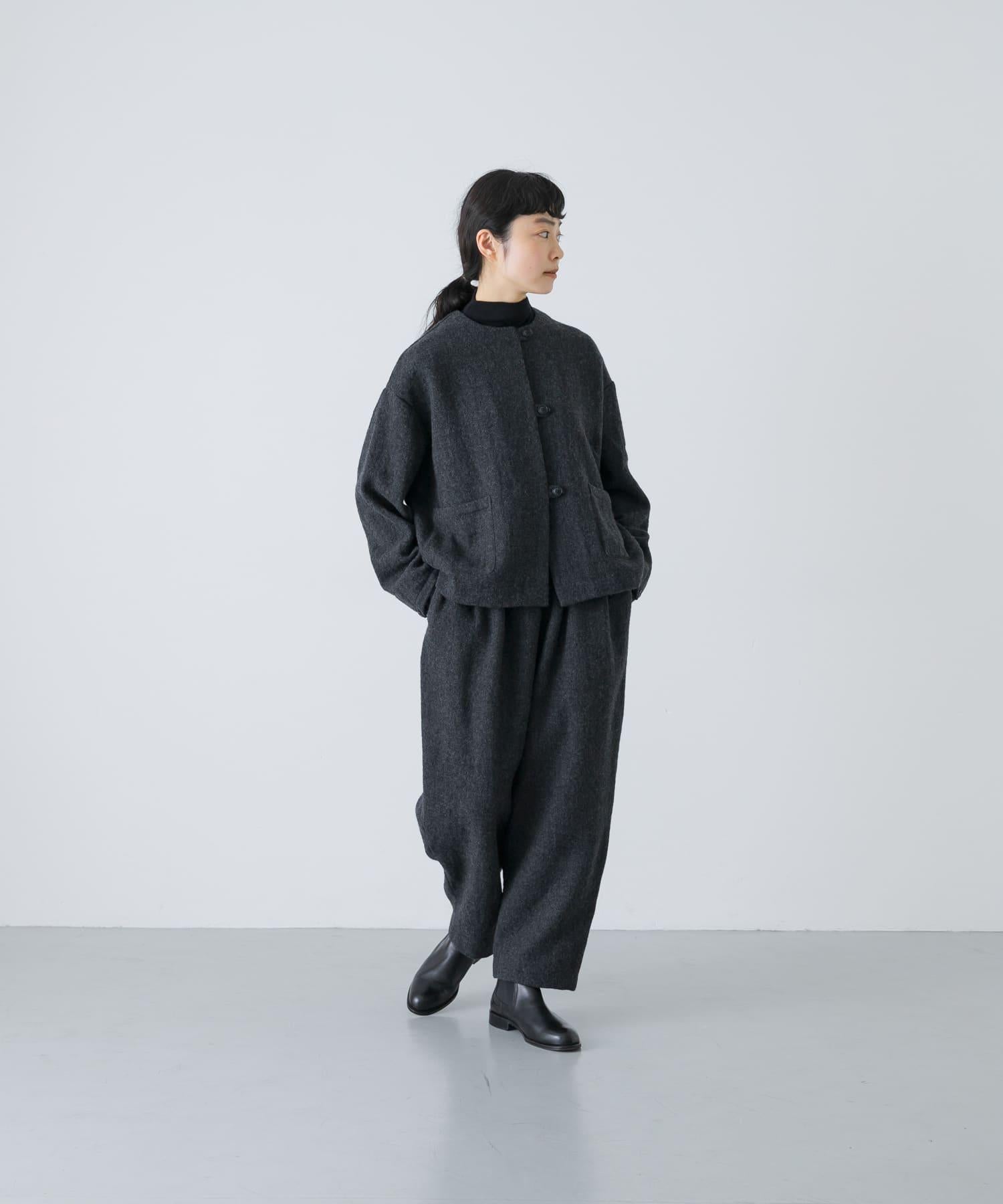 錐形長褲下襬輪廓流暢。與豐滿的上衣搭配,可以達到很好的平衡。面料採用蓬鬆的斜紋編織面料,經過壓縮處理,質地厚實而柔軟輕盈。它的外觀自然、溫暖,具有高品質的氣息。腰部採用完全鬆緊的繫帶設計,方便穿著。可與同款外套(黑色)搭配,出席正式場合。