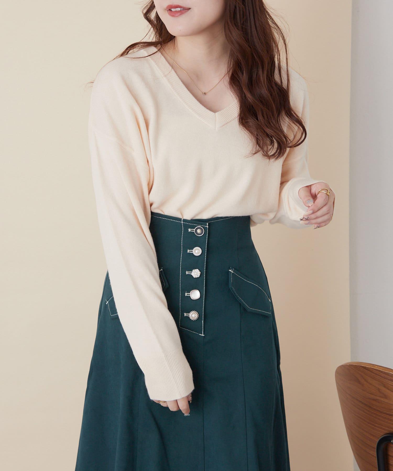 對於那些想把沙發布和牛仔裙穿出成熟感的人來說,V 領上衣搭配美麗的肩部曲線是非常不錯的選擇。
