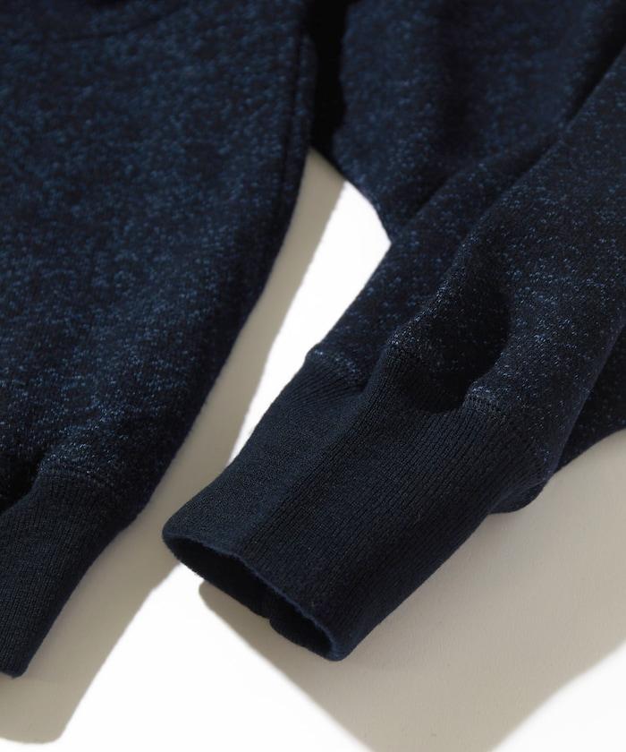 美麗諾羊毛和棉質運動衫系列,採用木質面料。我們製作了一件連帽衫、一件圓領衫和一件 V 領衫。羊毛具有吸溼的特性,當你穿著羊毛出汗時,羊毛會將水分吸附在纖維中。因此,即使織物被汗水打溼,其表面仍會保持乾燥。但是,如果出汗超過一定量,纖維中就會充滿水分。它會反彈到外面。