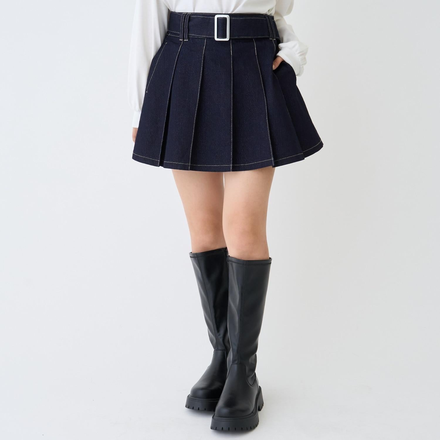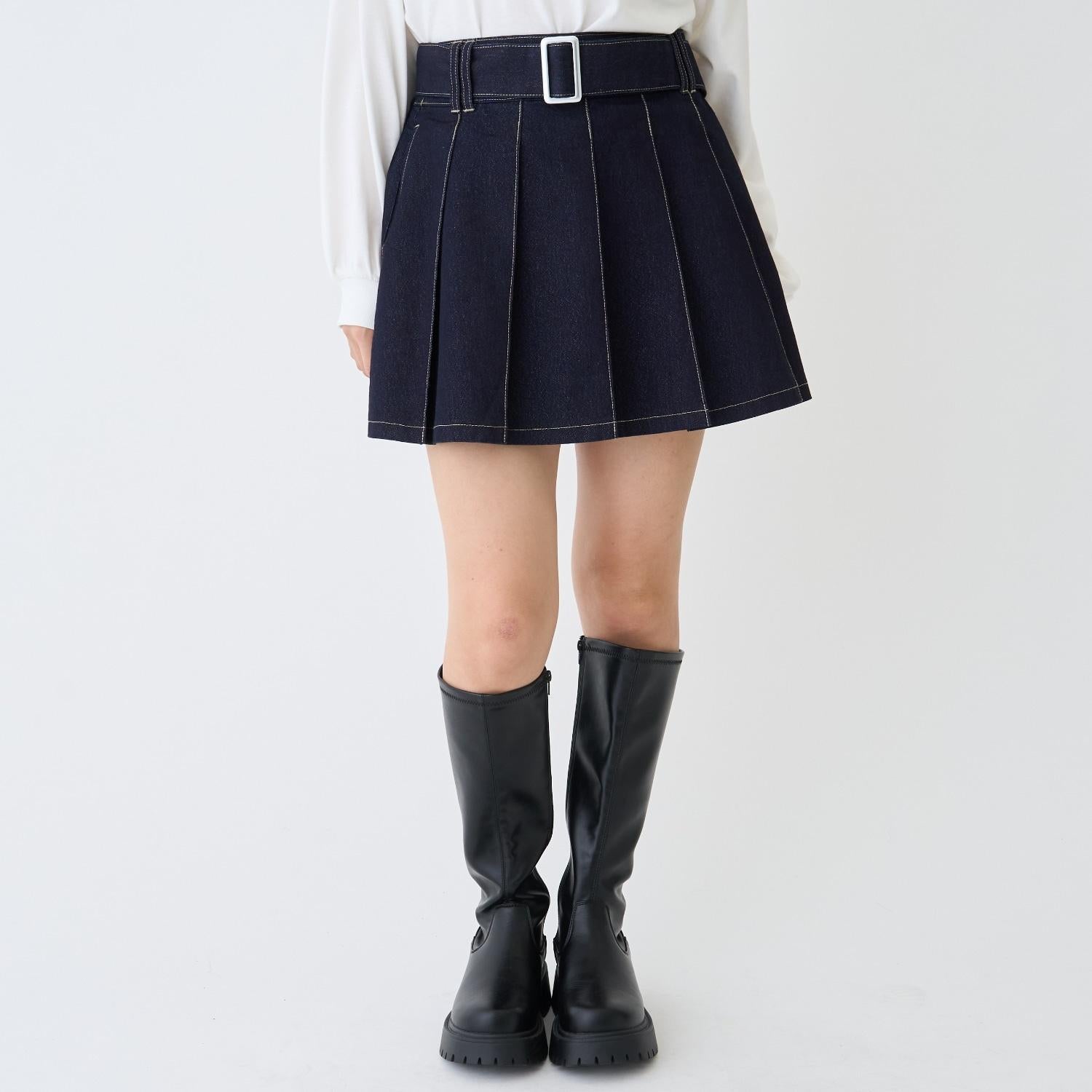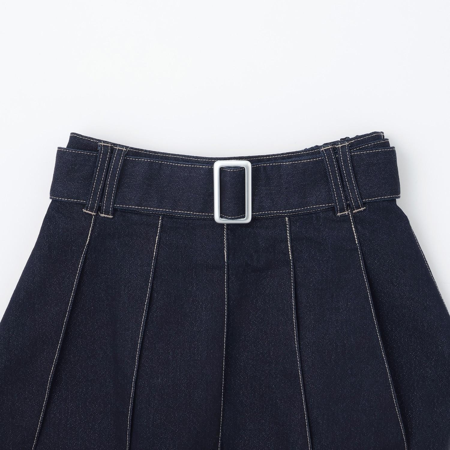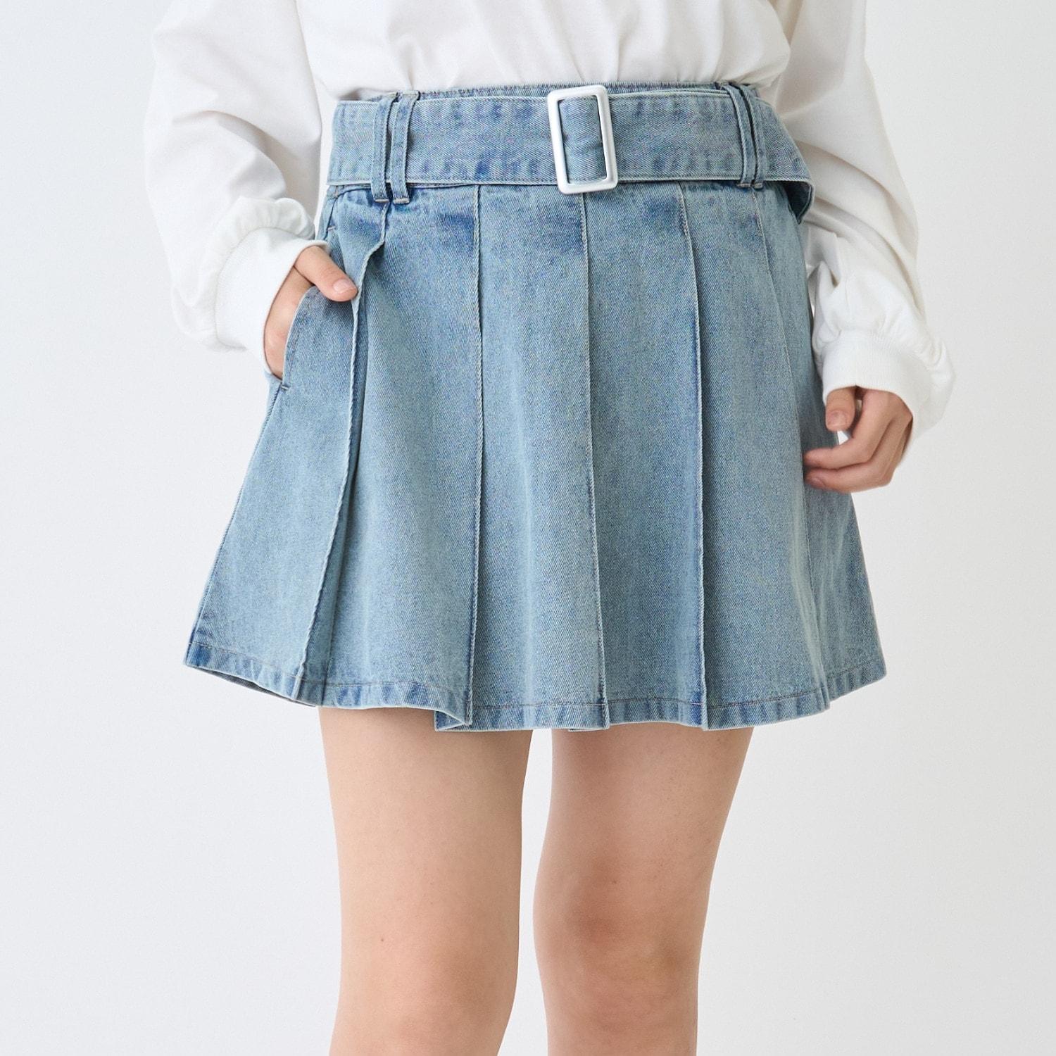 美腿顯瘦帶腰帶牛仔百褶裙