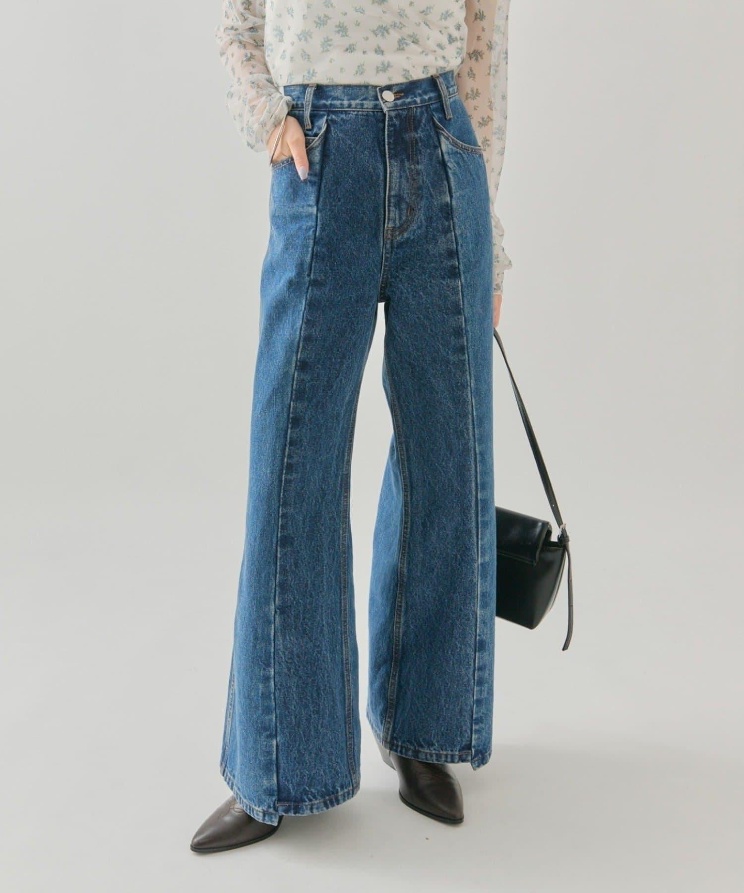 這款牛仔長褲採用向下擺延伸的喇叭廓形,中間的鏤空線條強調了垂直線條,提升了你的時尚感。