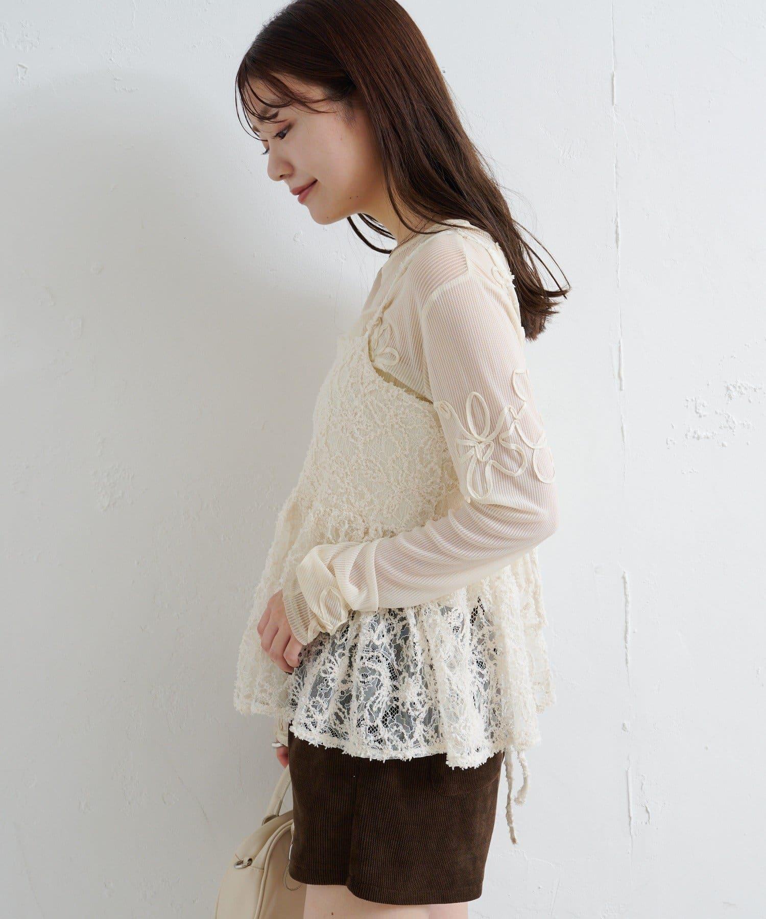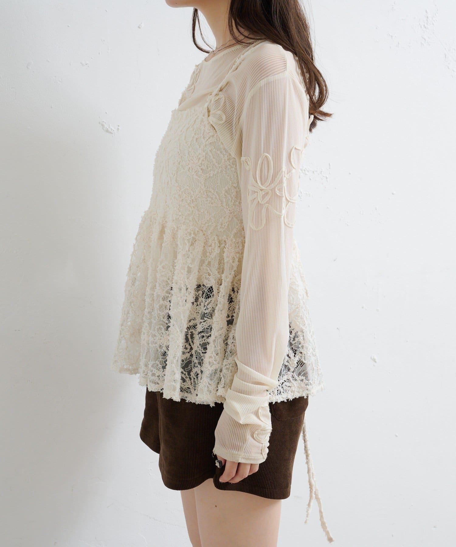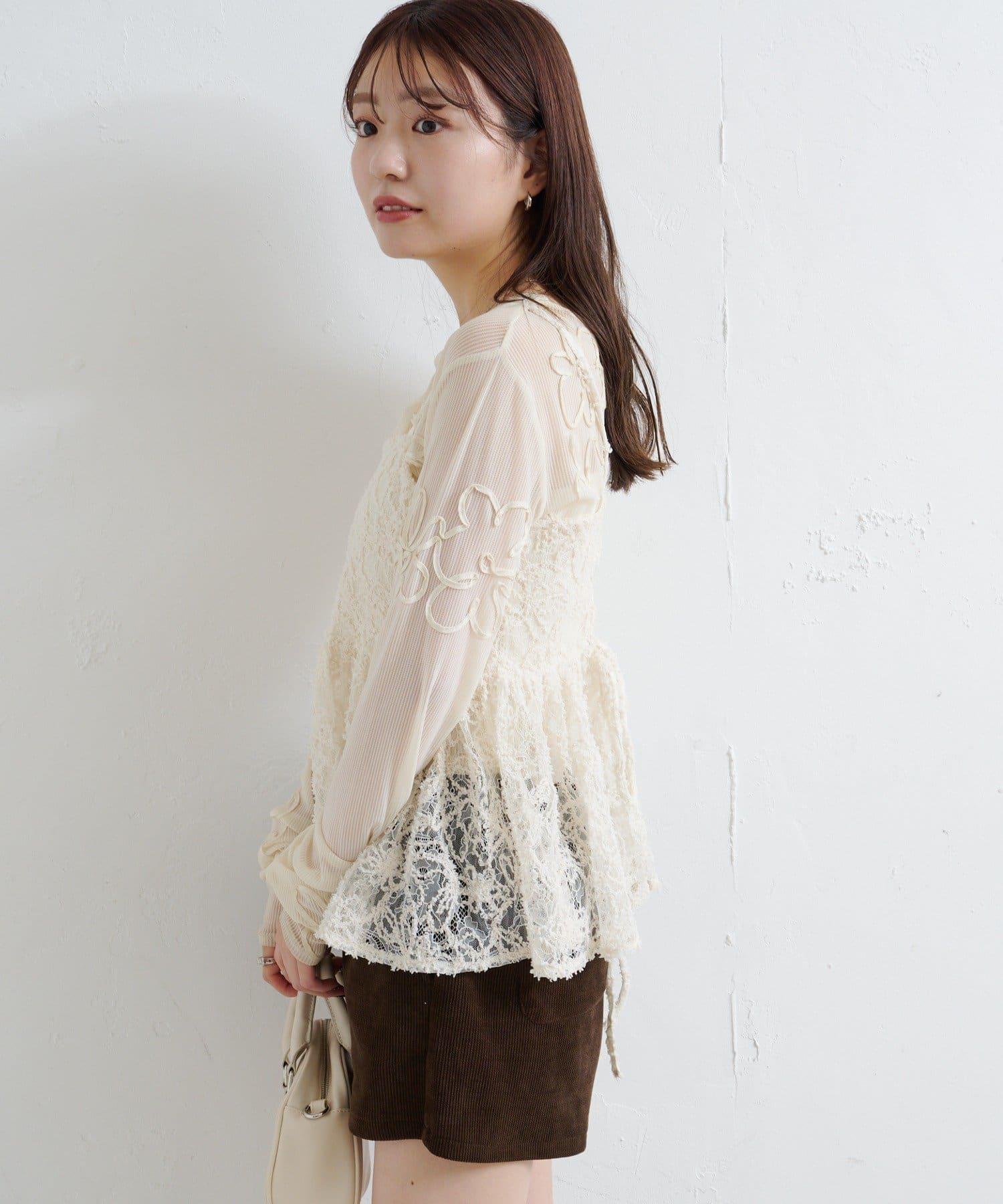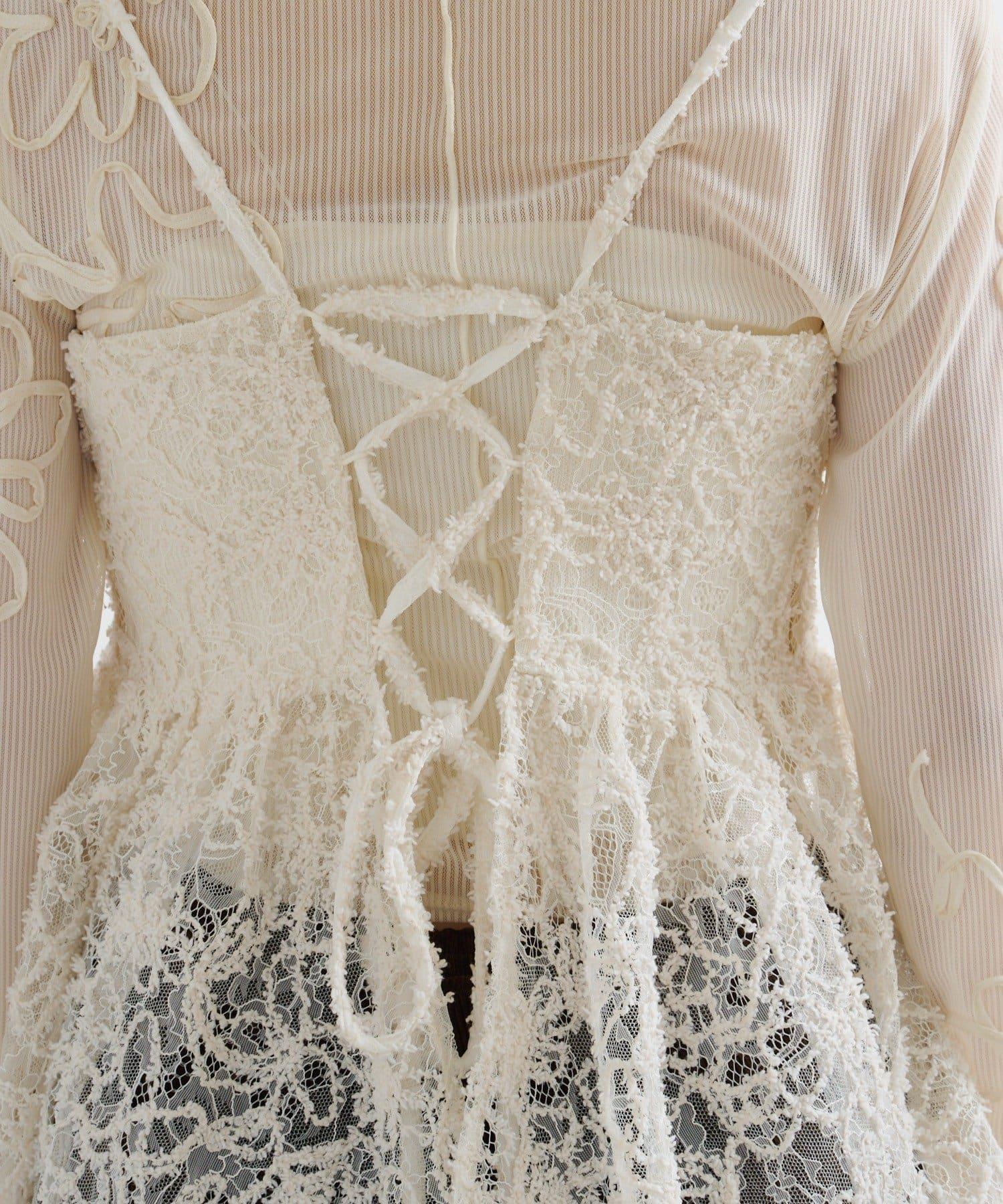 使用了精緻的蕾絲材料。如果與粗糙的表面摩擦,或被包、皮帶或尖銳物品夾住,蕾絲的縷線很容易浮起,可能會被割斷。請小心處理。