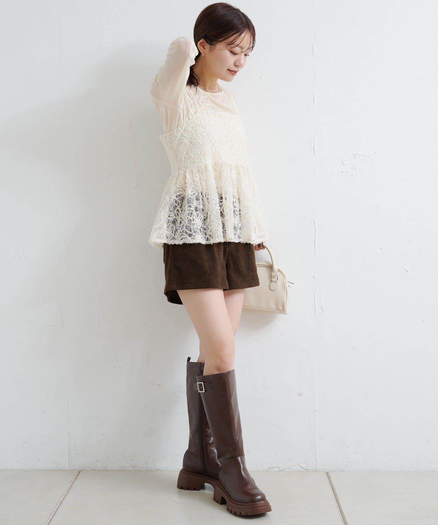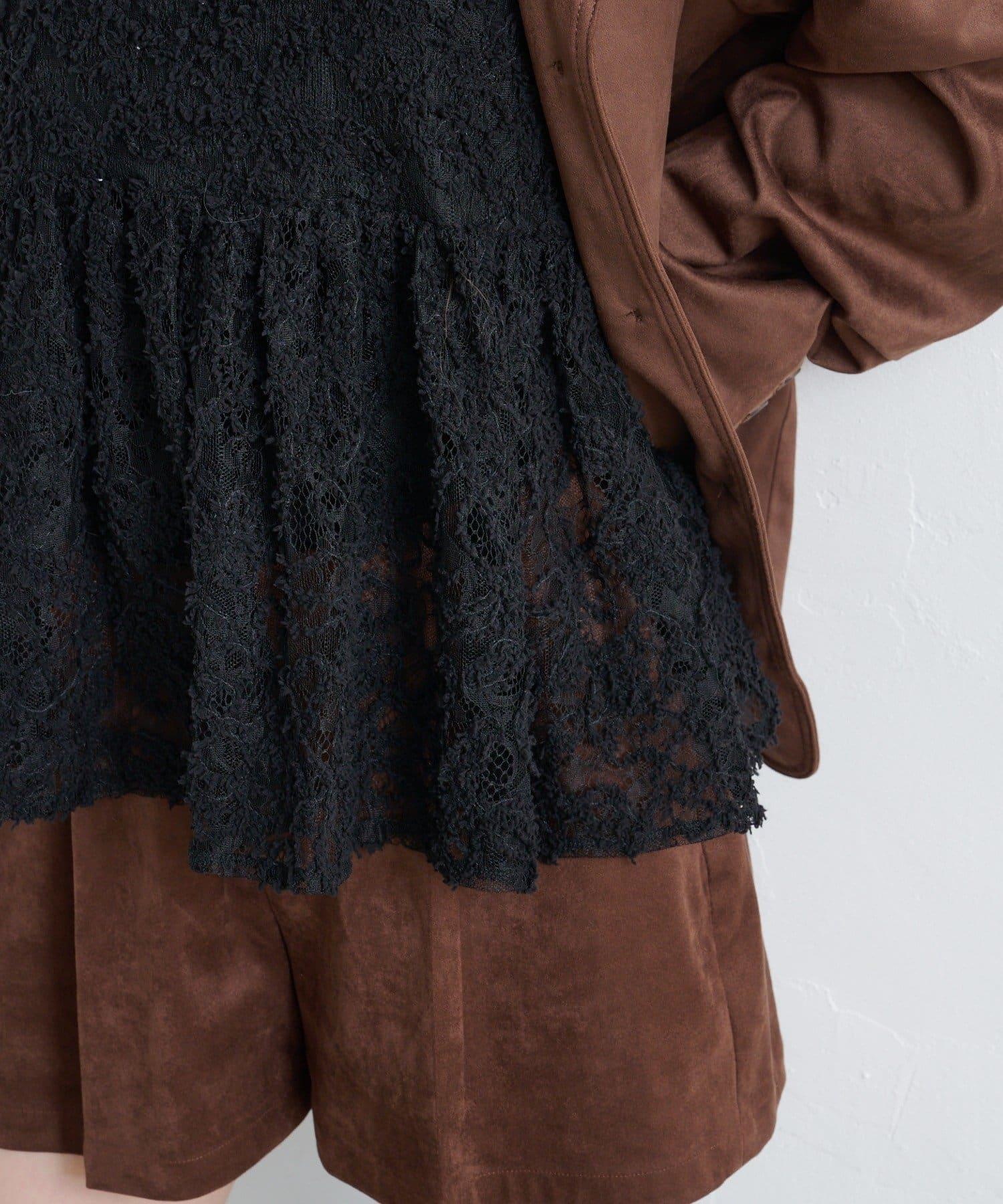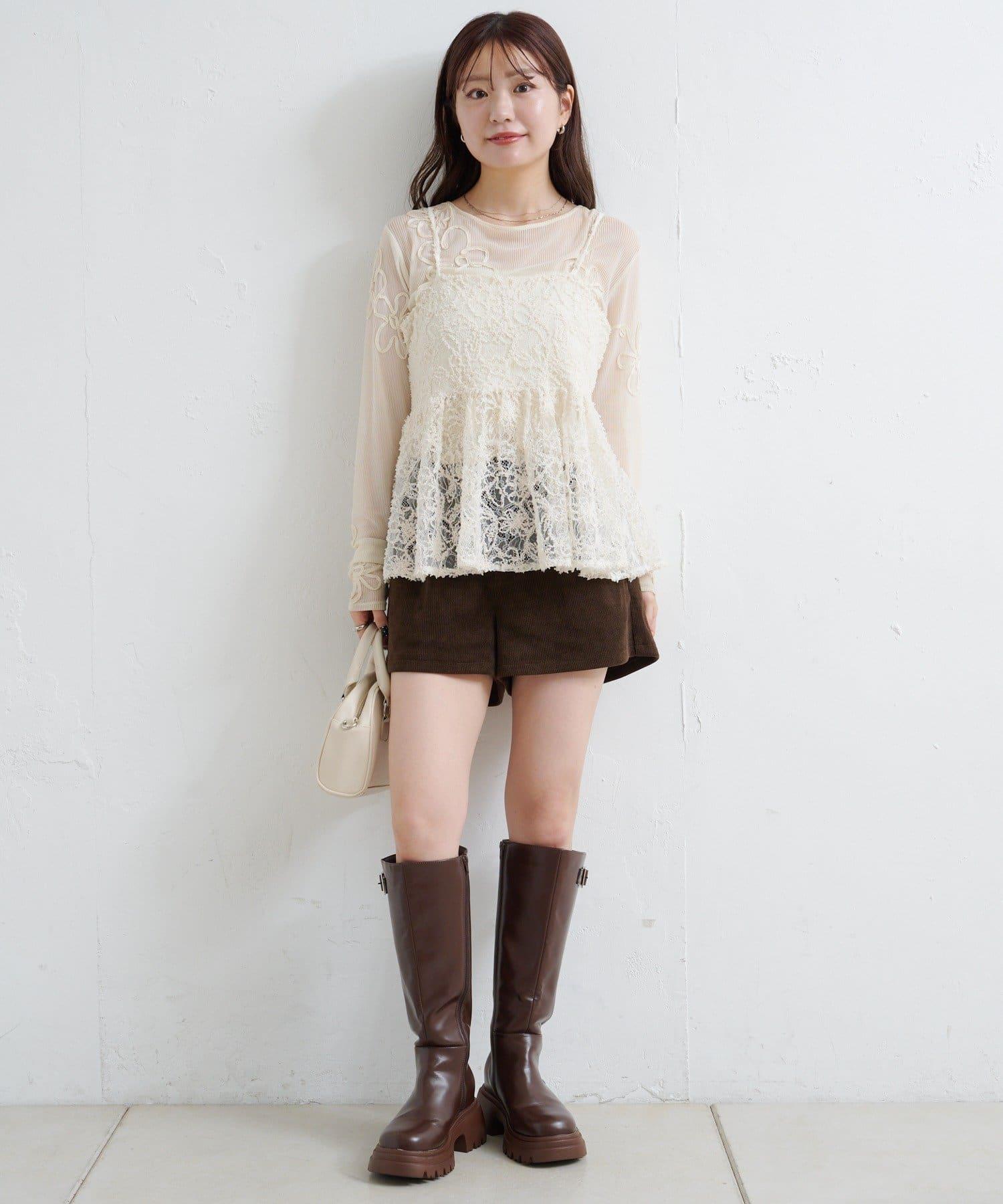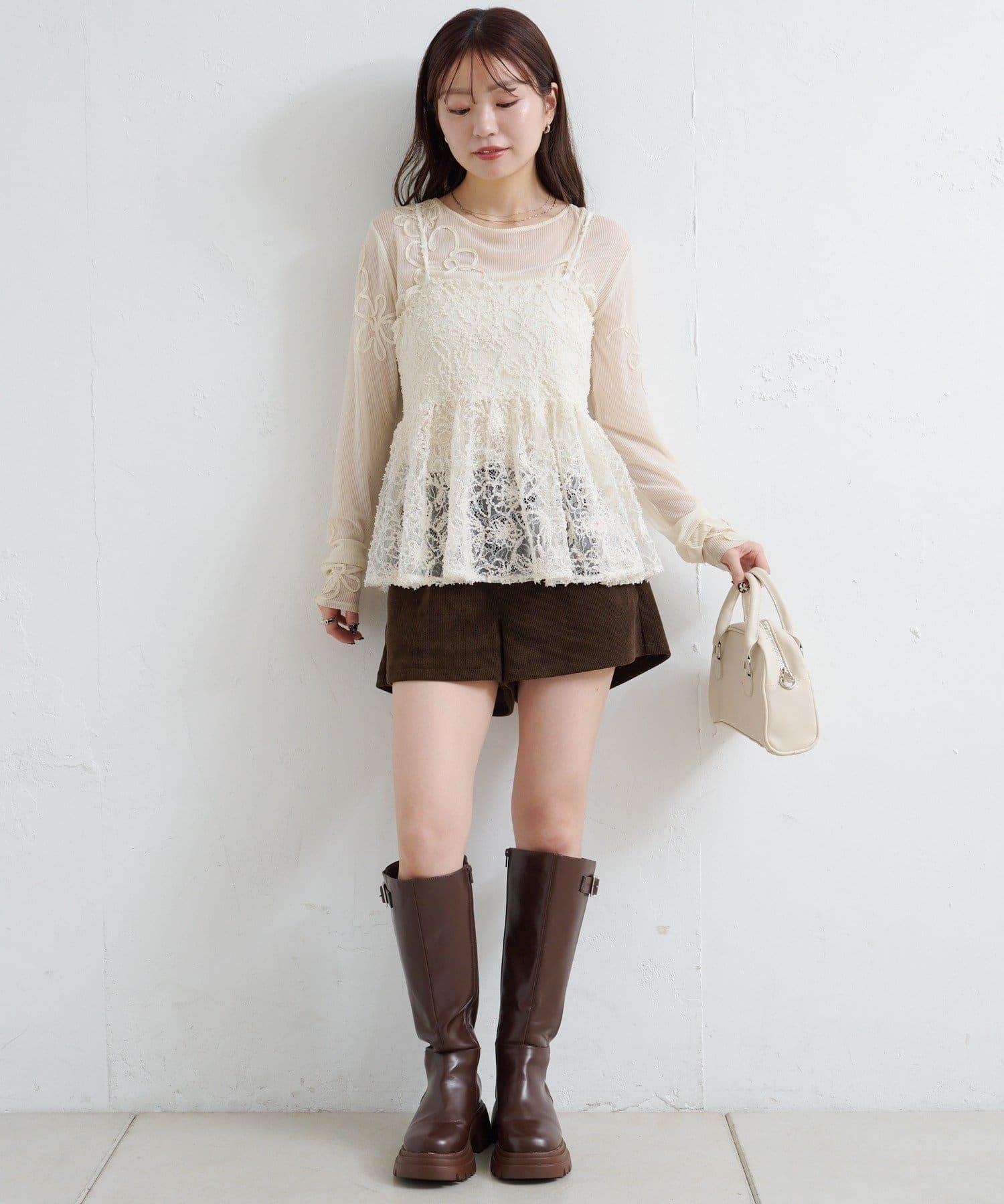 使用了精緻的蕾絲材料。如果與粗糙的表面摩擦,或被包、皮帶或尖銳物品夾住,蕾絲的縷線很容易浮起,可能會被割斷。請小心處理。