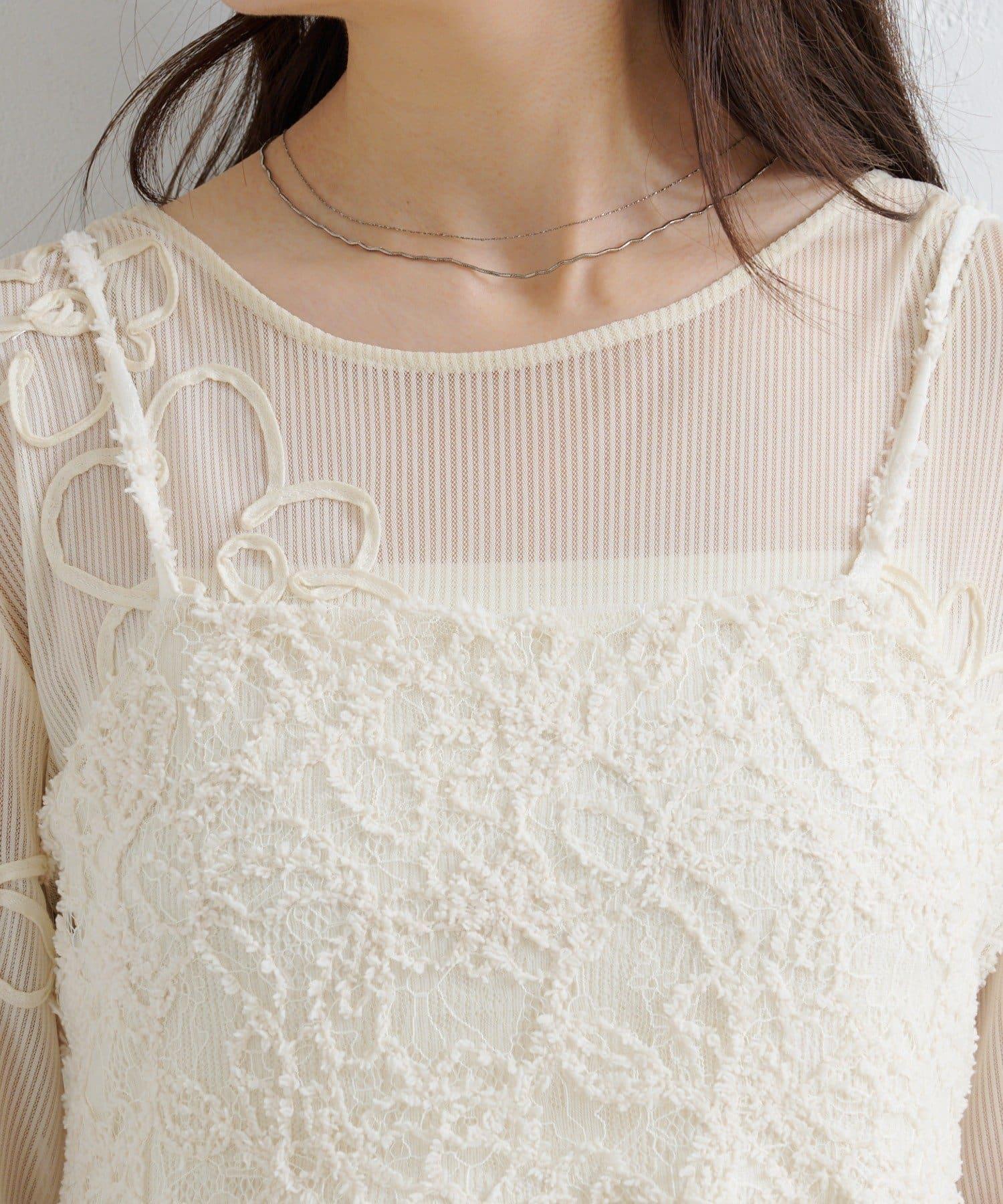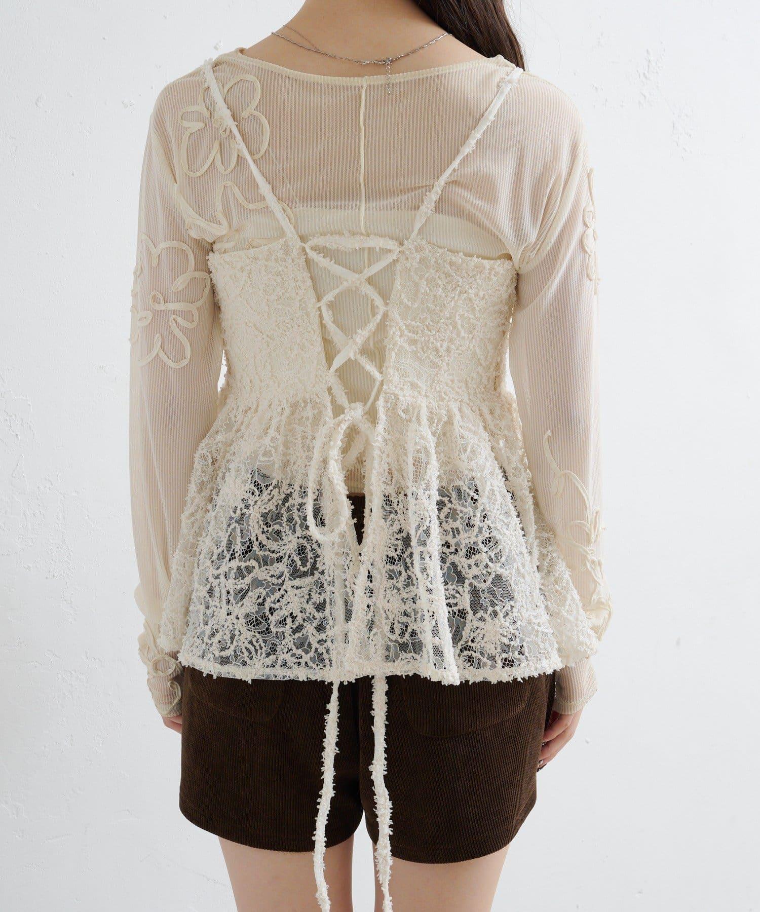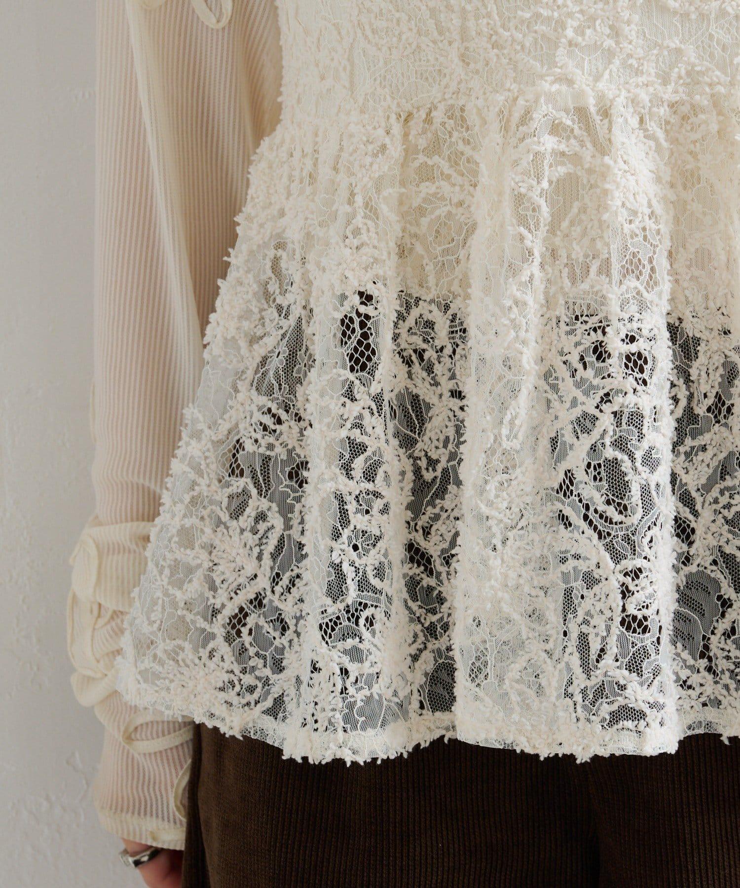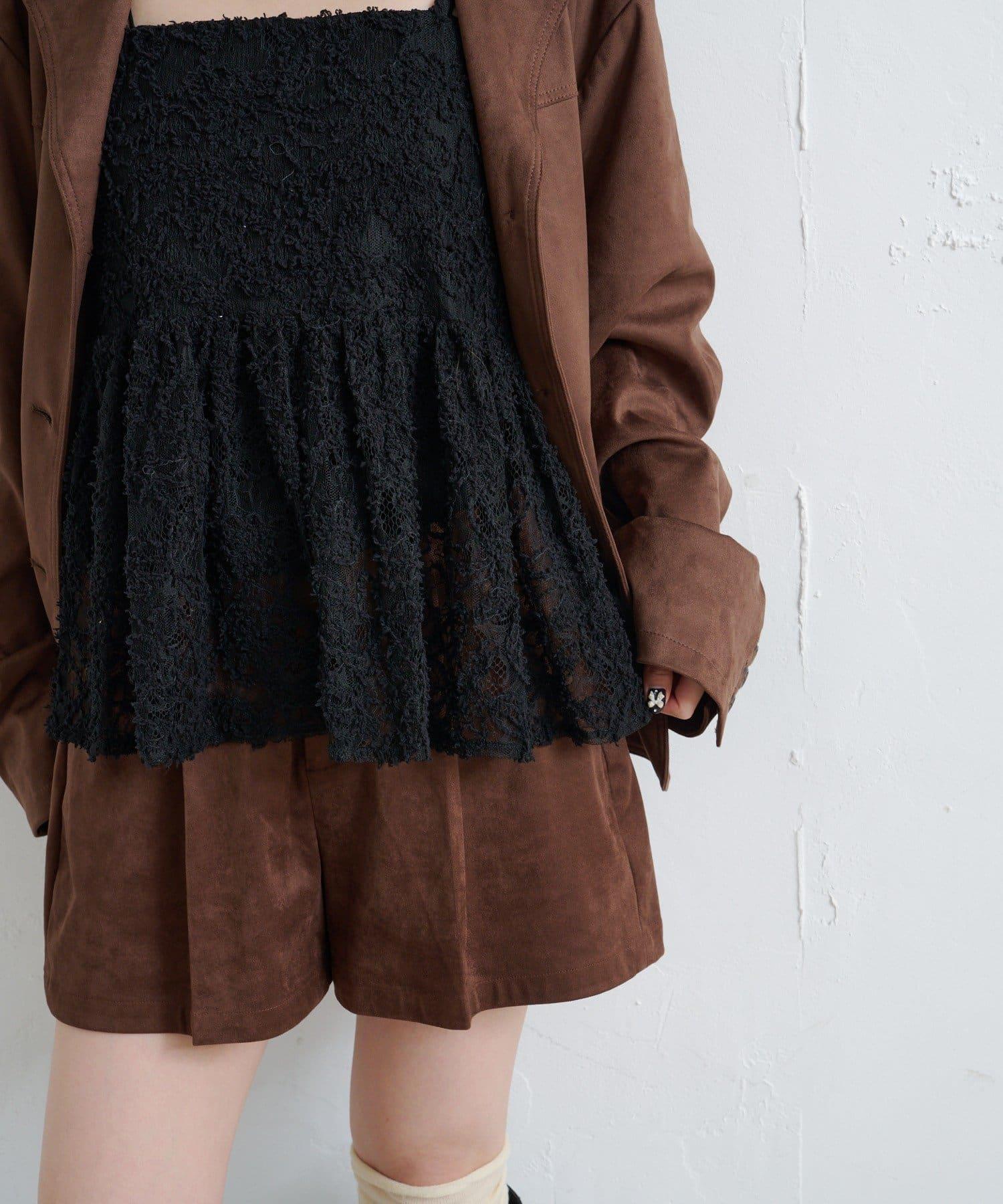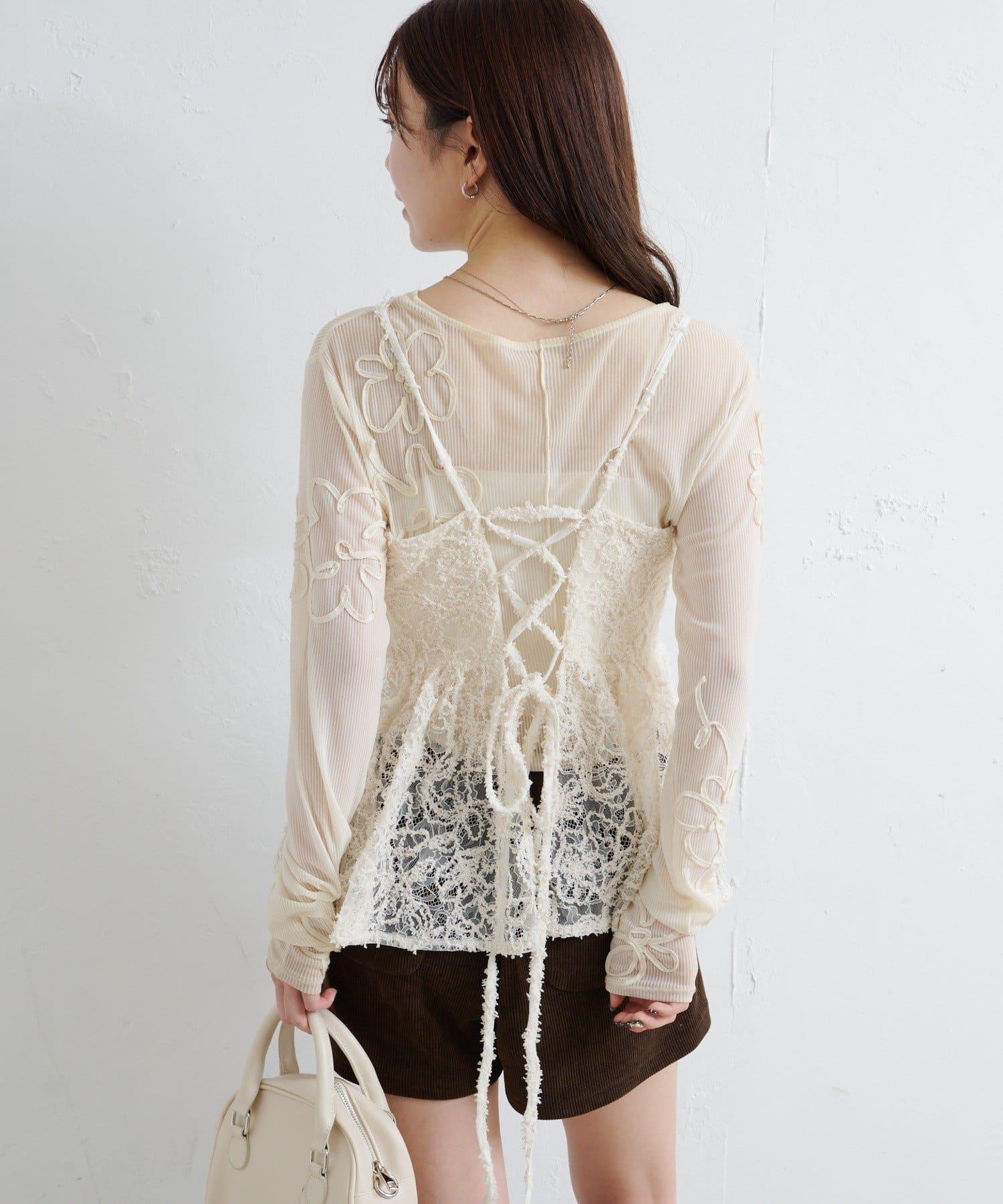 使用了精緻的蕾絲材料。如果與粗糙的表面摩擦,或被包、皮帶或尖銳物品夾住,蕾絲的縷線很容易浮起,可能會被割斷。請小心處理。