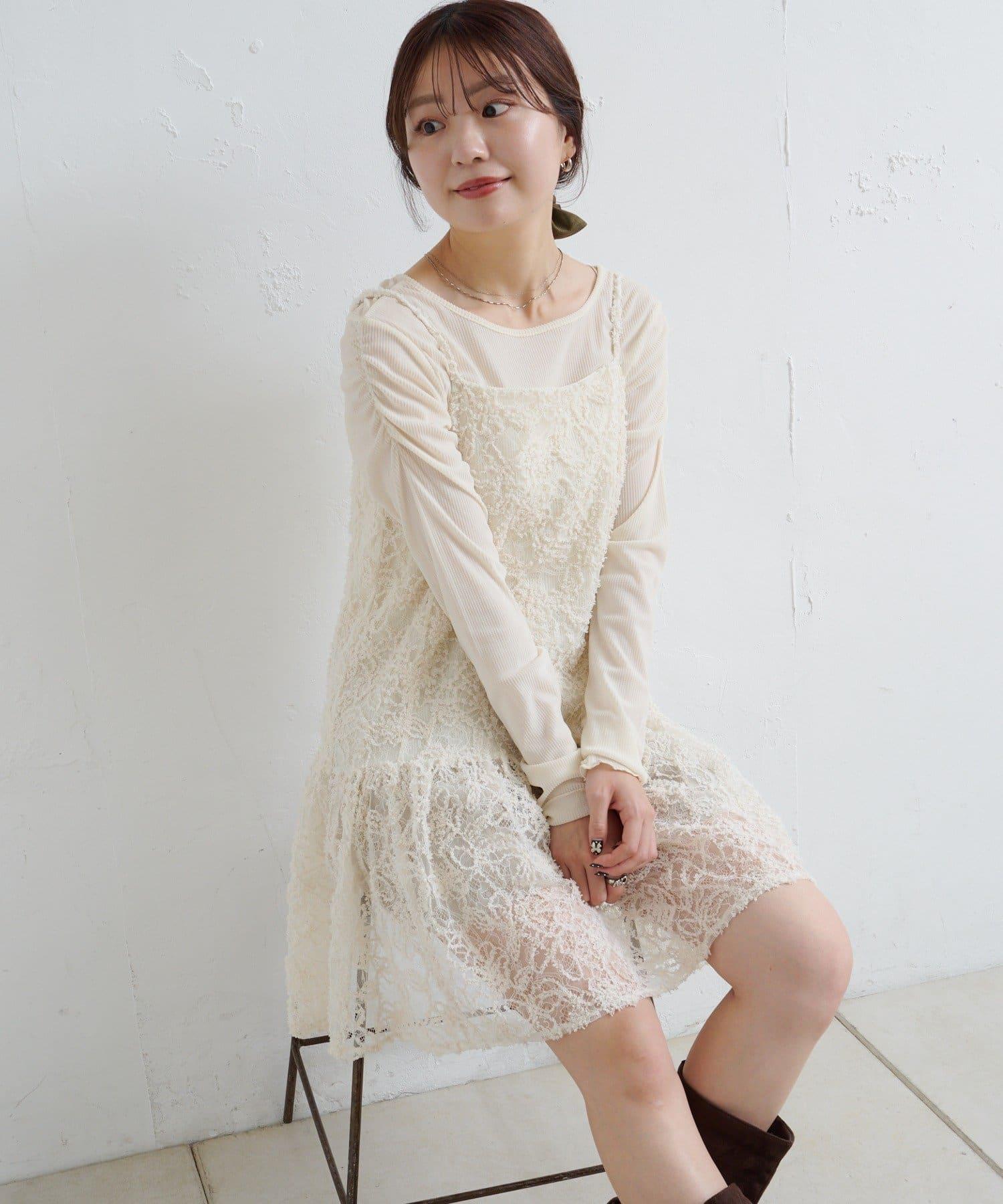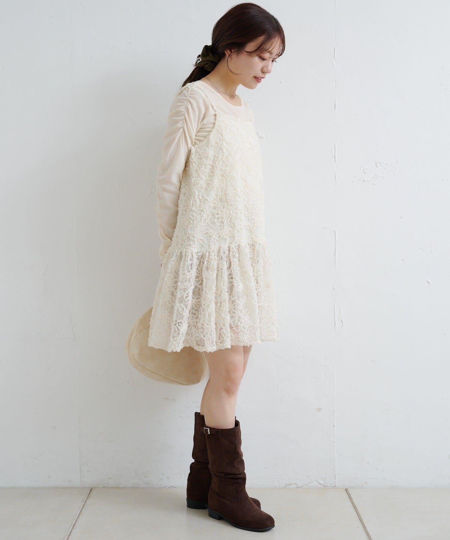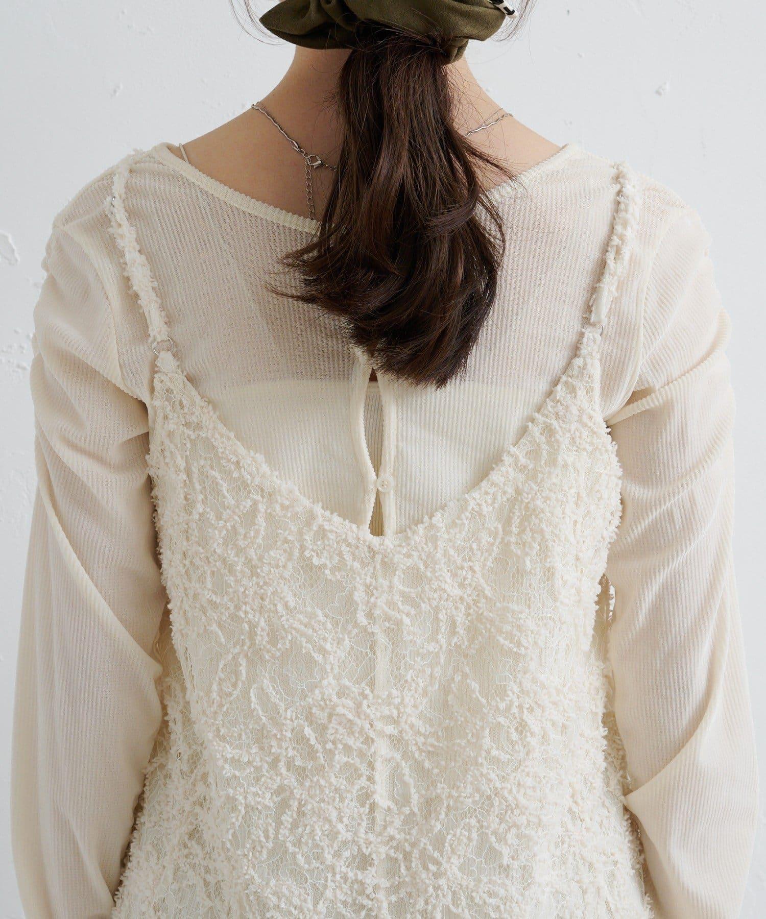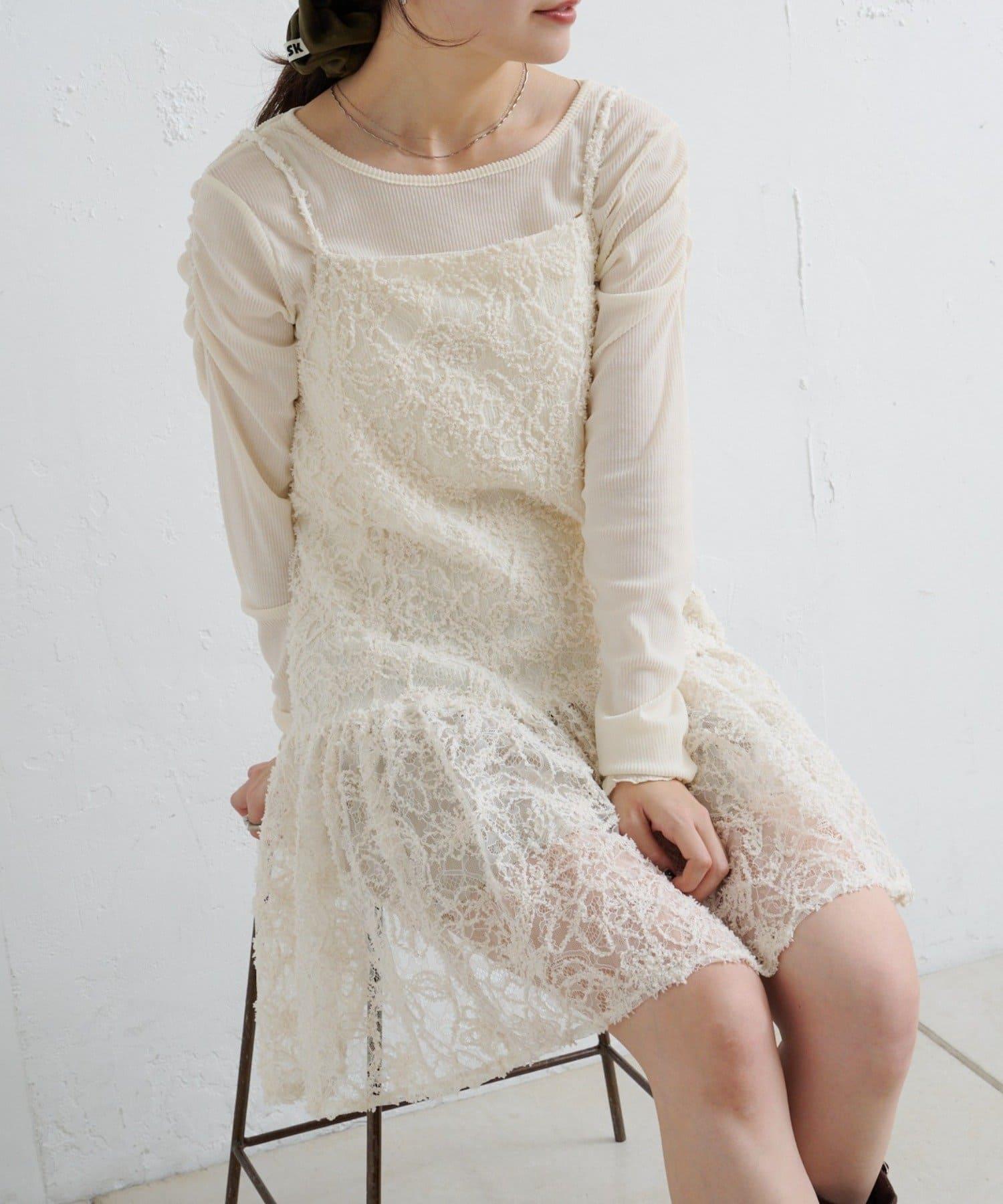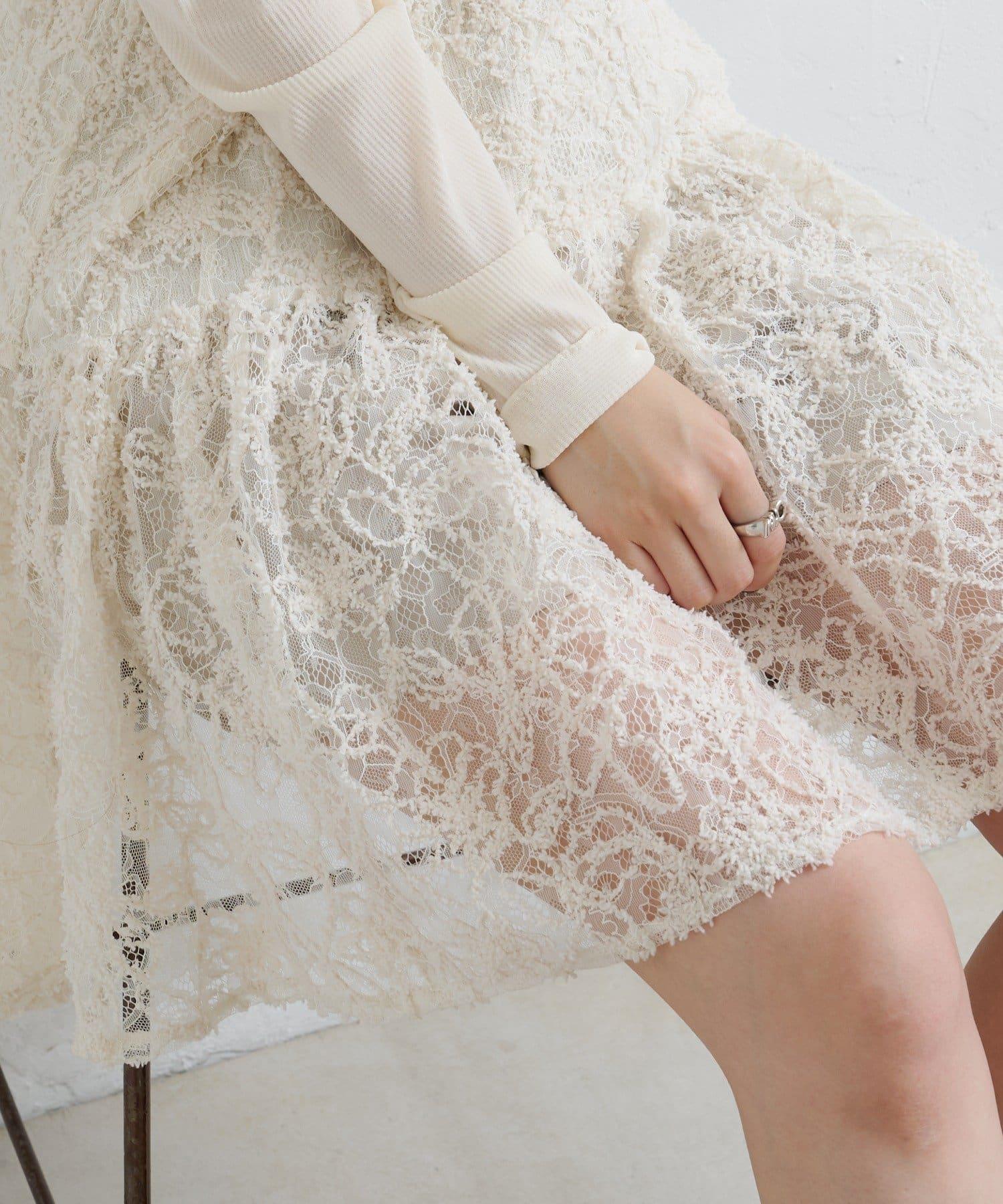 使用了精緻的蕾絲材料。如果與粗糙的表面摩擦,或被包、皮帶或尖銳物品夾住,蕾絲的縷線很容易浮起,可能會被割斷。請小心處理。