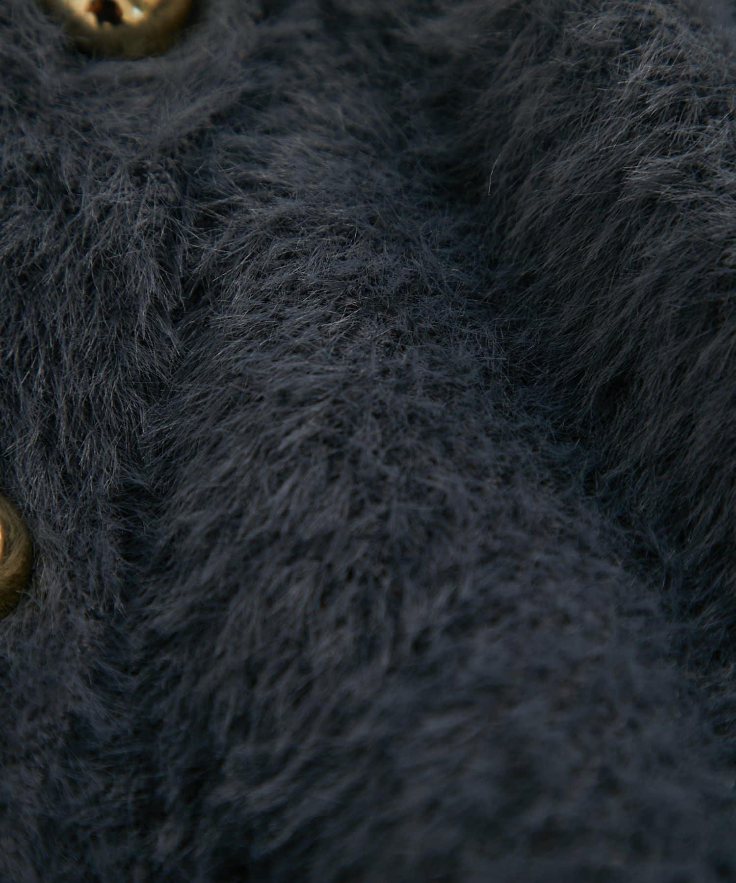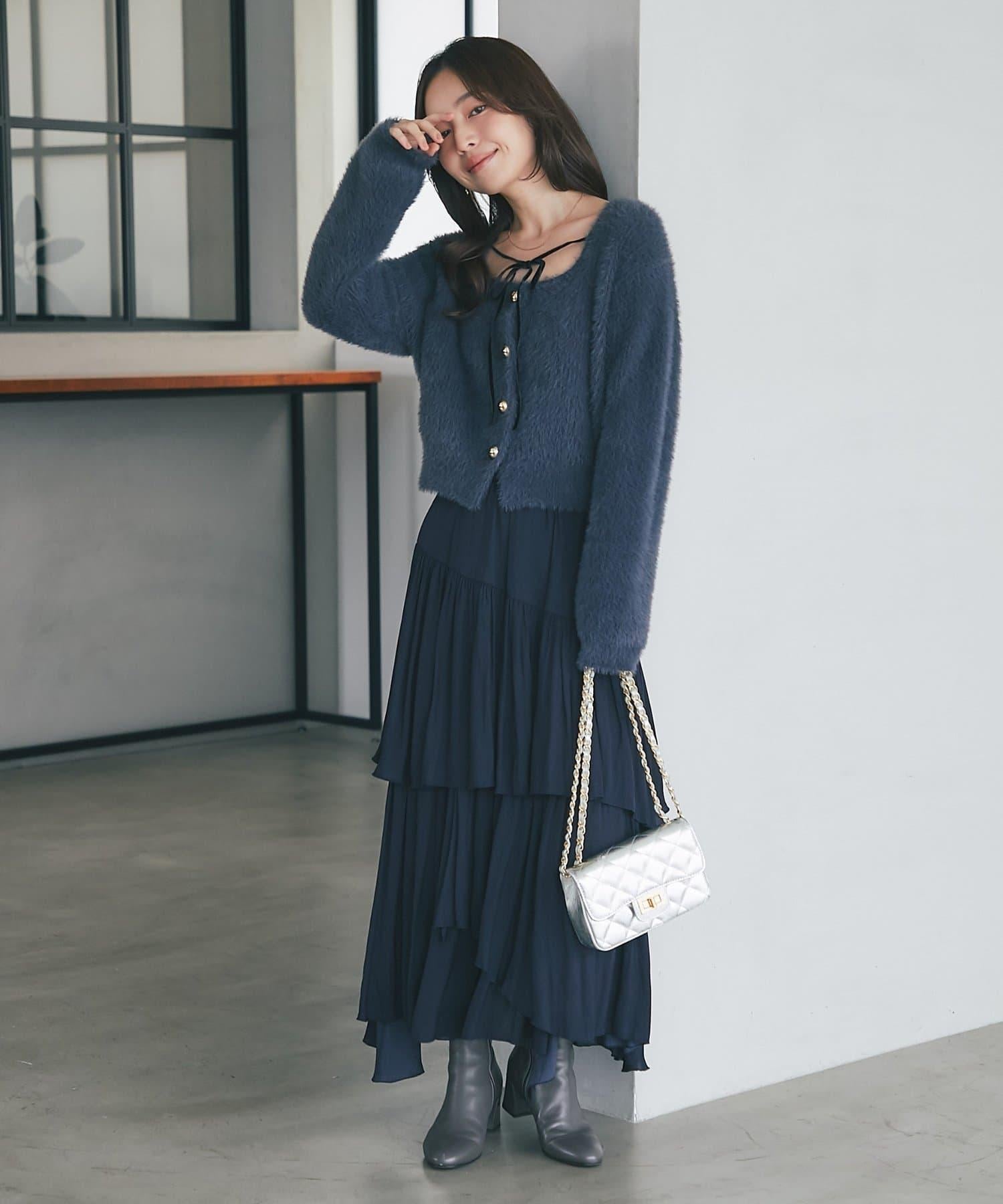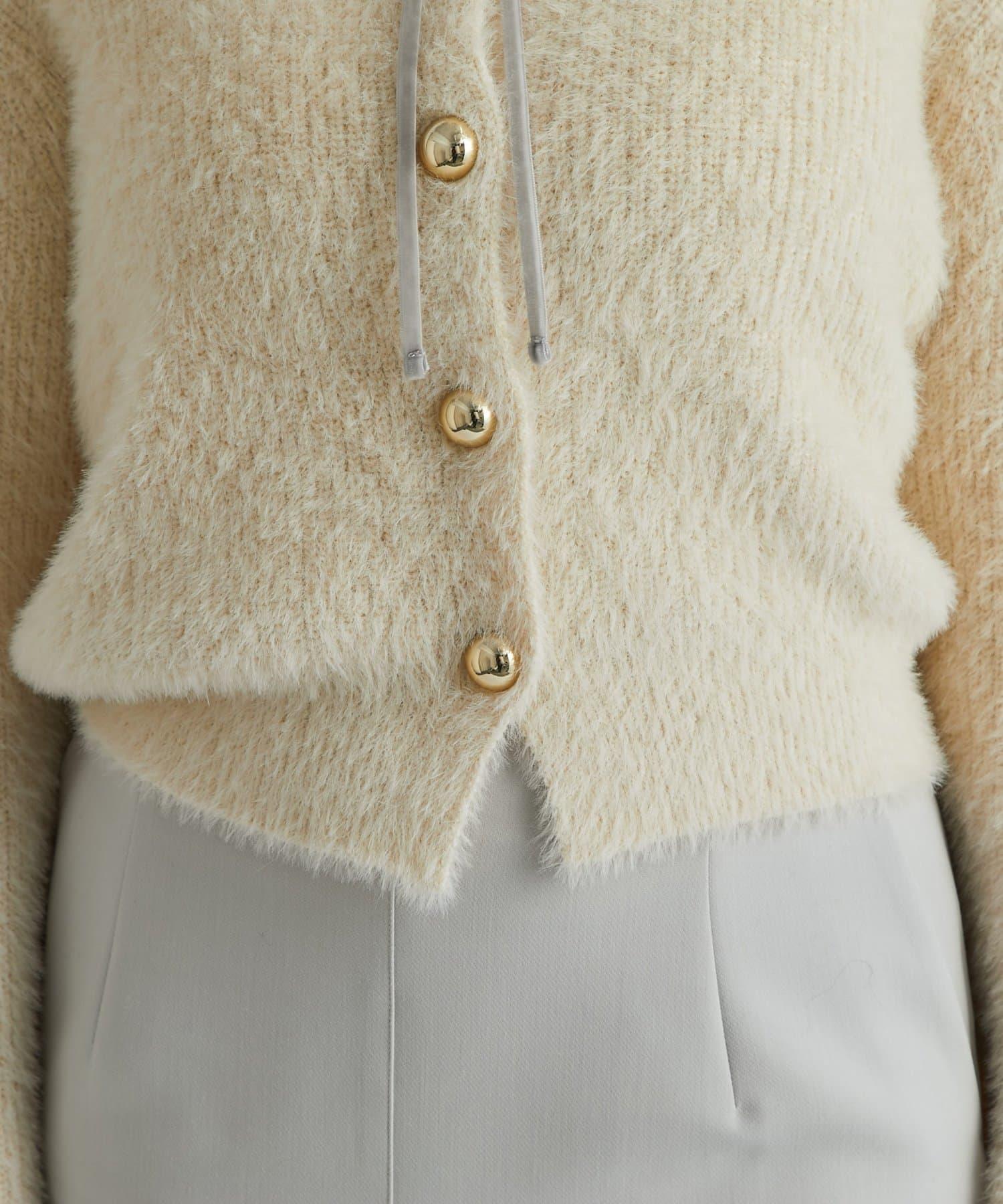 絲絨緞帶和圓形金色紐扣增添了女性的柔美氣質。