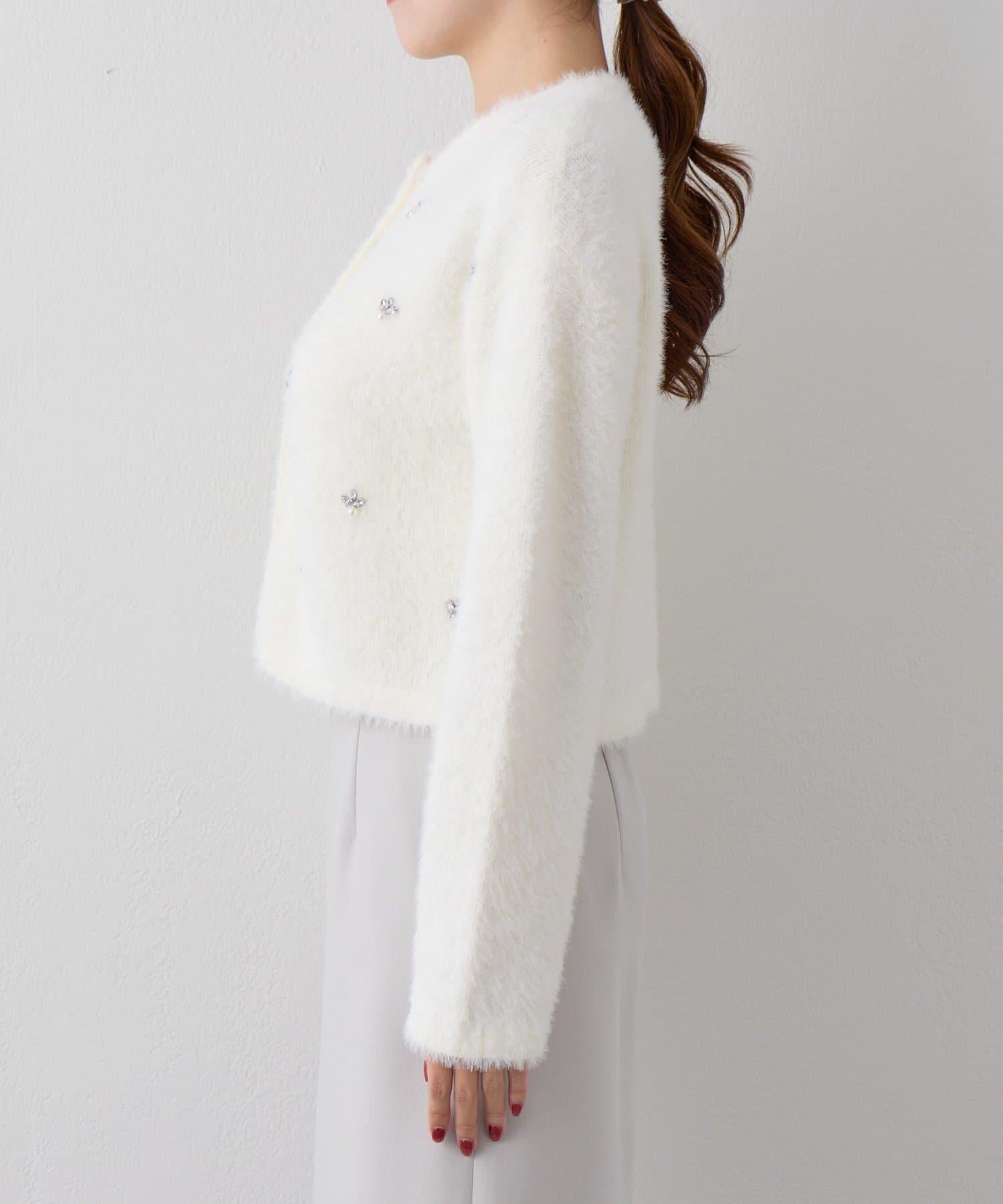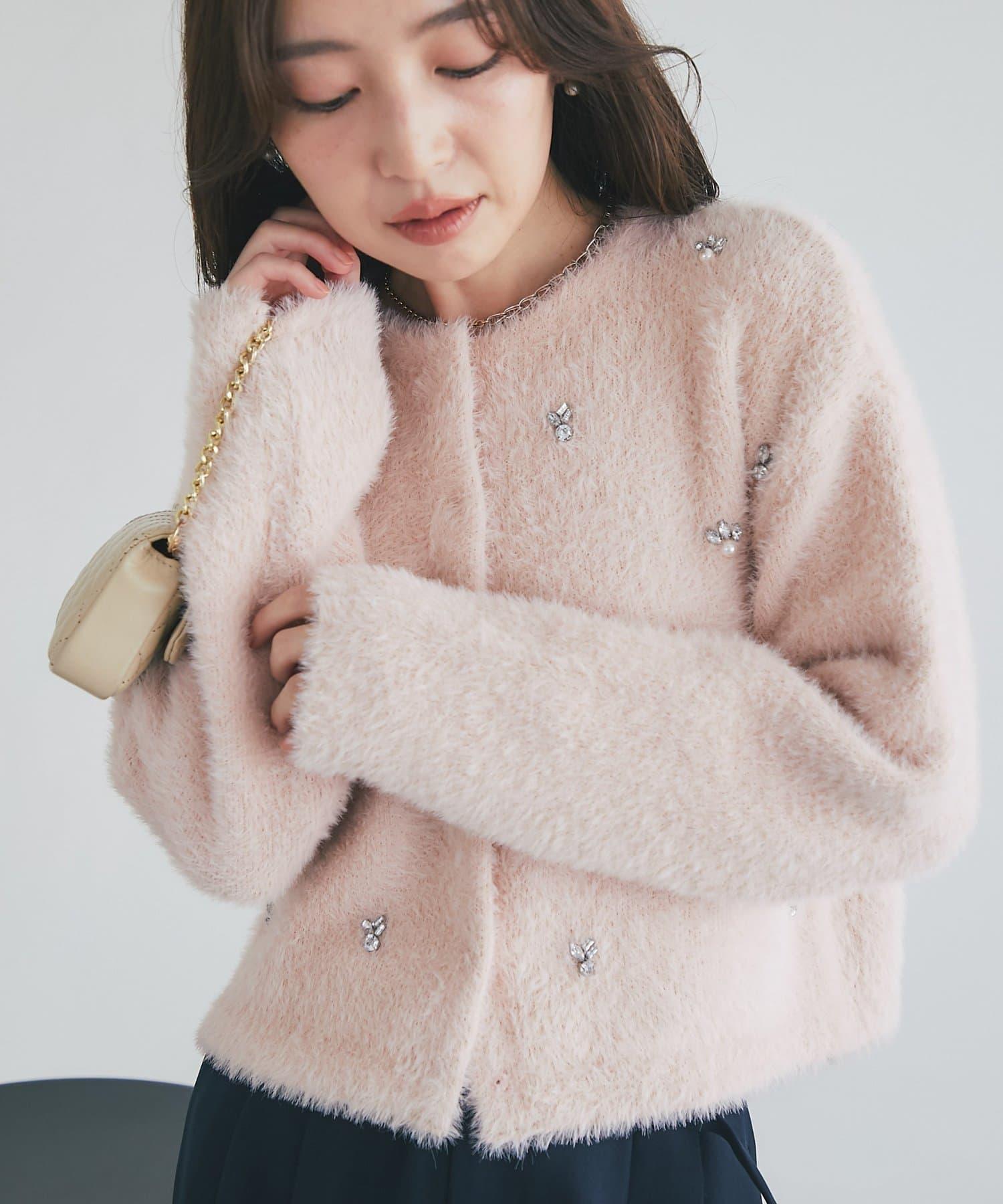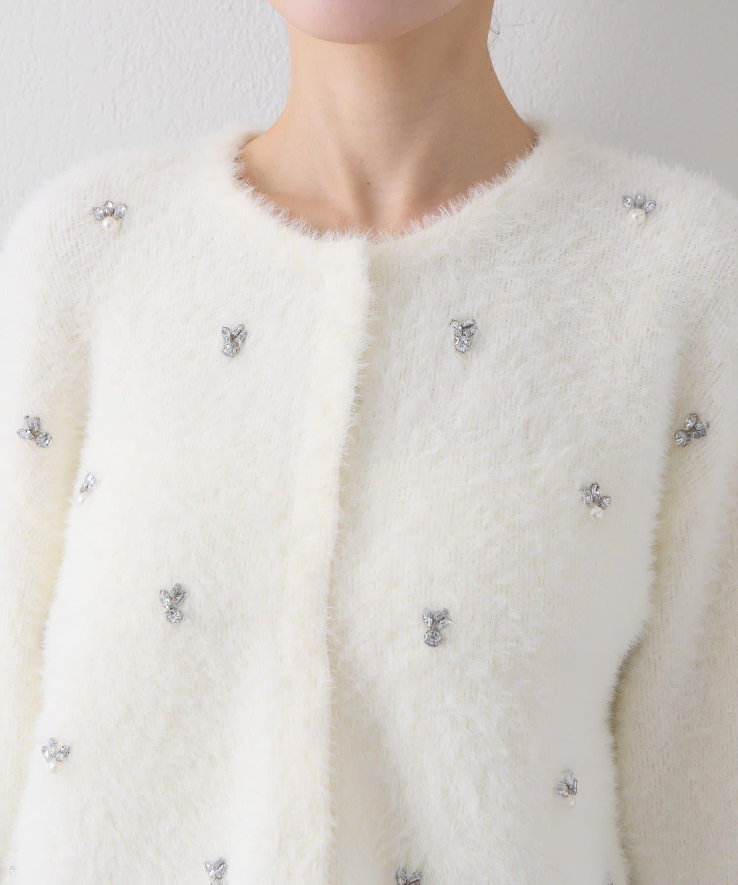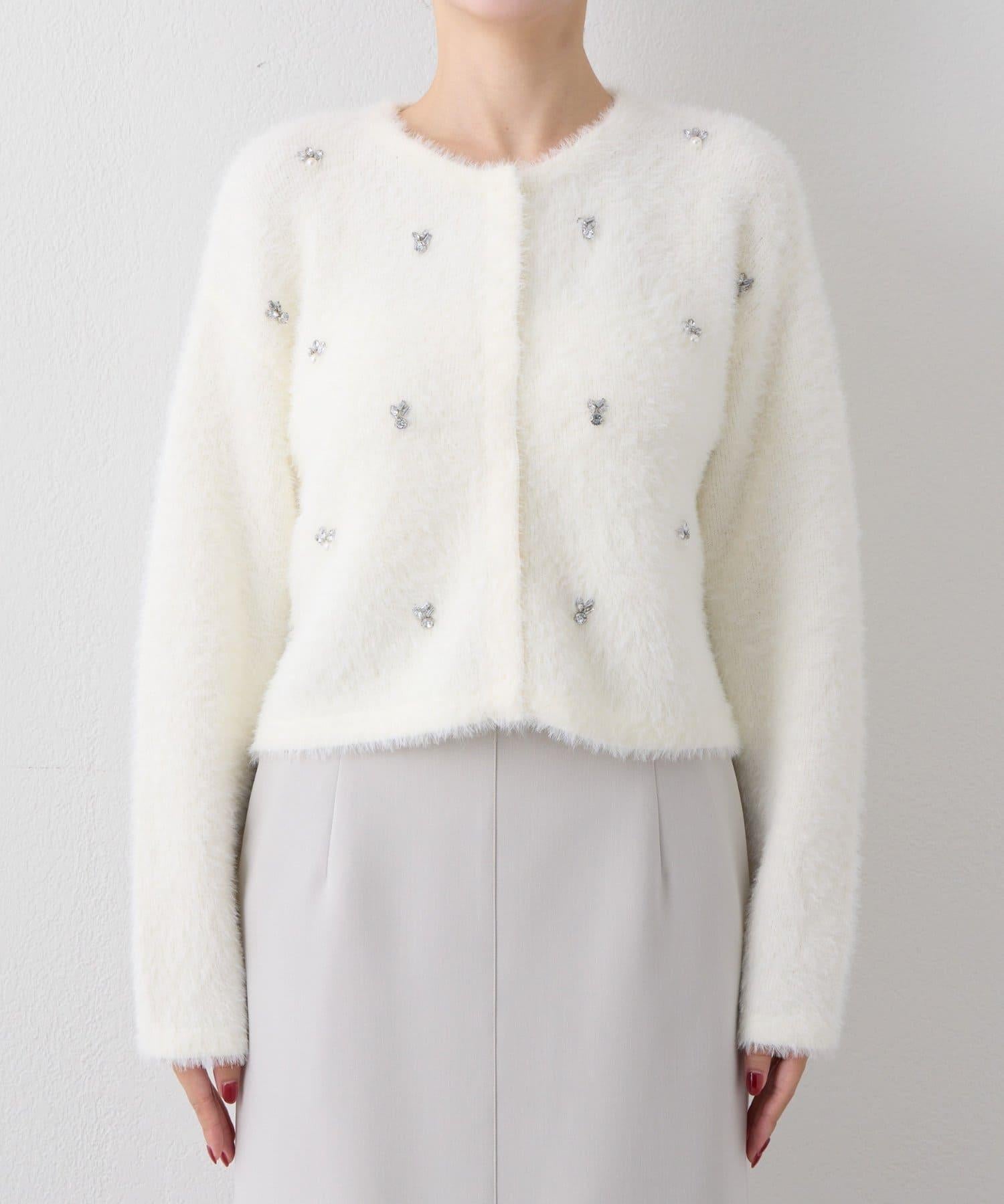毛絨絨針織開衫,繡有寶石和珍珠。