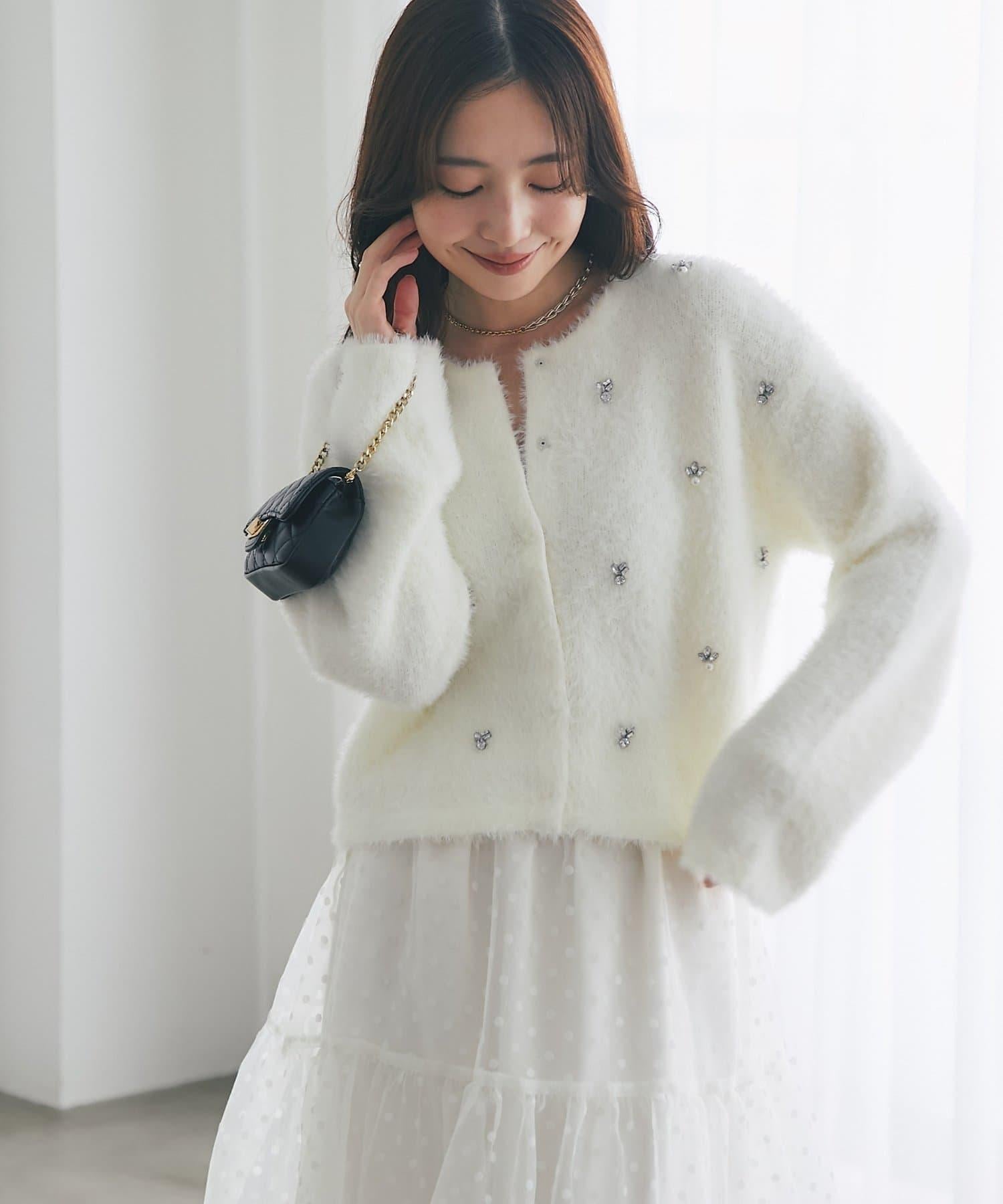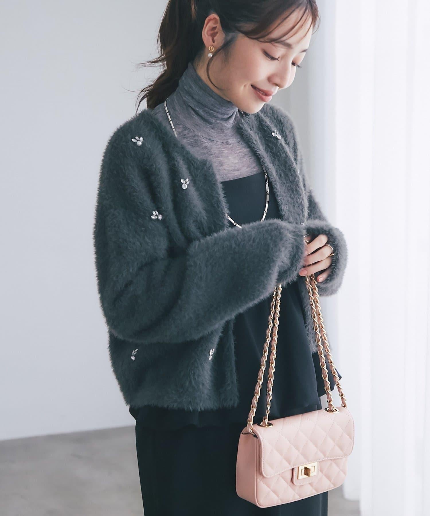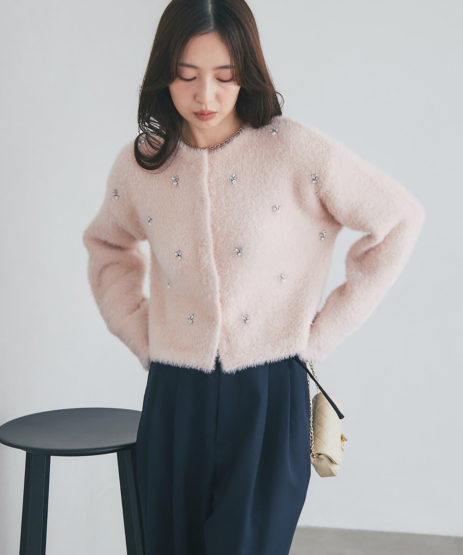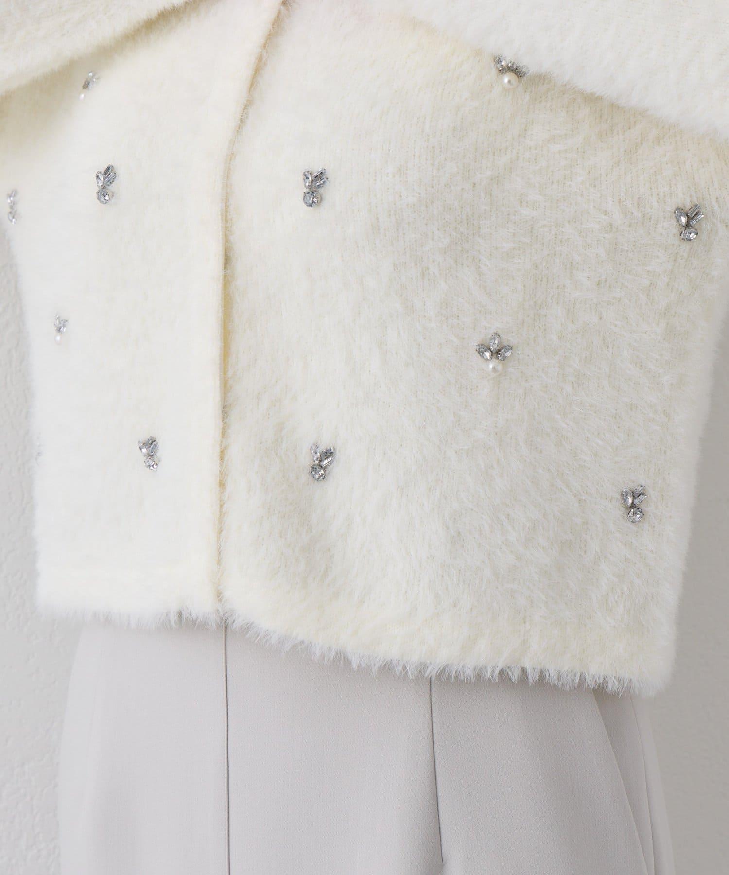 毛絨絨針織開衫,繡有寶石和珍珠。