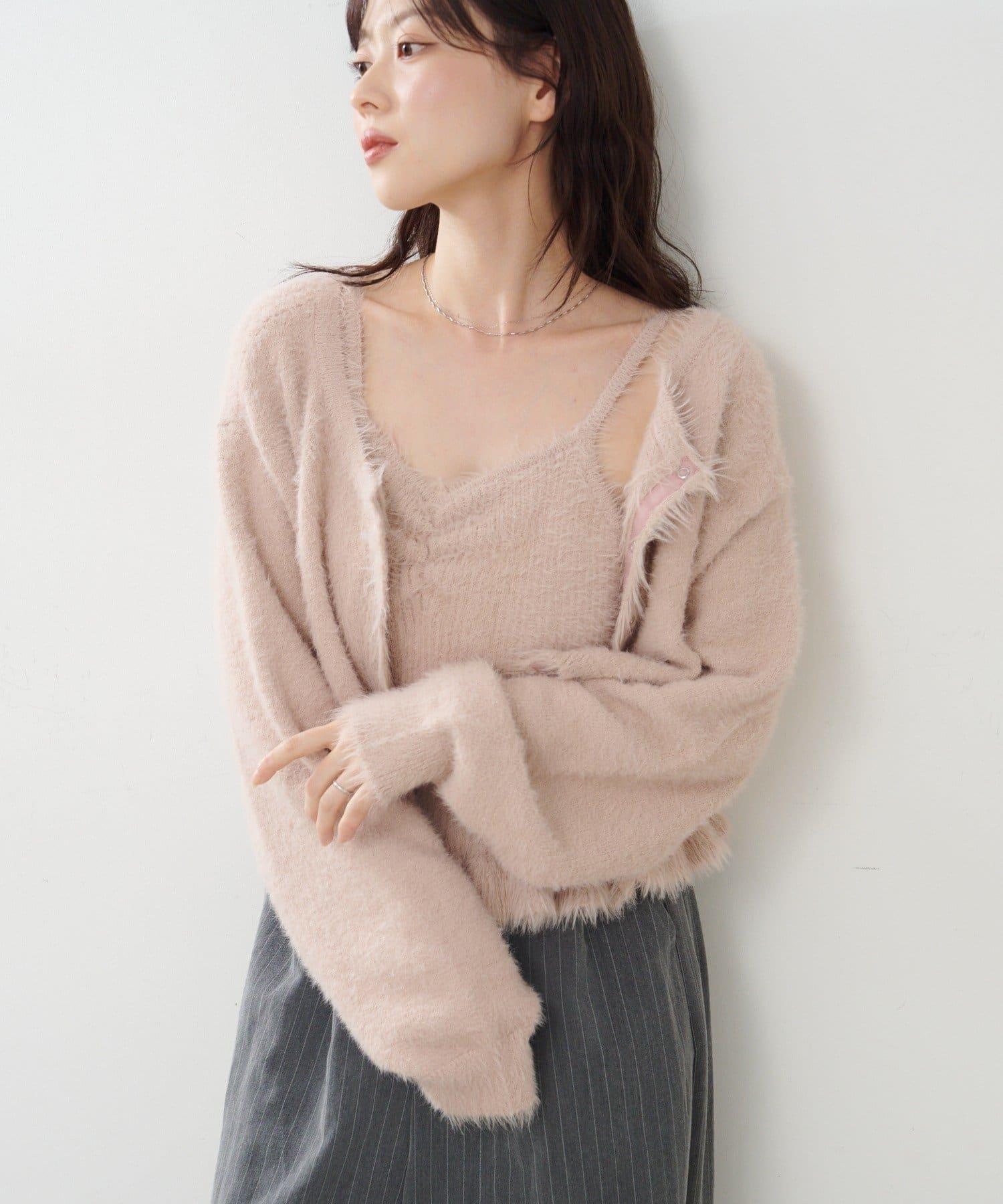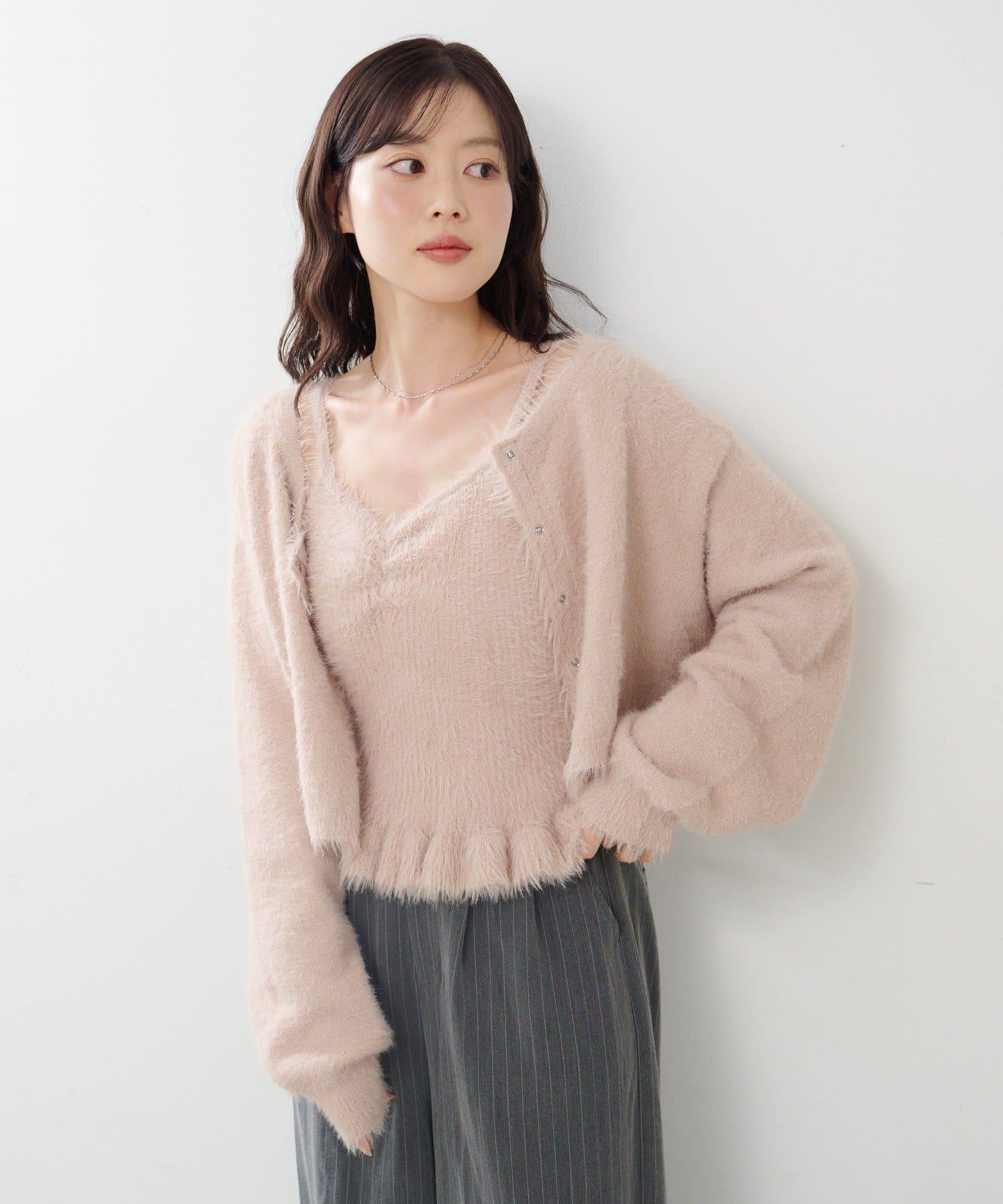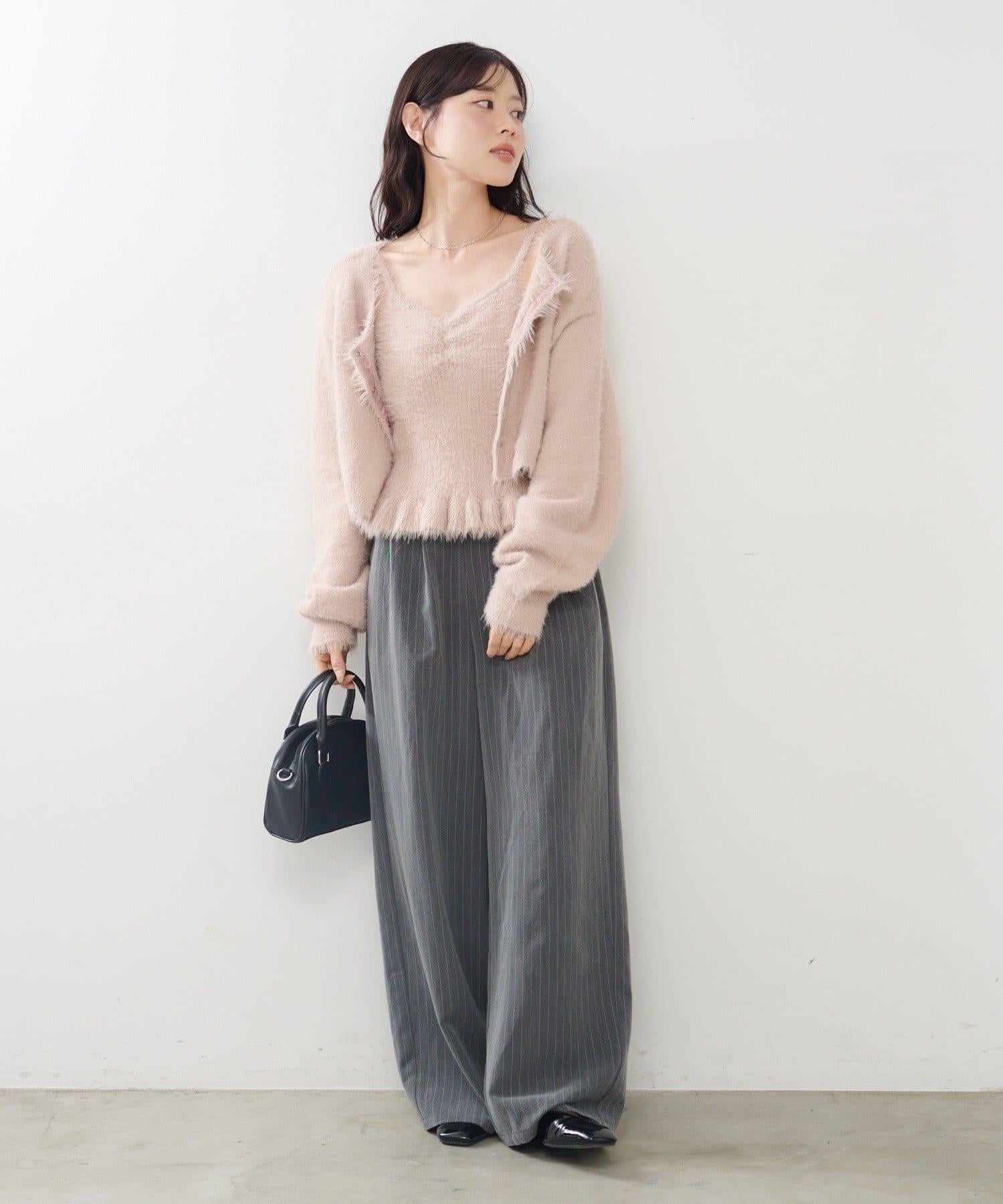 開衫和上衣為一套,雖然設計簡單,但下襬處的褶皺細節增強了適度女性化的外觀。