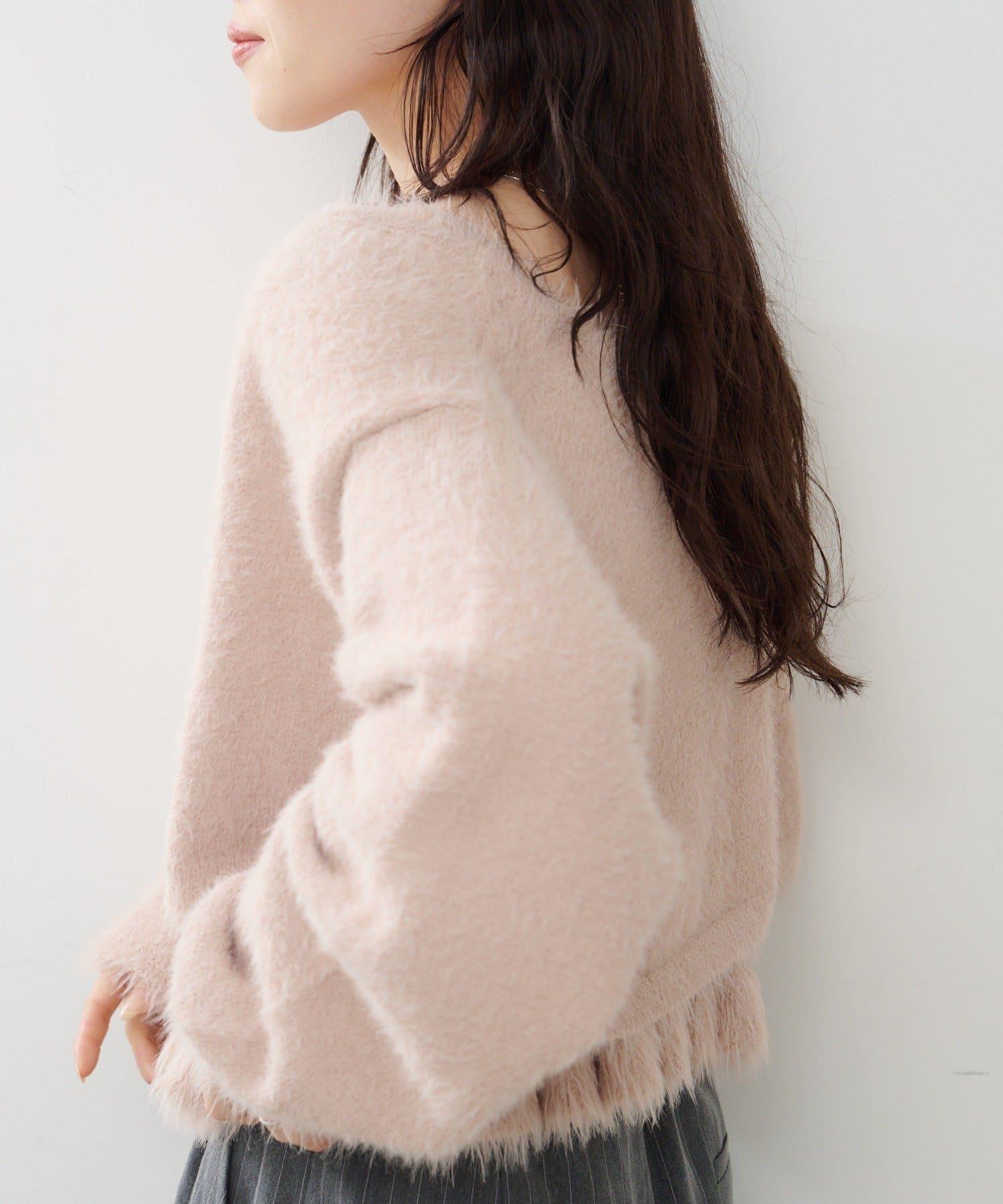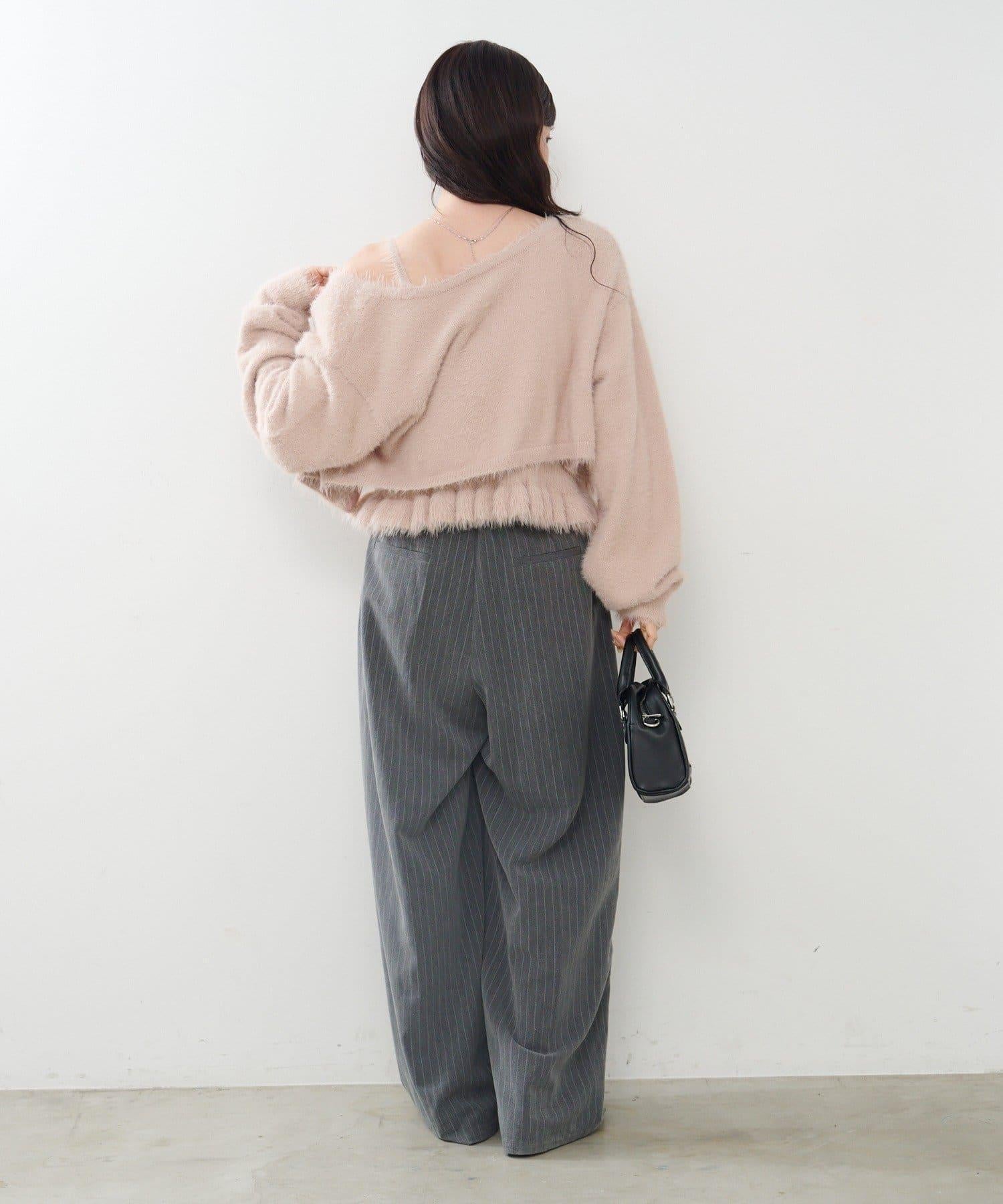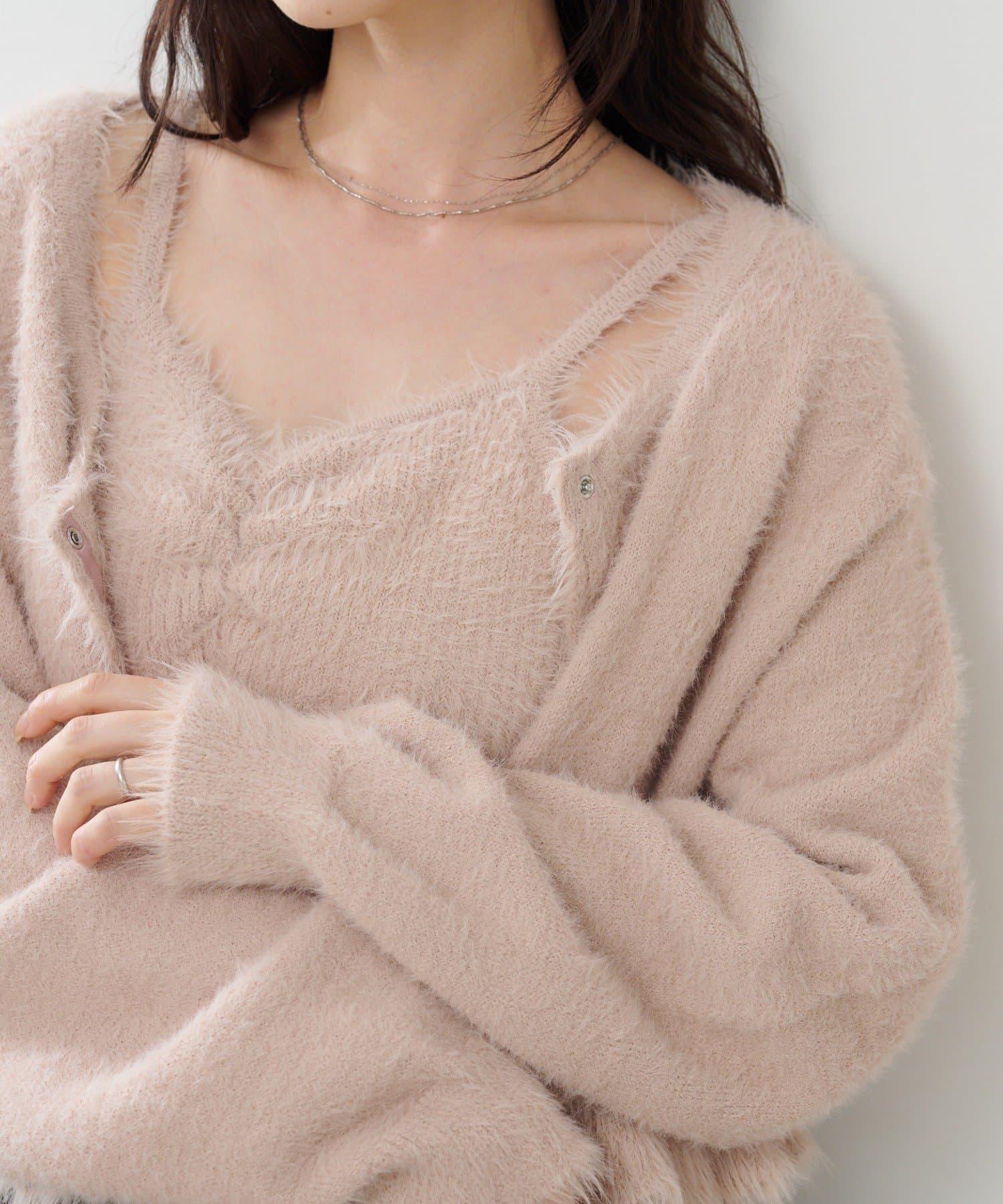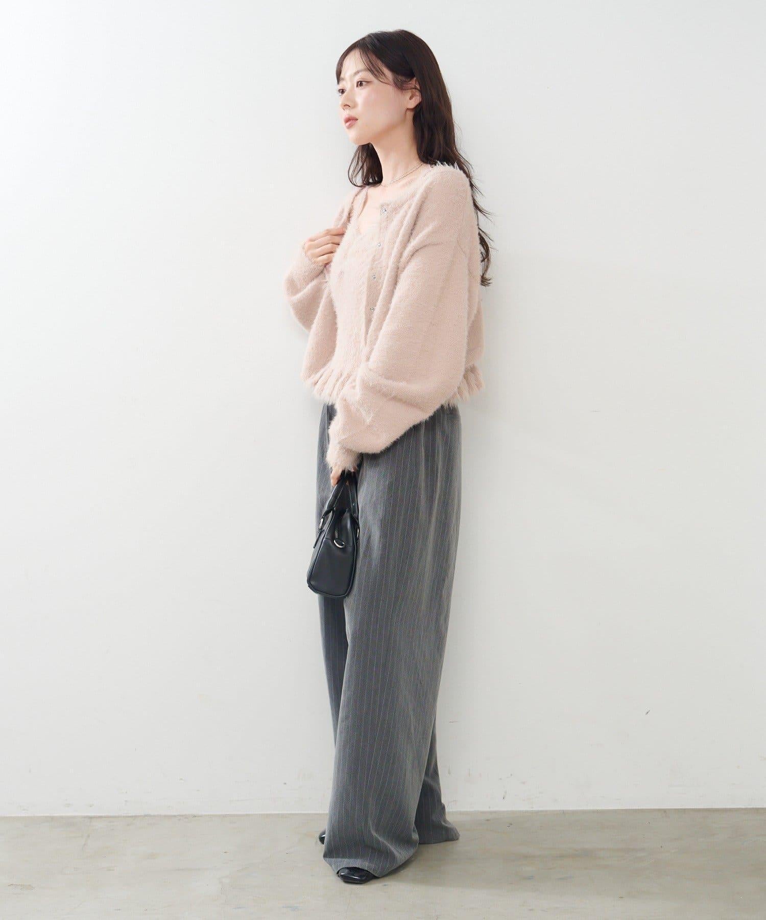 開衫和上衣為一套,雖然設計簡單,但下襬處的褶皺細節增強了適度女性化的外觀。