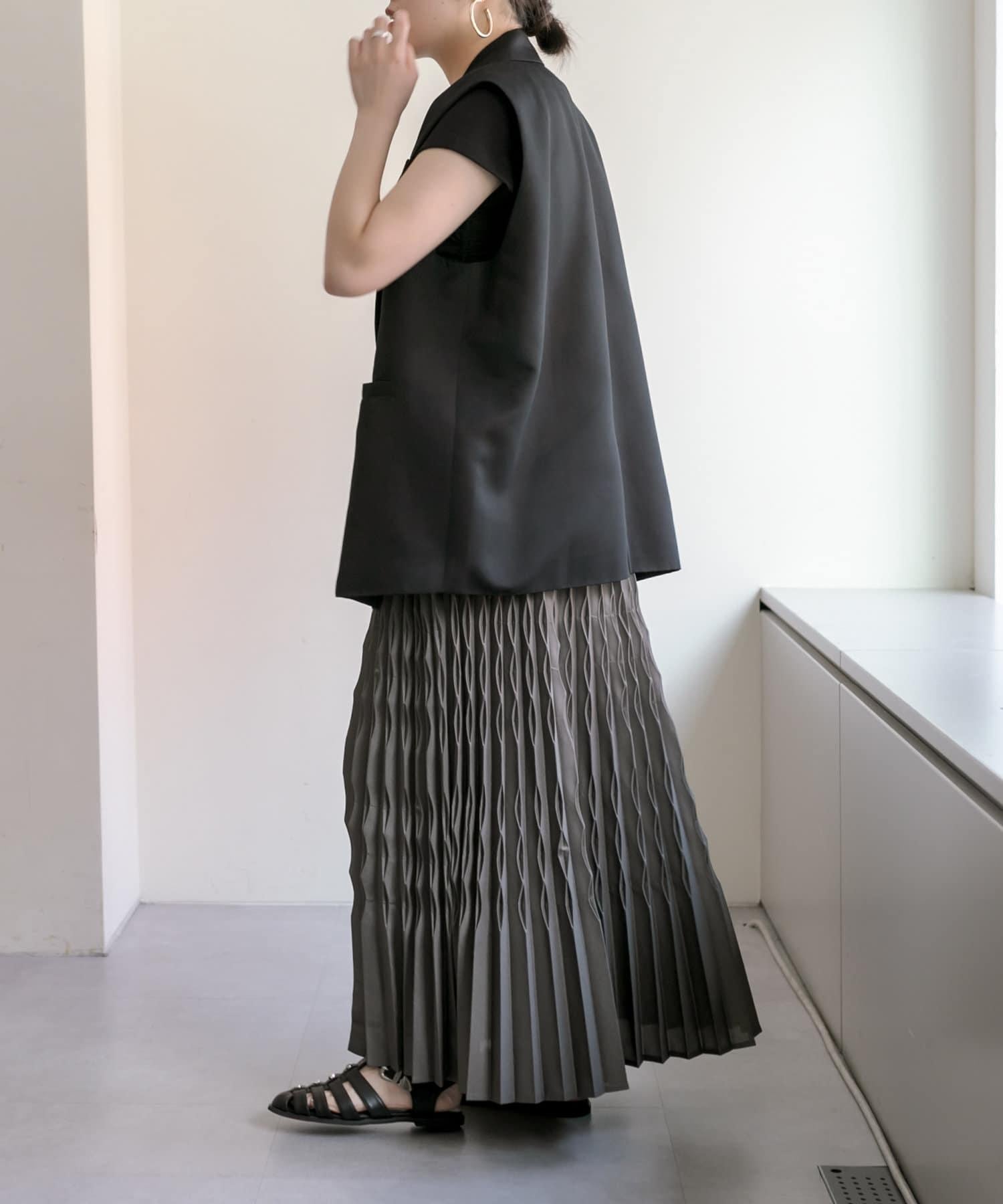 垂直線的褶皺起到了修身的效果,提升了時尚感。