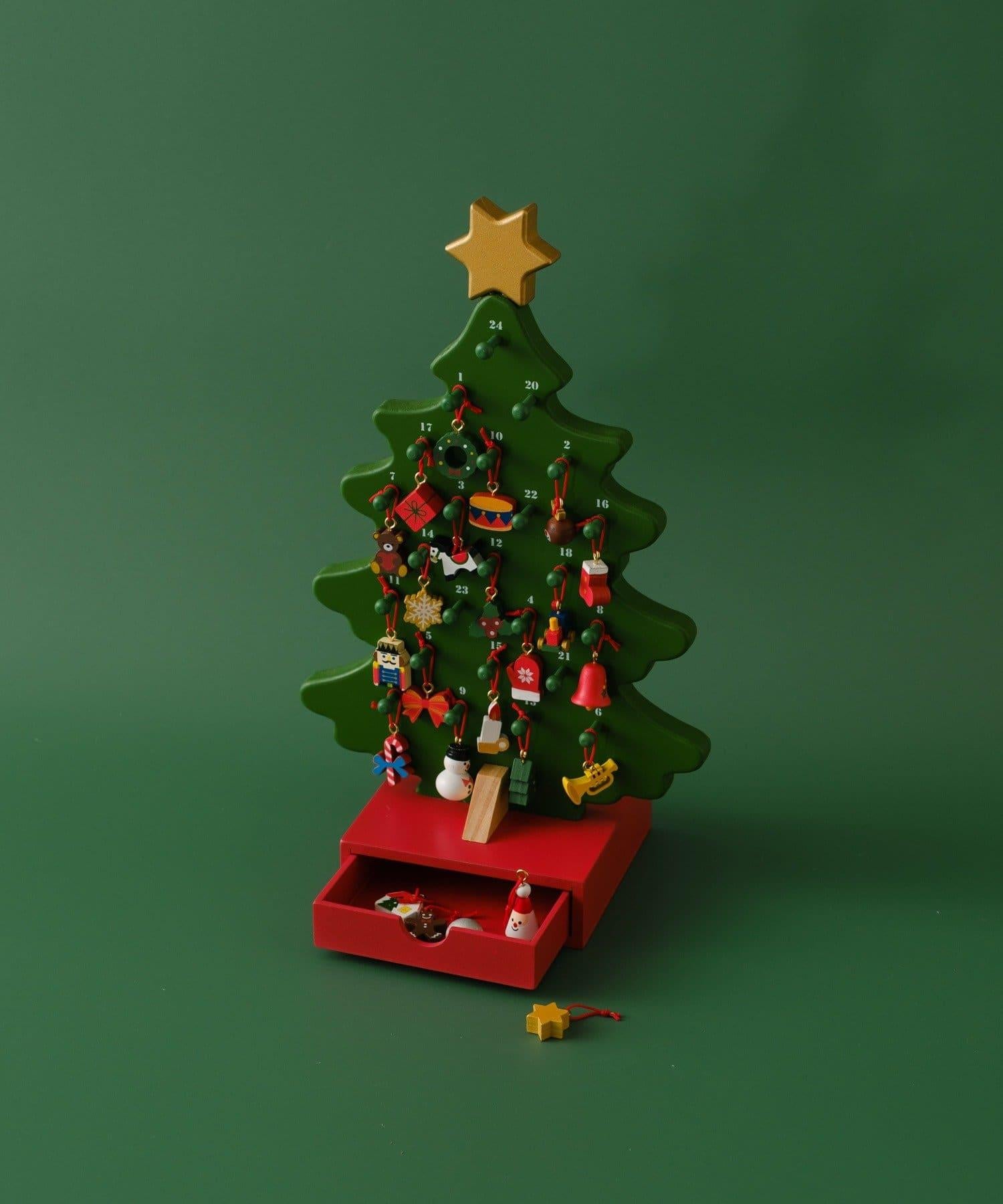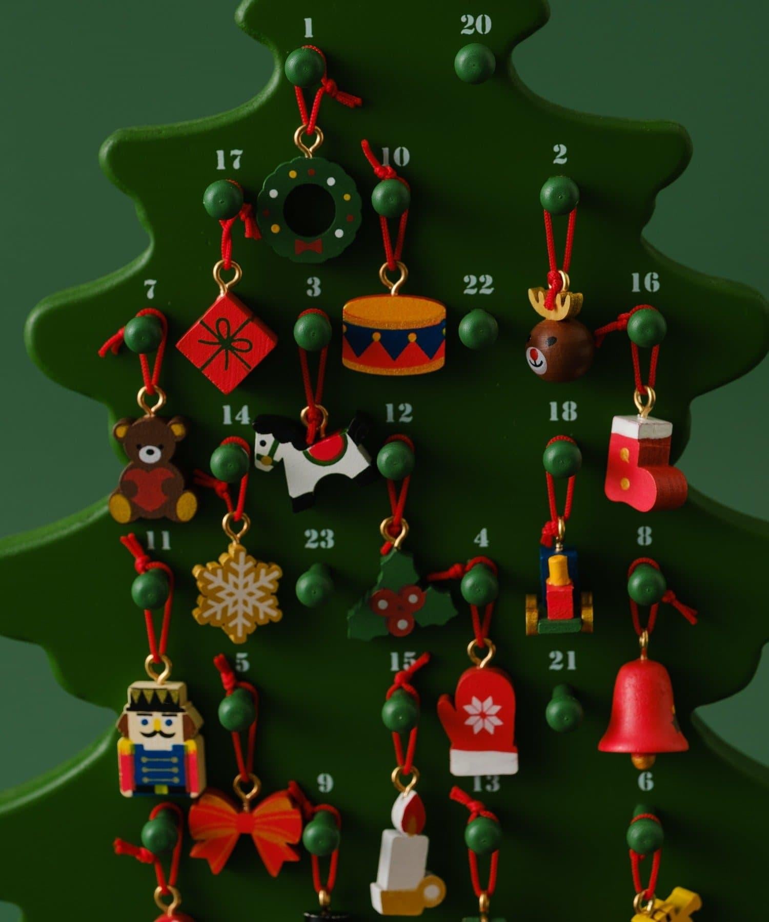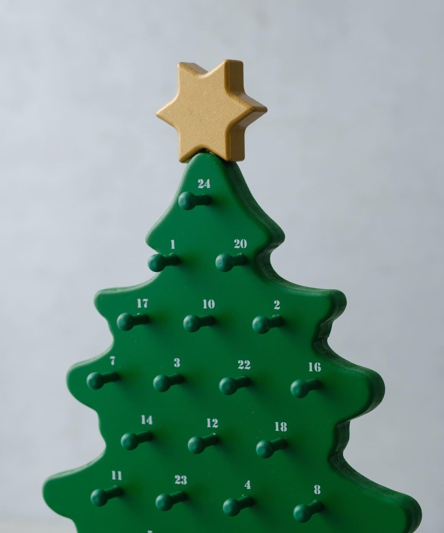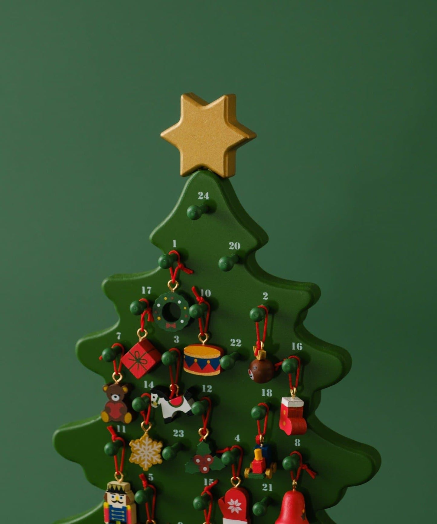 聖誕樹以亮綠色裝飾,上面印有 "1 至 24 "的數字,每天可將一個小飾品掛在掛鉤上進行裝飾。
