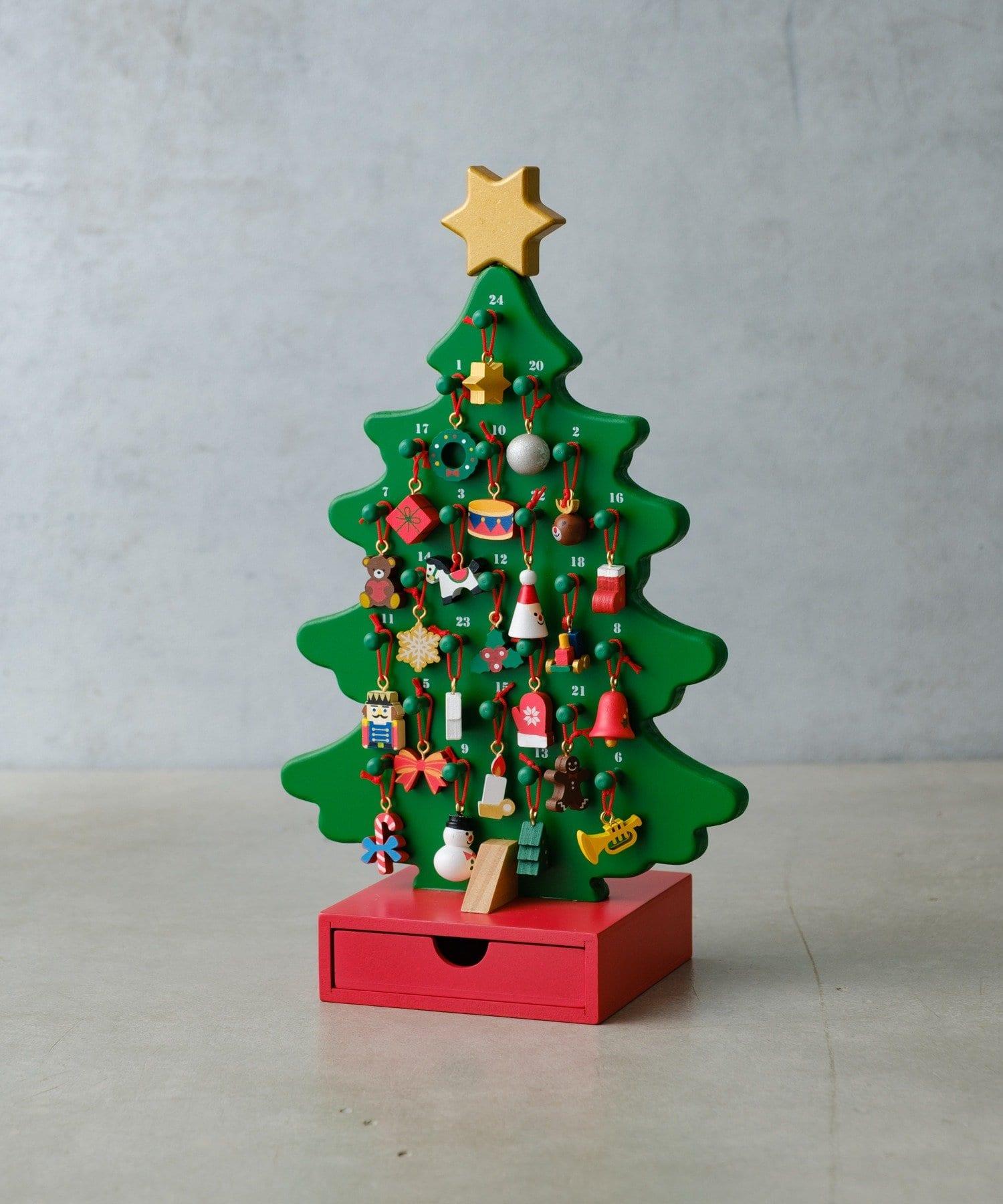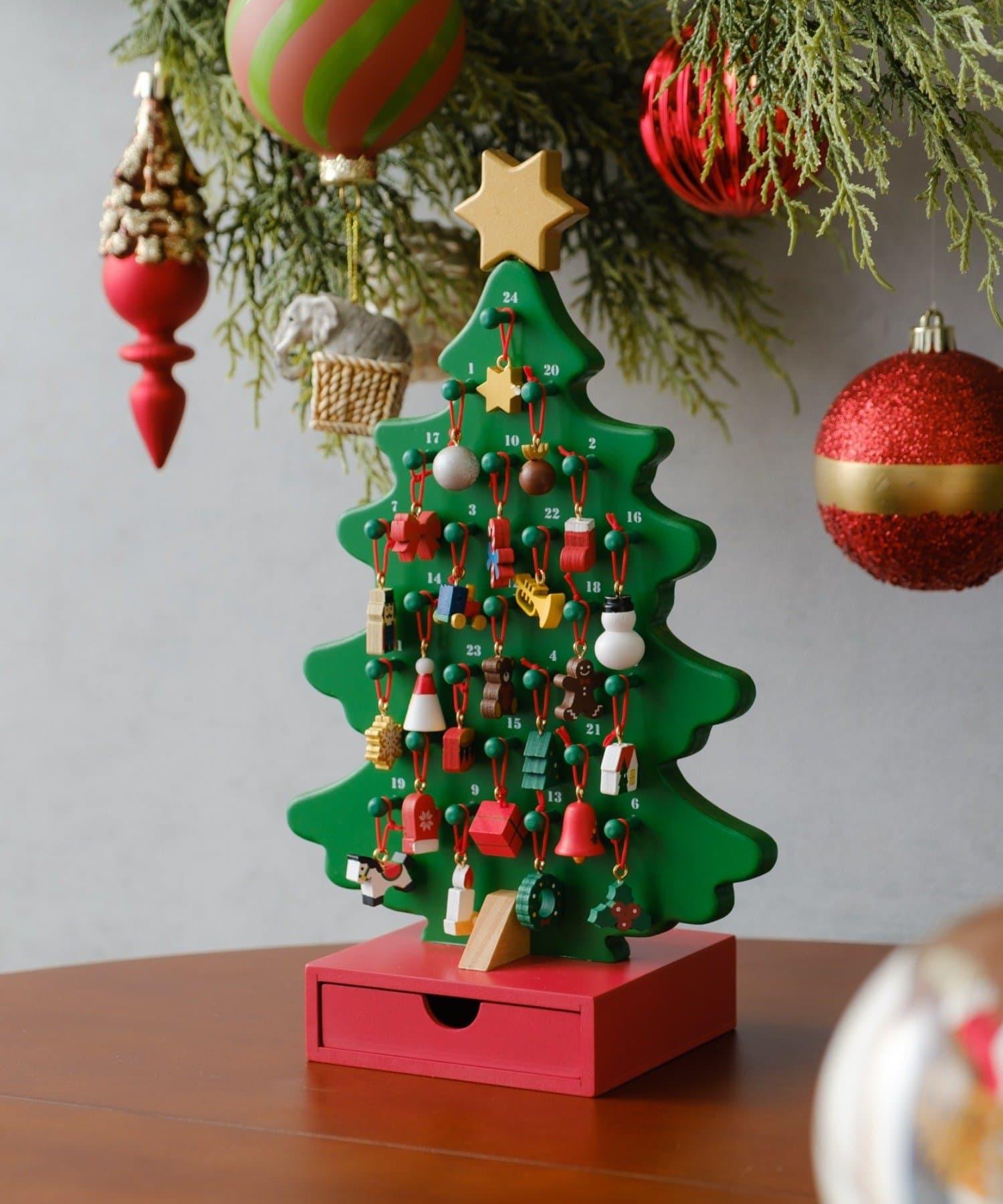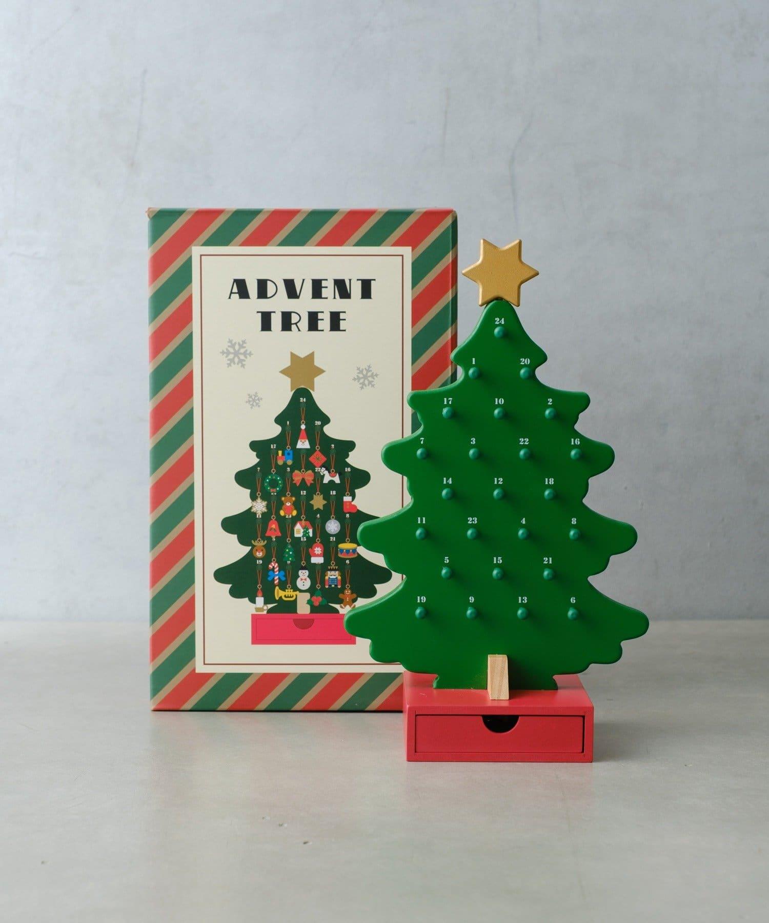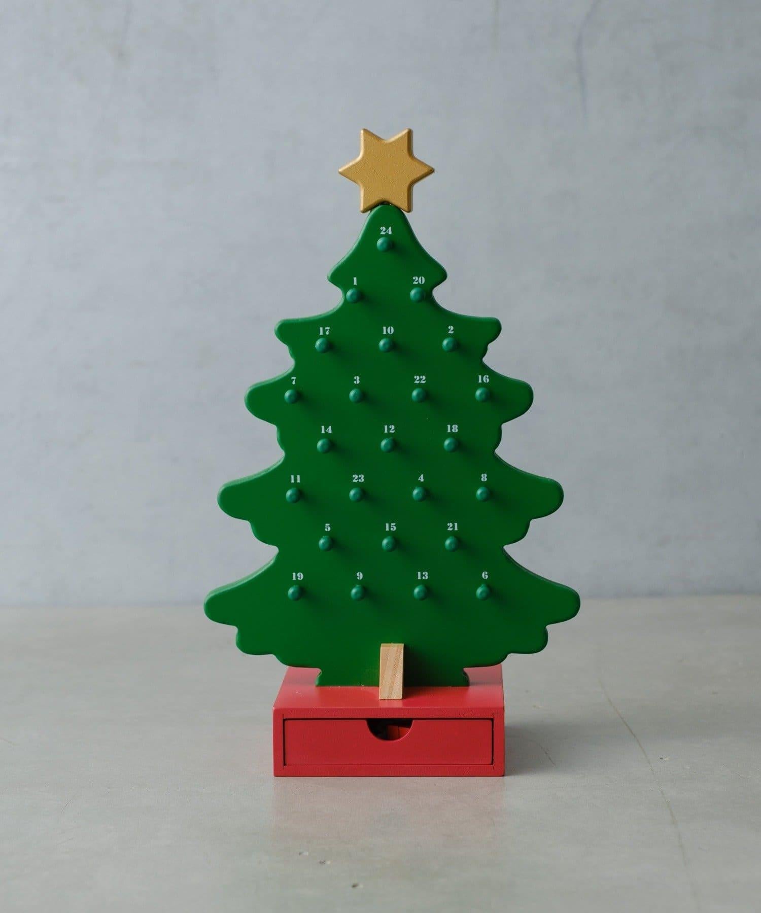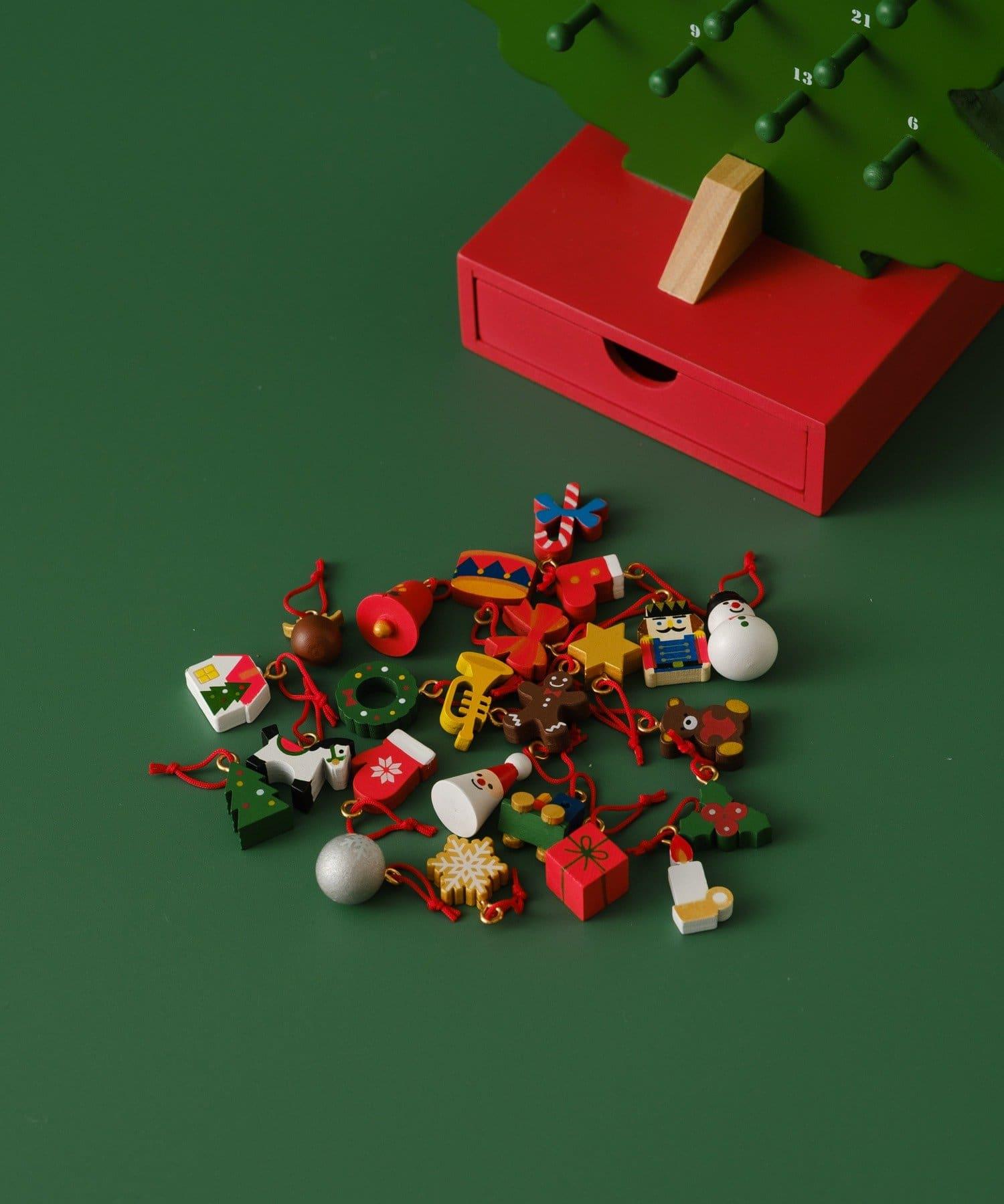 聖誕樹以亮綠色裝飾,上面印有 "1 至 24 "的數字,每天可將一個小飾品掛在掛鉤上進行裝飾。