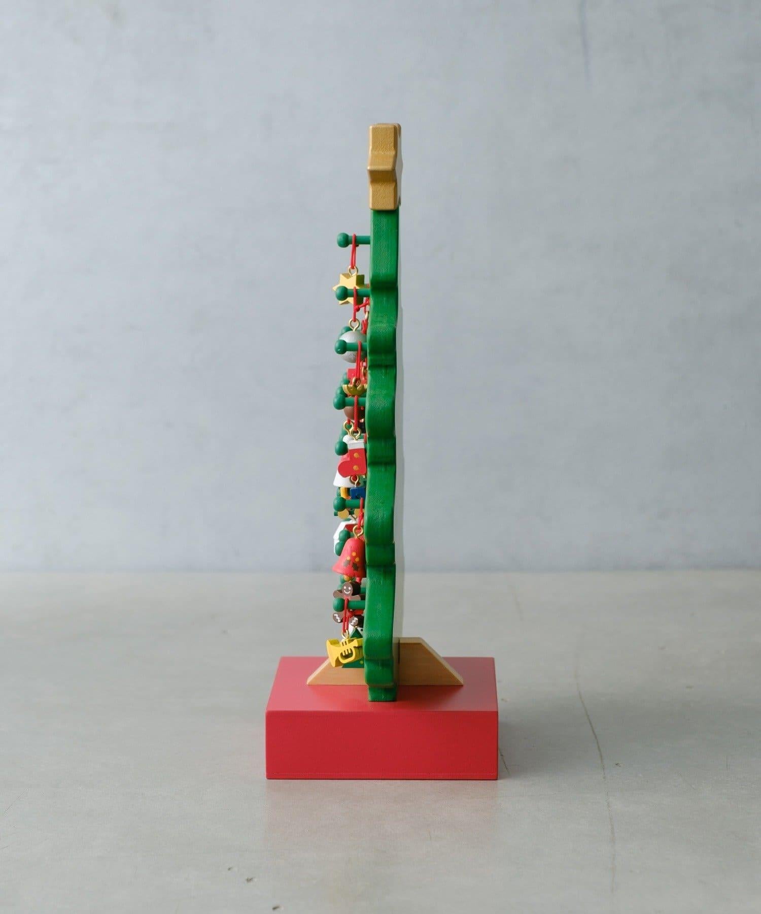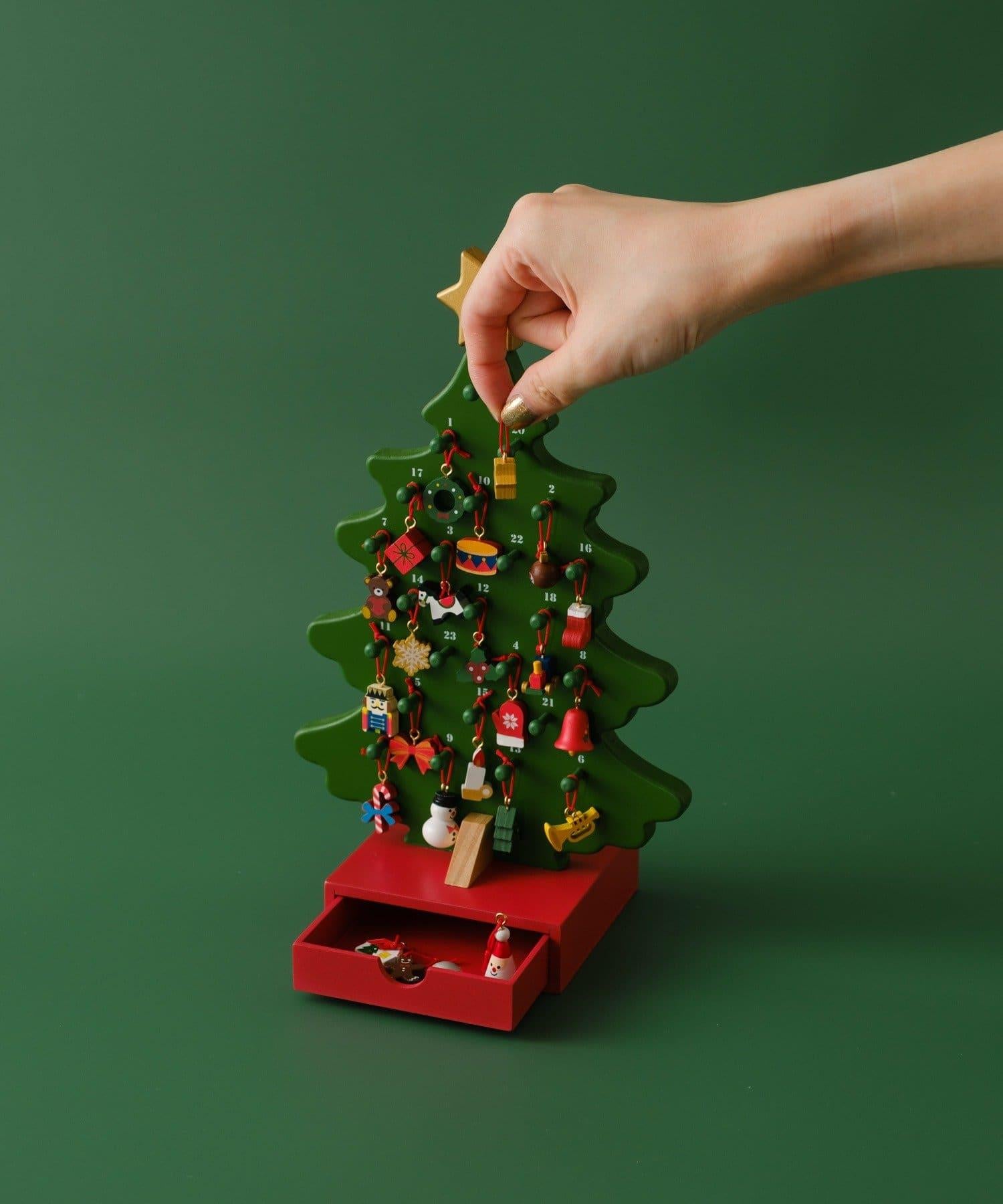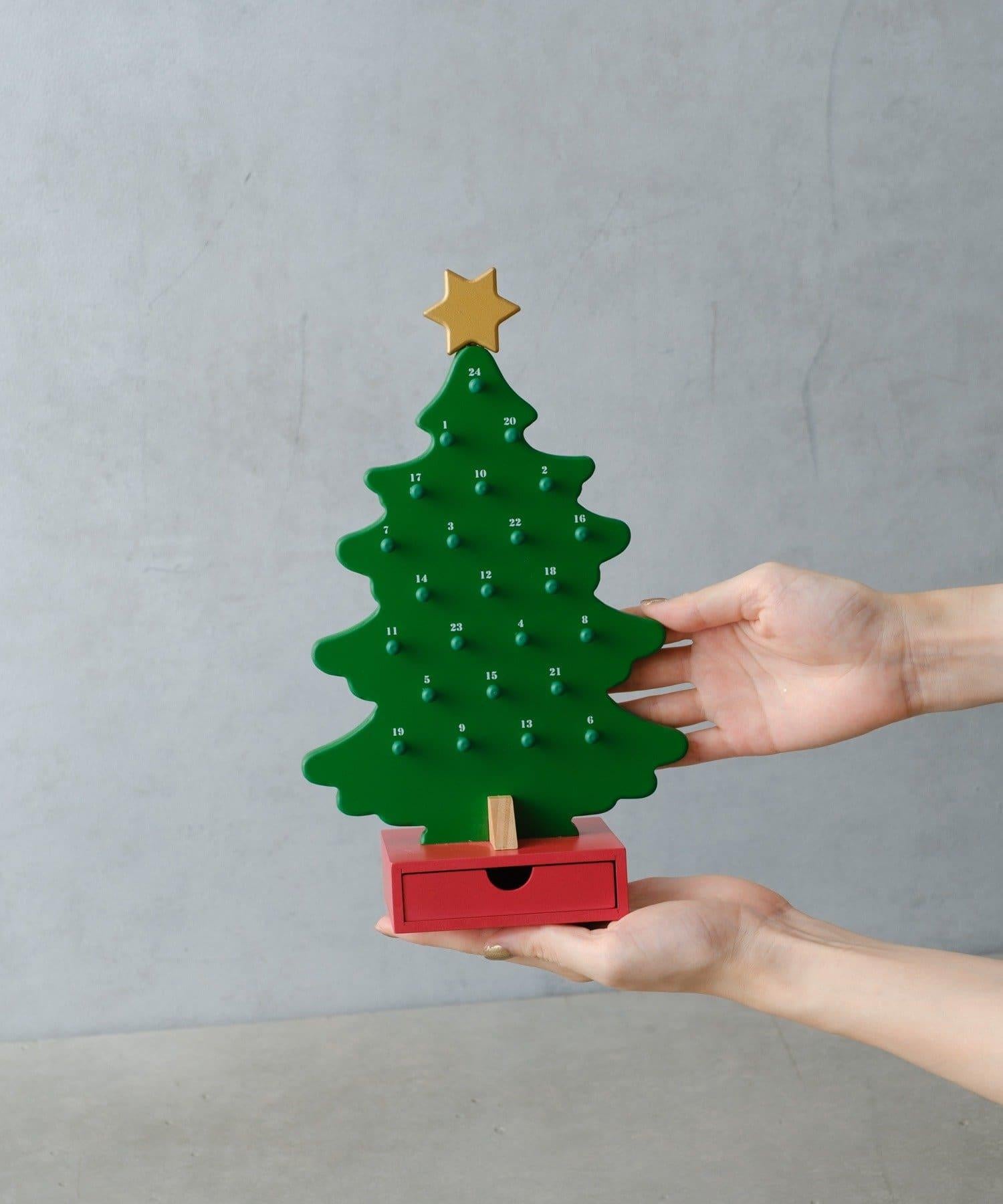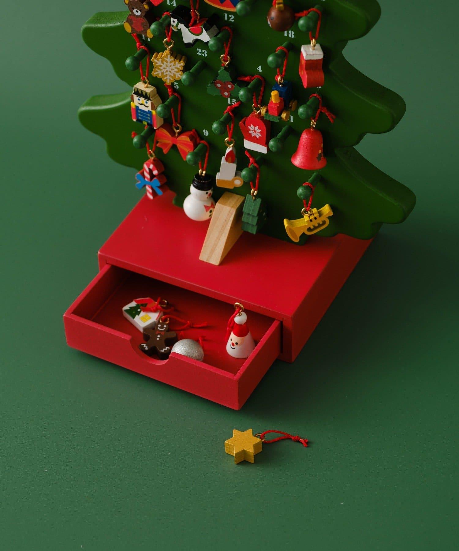聖誕樹以亮綠色裝飾,上面印有 "1 至 24 "的數字,每天可將一個小飾品掛在掛鉤上進行裝飾。