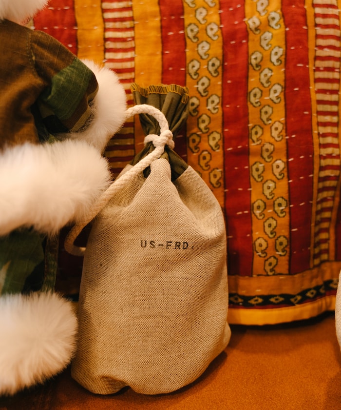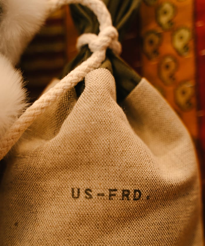 他背上的禮品袋是法國軍隊的亞麻床罩,上面刻有 Freada 縮寫 "FRD",就像軍用洗衣袋一樣。