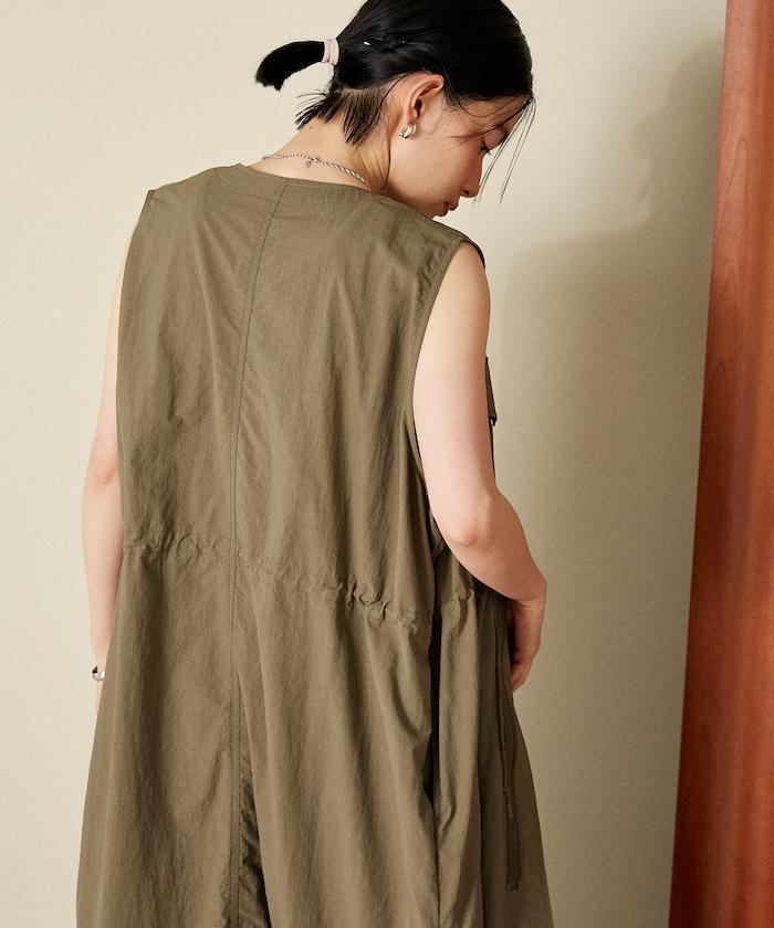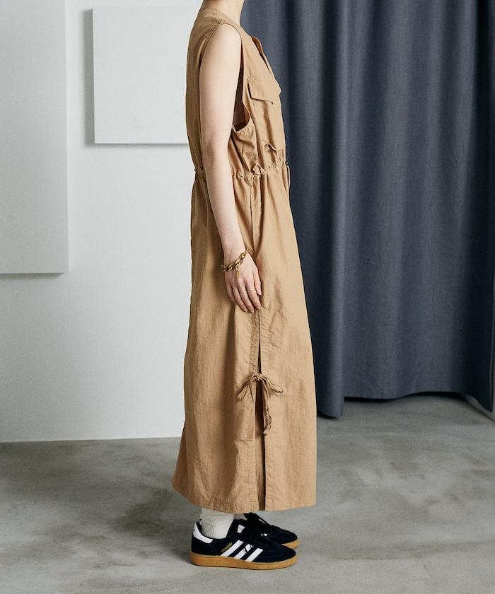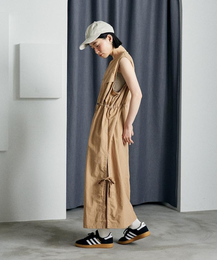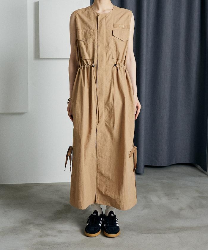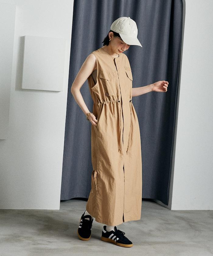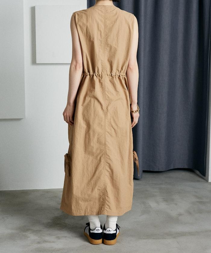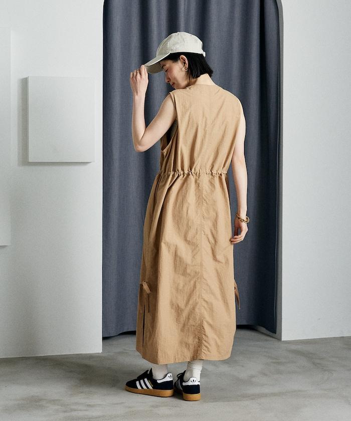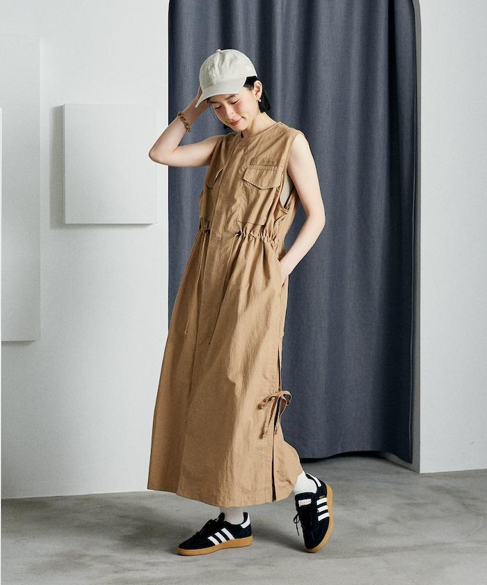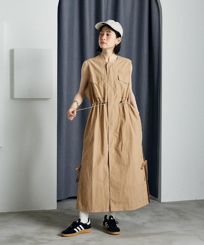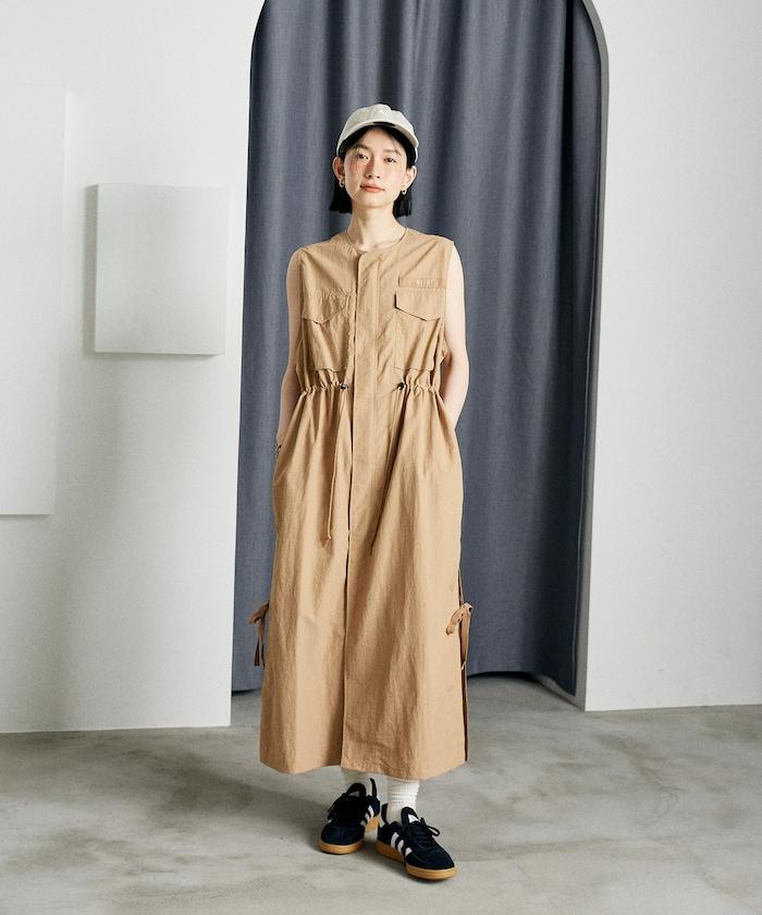 這款連身裙既有時尚感,又融入了翻蓋口袋和側面繫帶等軍裝設計細節。
