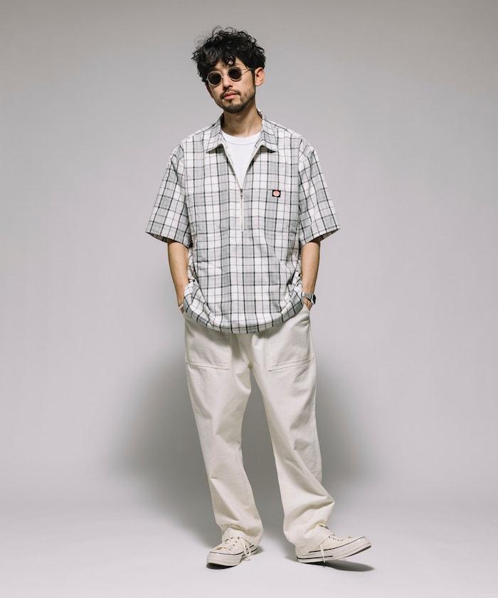 聯名 輕鬆版型 半拉鍊 單標誌 短袖工作襯衫 條紋 格子