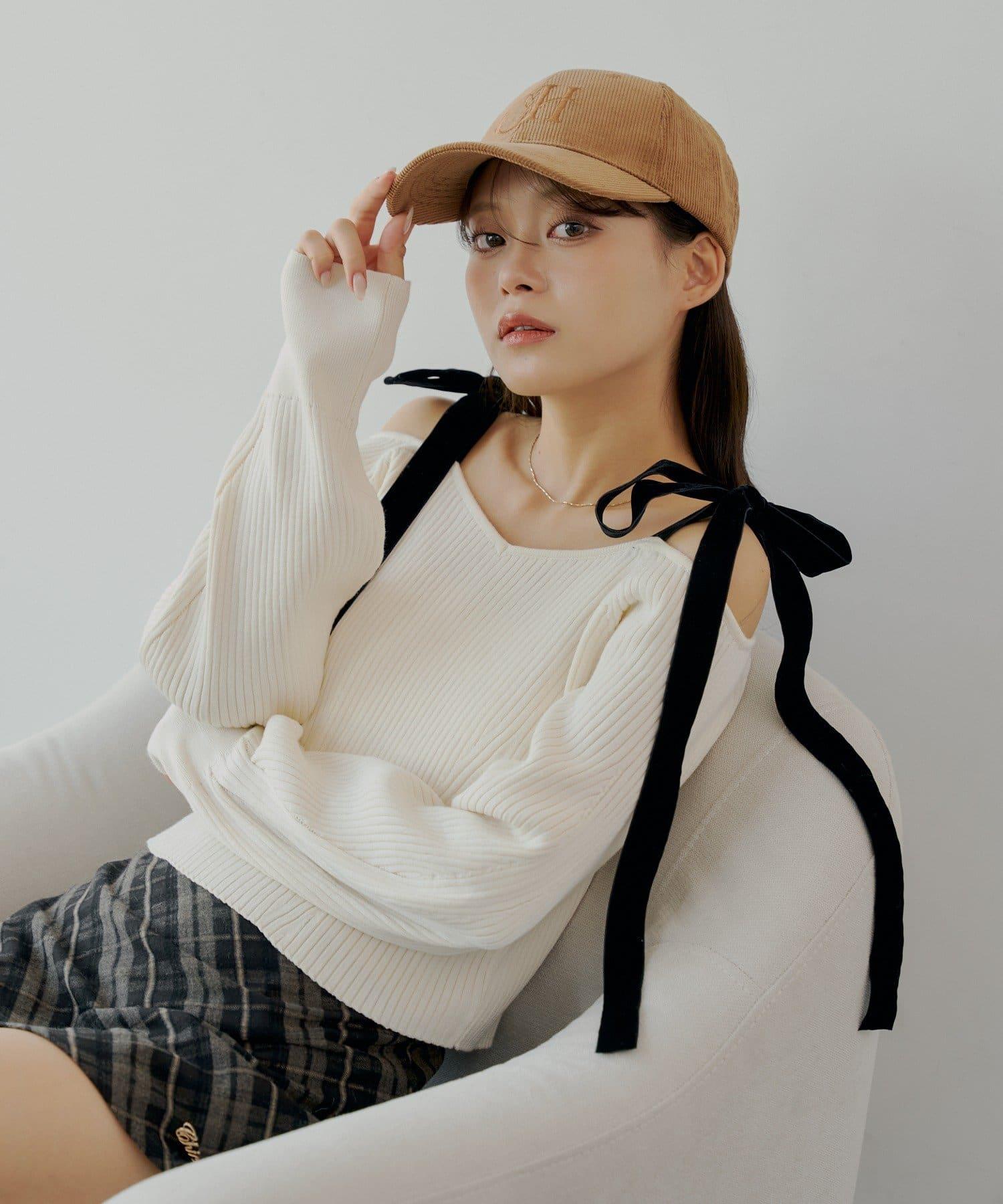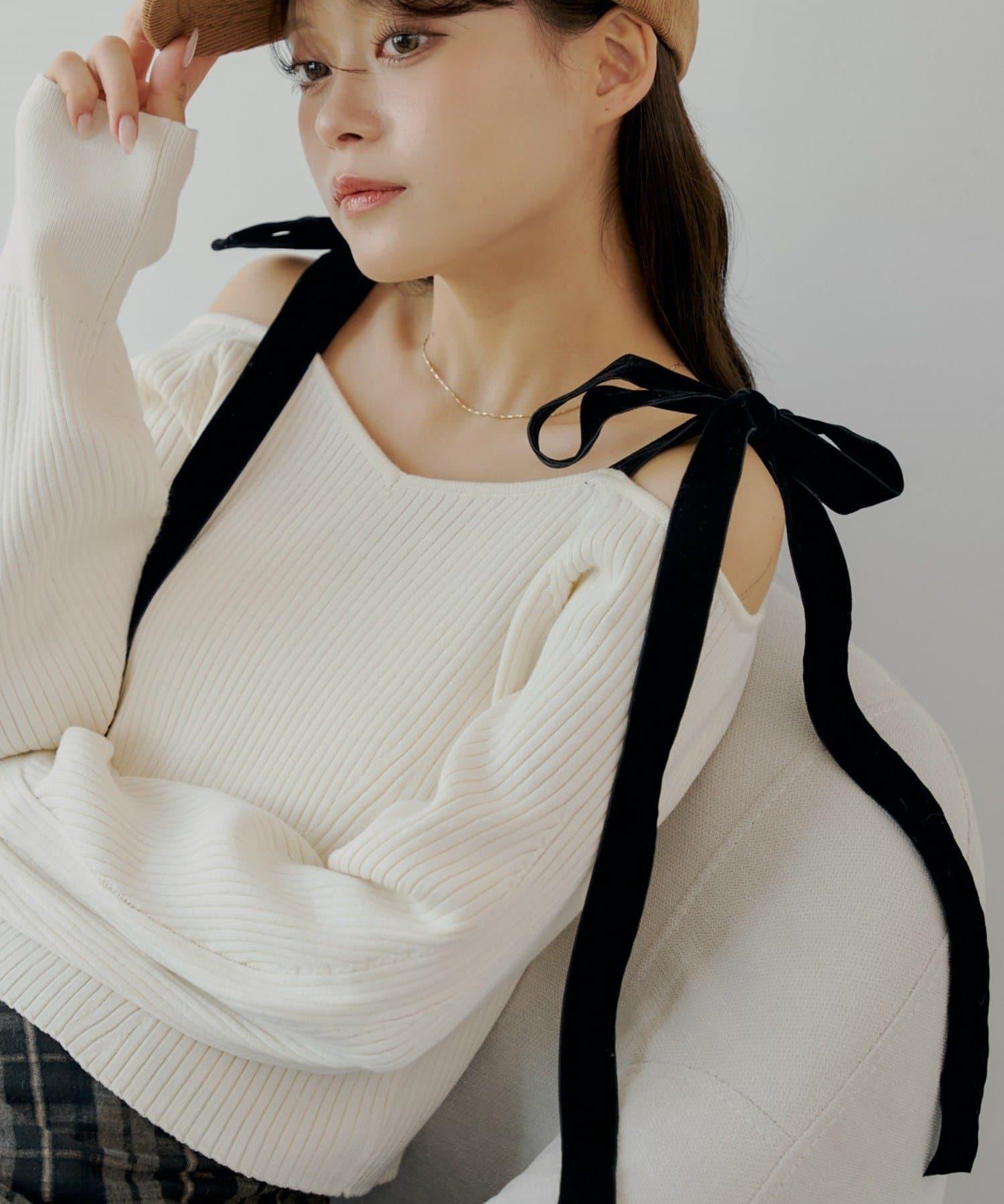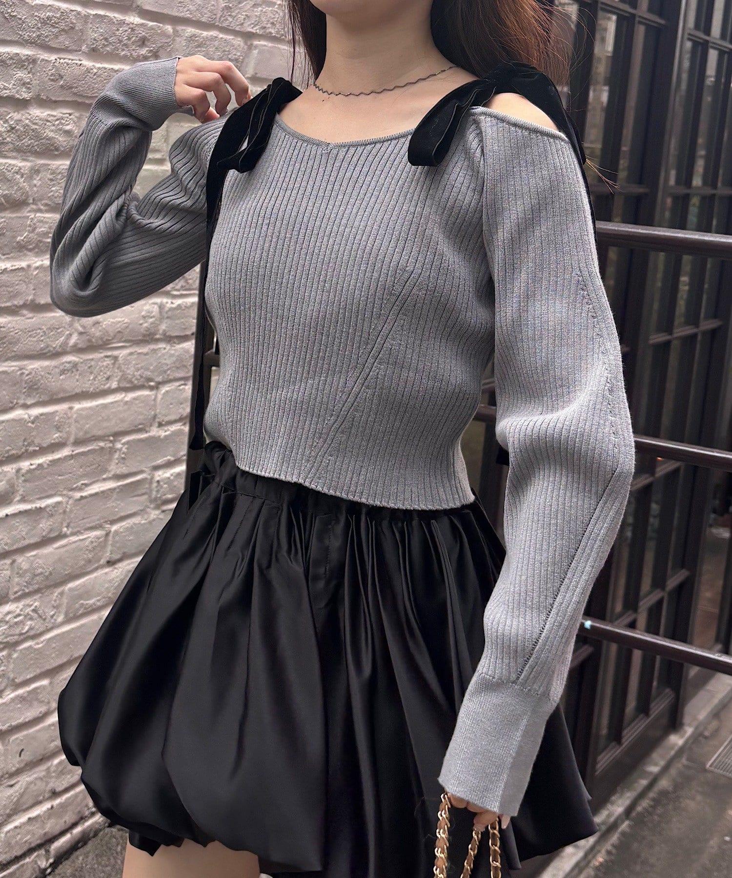 露肩羅紋針織衫,肩部飾有蝴蝶結!